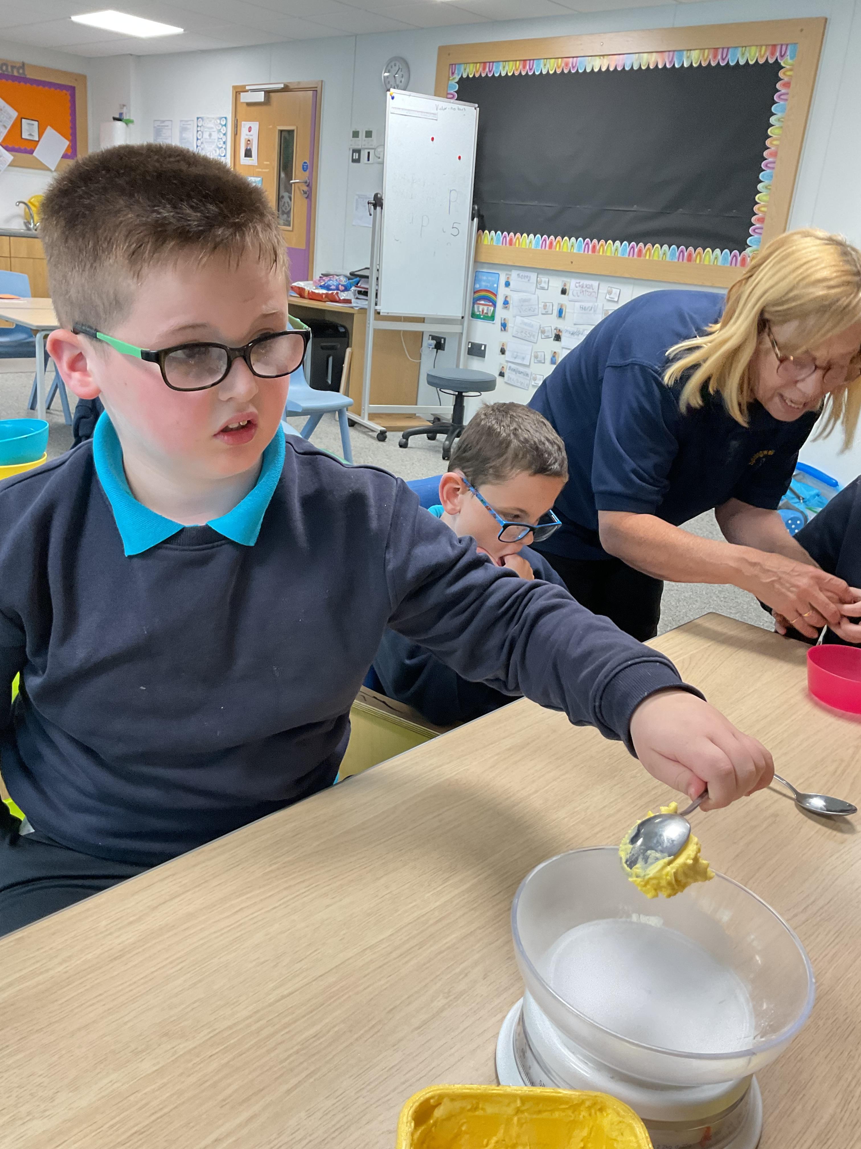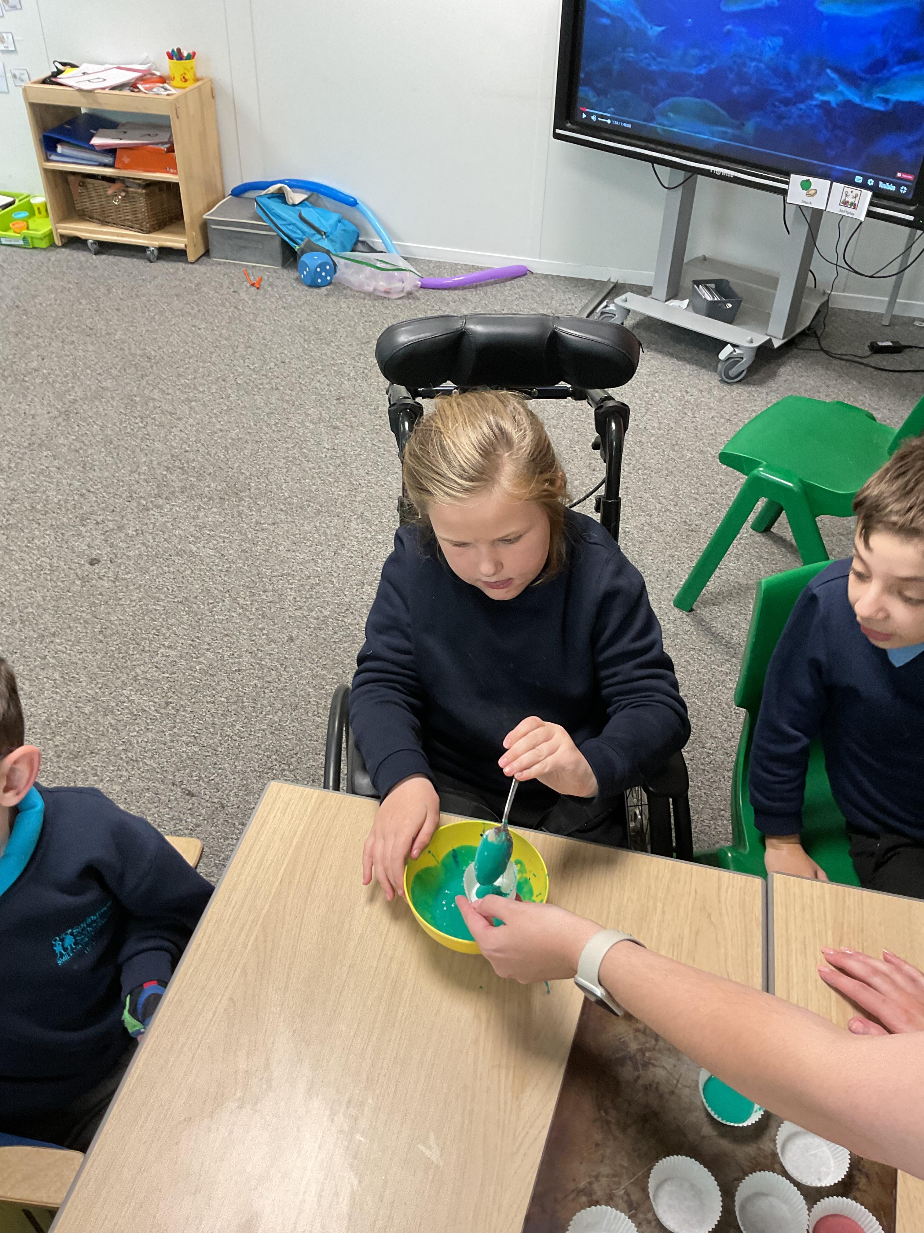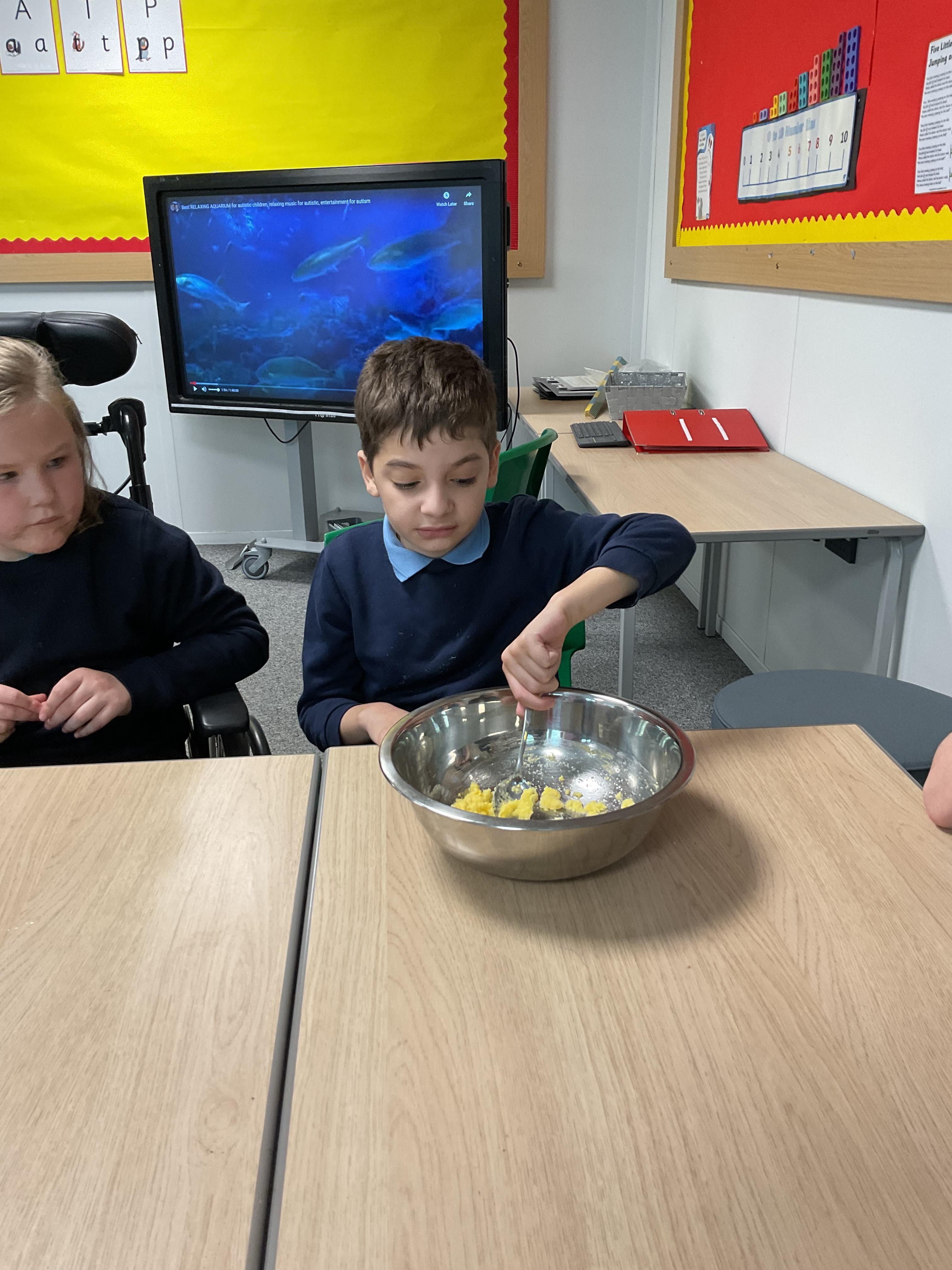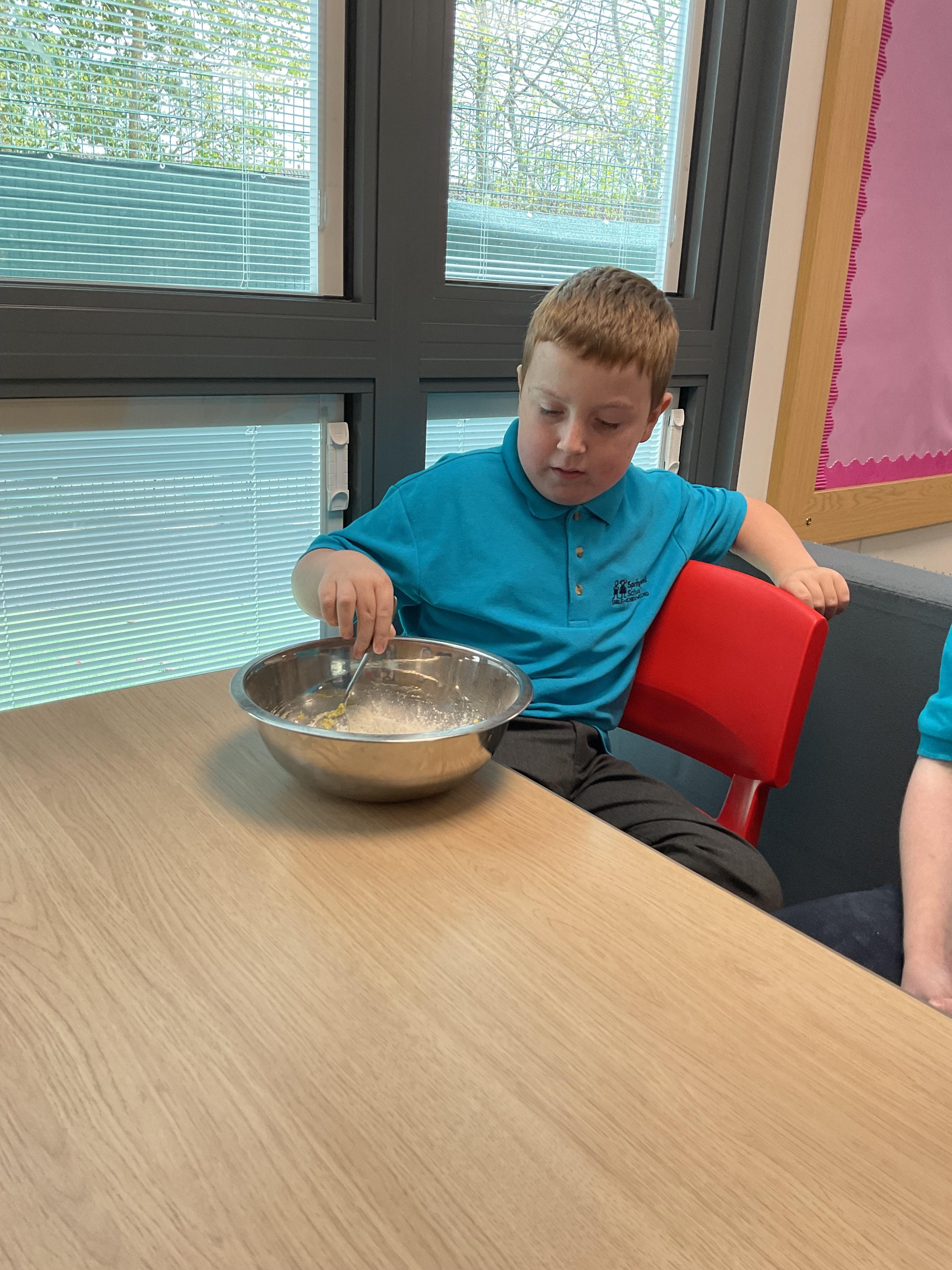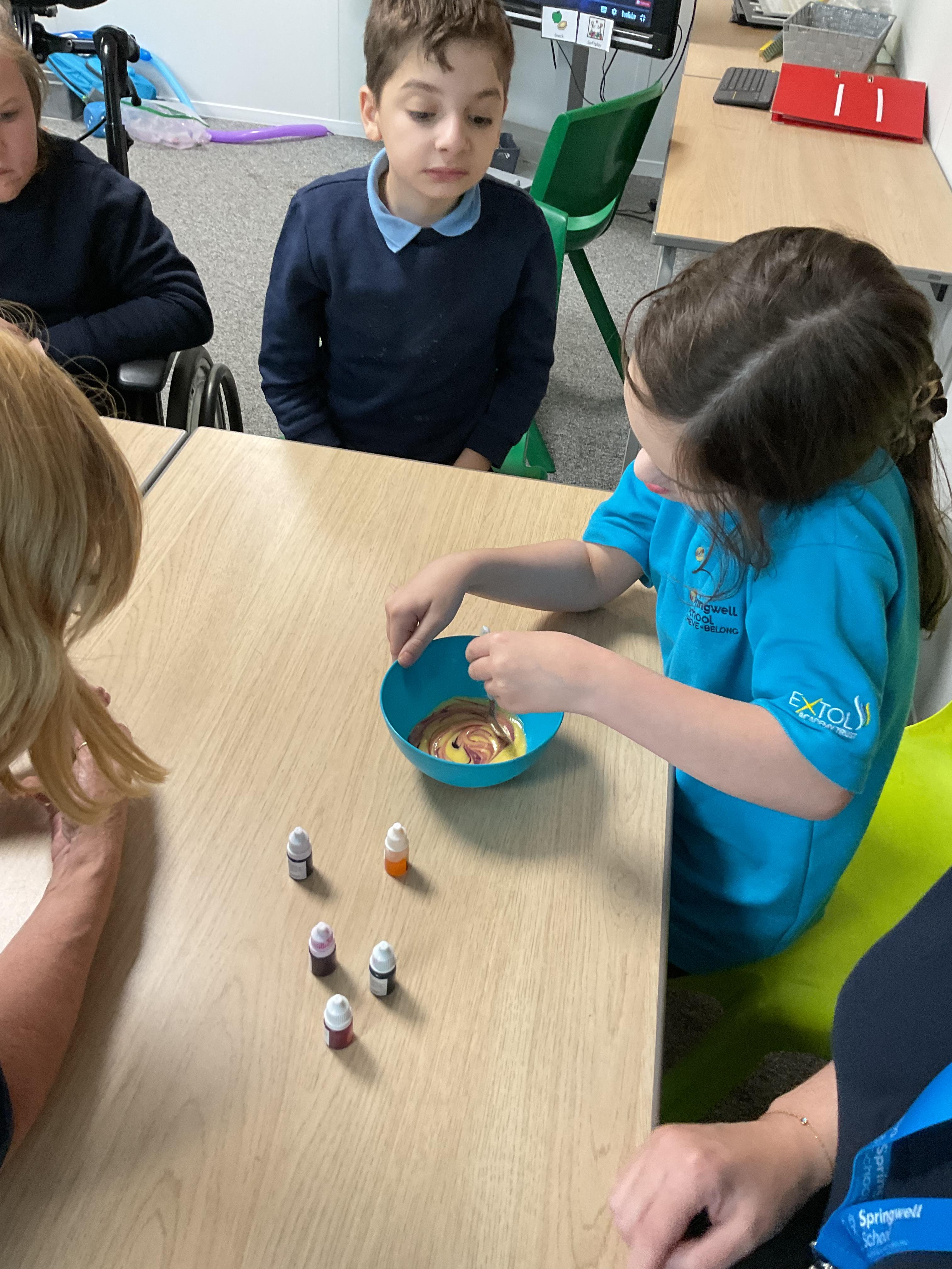 Pandas enjoyed DT with Annette this week. They worked together to make rainbow cakes by measuring out the ingredients and mixing them altogether.