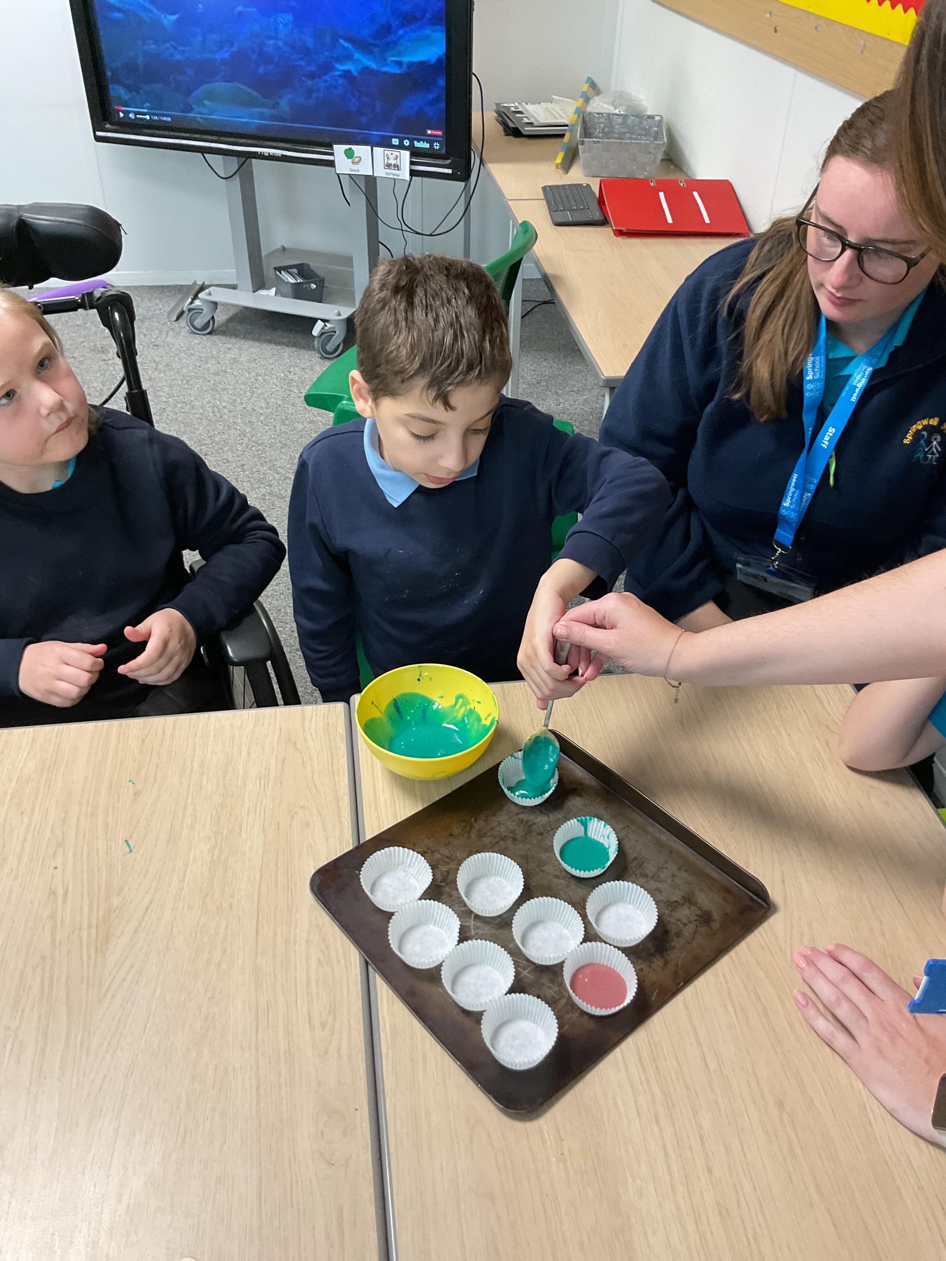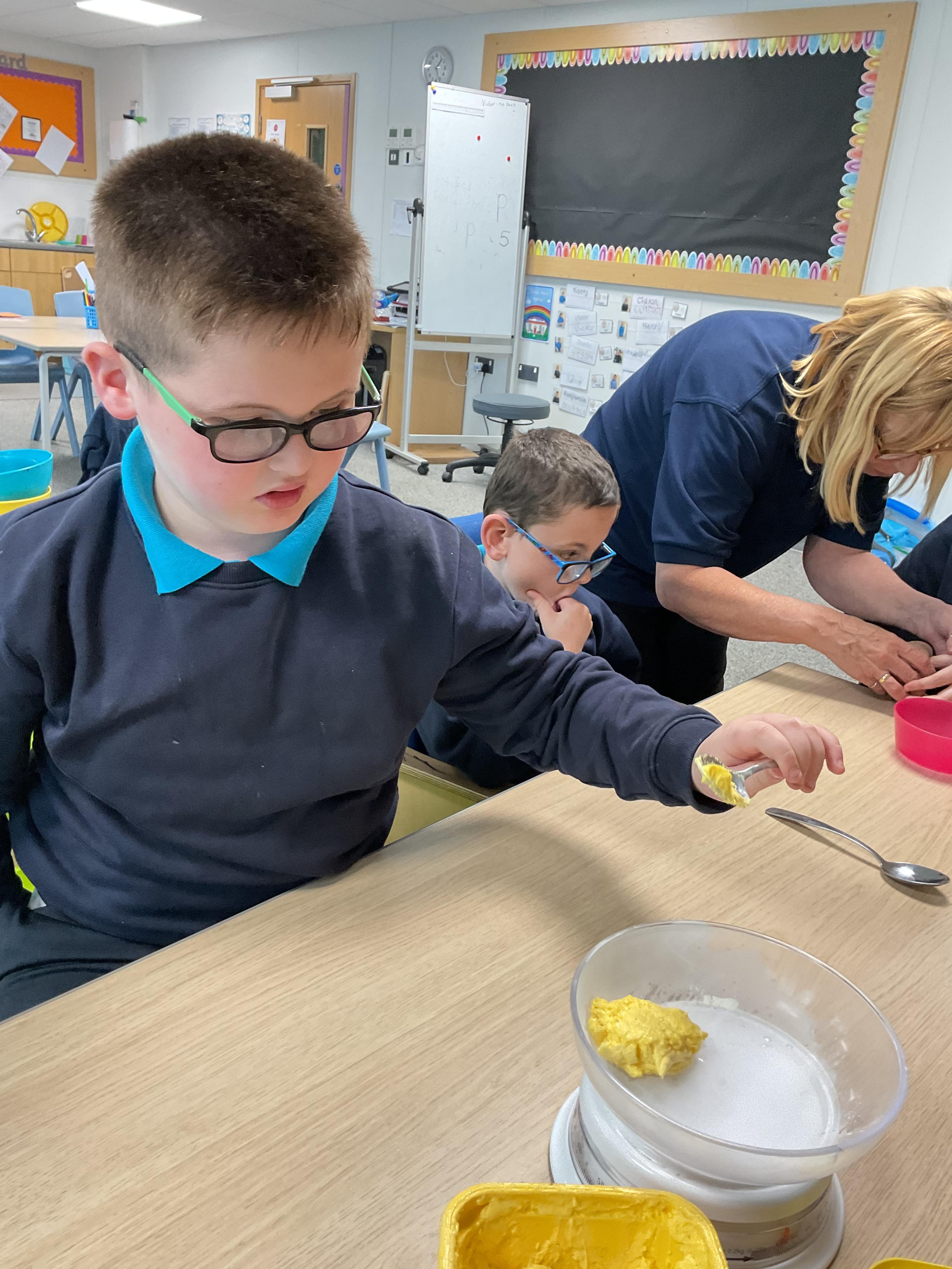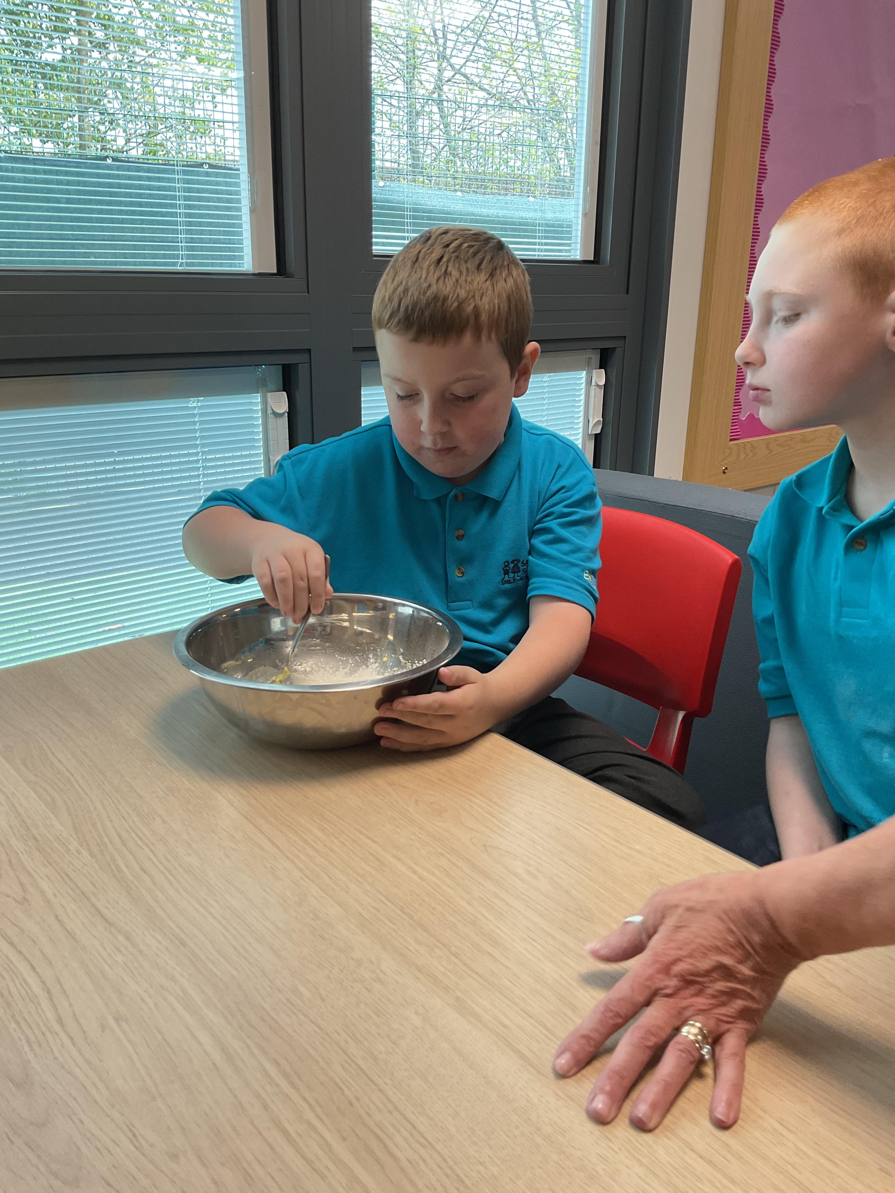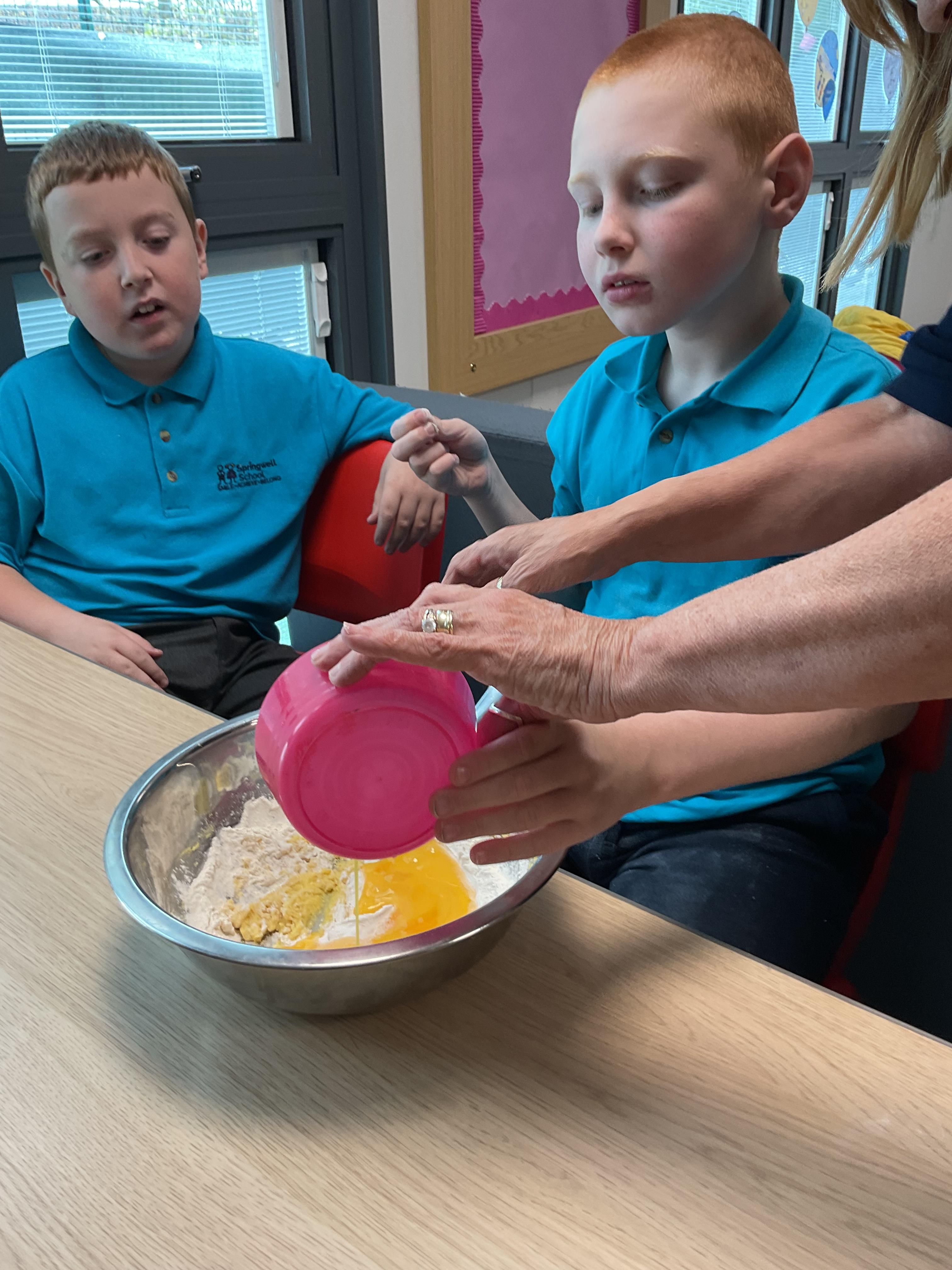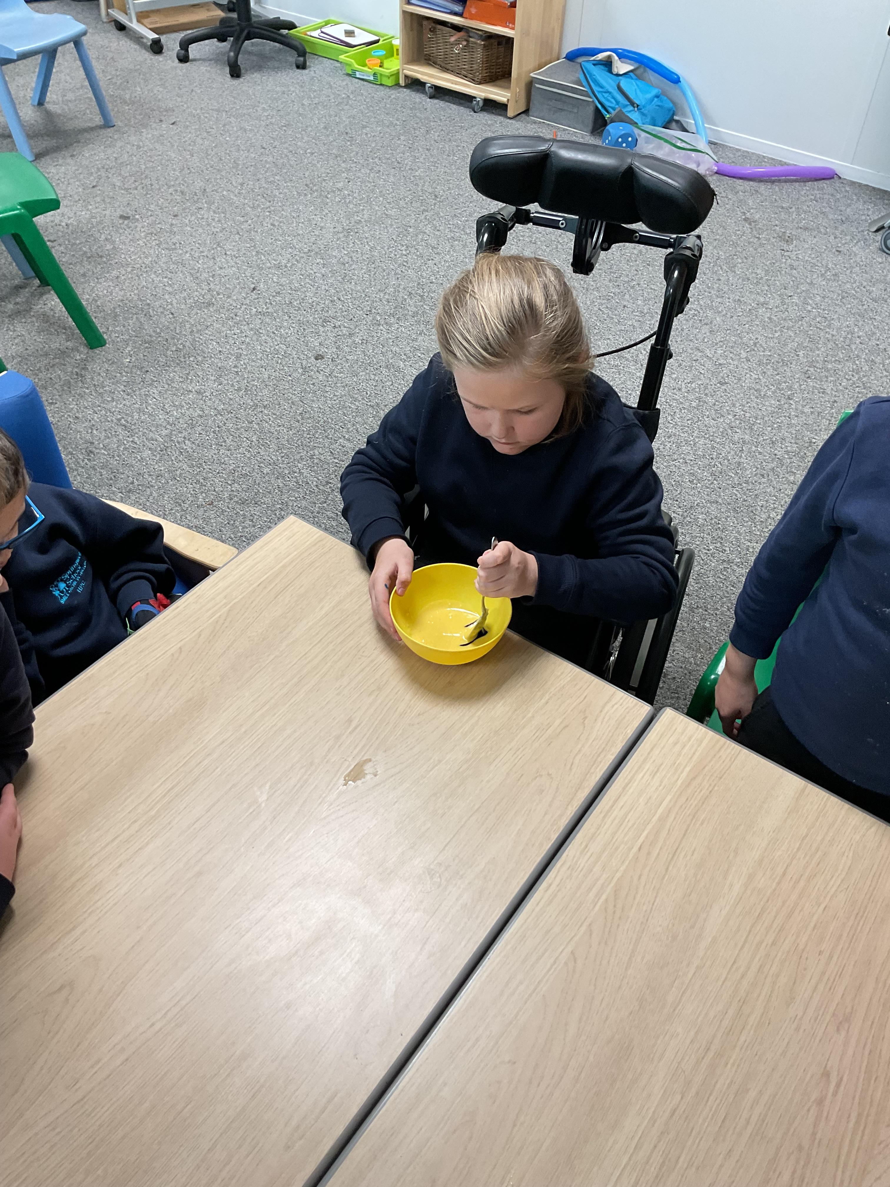 Pandas enjoyed DT with Annette this week. They worked together to make rainbow cakes by measuring out the ingredients and mixing them altogether.
