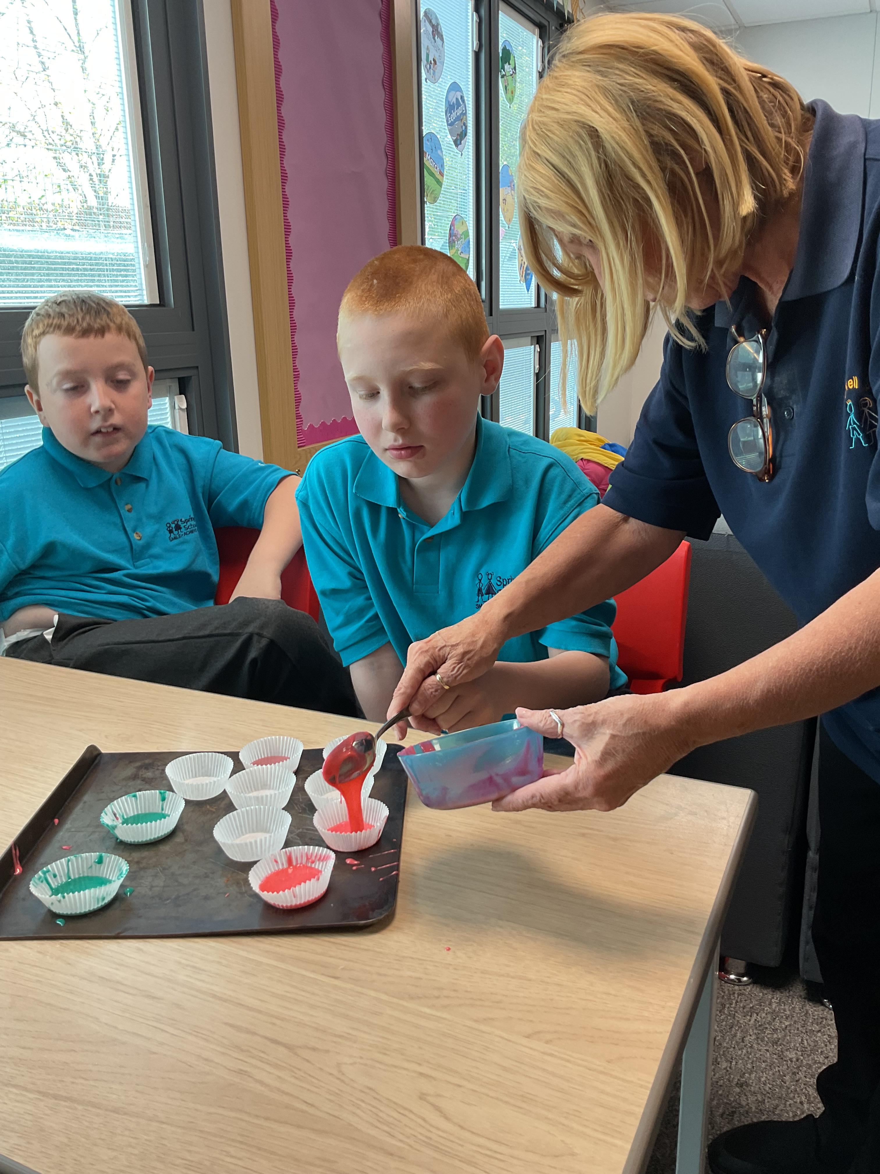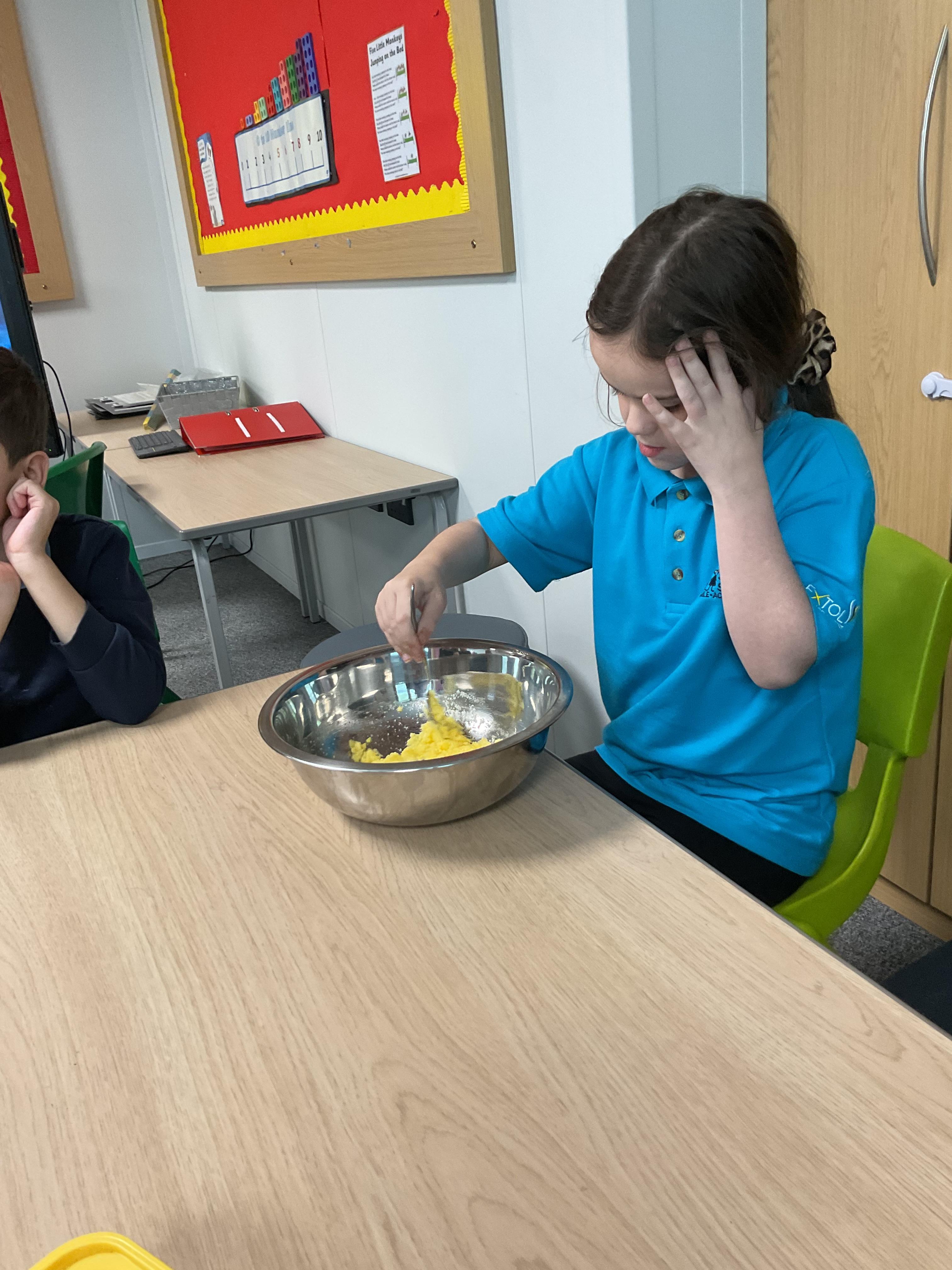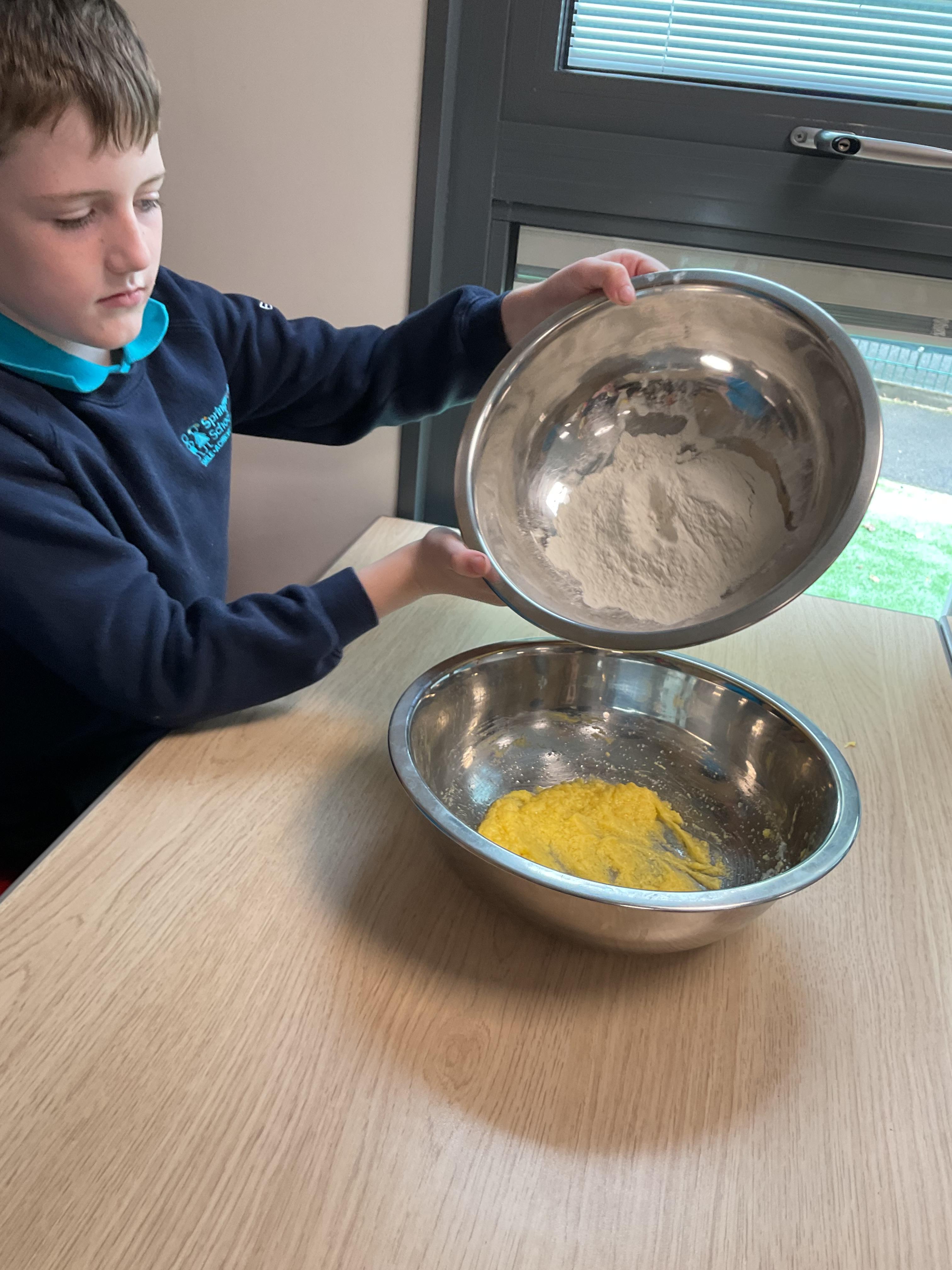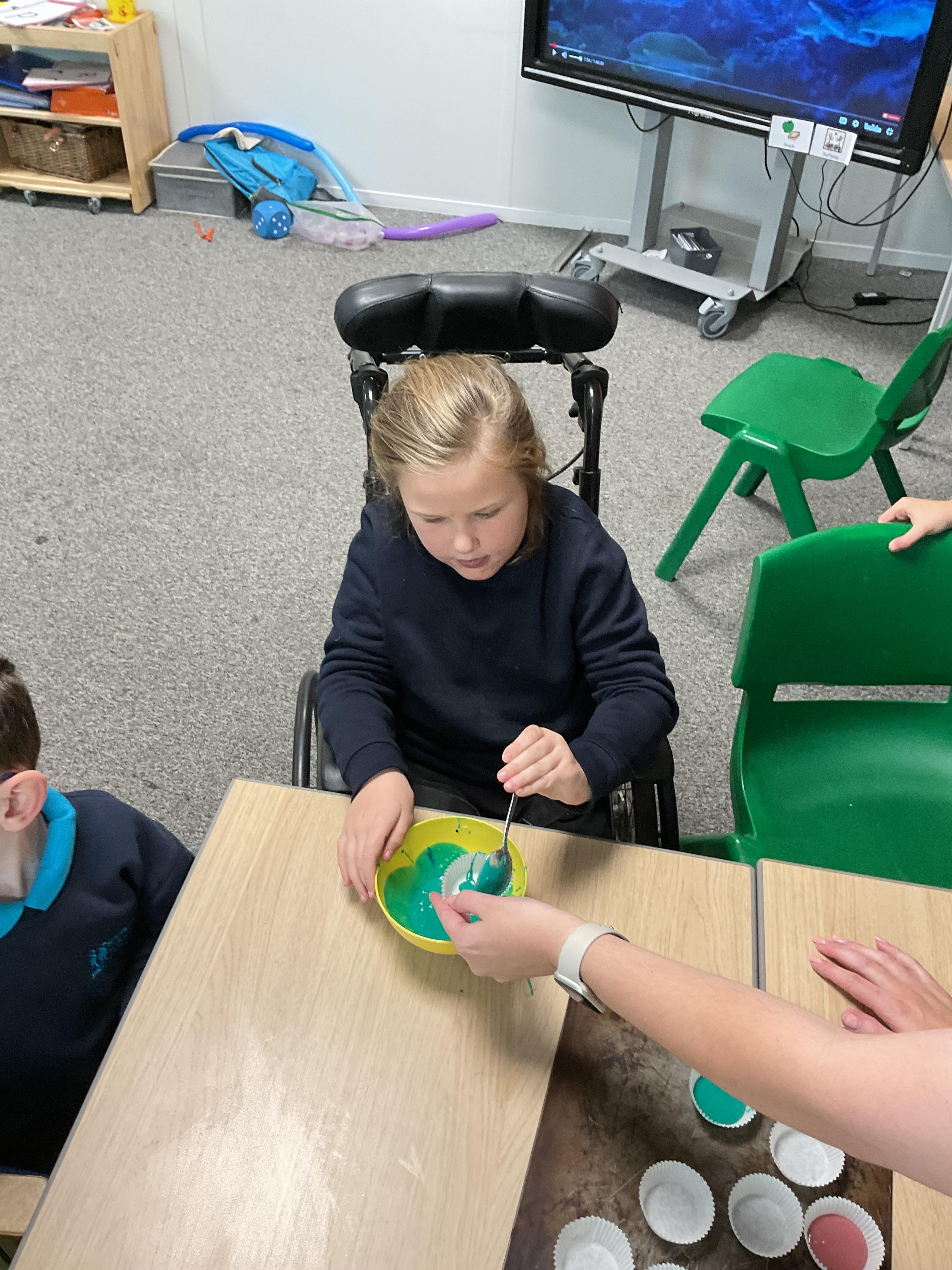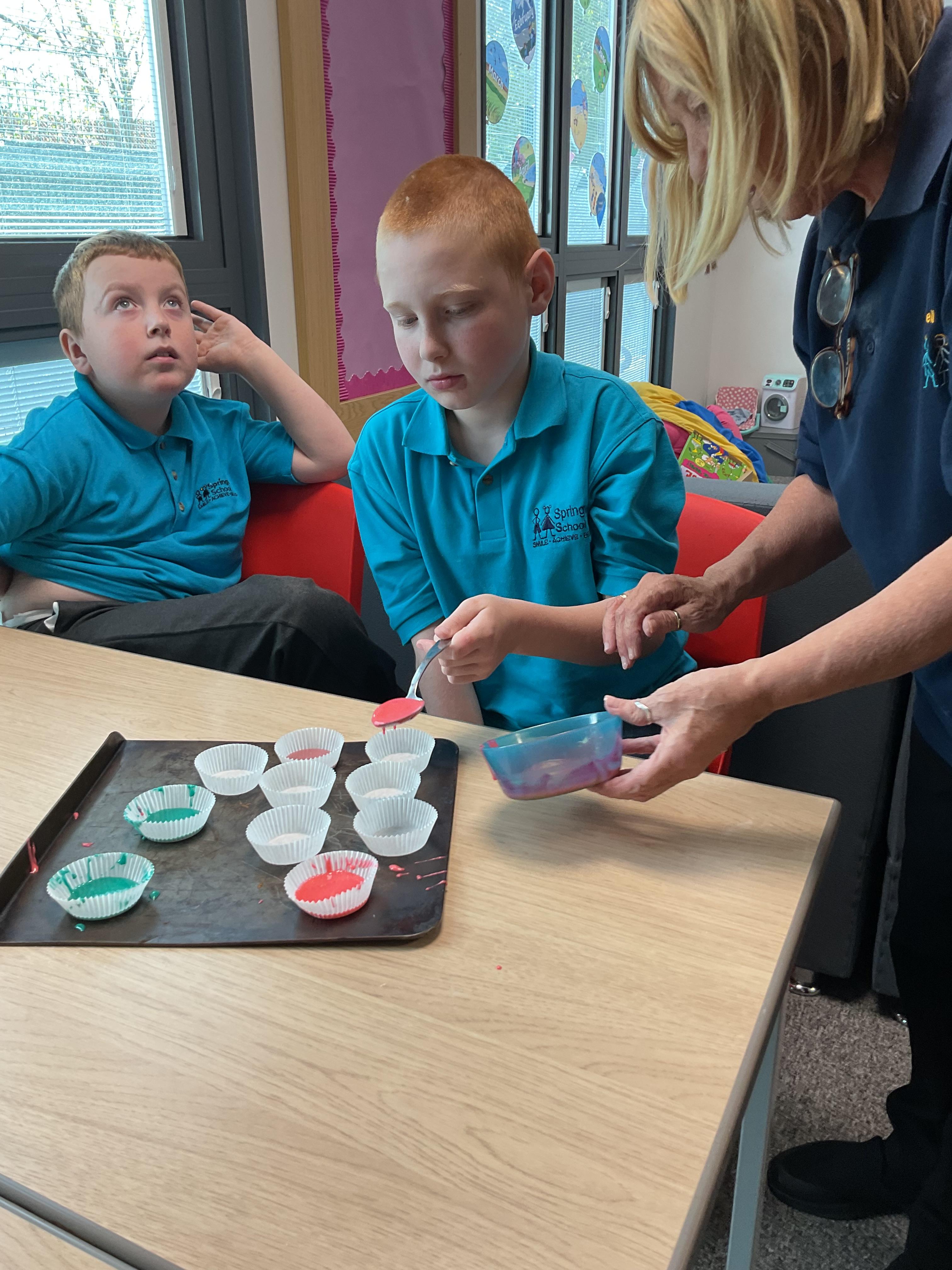 Pandas enjoyed DT with Annette this week. They worked together to make rainbow cakes by measuring out the ingredients and mixing them altogether.