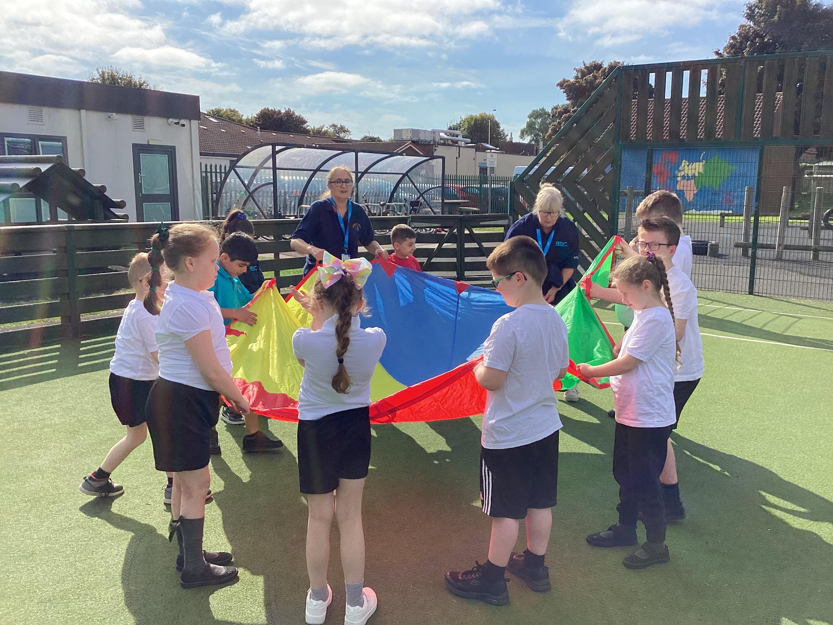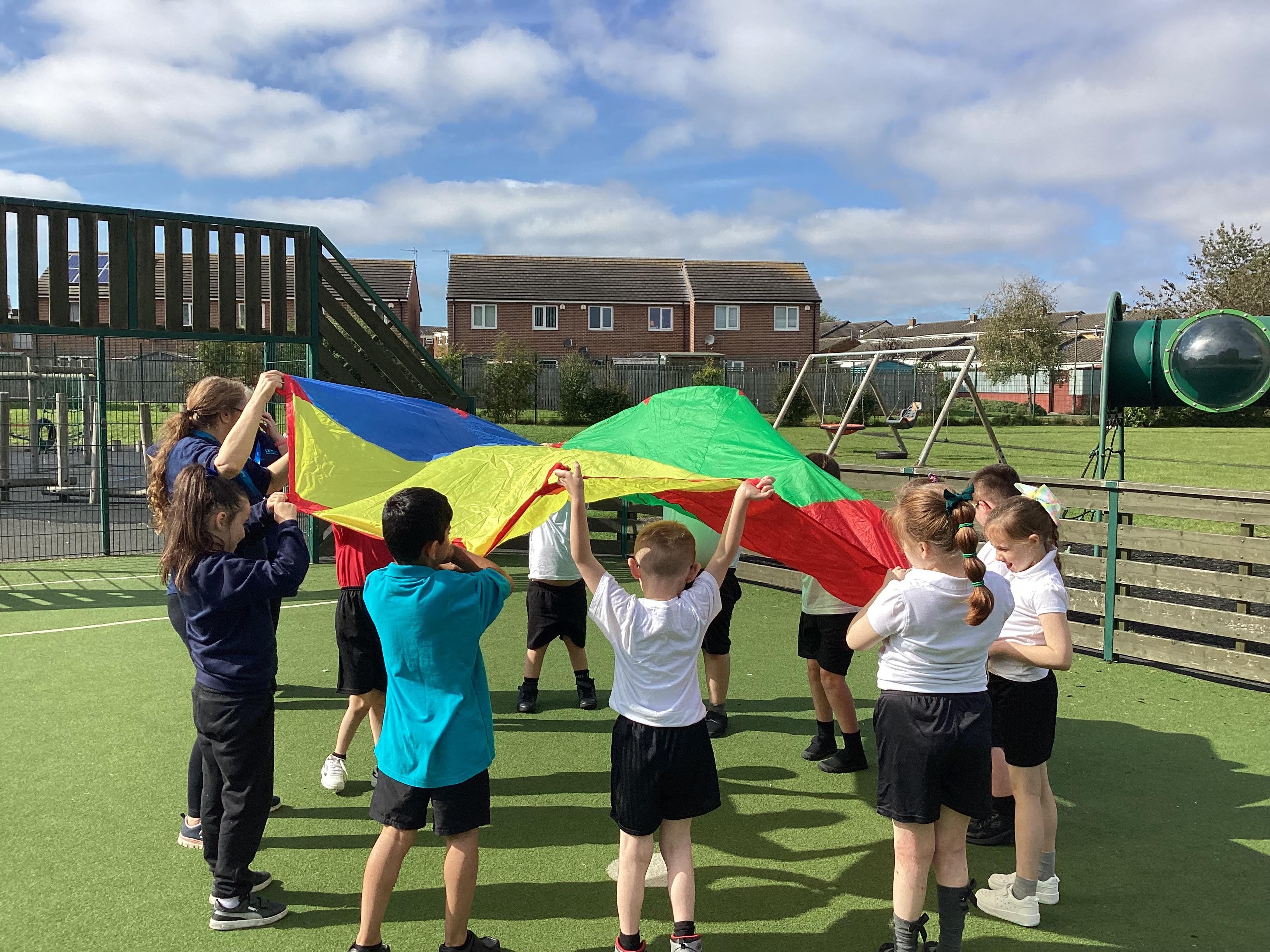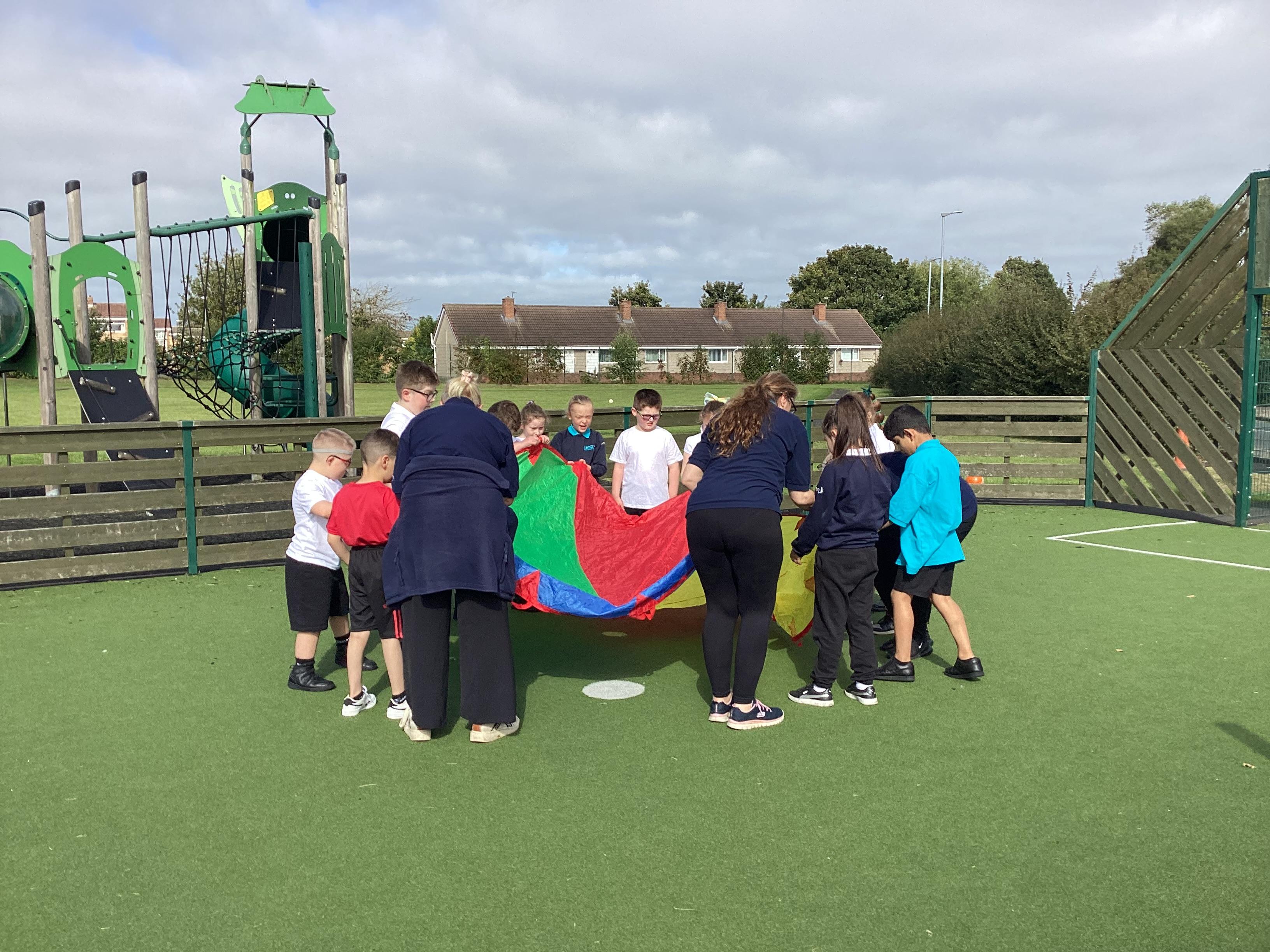 Thursday 19th September - we worked as team to move the parachute in PE. We had lots of fun.
