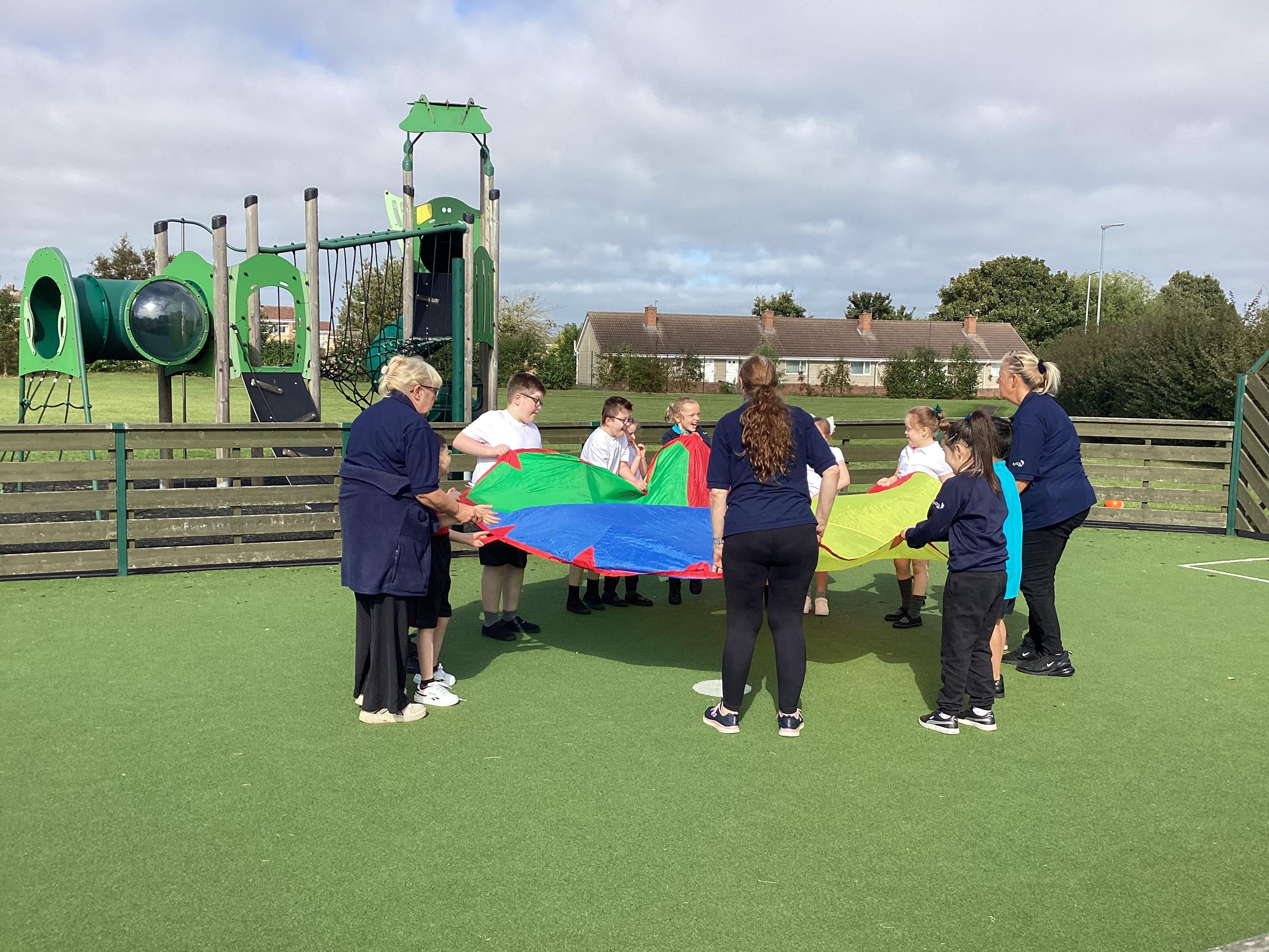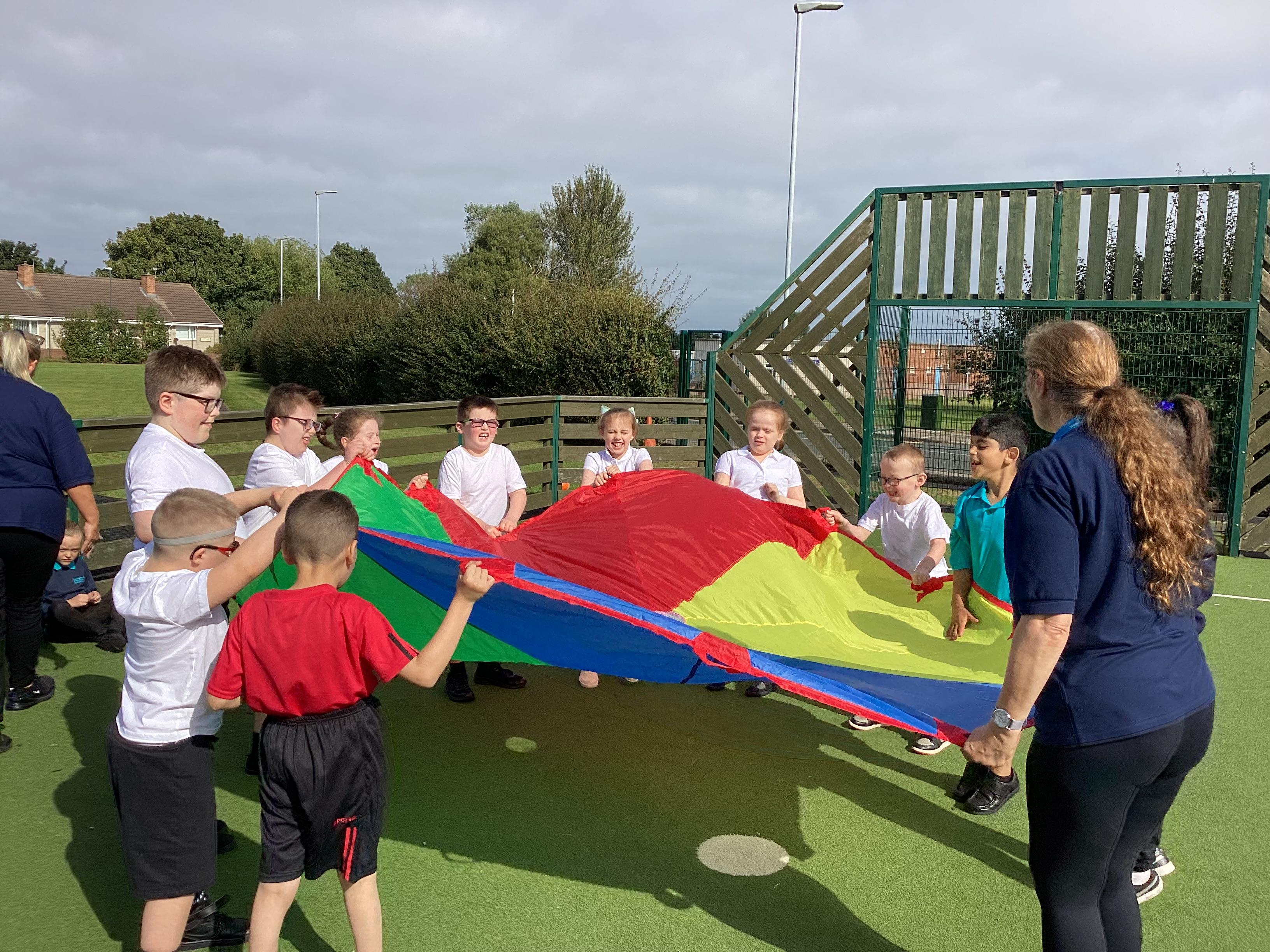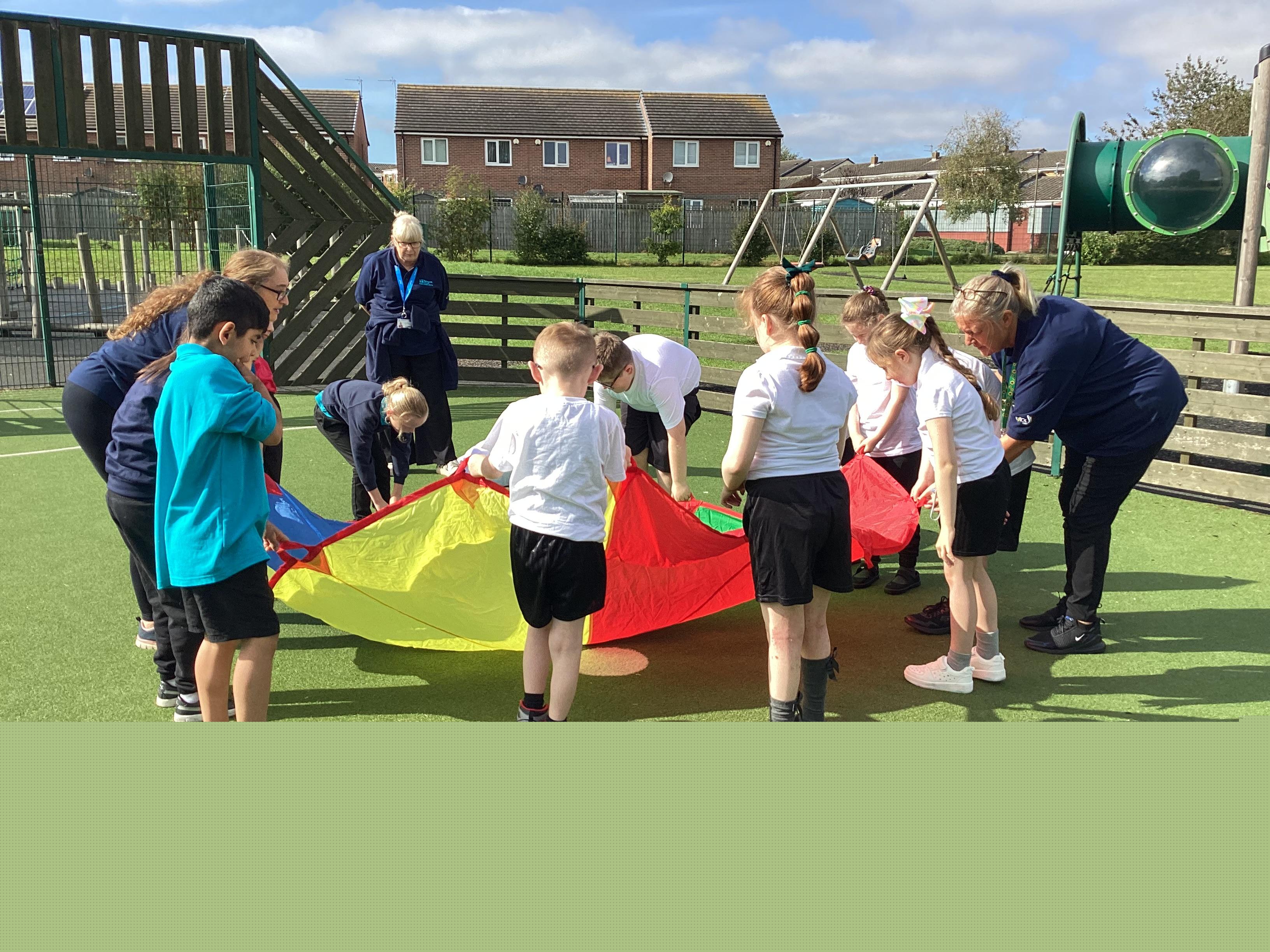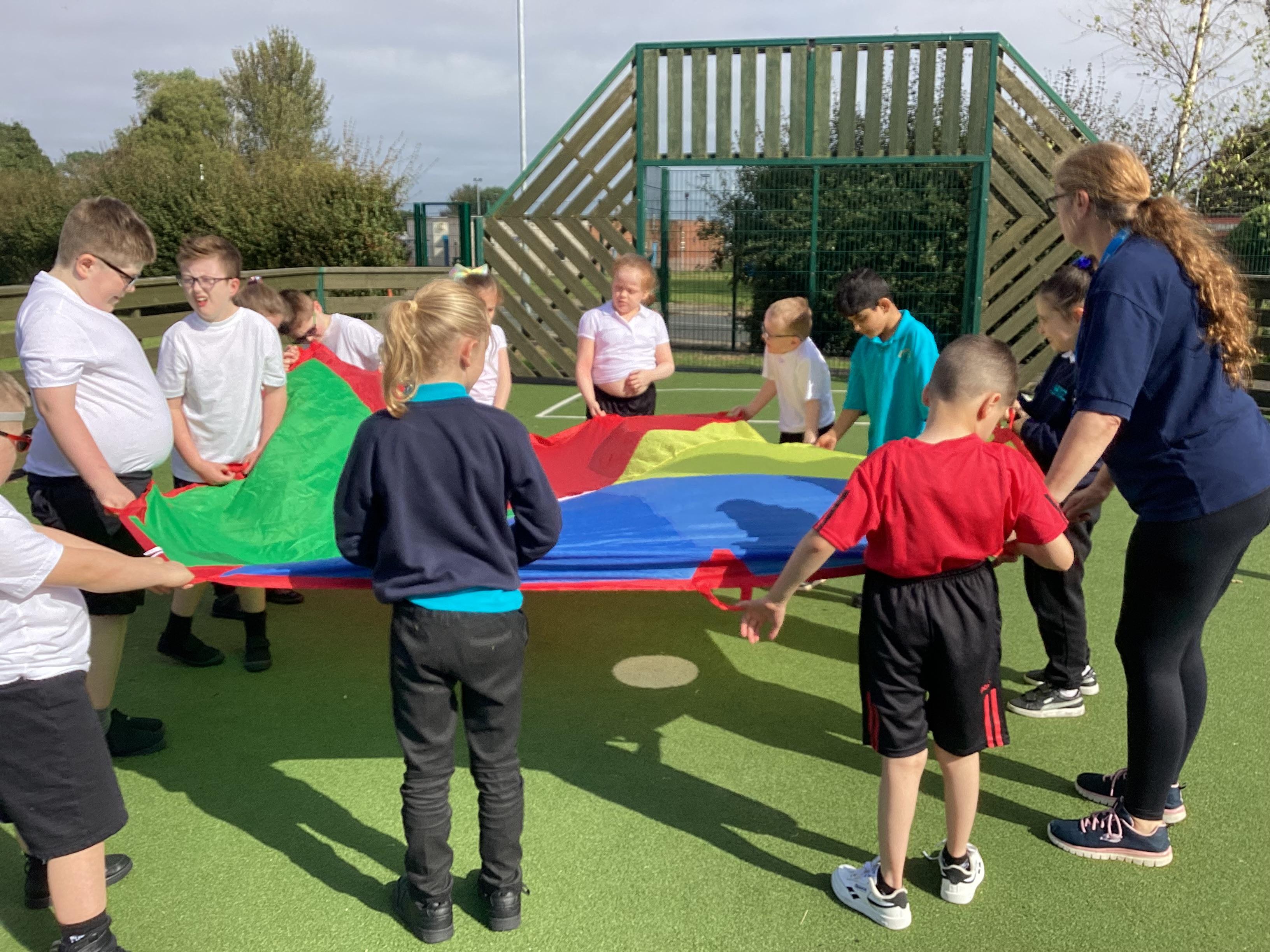 Thursday 19th September - we worked as team to move the parachute in PE. We had lots of fun.