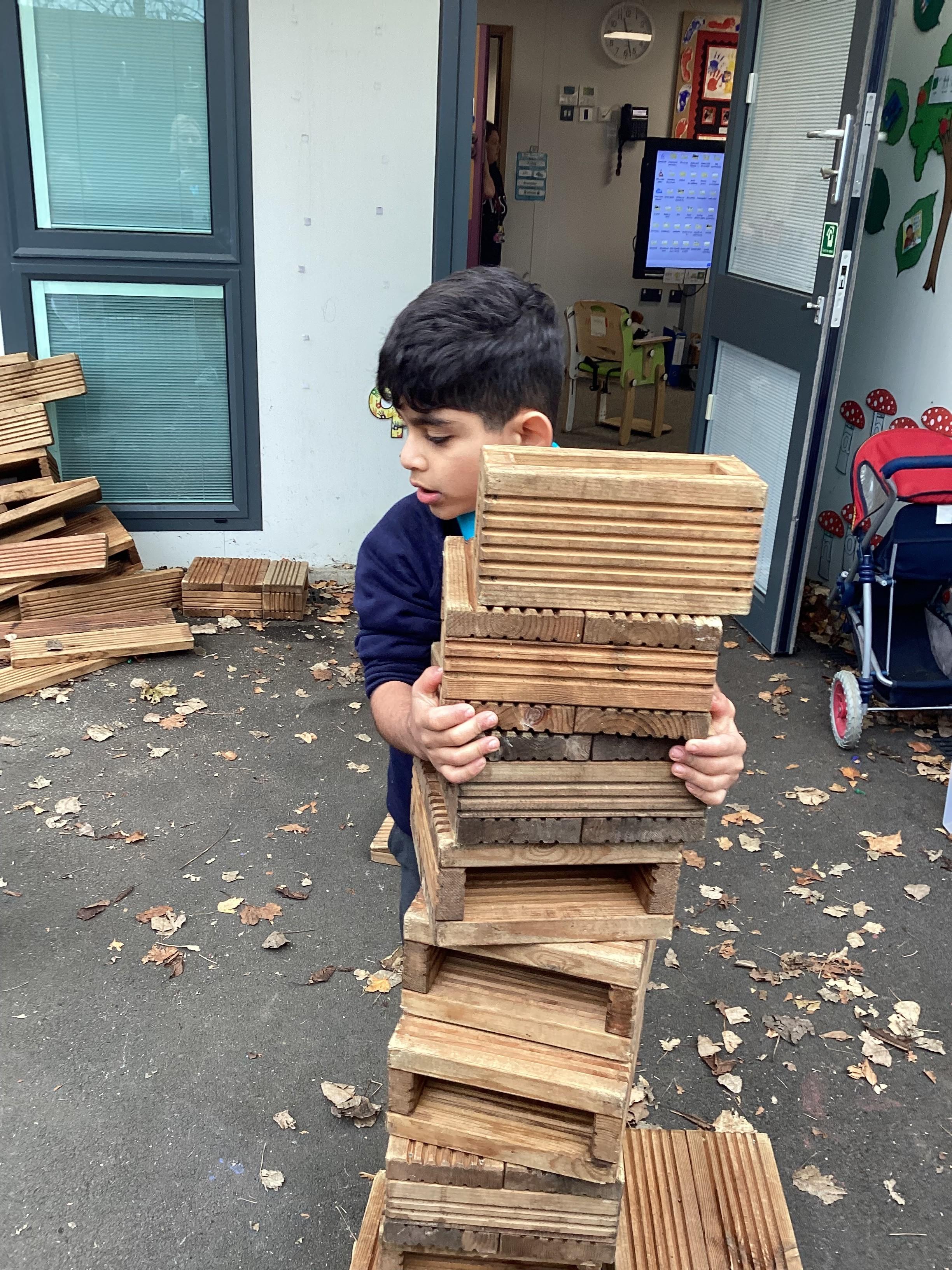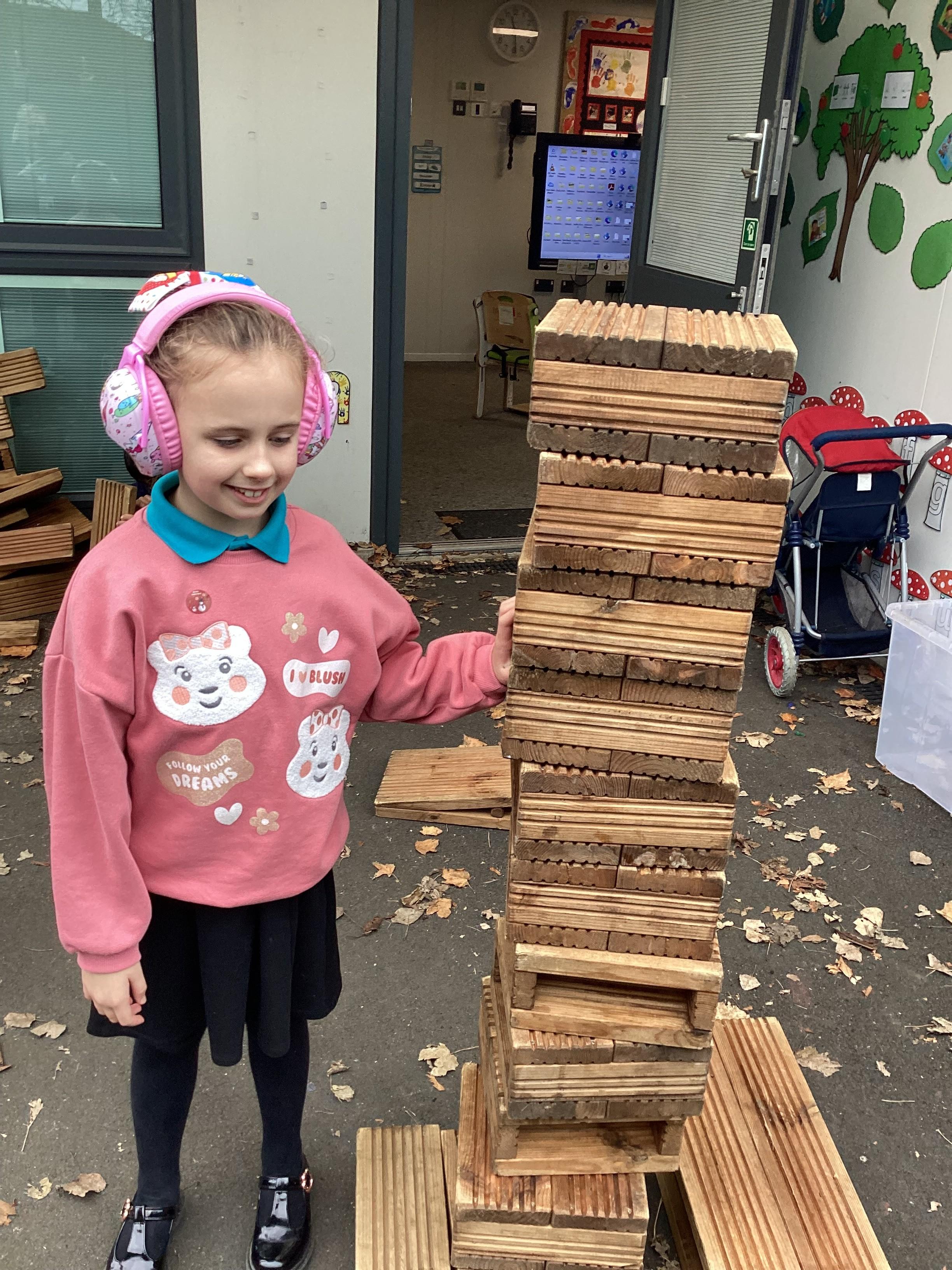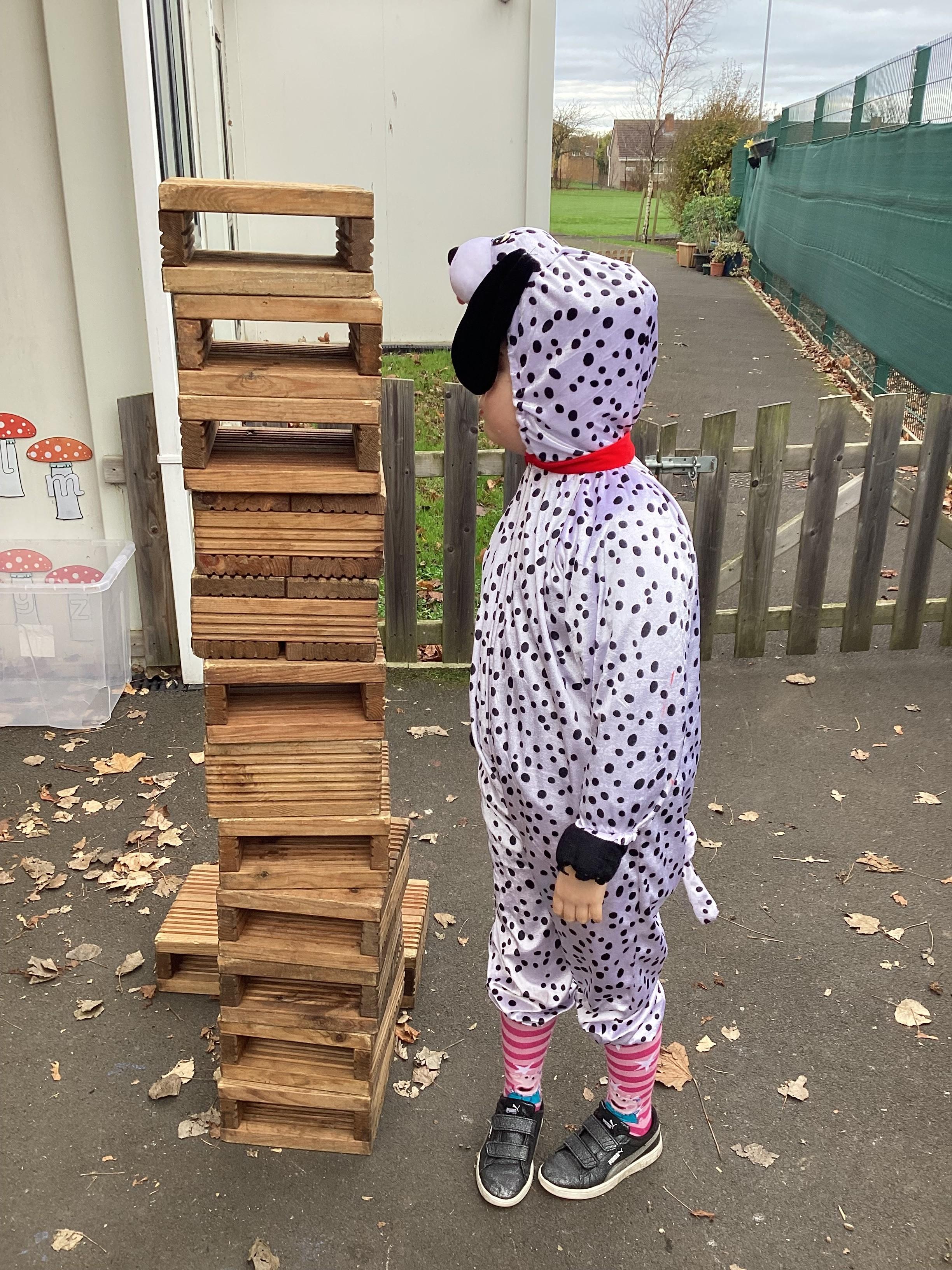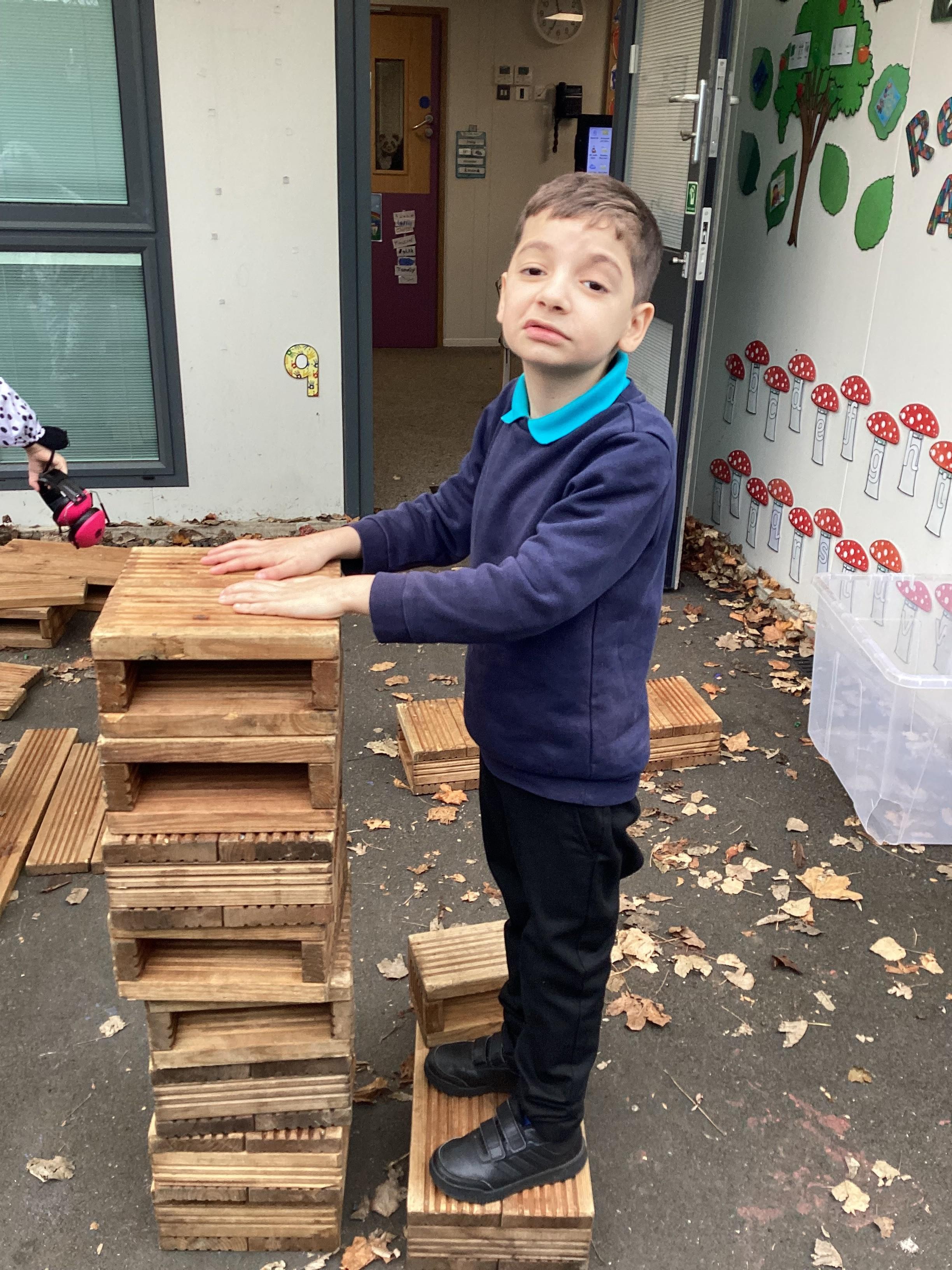 In maths, Panda Class have been working on tall and short. We built towers outside using the big blocks.Some of our towers were bigger than us so we used our problem solving skills to try to make ourselves taller using the blocks.