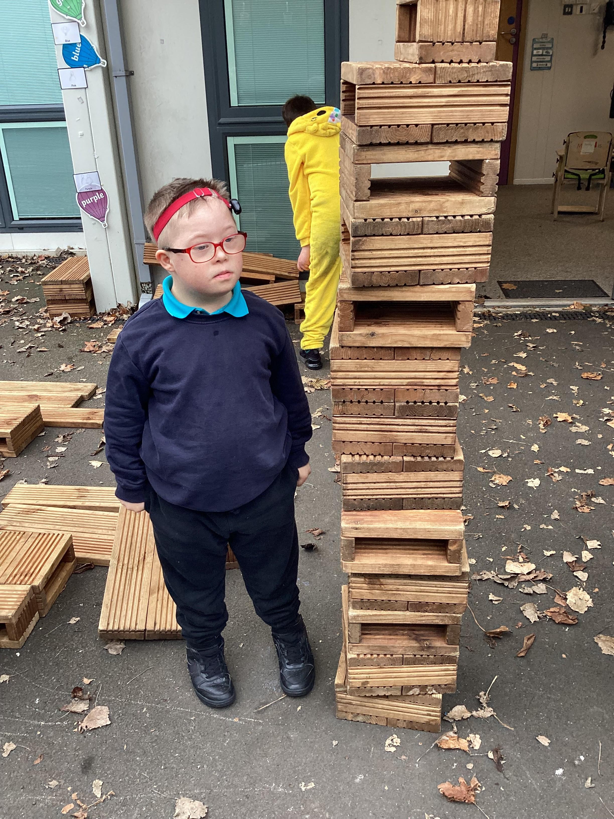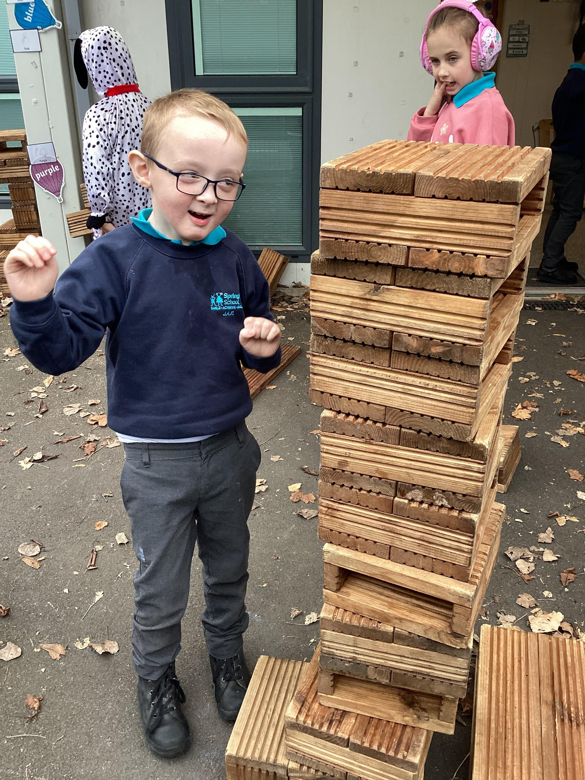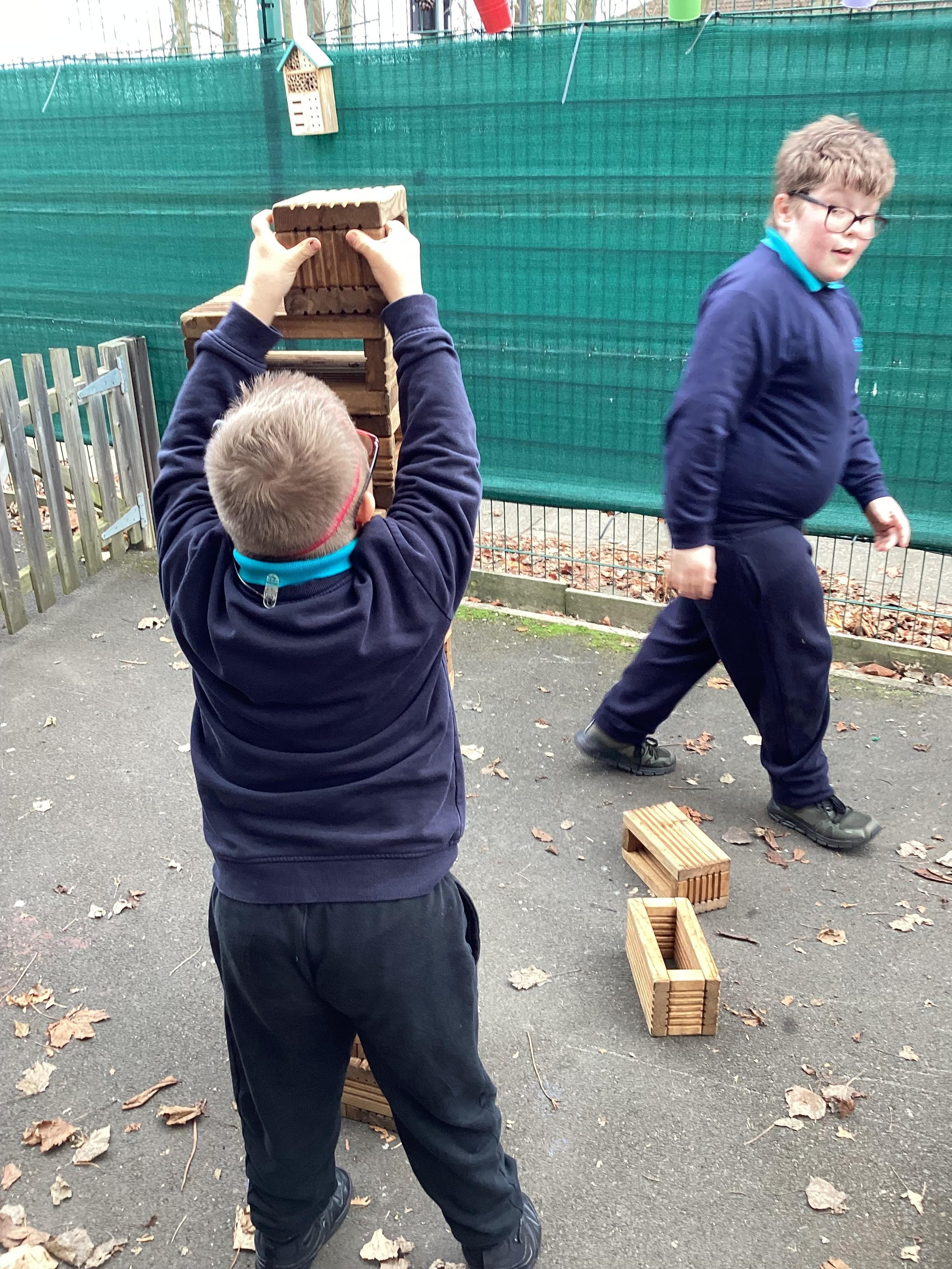 In maths, Panda Class have been working on tall and short. We built towers outside using the big blocks.Some of our towers were bigger than us so we used our problem solving skills to try to make ourselves taller using the blocks.