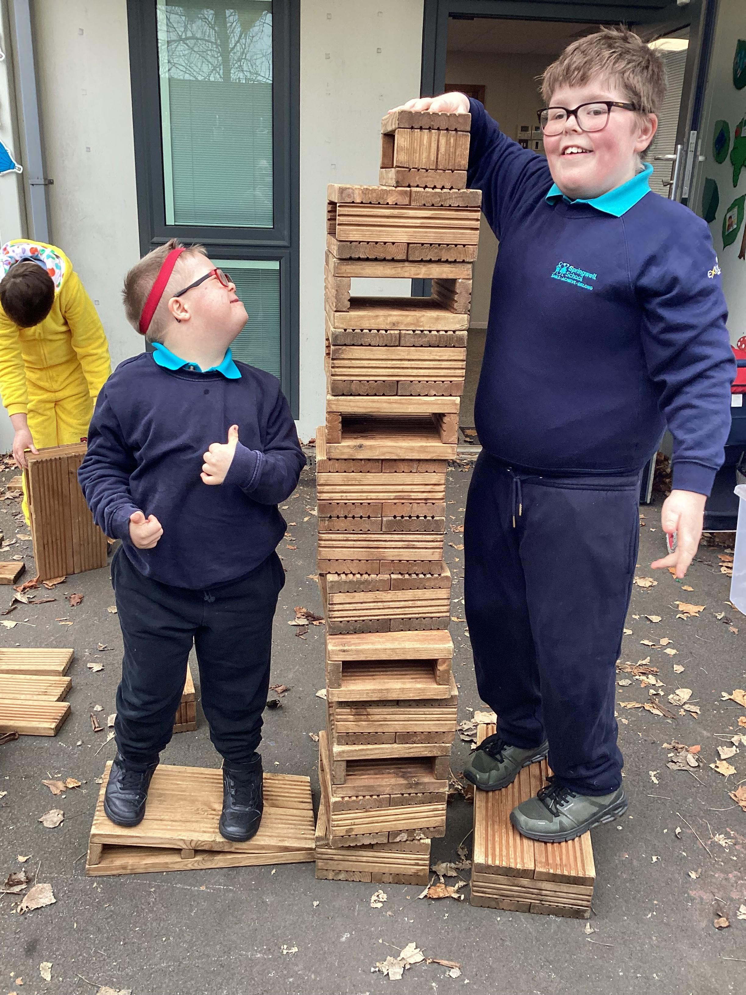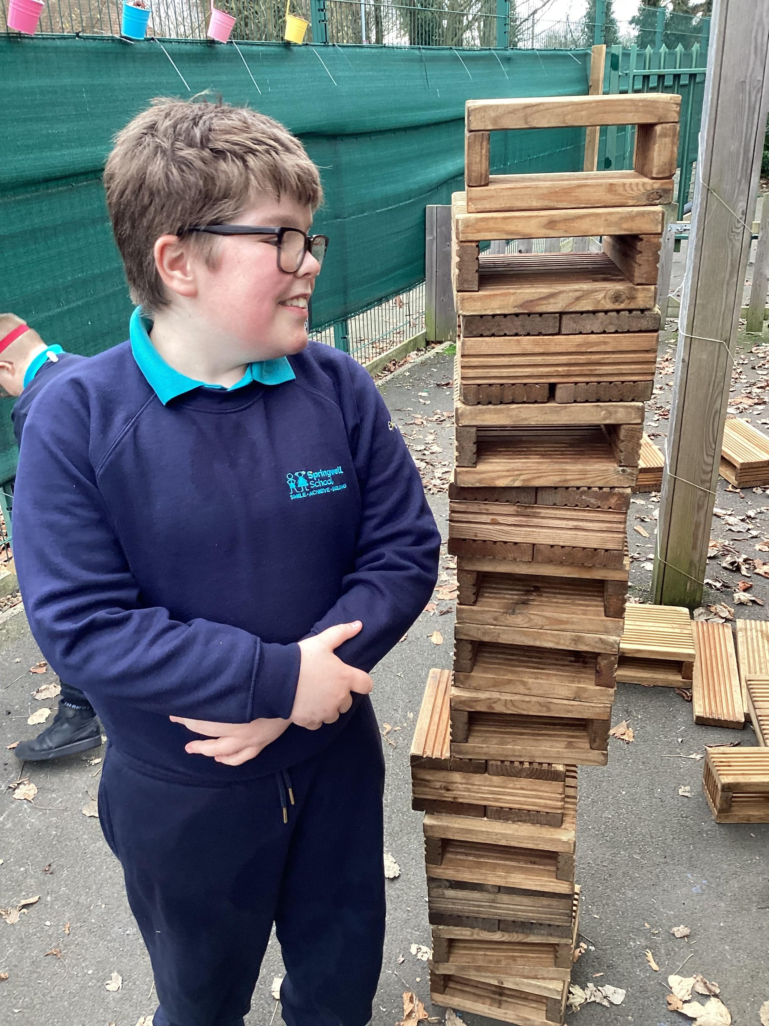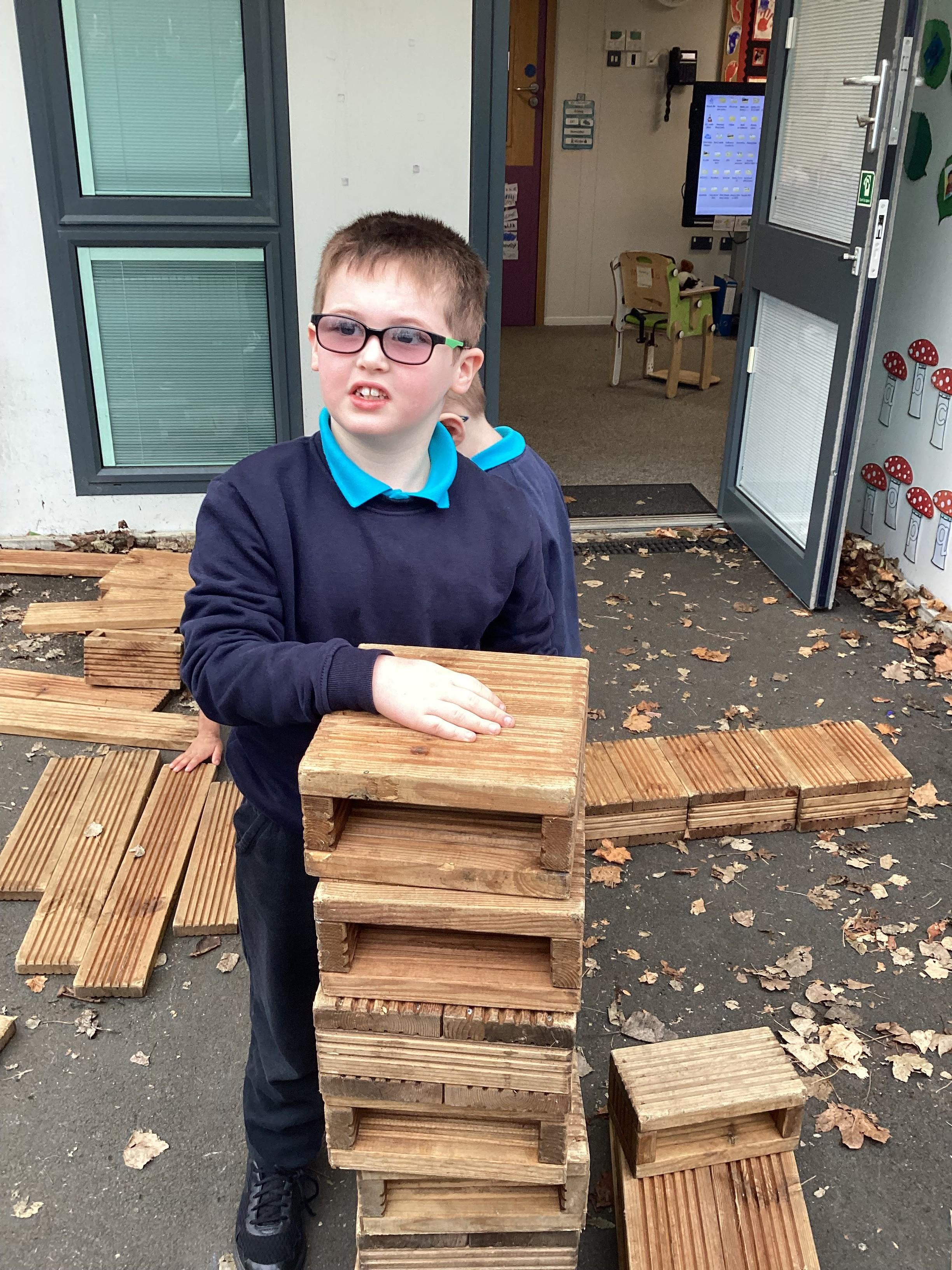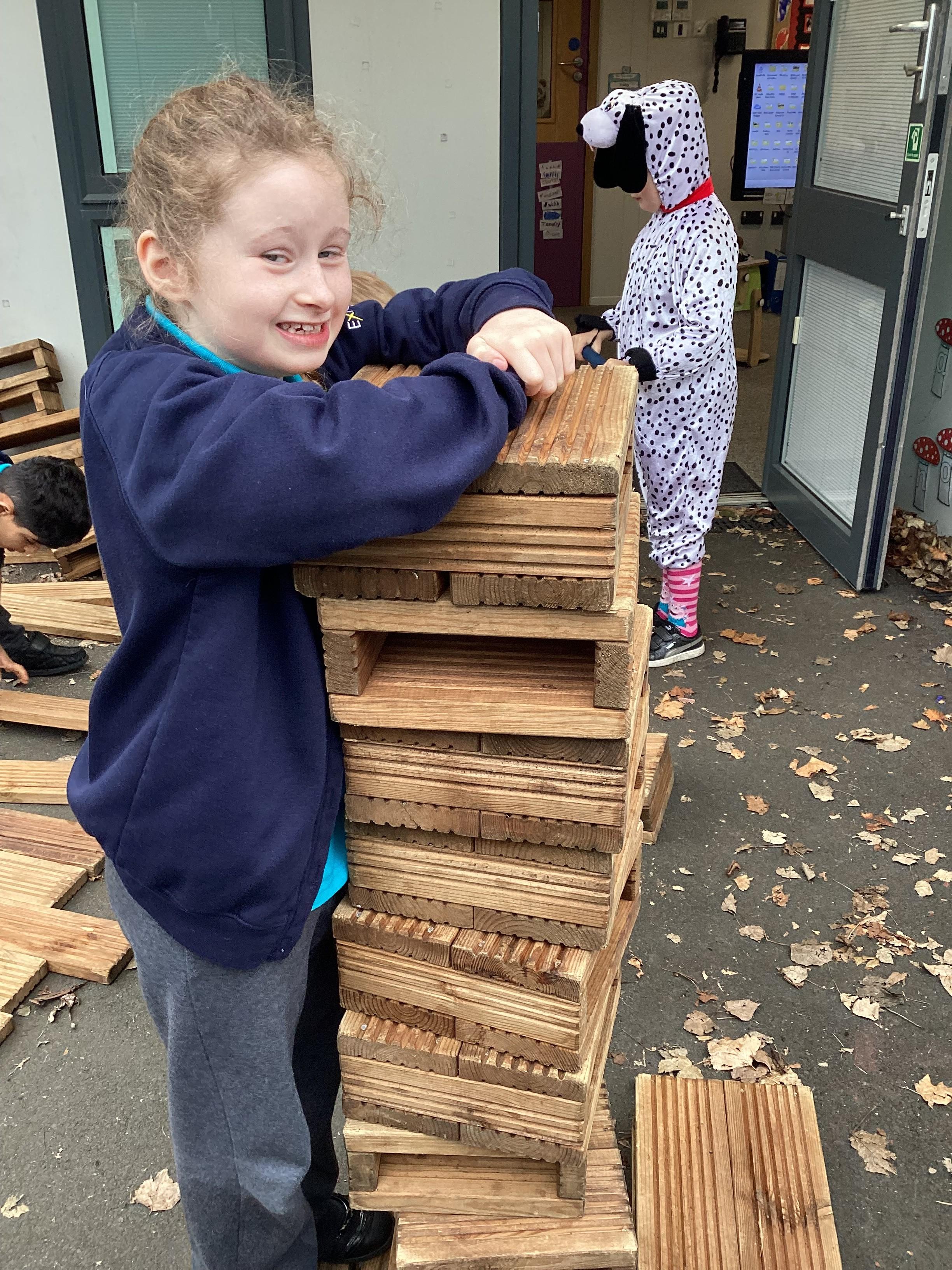 In maths, Panda Class have been working on tall and short. We built towers outside using the big blocks.Some of our towers were bigger than us so we used our problem solving skills to try to make ourselves taller using the blocks.