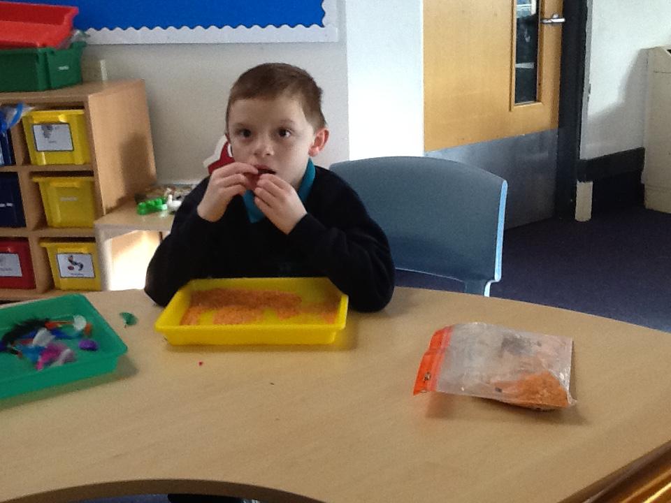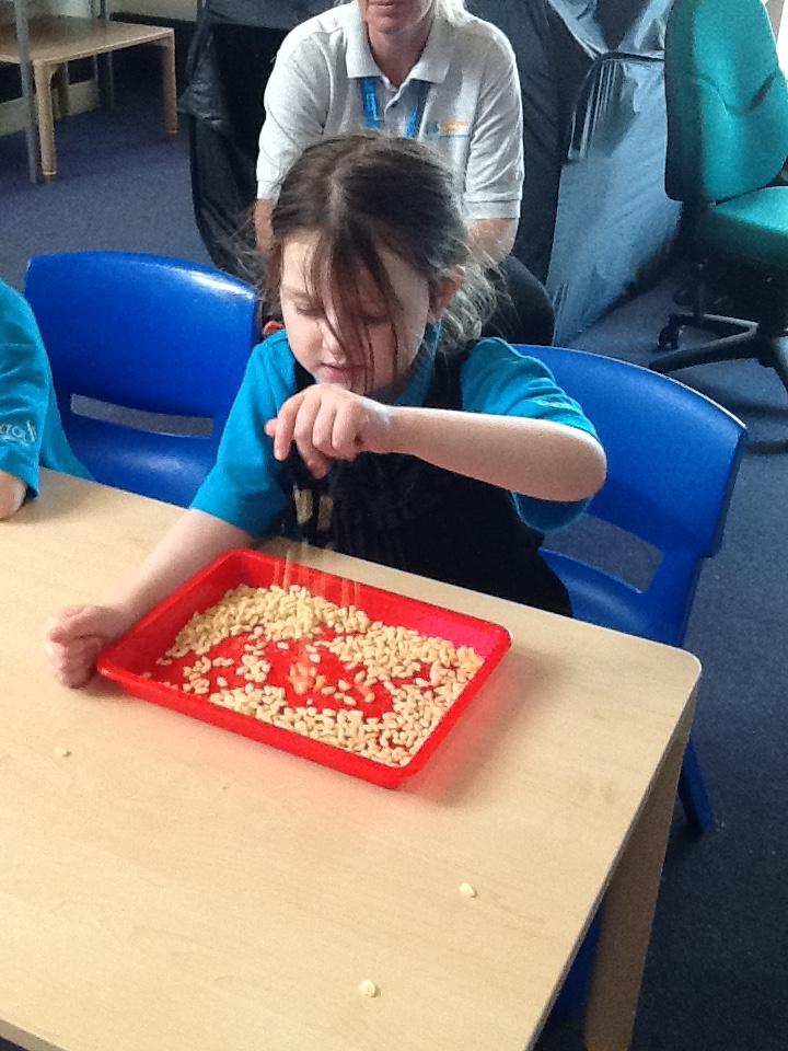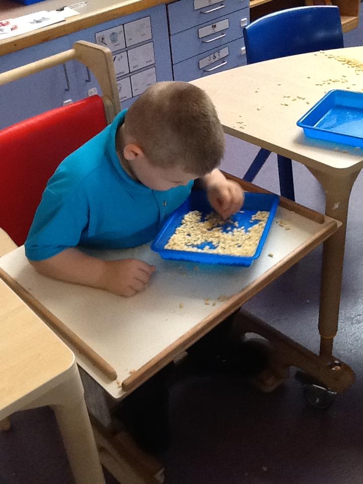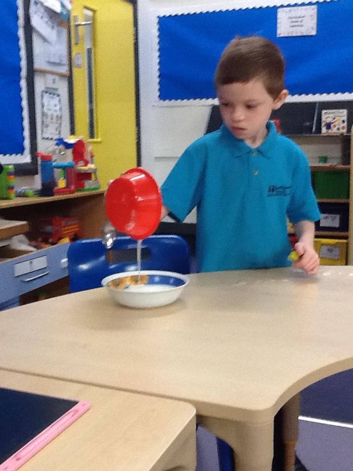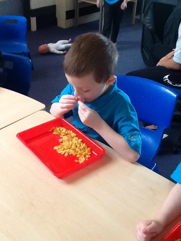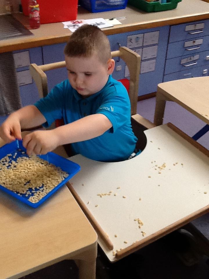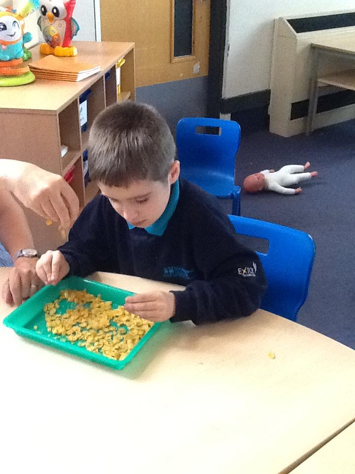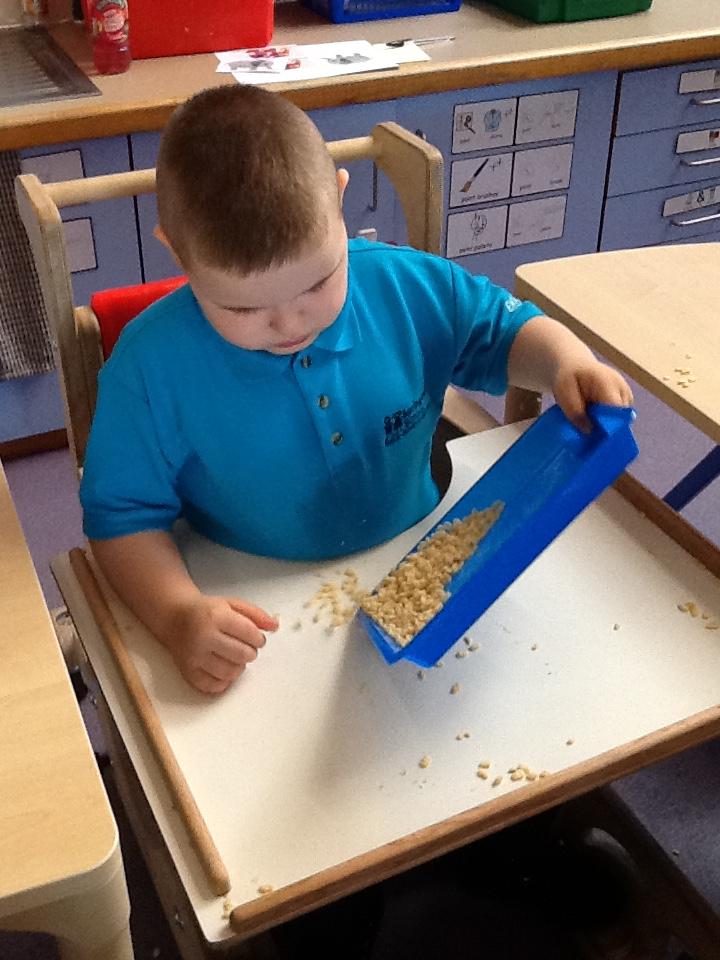 In our sensory play on Monday we really enjoyed exploring and tasting the cereal. We tipped it, picked it up and watched it fall into our tray.