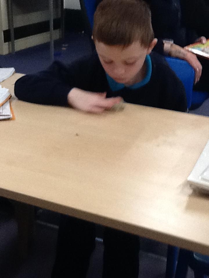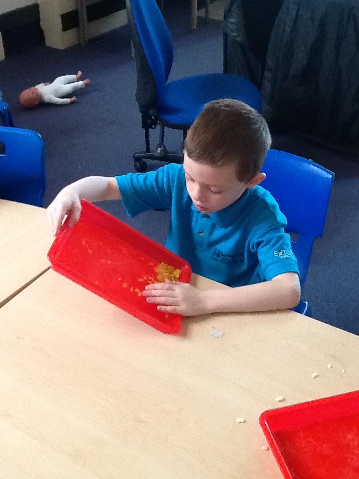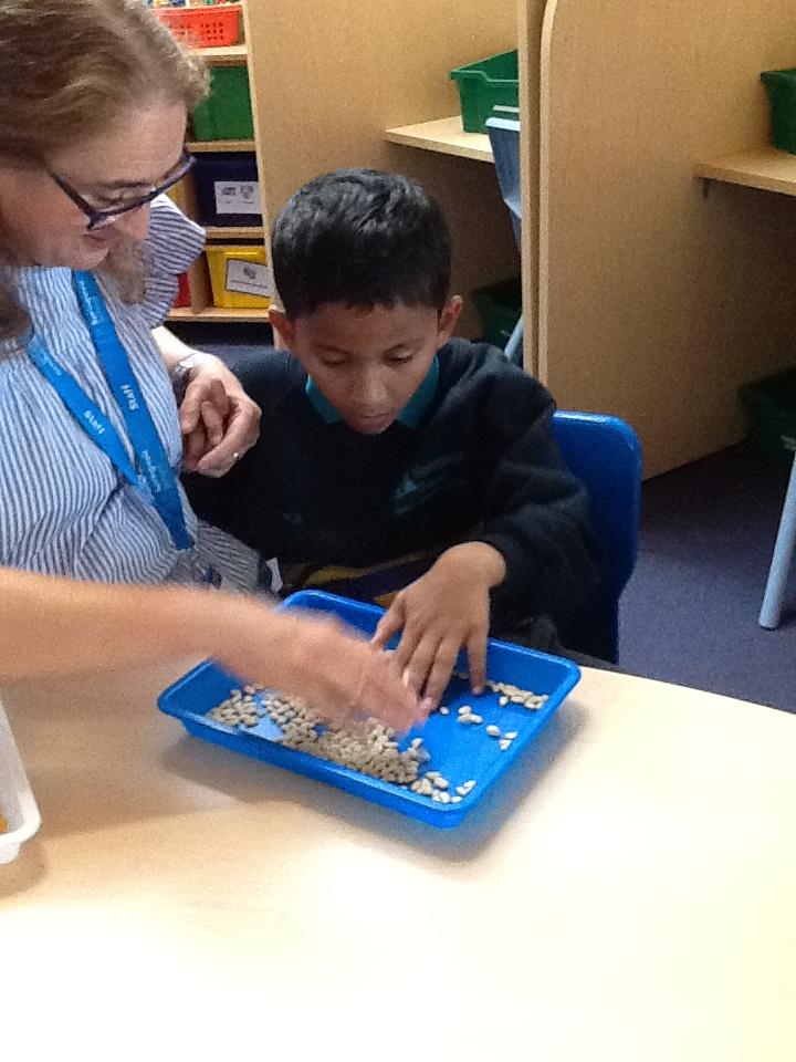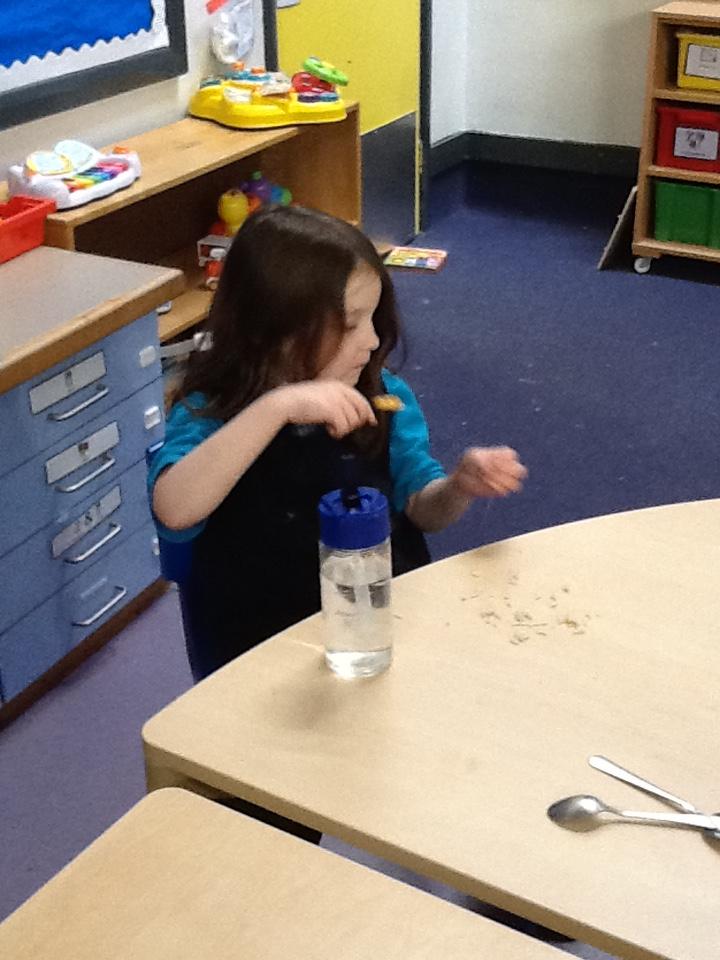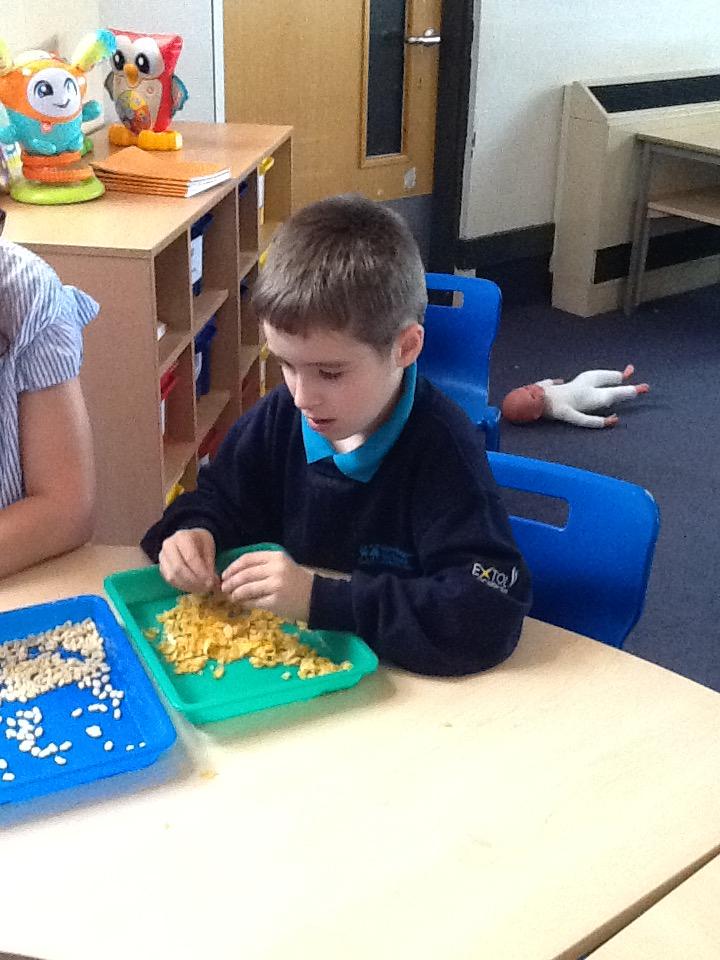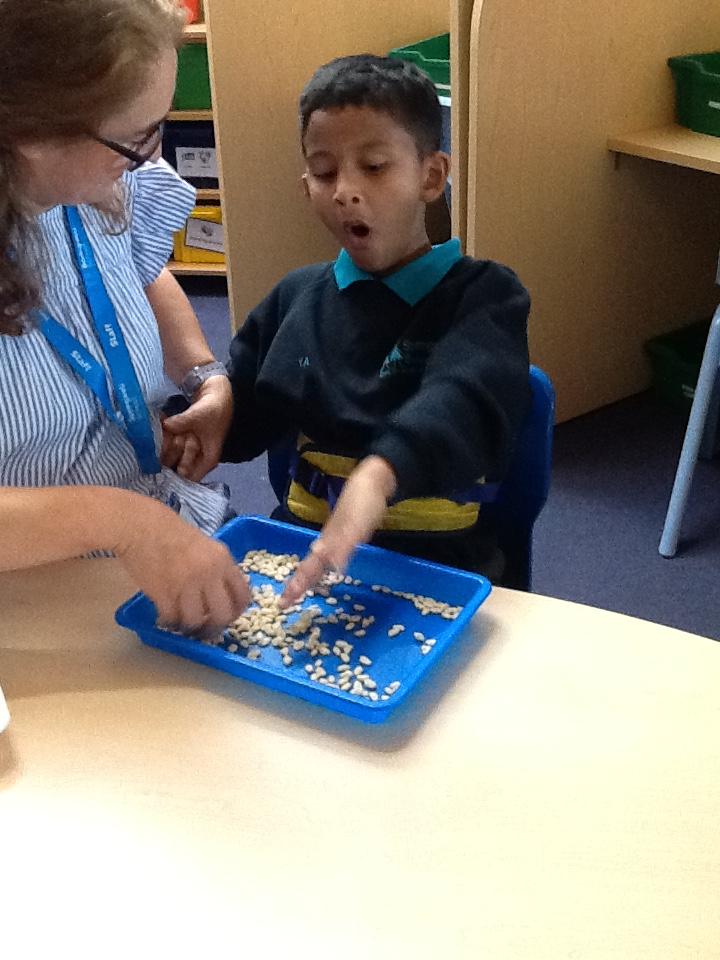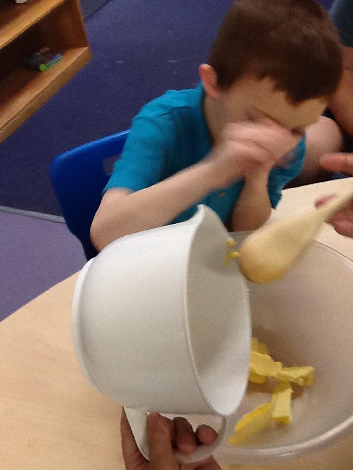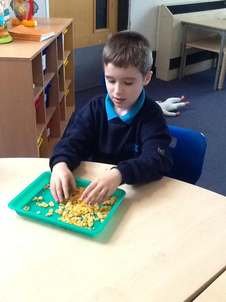 In our sensory play on Monday we really enjoyed exploring and tasting the cereal. We tipped it, picked it up and watched it fall into our tray.