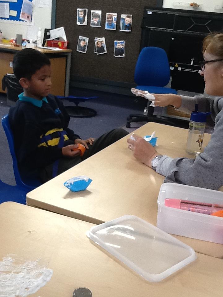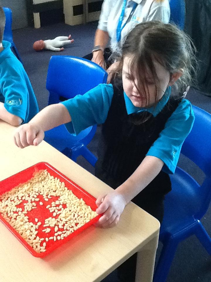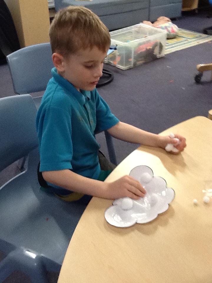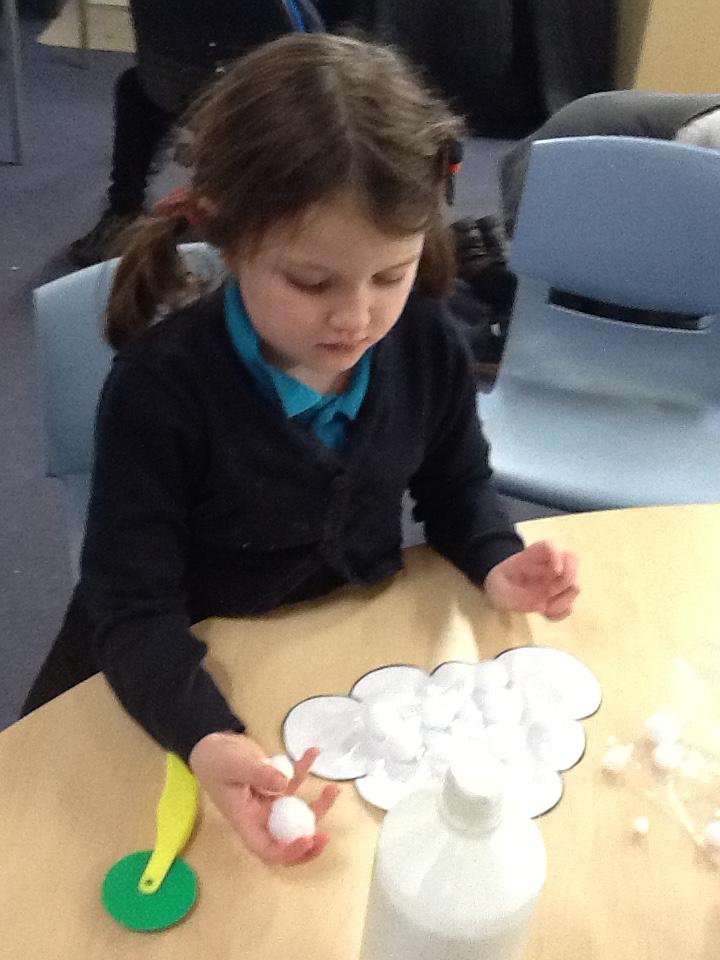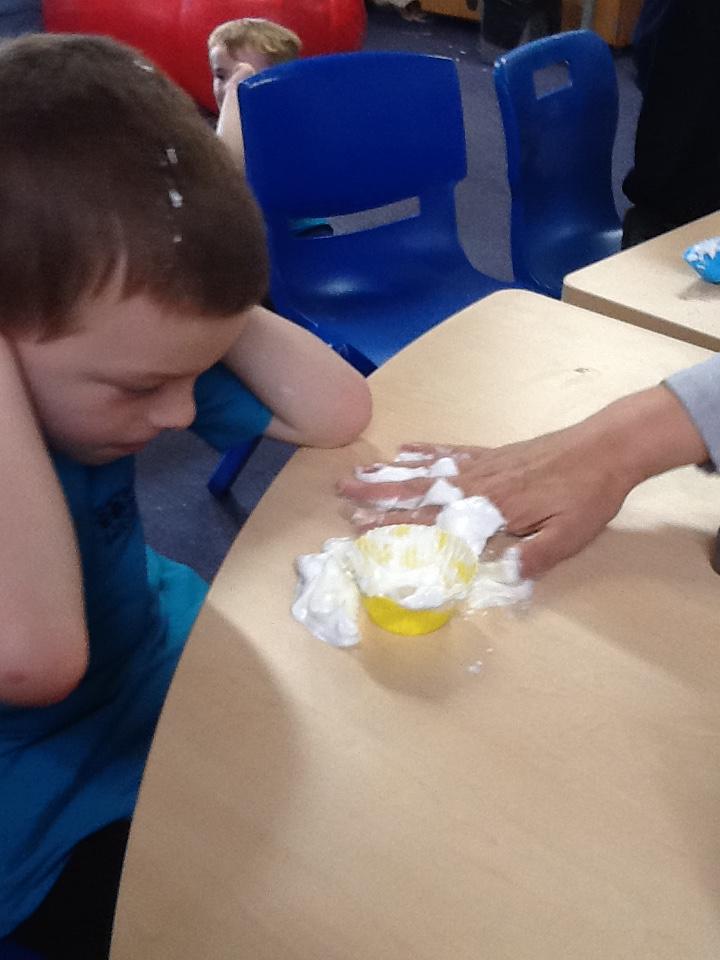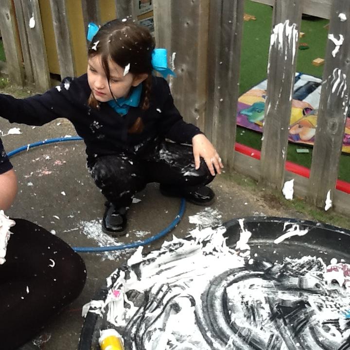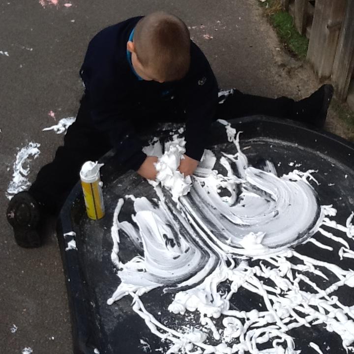 Maths: We enjoy sensory maths singing 5 Currant Buns then splatting the bun case with shaving foam. We count the buns as we sing. Afterwards we enjoy the sensory experience of making marks in the shaving foam.