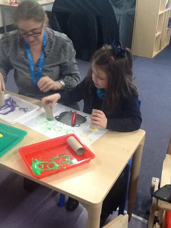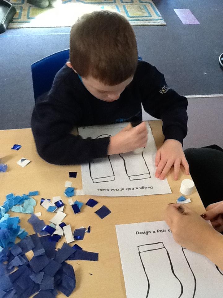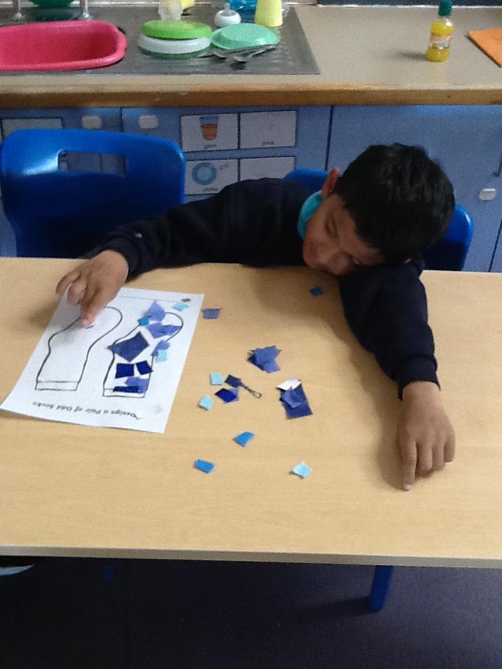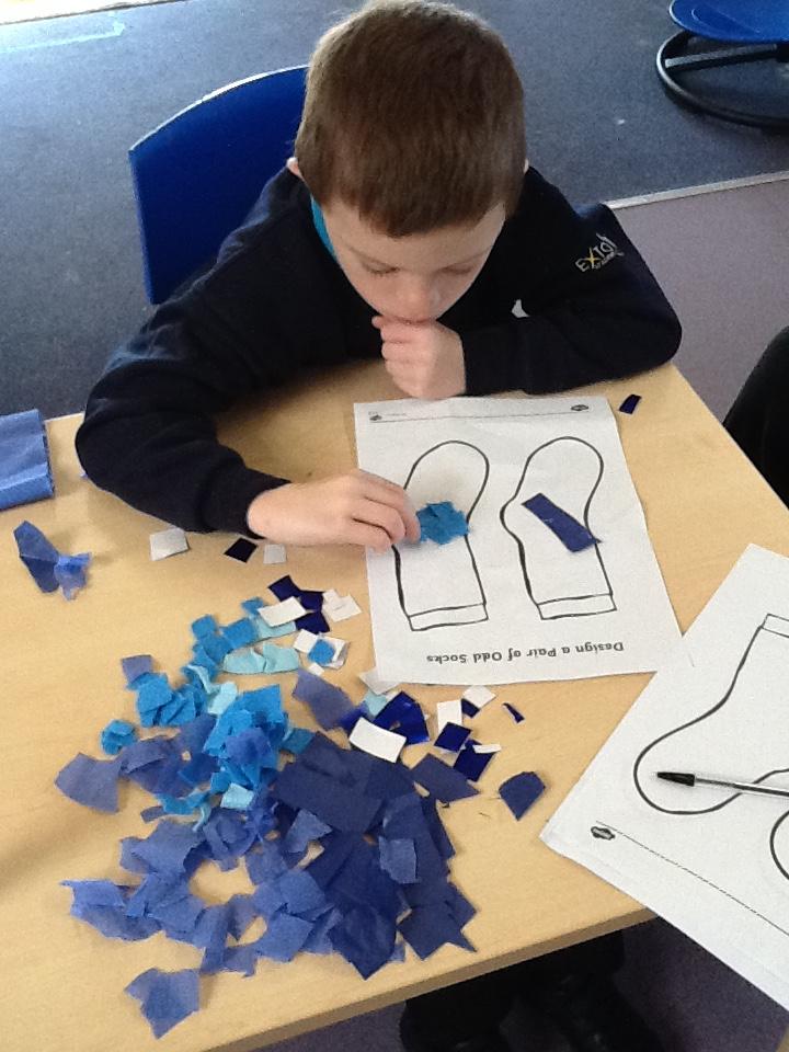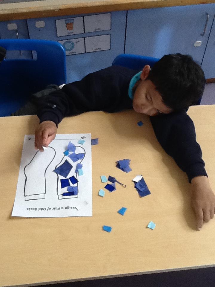 Our topic this term is about colours. Our story has different colours in it. There is a mouse sleeping in some blue socks so we decorated our own blue socks.