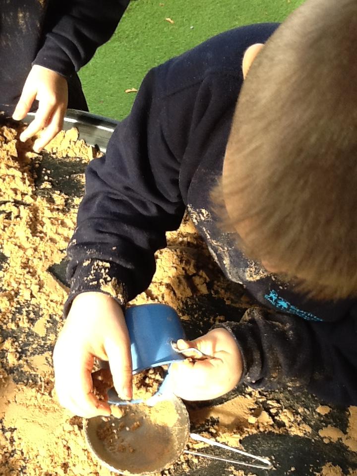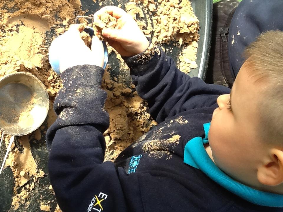 Our sensory play this week has included sand, gloop, dried pasta and red lentils. We enjoy exploring the different textures and also emptying and filling containers.
