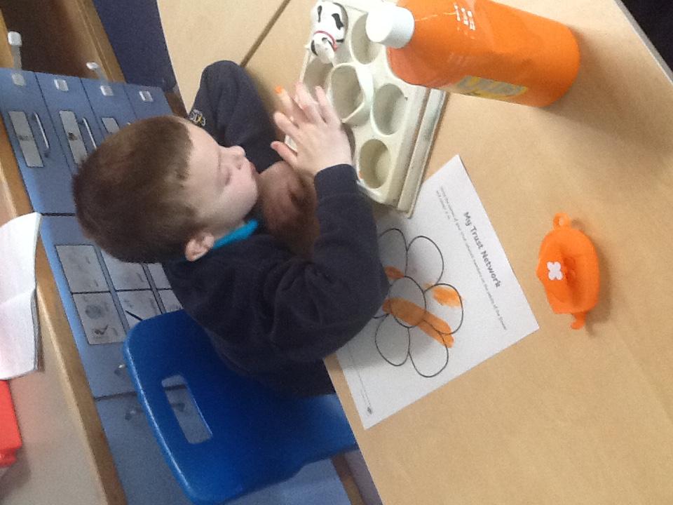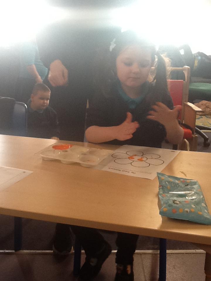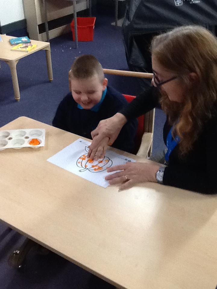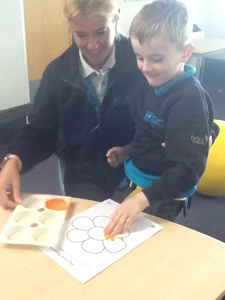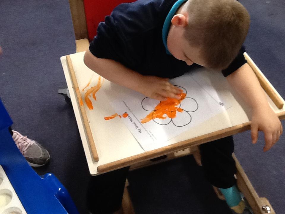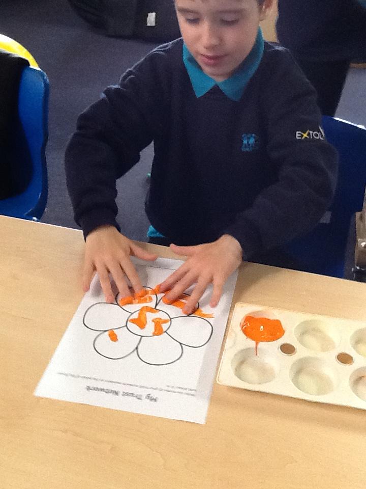 Monday 10th November 2025. In our story "Wow said the Owl" there are orange flowers that the owl enjoyed seeing. We enjoyed finger painting the flowers with orange paint.