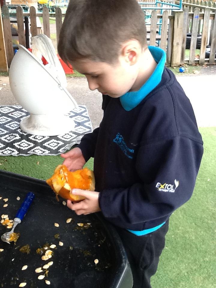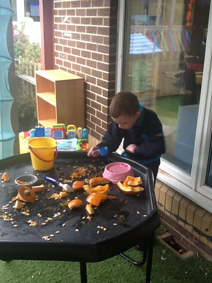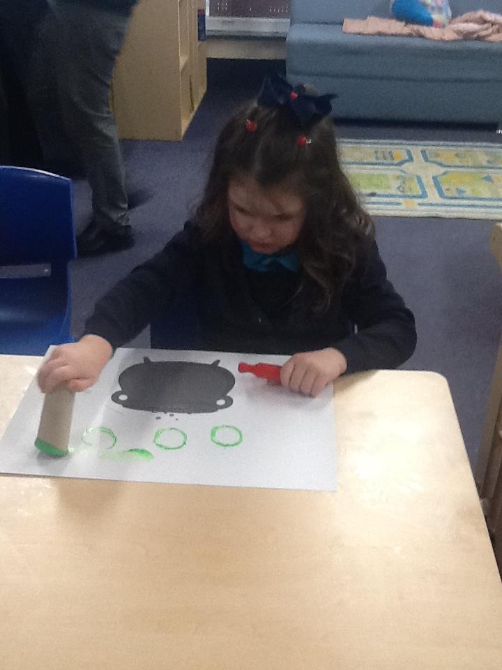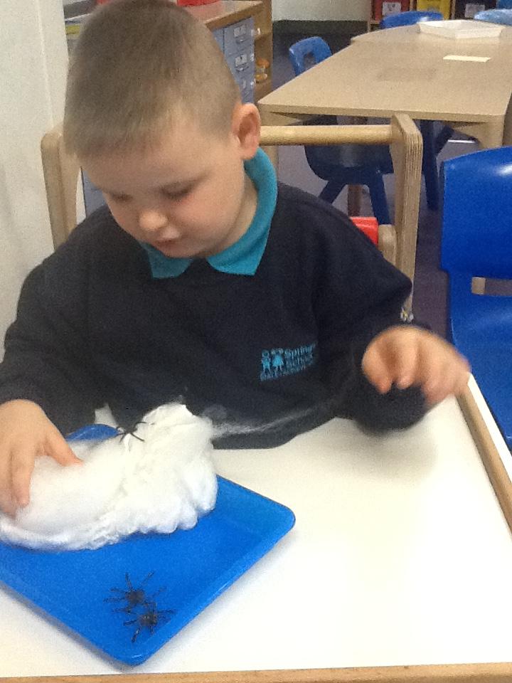 Thursday 23rd October 2025. We enjoyed some Halloween crafts: painting bubbles on a cauldron where we took turns to make our bubble, exploring cinnamon playdough and exploring pumpkins. We also found a big spider's web.