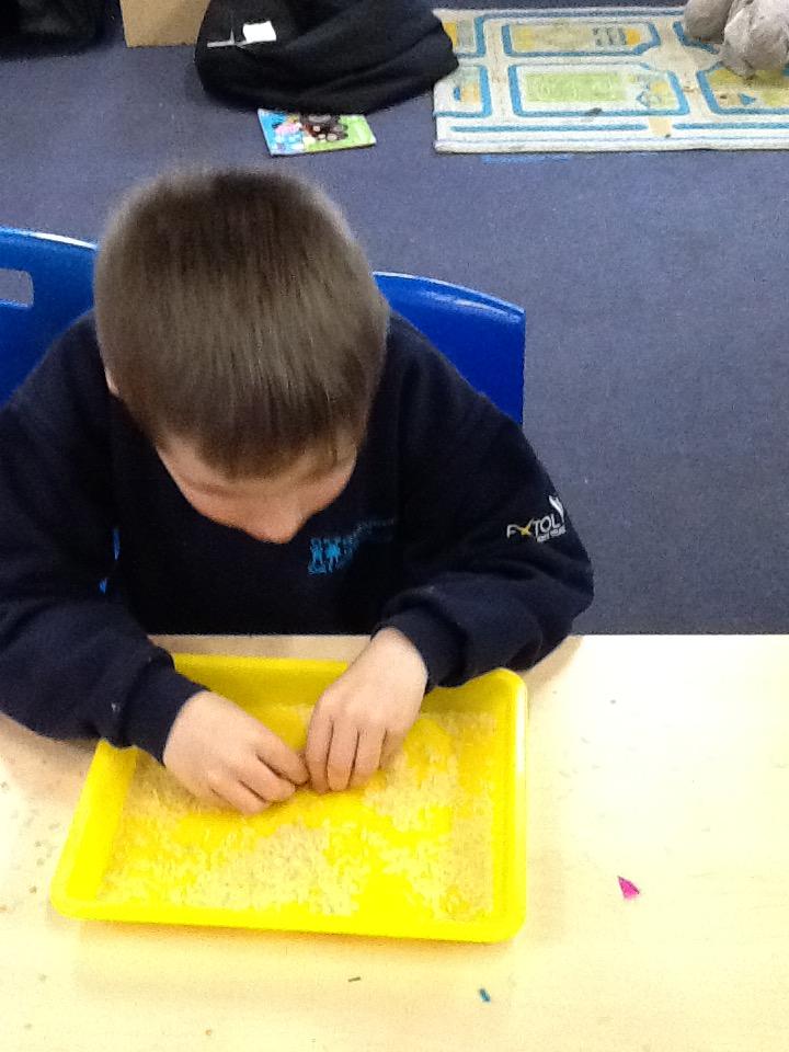 We work on our fine motor skills in lots of different ways, mark making with crayons, in shaving foam, doing puzzles, slotting shapes into the shape sorter.