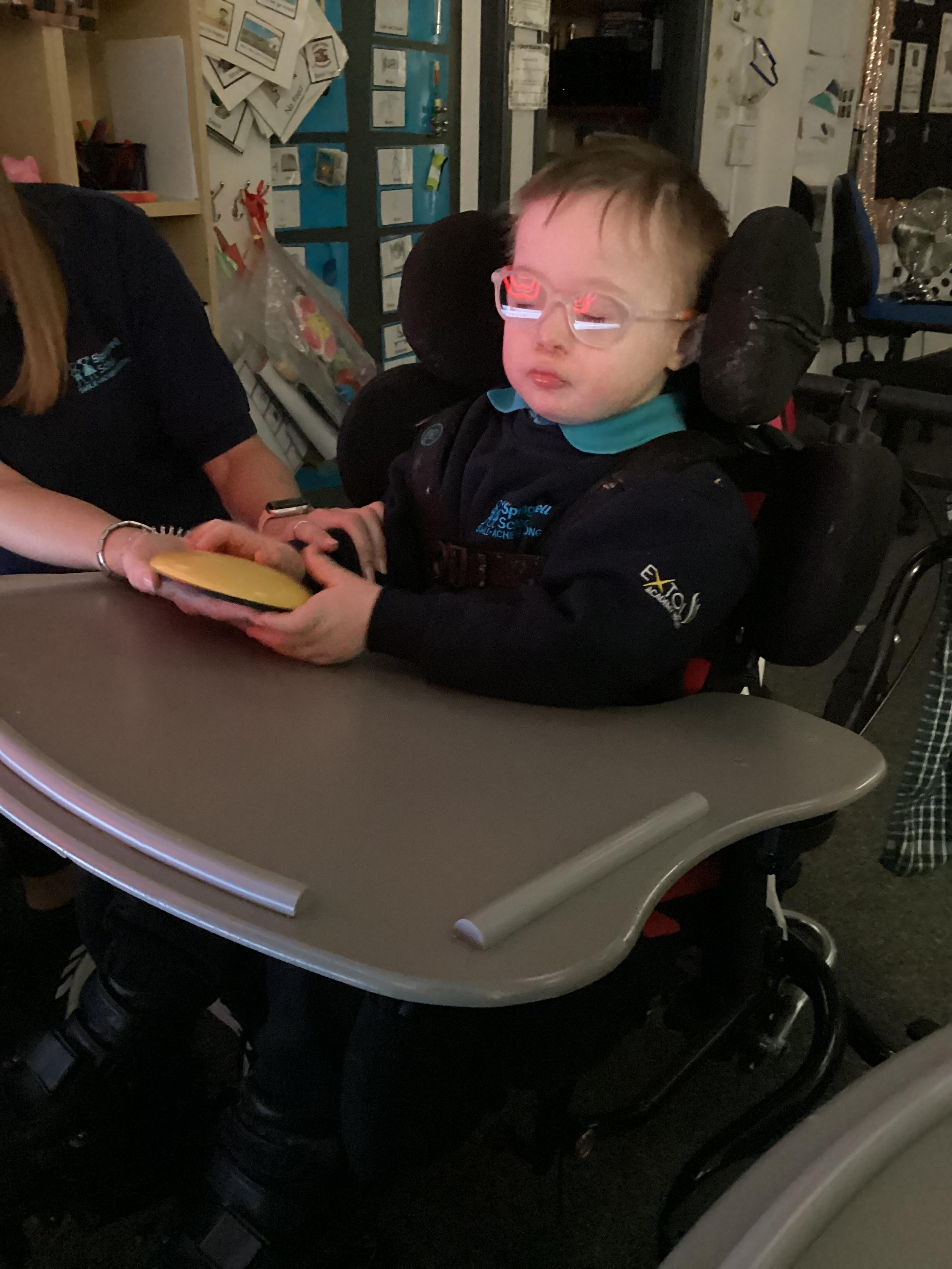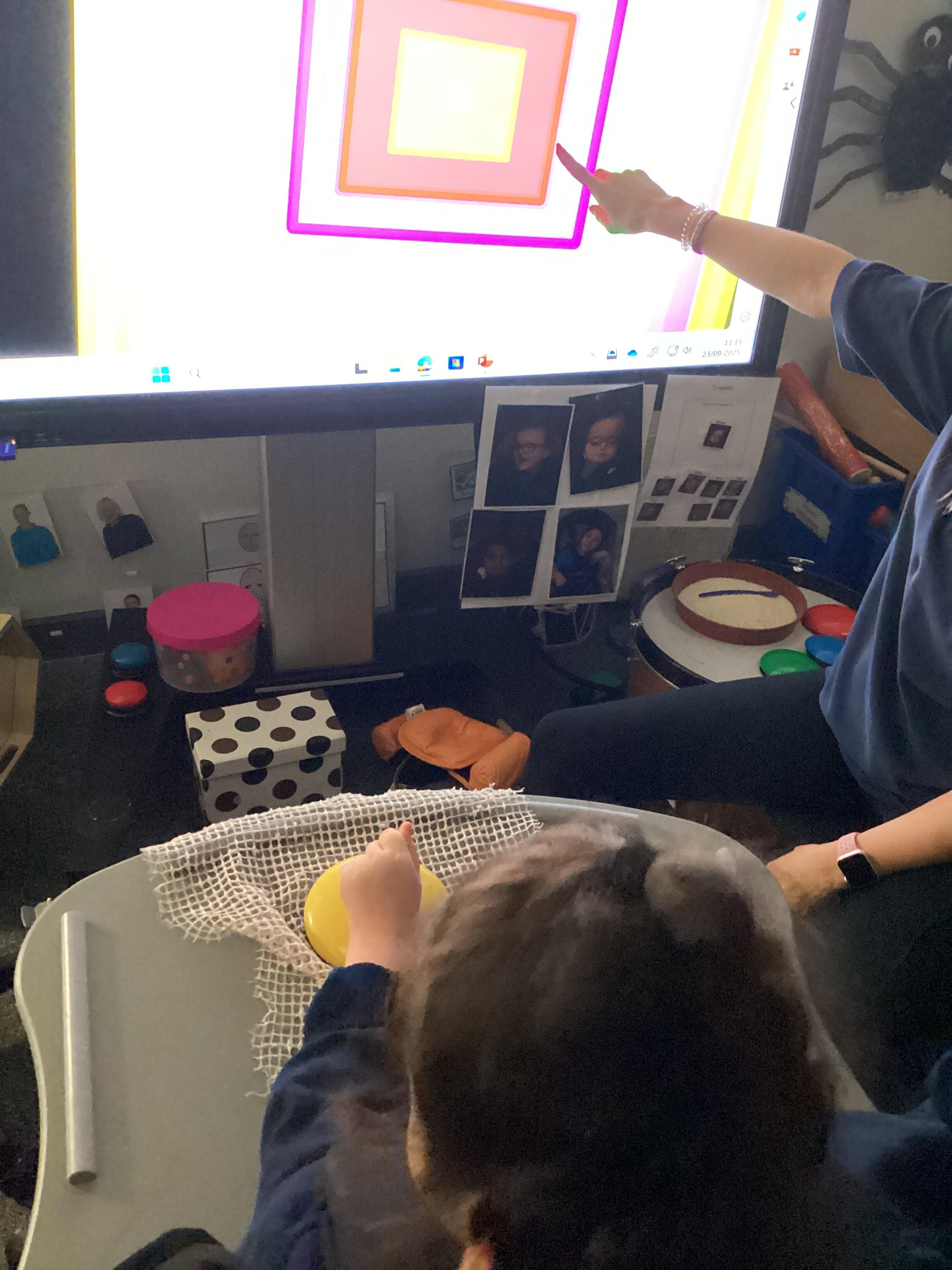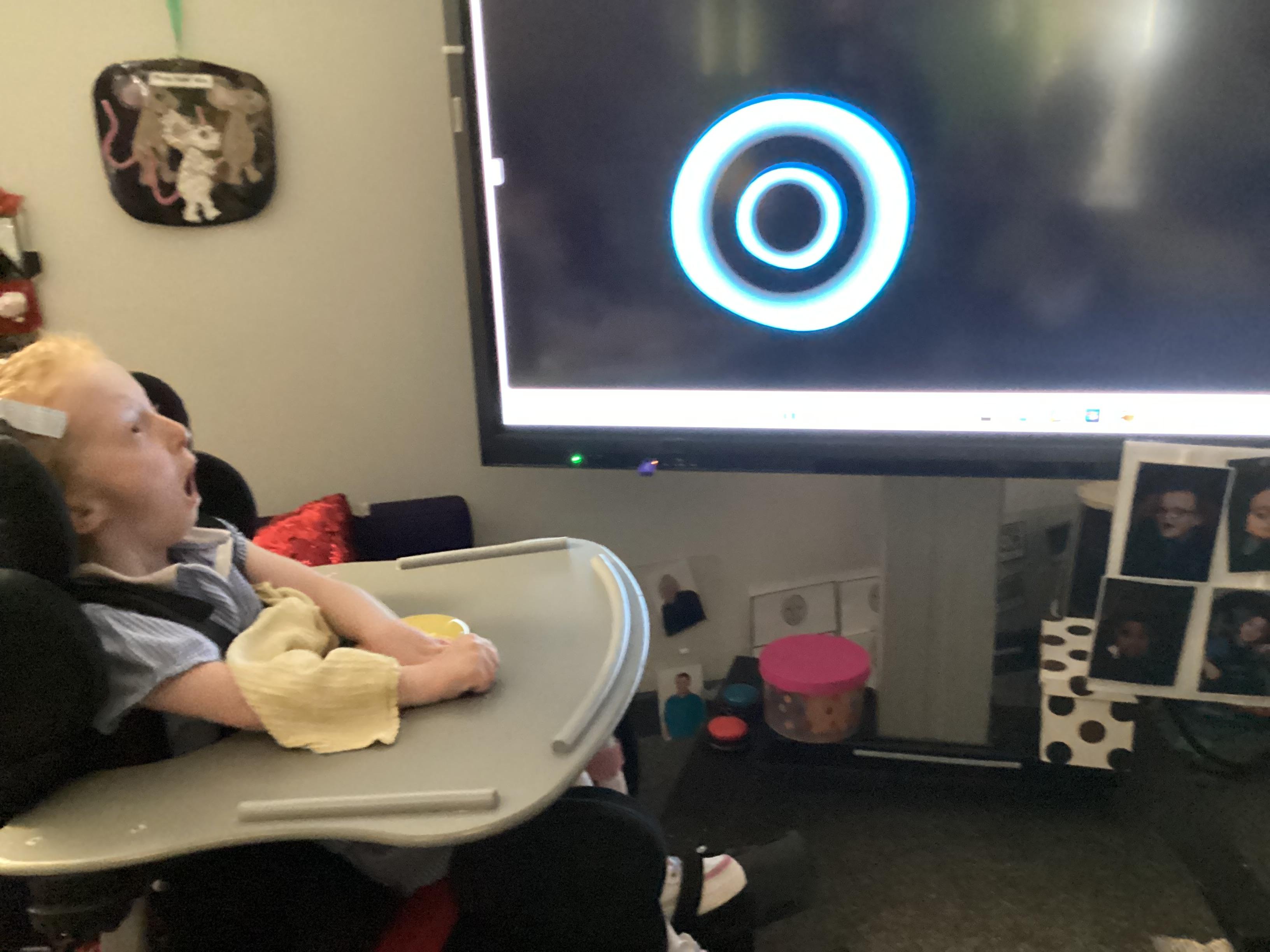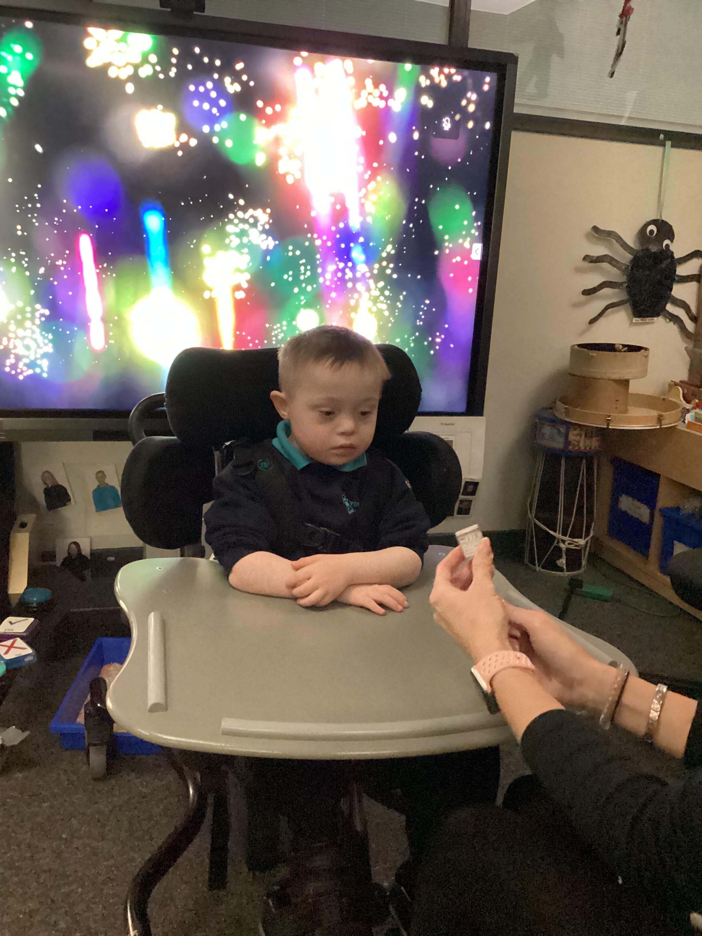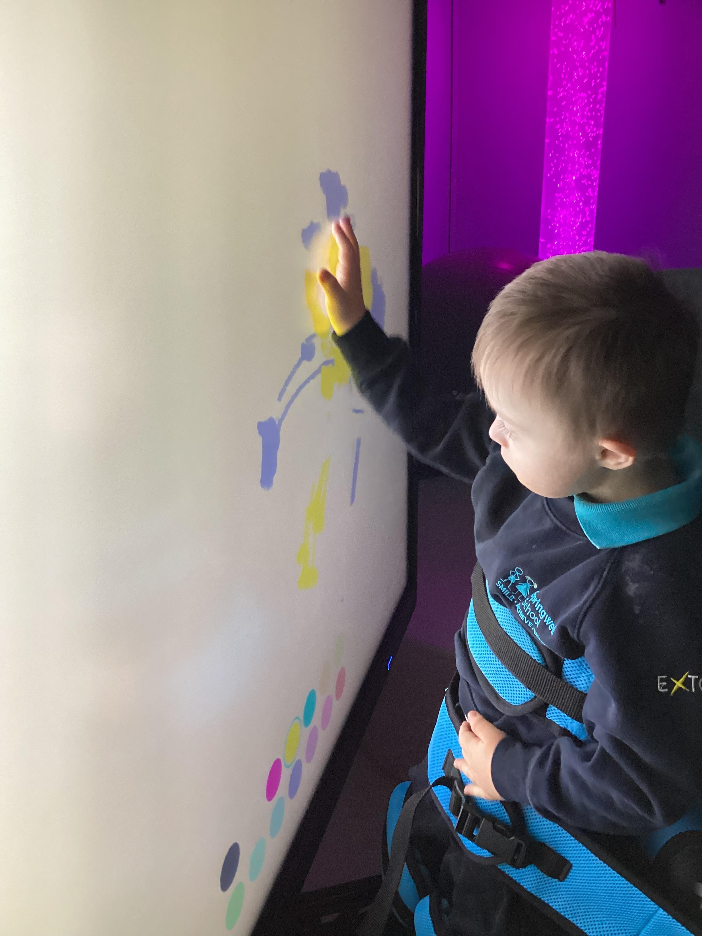Throughout each week we spend time in our standing frames, completing a range of fun activities linked to our targets. We love making marks on the interactive whiteboard and exploring sensory toys, making choices to indicate our preferred items.