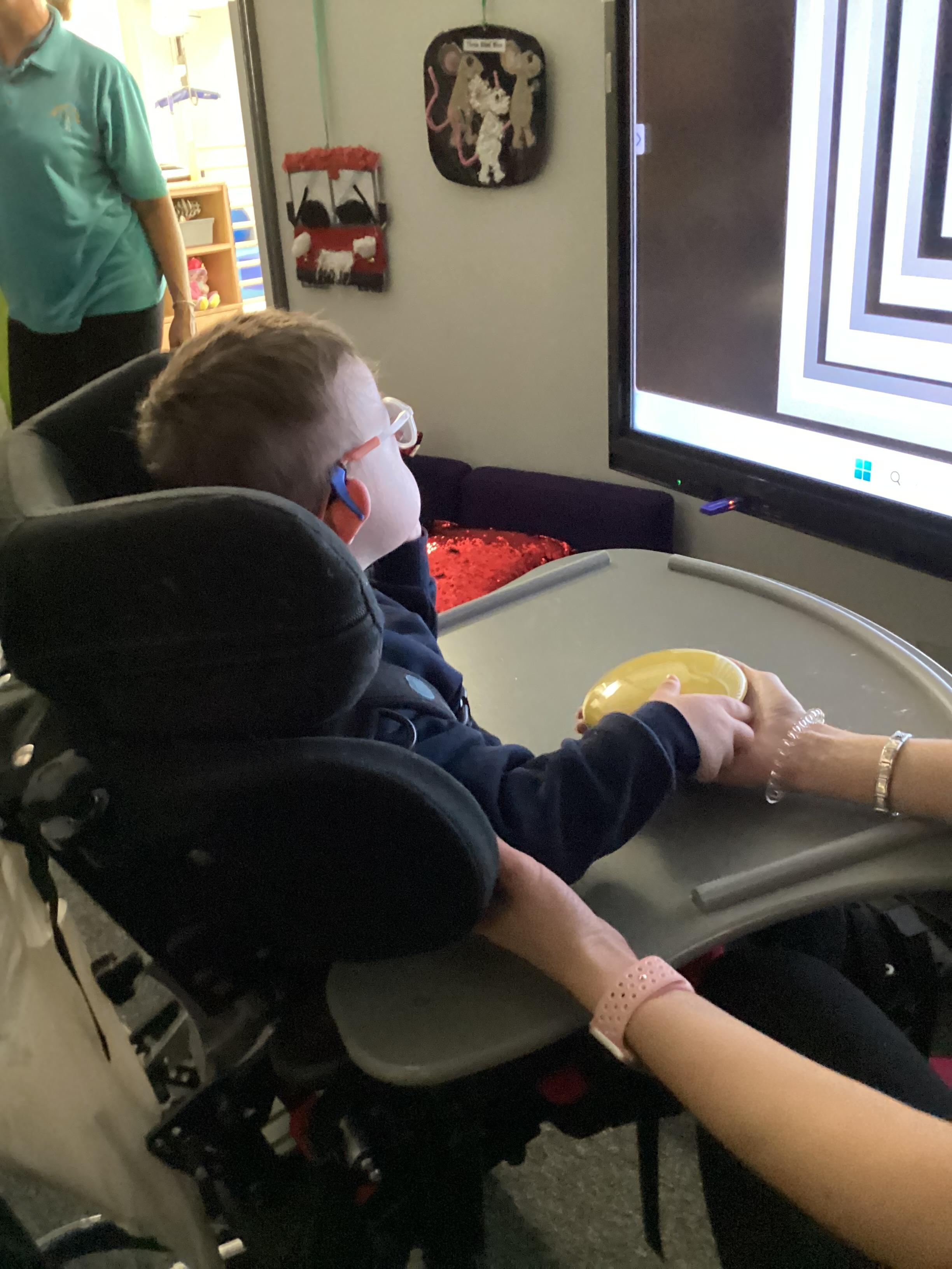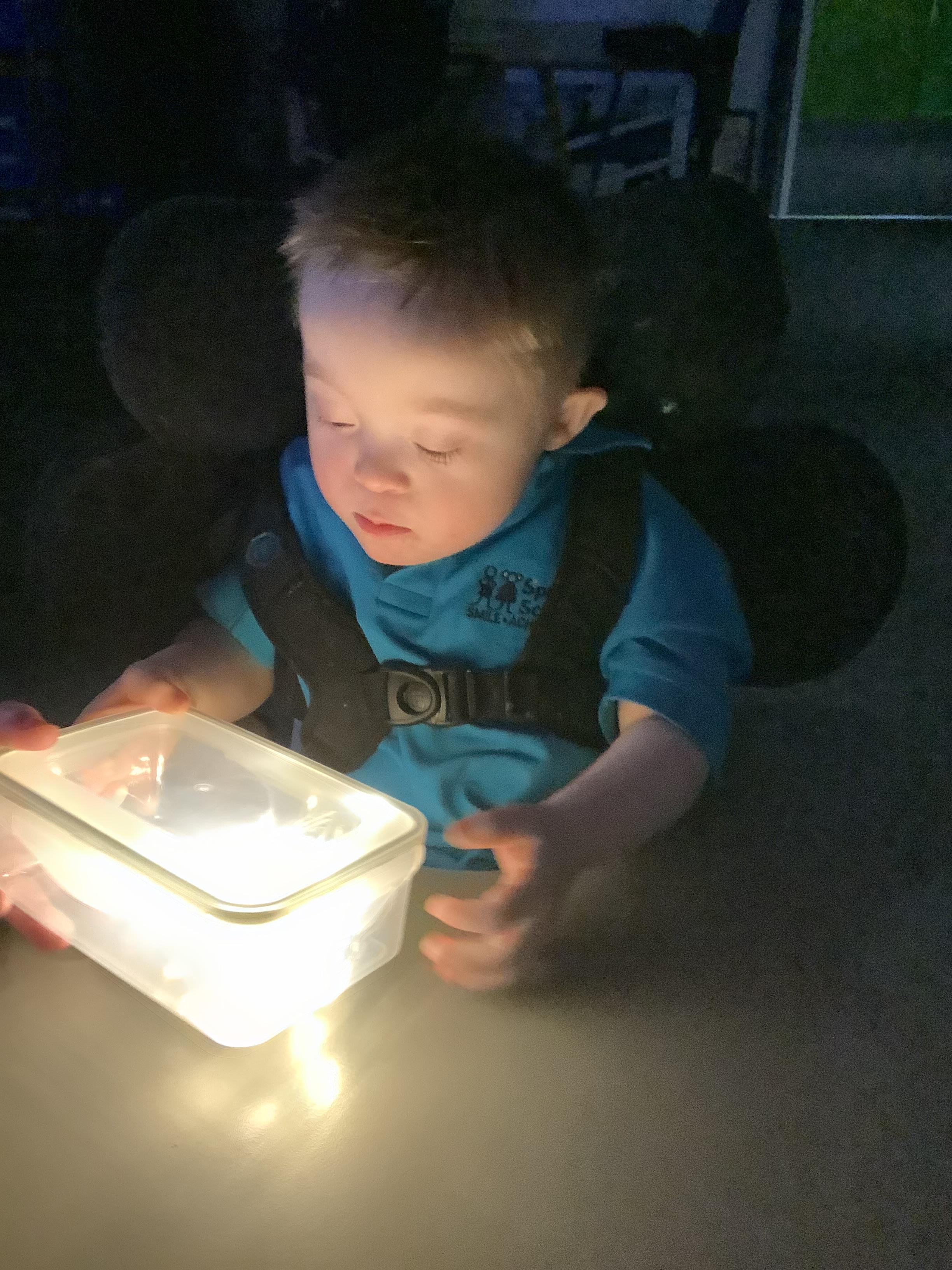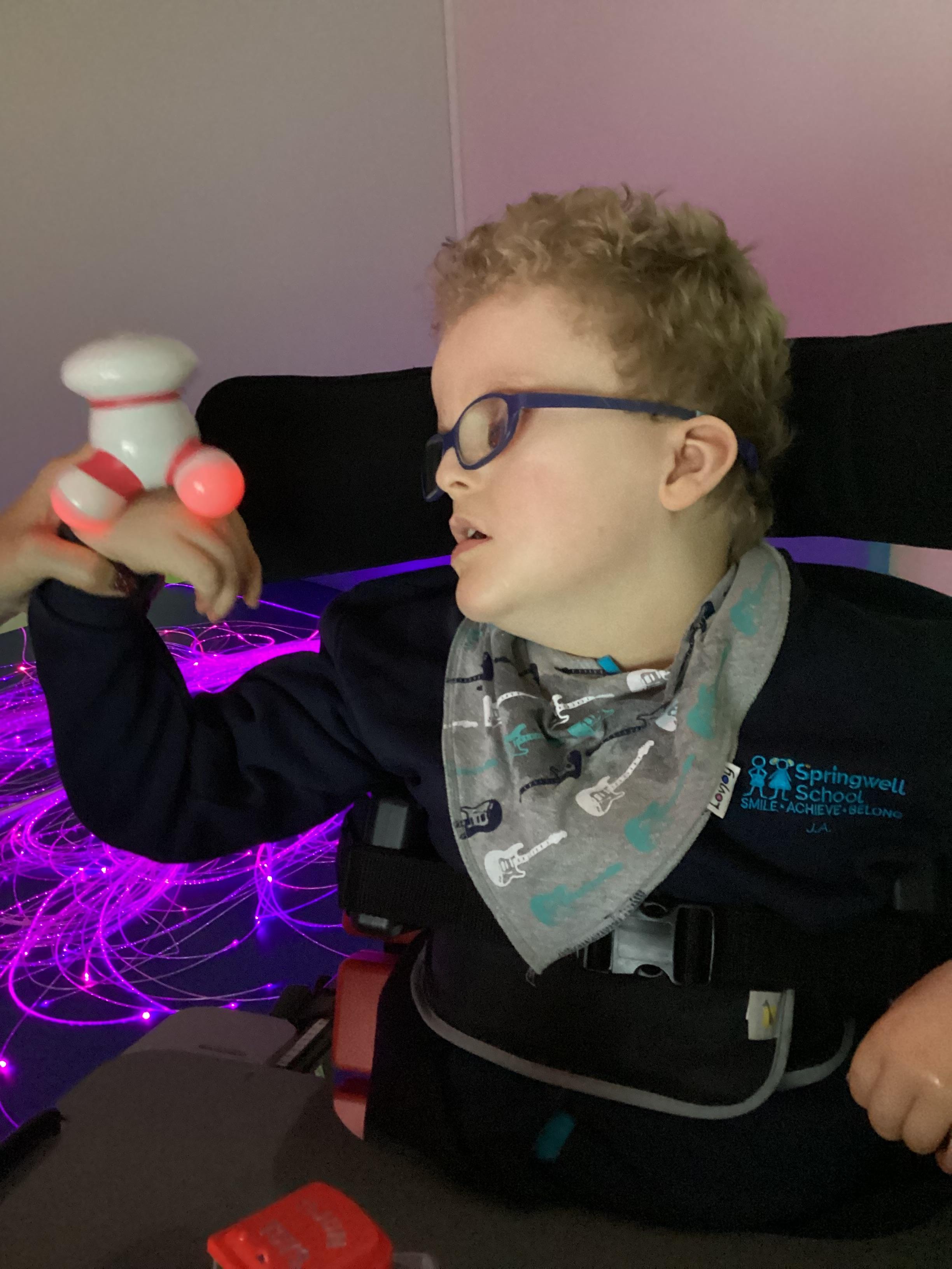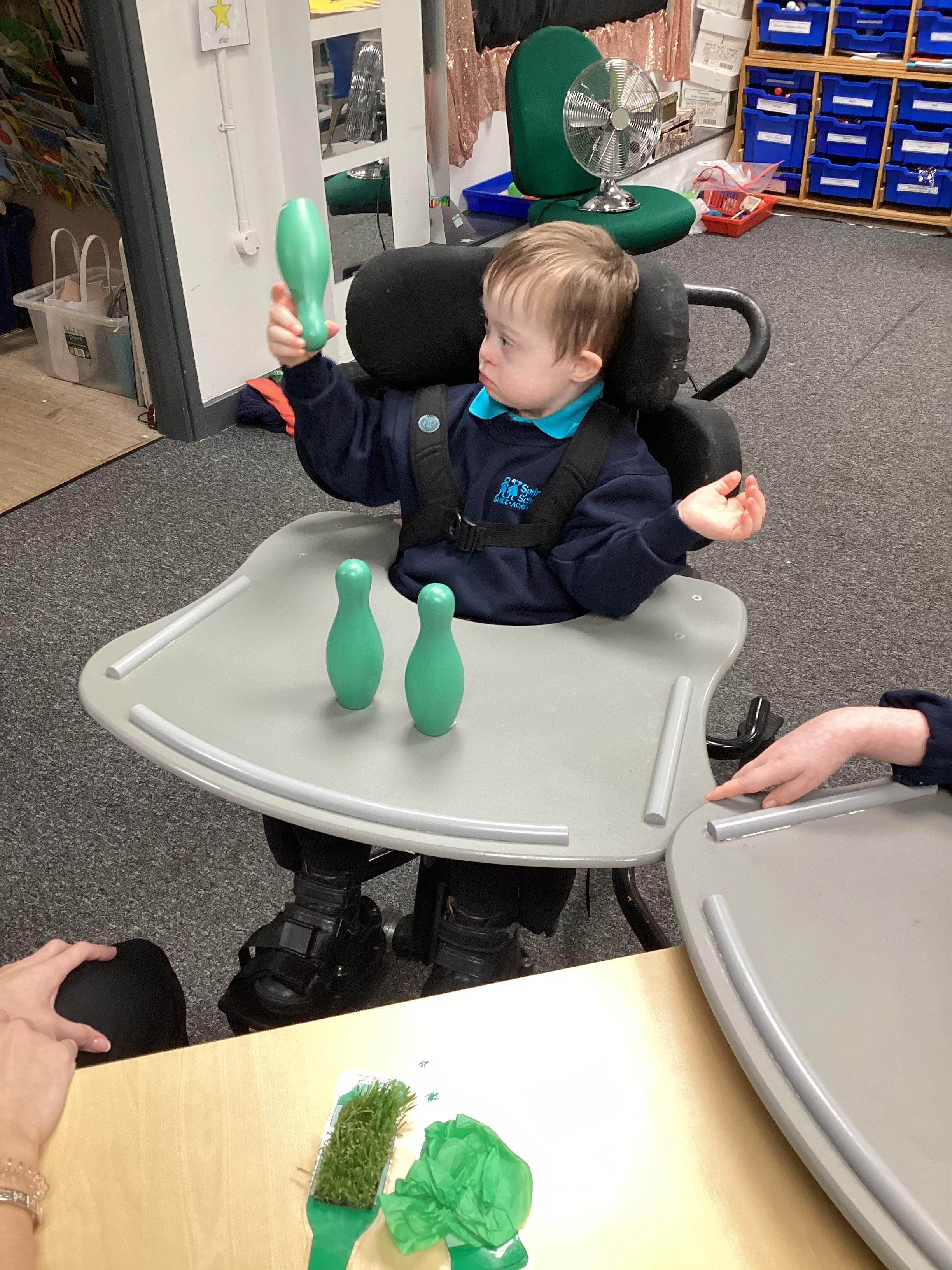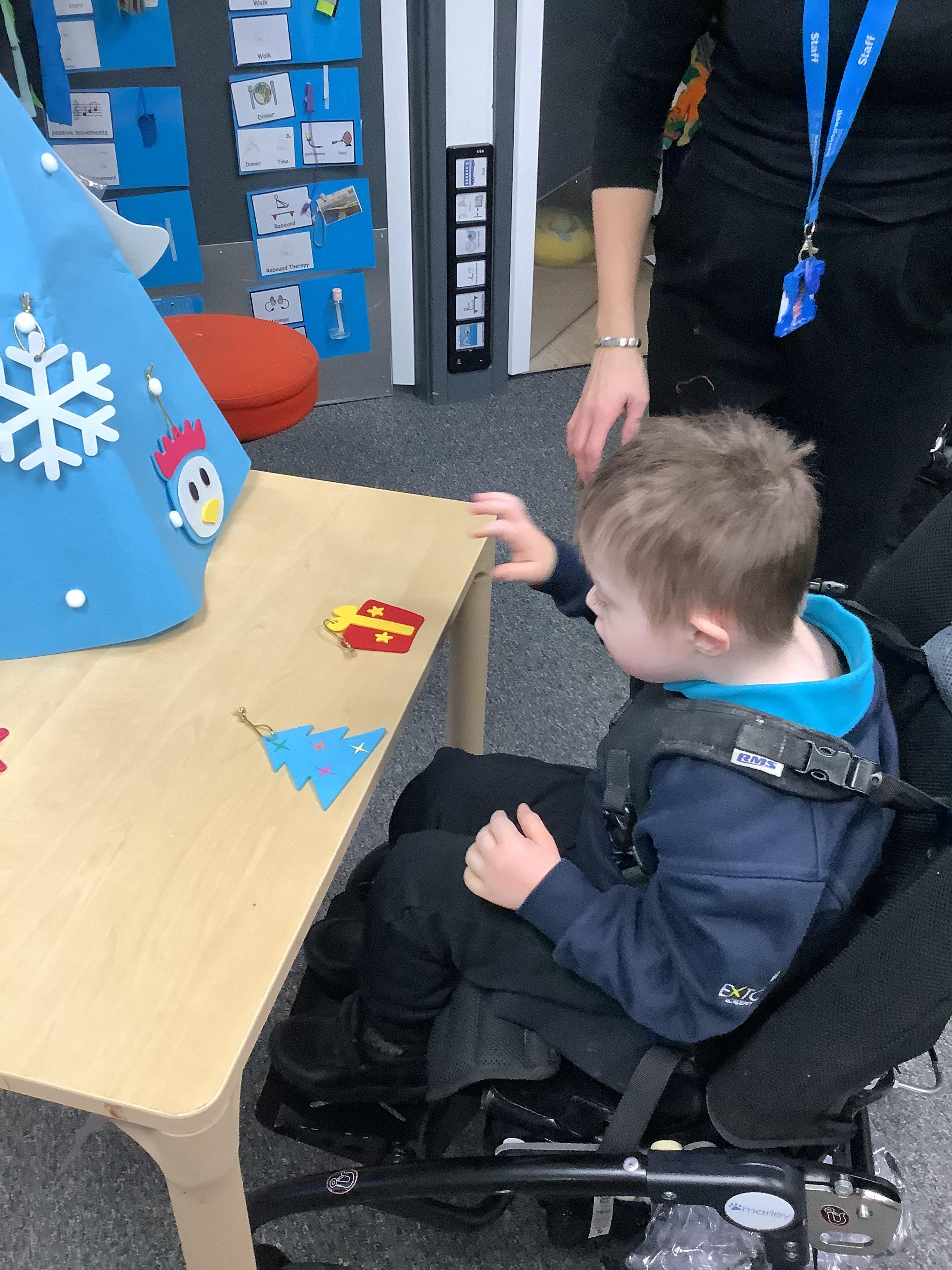 Throughout each week we spend time in our standing frames, completing a range of fun activities linked to our targets. We love making marks on the interactive whiteboard and exploring sensory toys, making choices to indicate our preferred items.