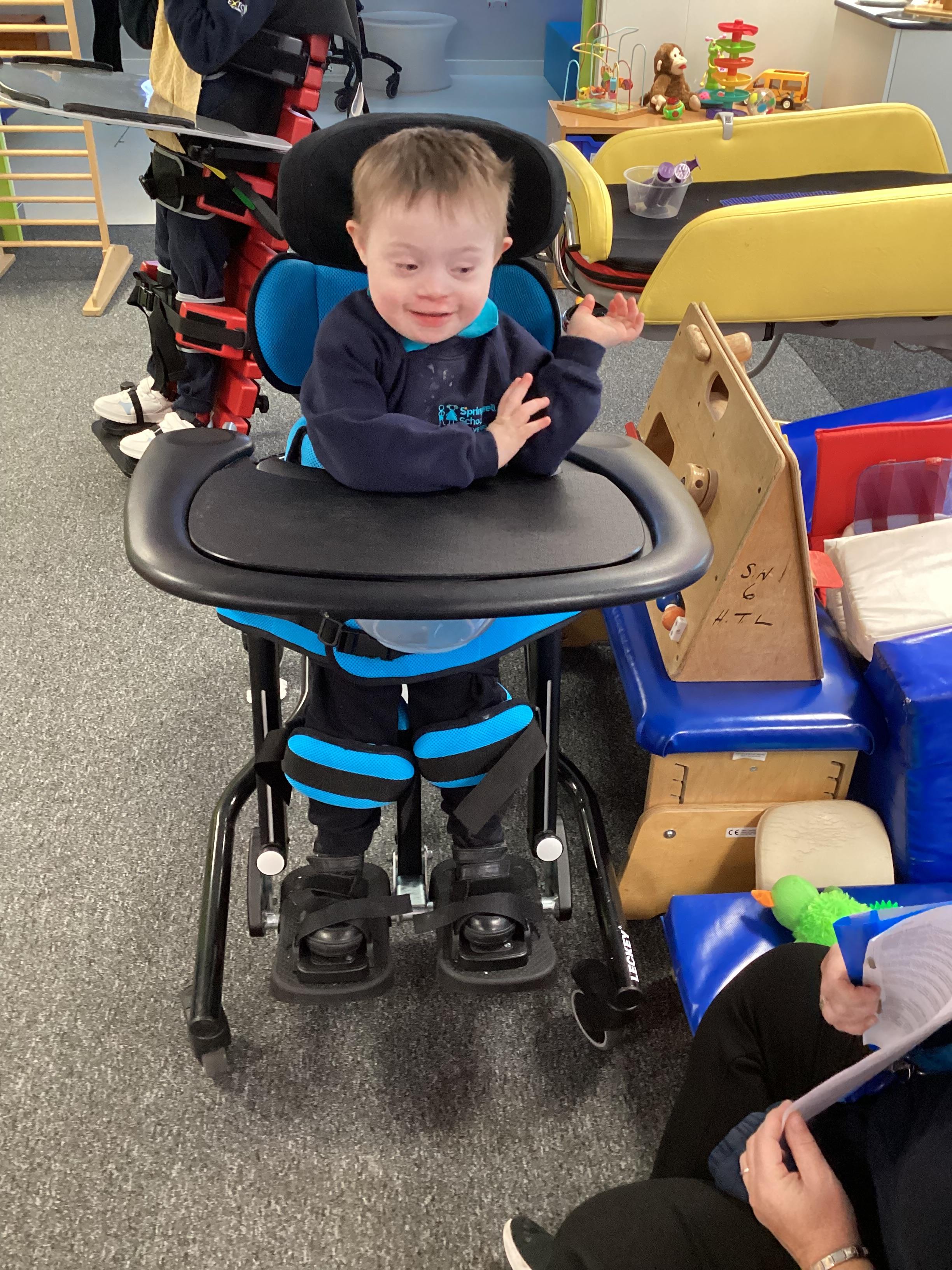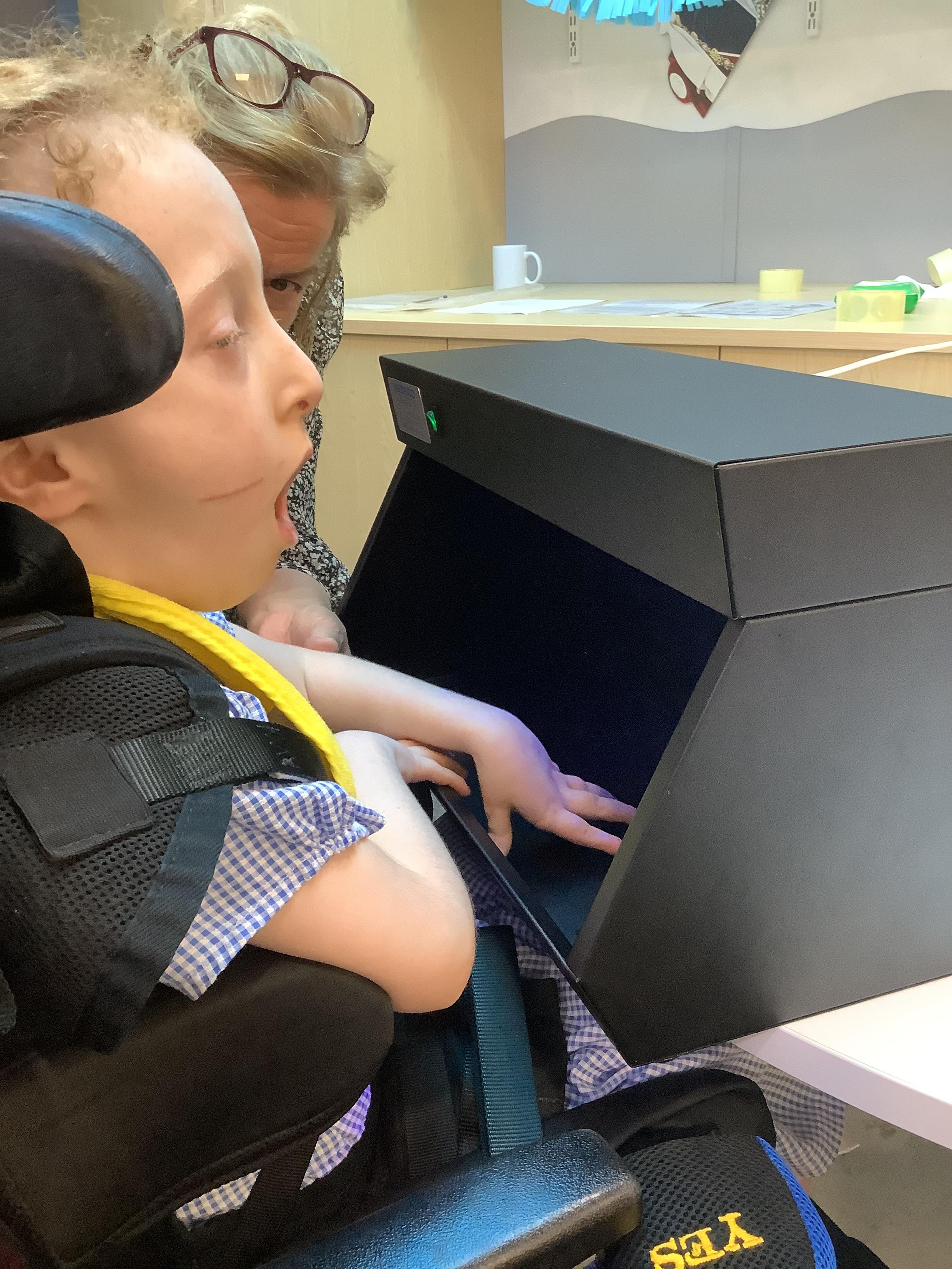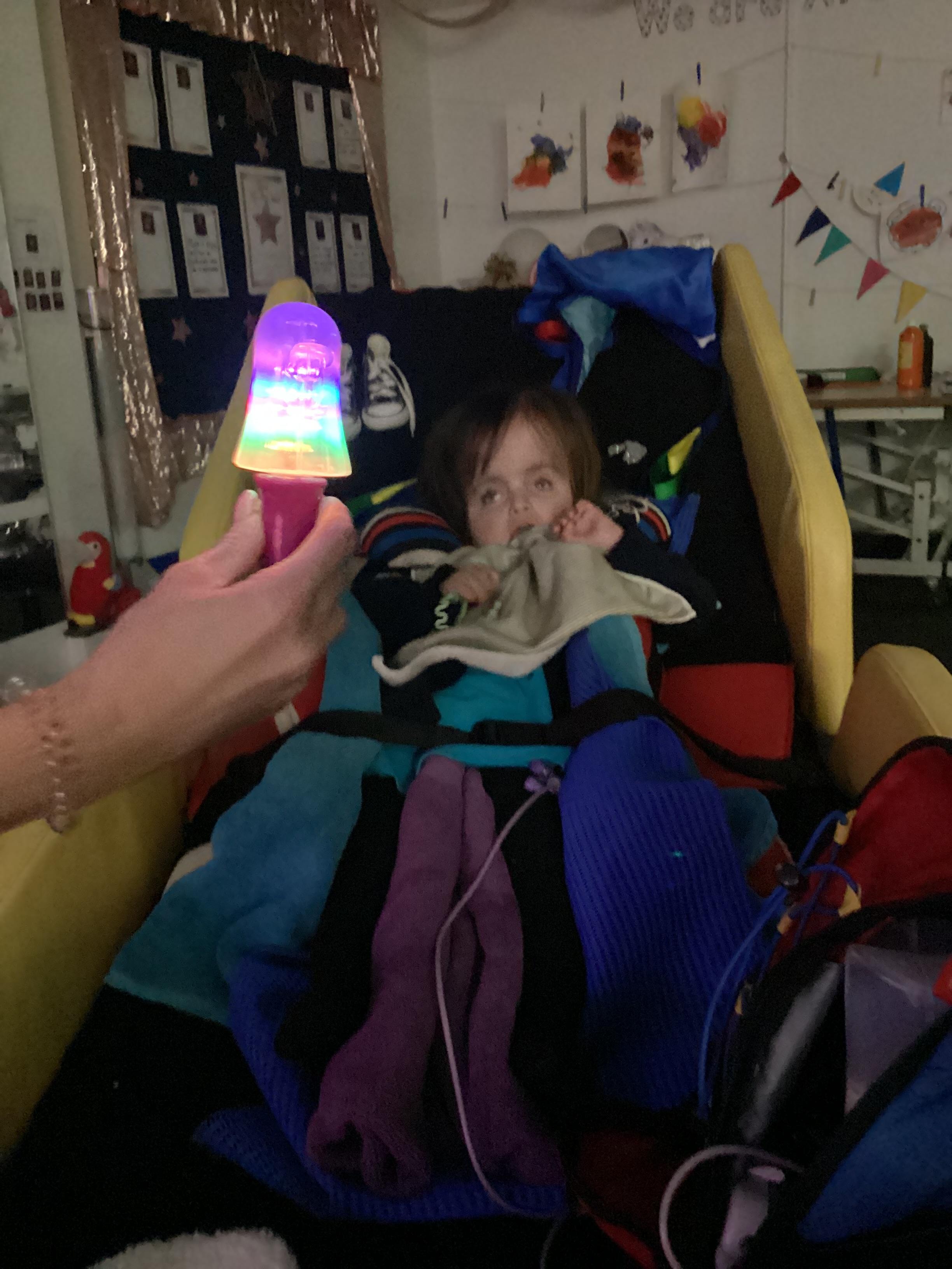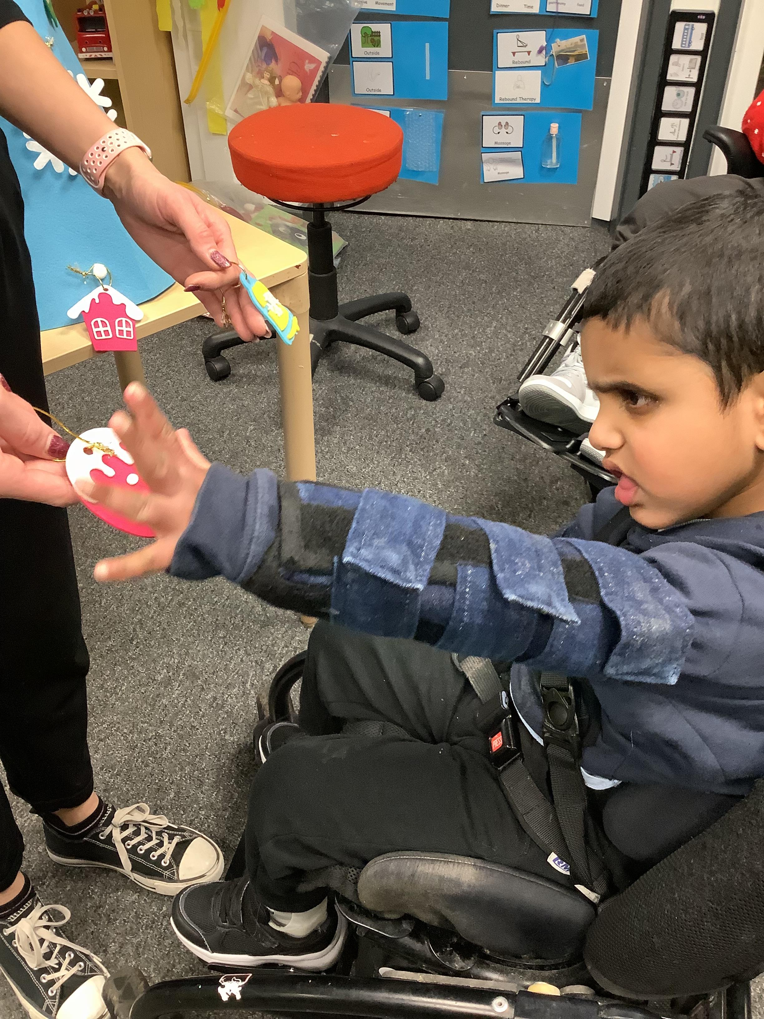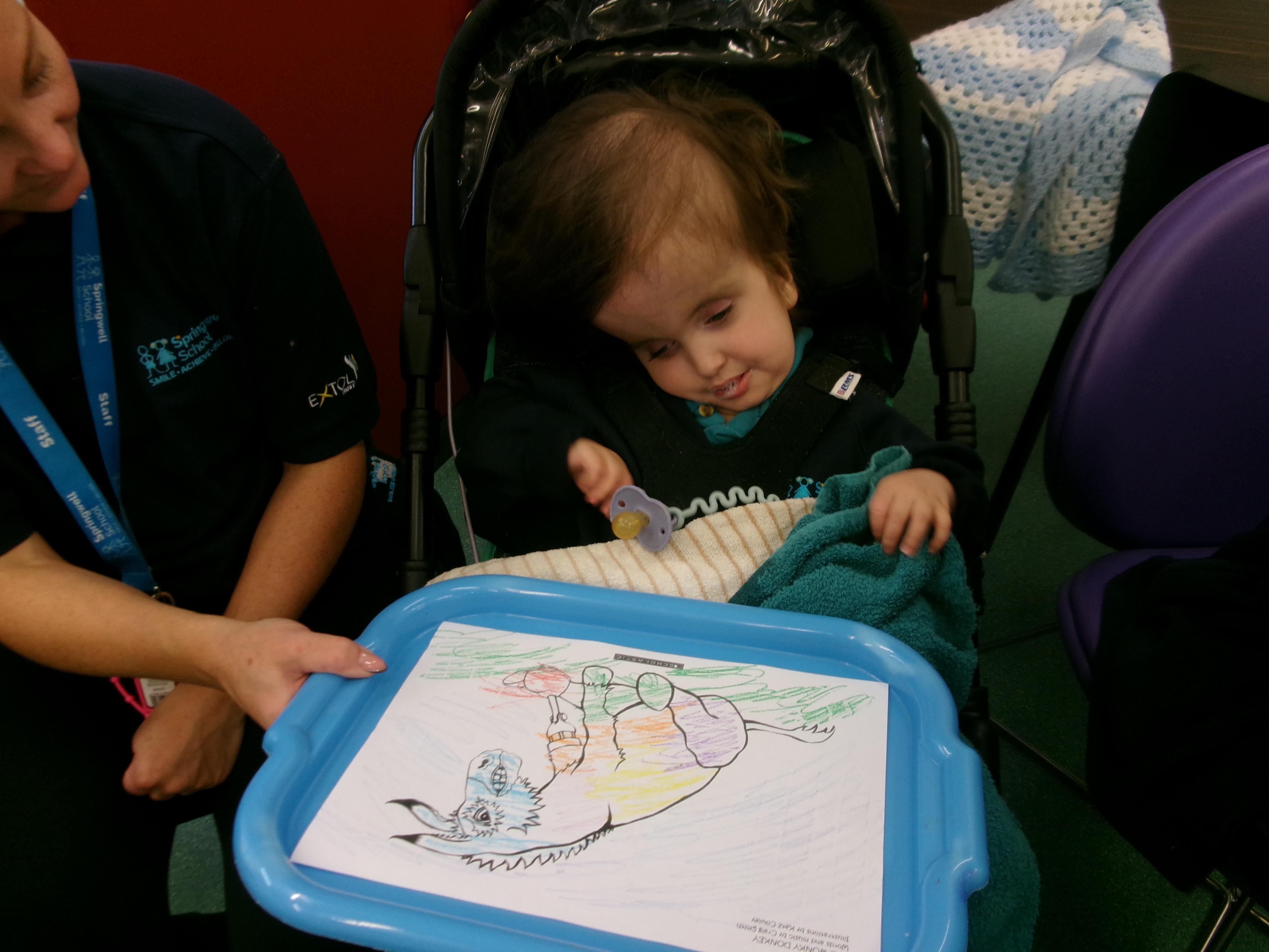 Throughout each week we spend time in our standing frames, completing a range of fun activities linked to our targets. We love making marks on the interactive whiteboard and exploring sensory toys, making choices to indicate our preferred items.