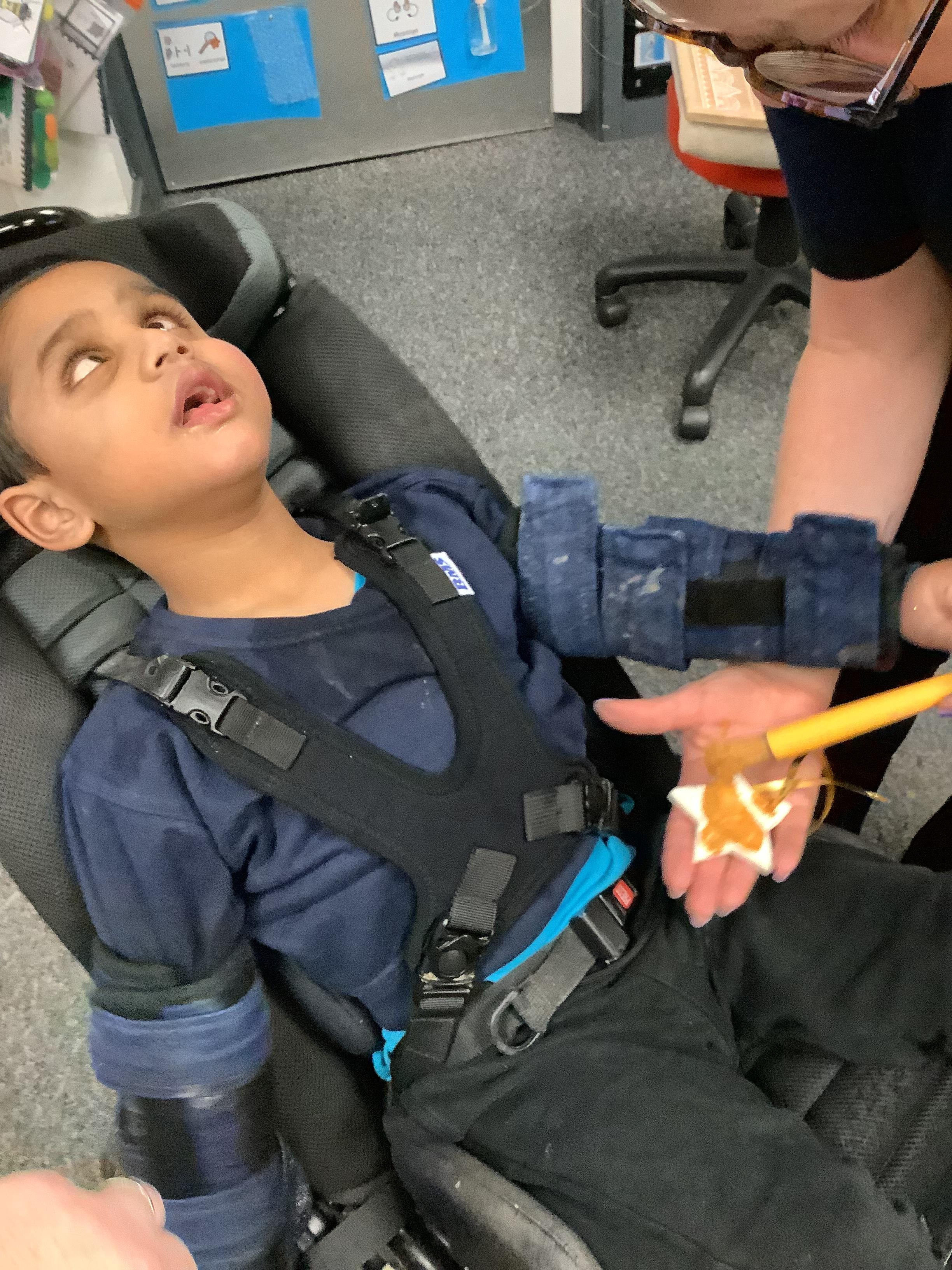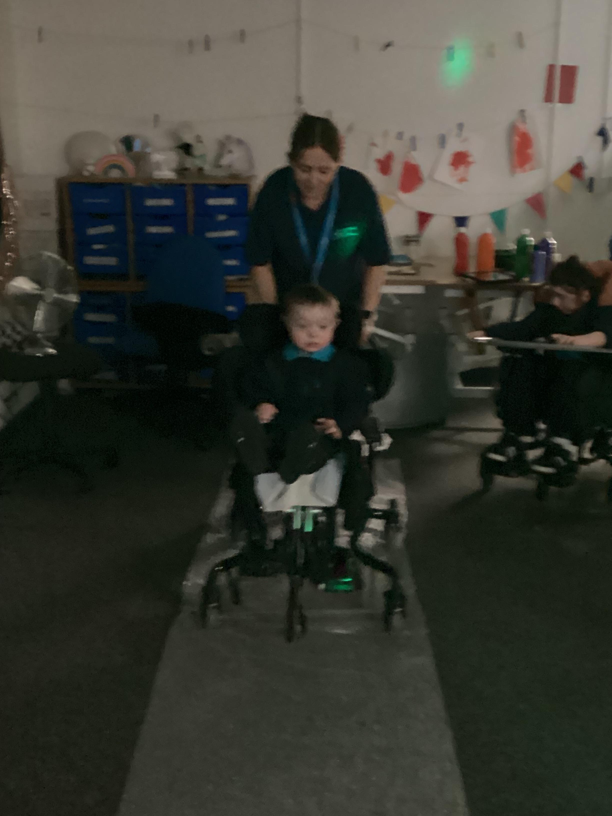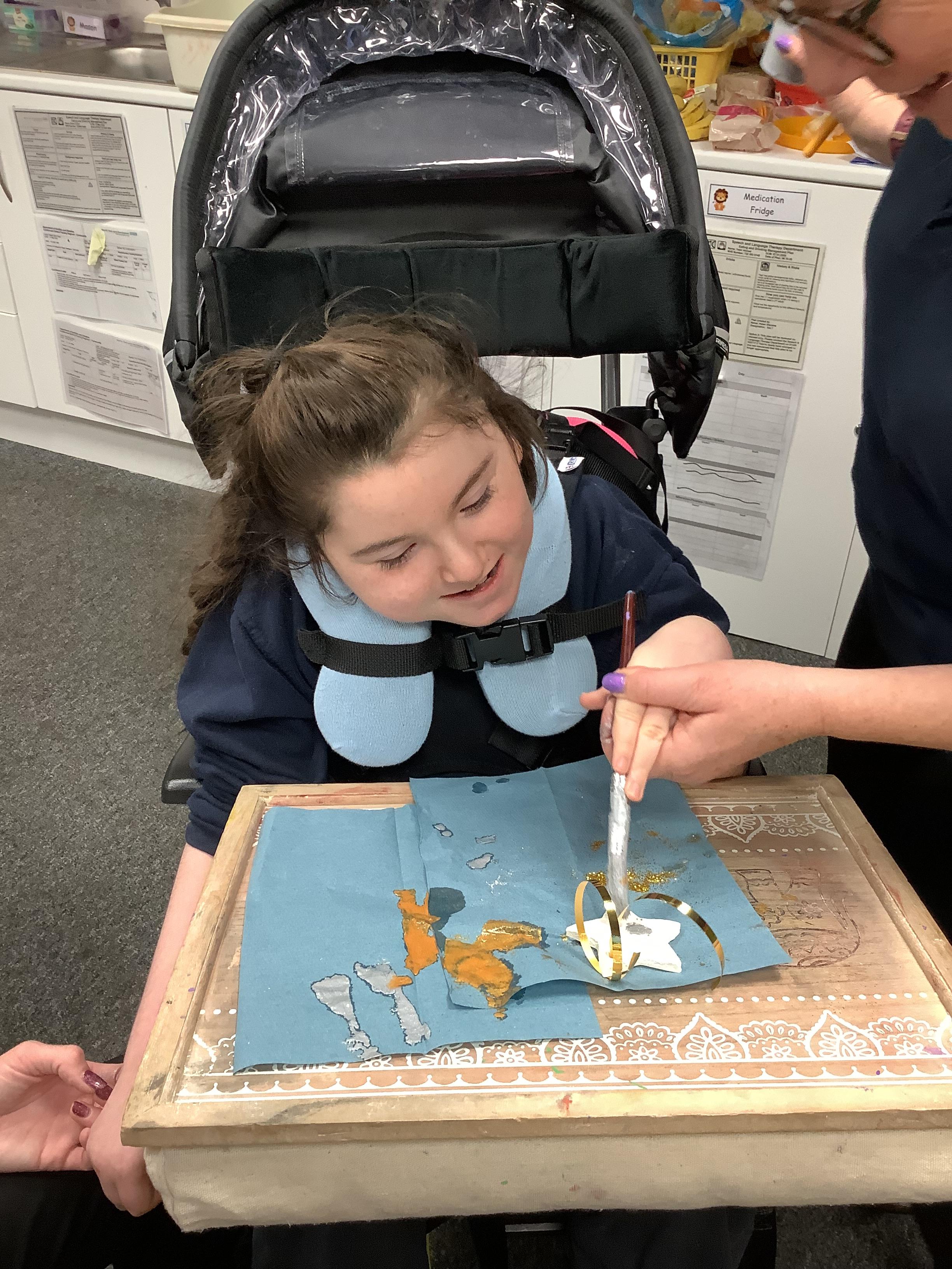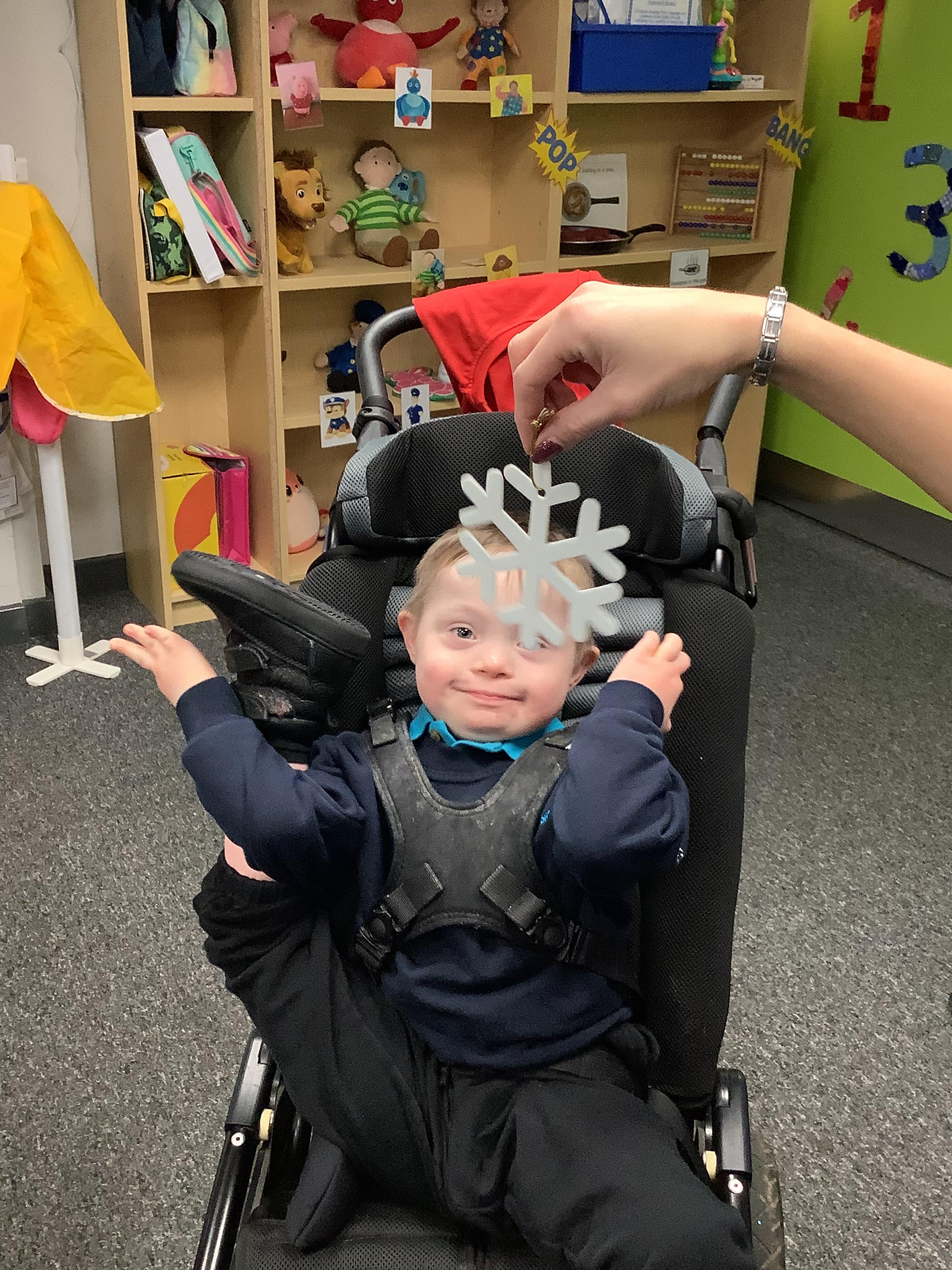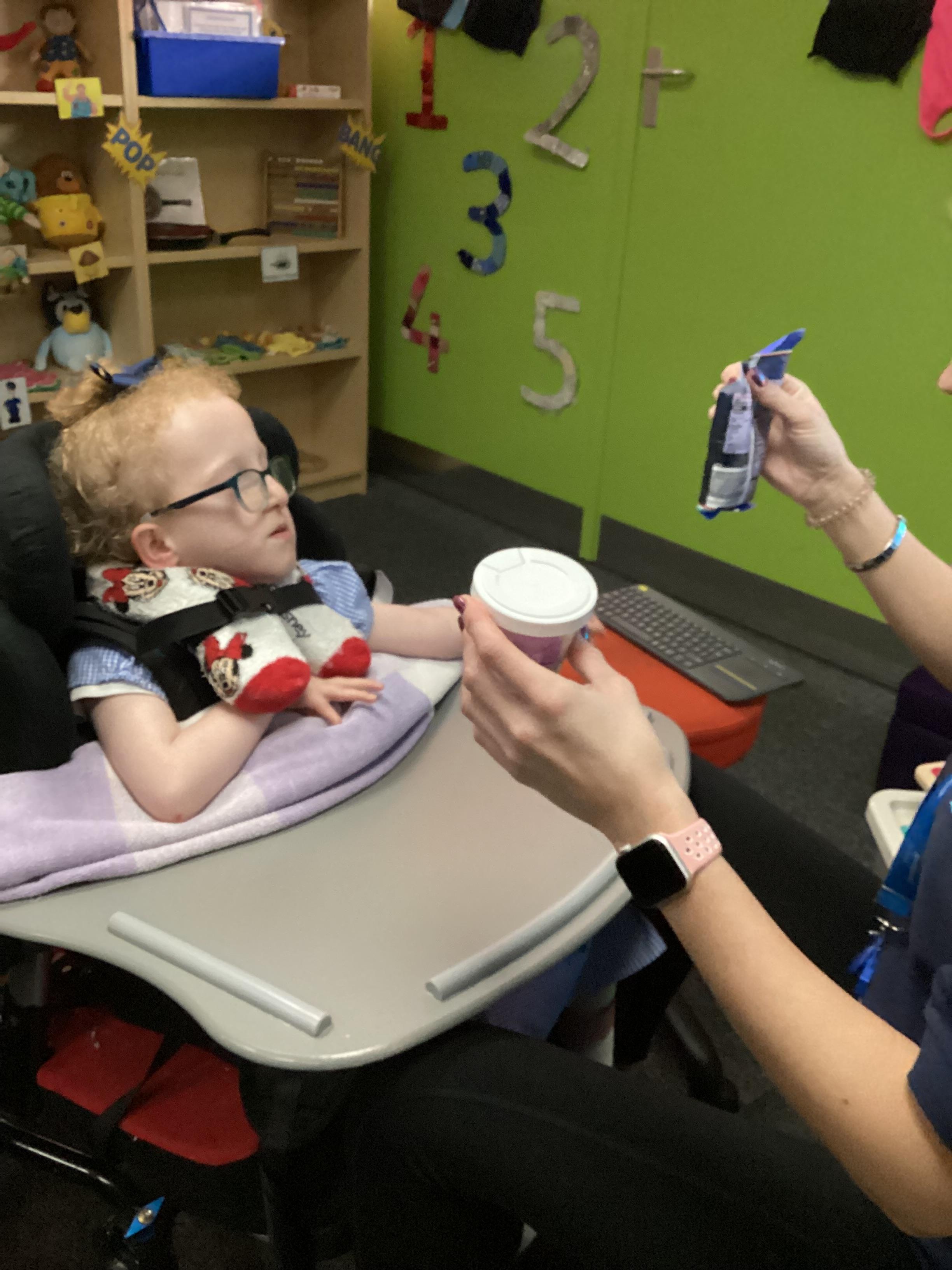 Throughout each week we spend time in our standing frames, completing a range of fun activities linked to our targets. We love making marks on the interactive whiteboard and exploring sensory toys, making choices to indicate our preferred items.
