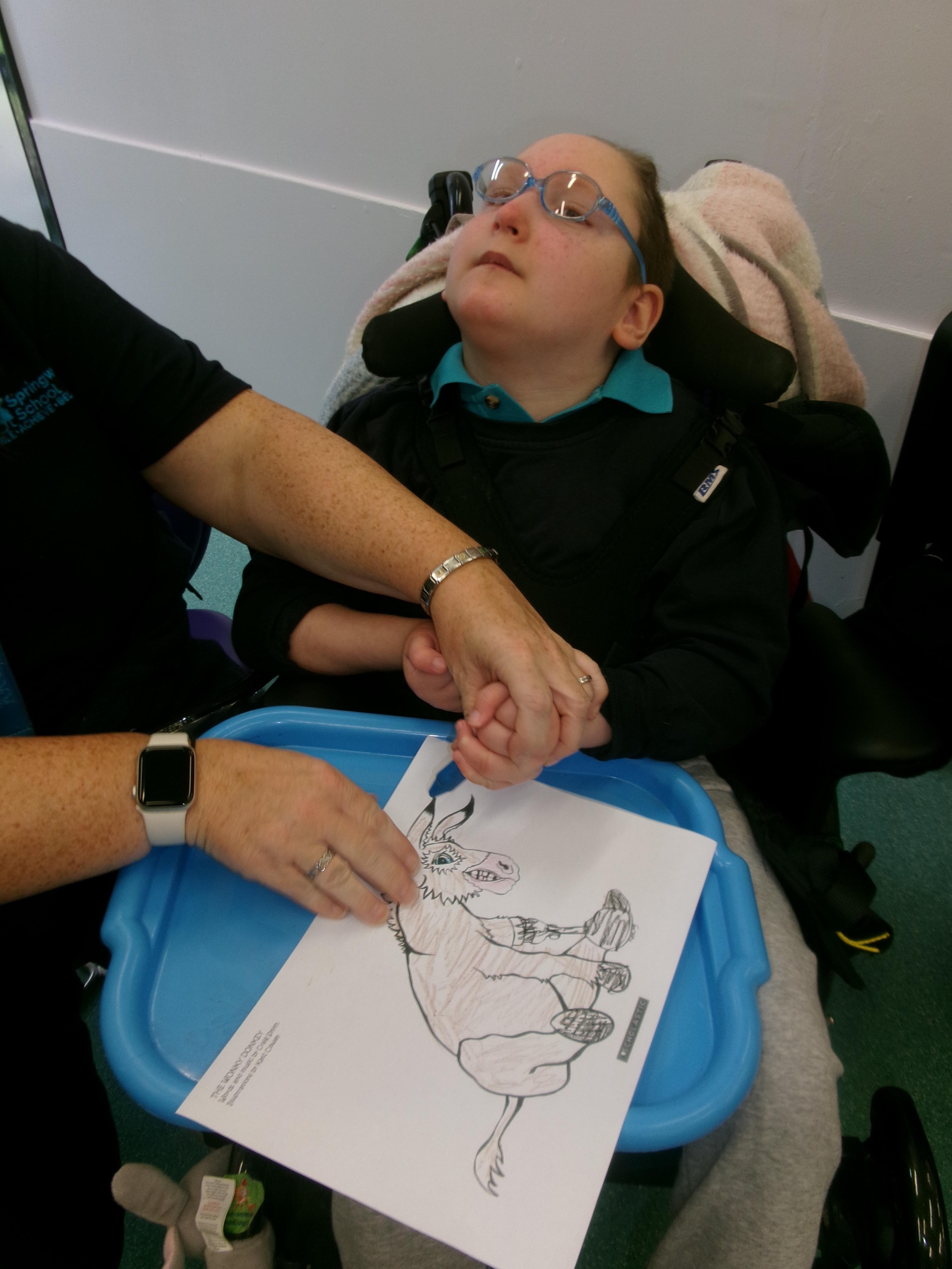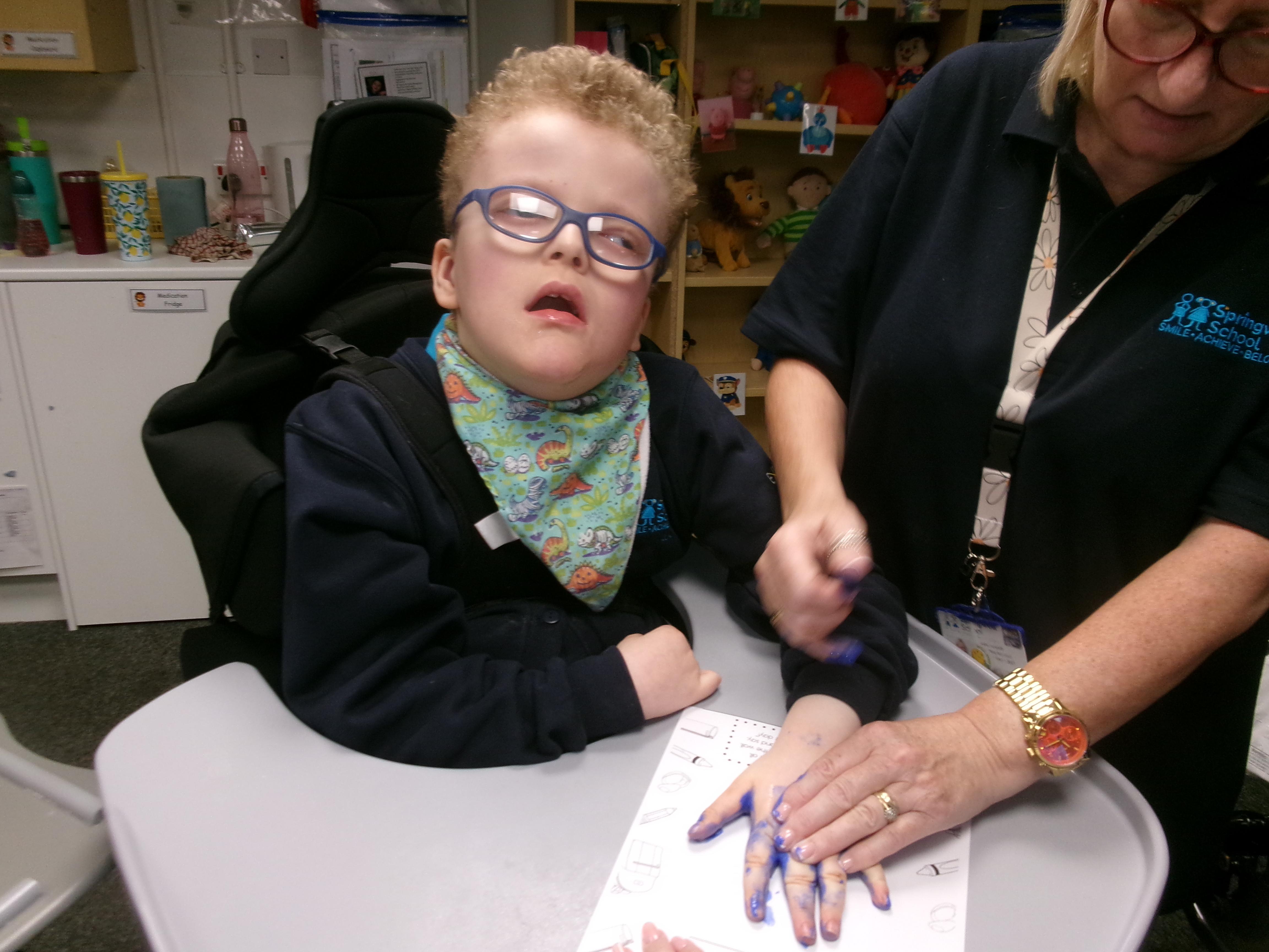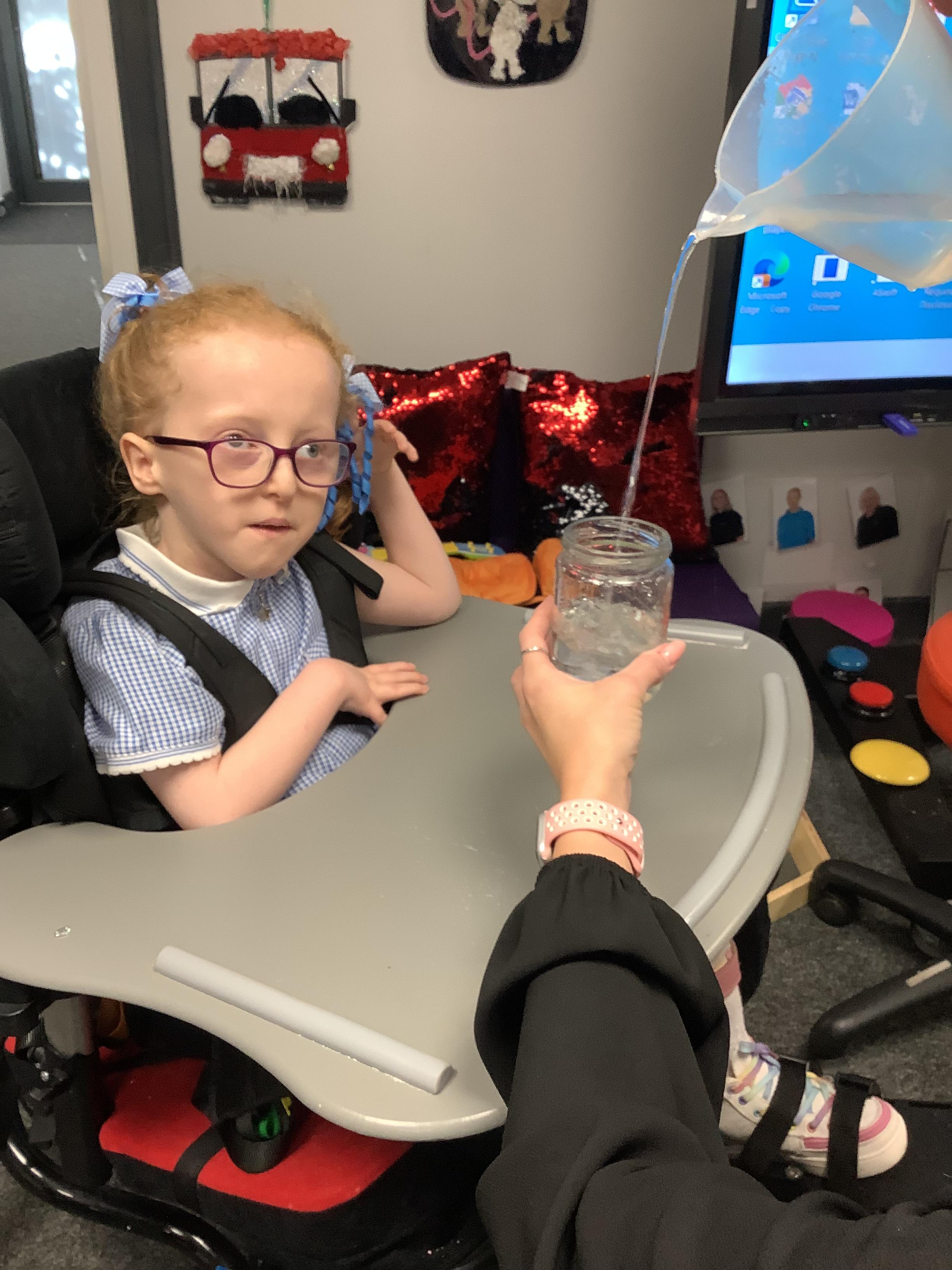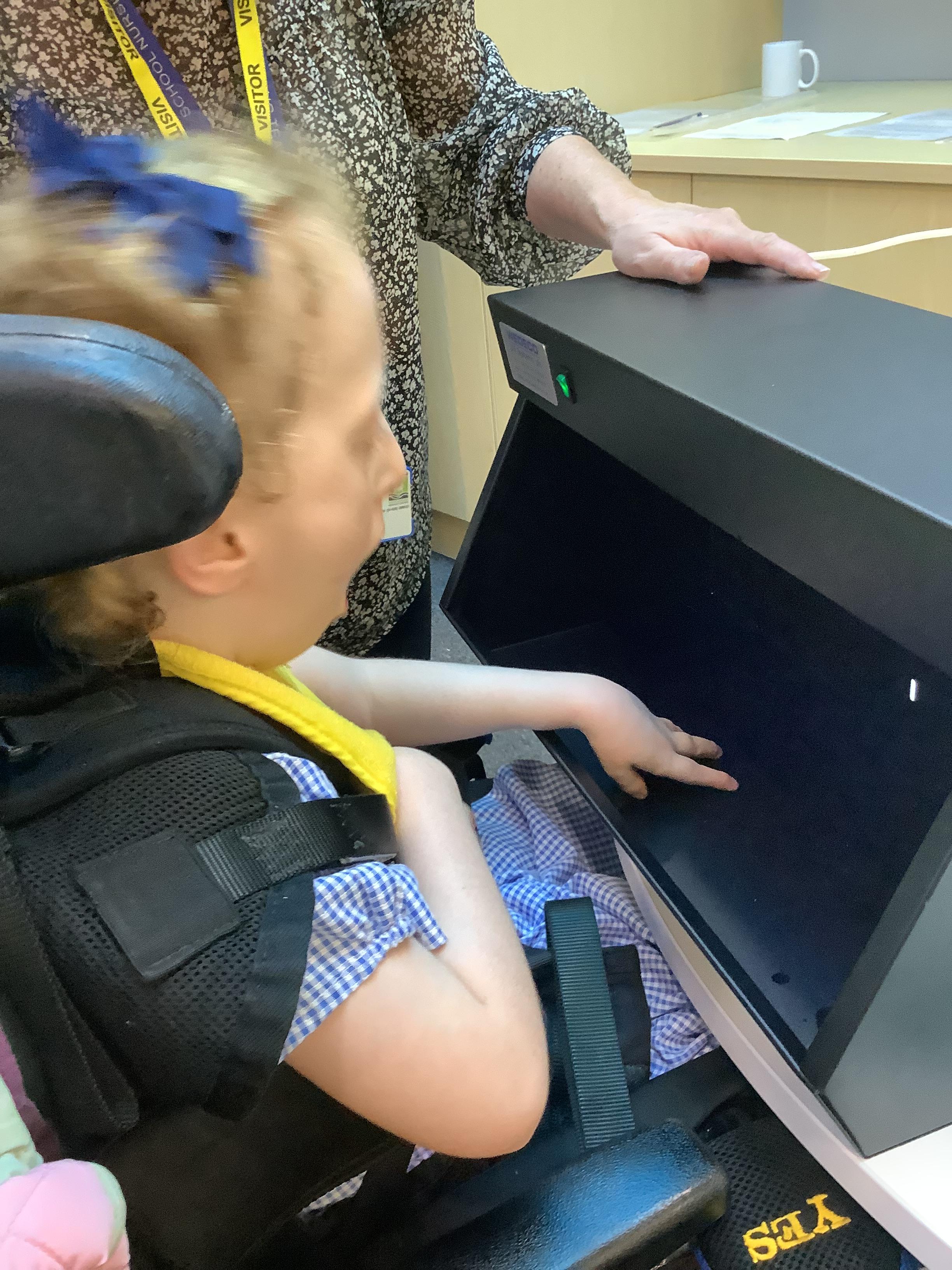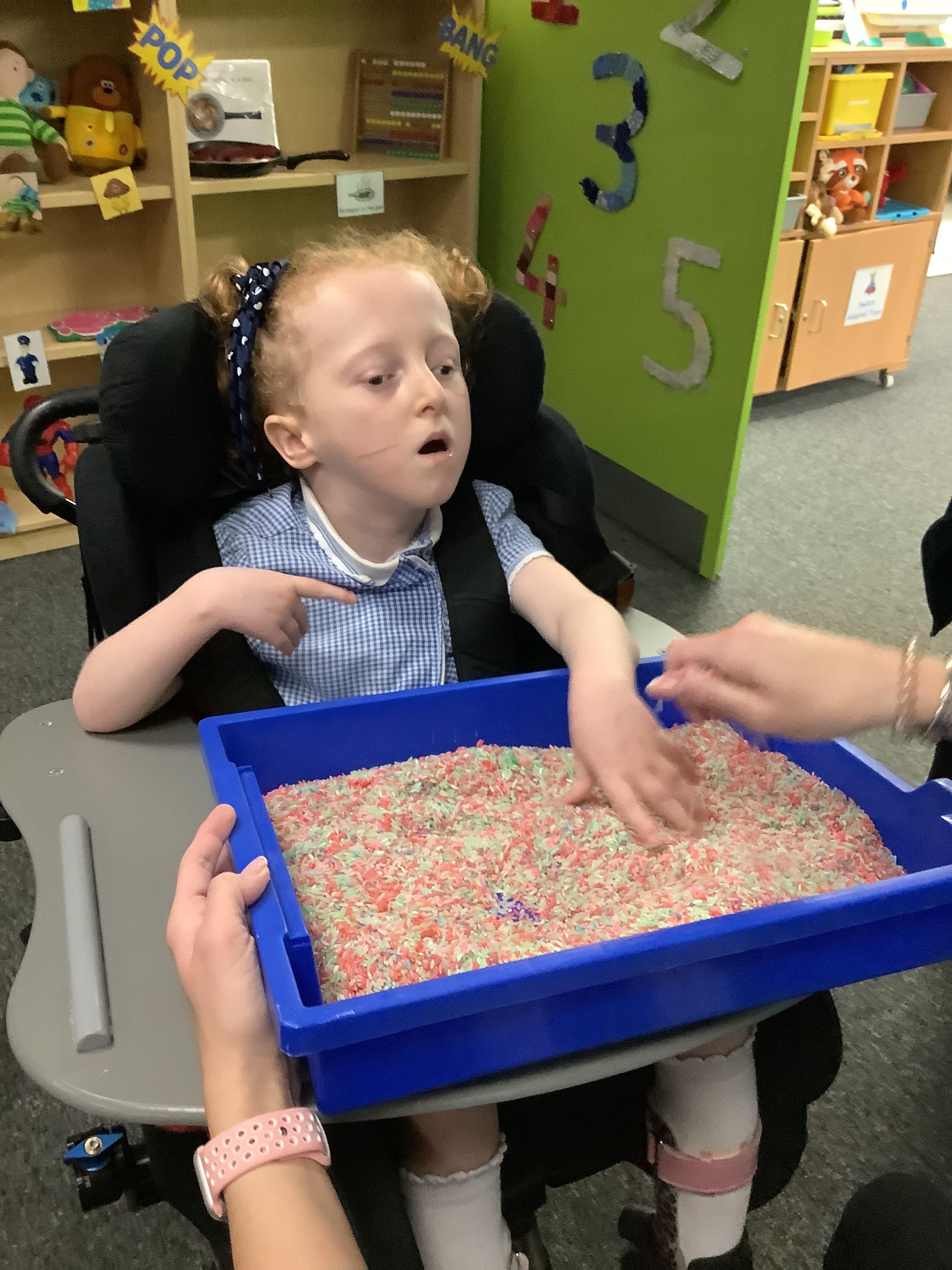 Throughout each week we spend time in our standing frames, completing a range of fun activities linked to our targets. We love making marks on the interactive whiteboard and exploring sensory toys, making choices to indicate our preferred items.