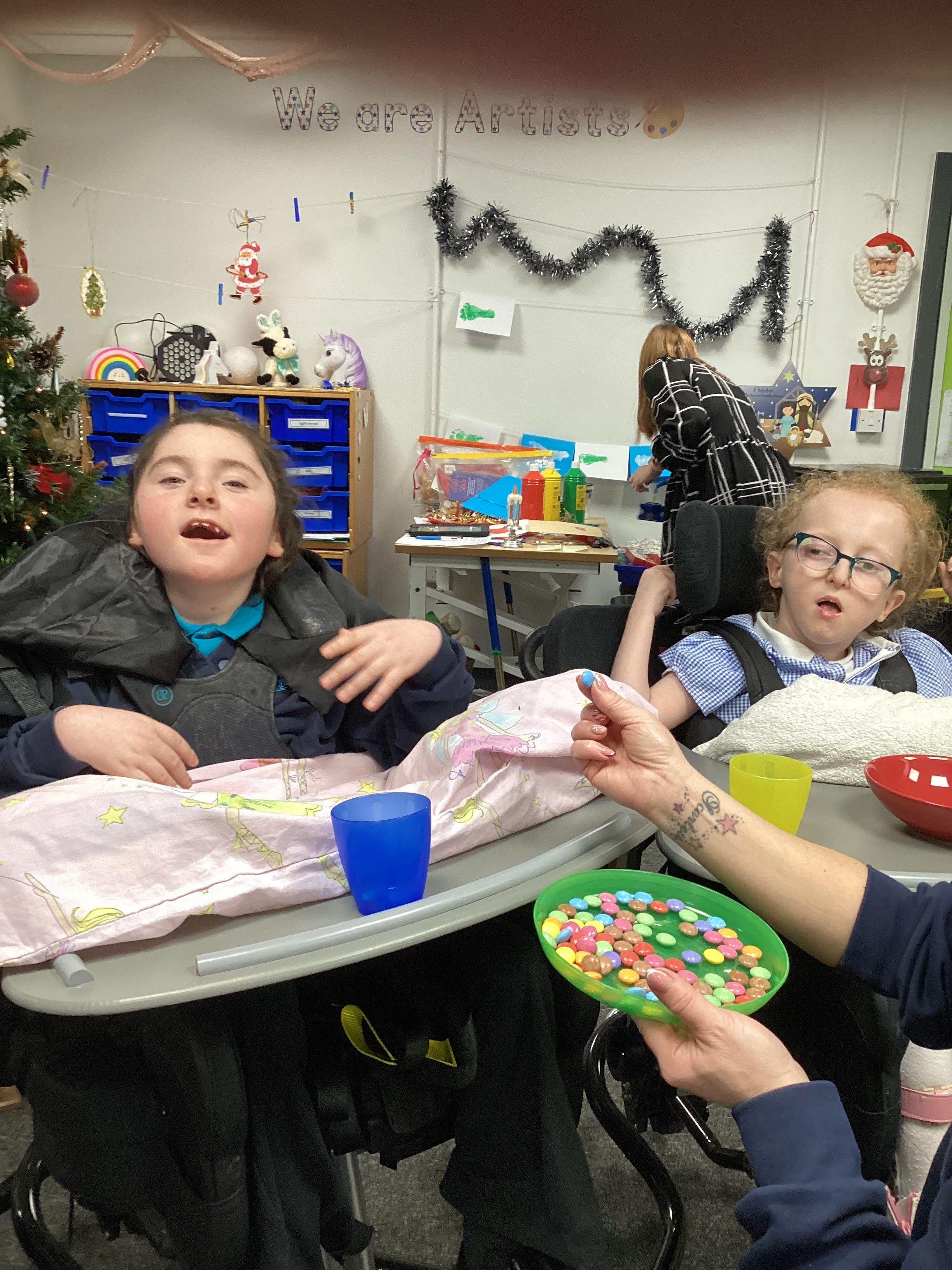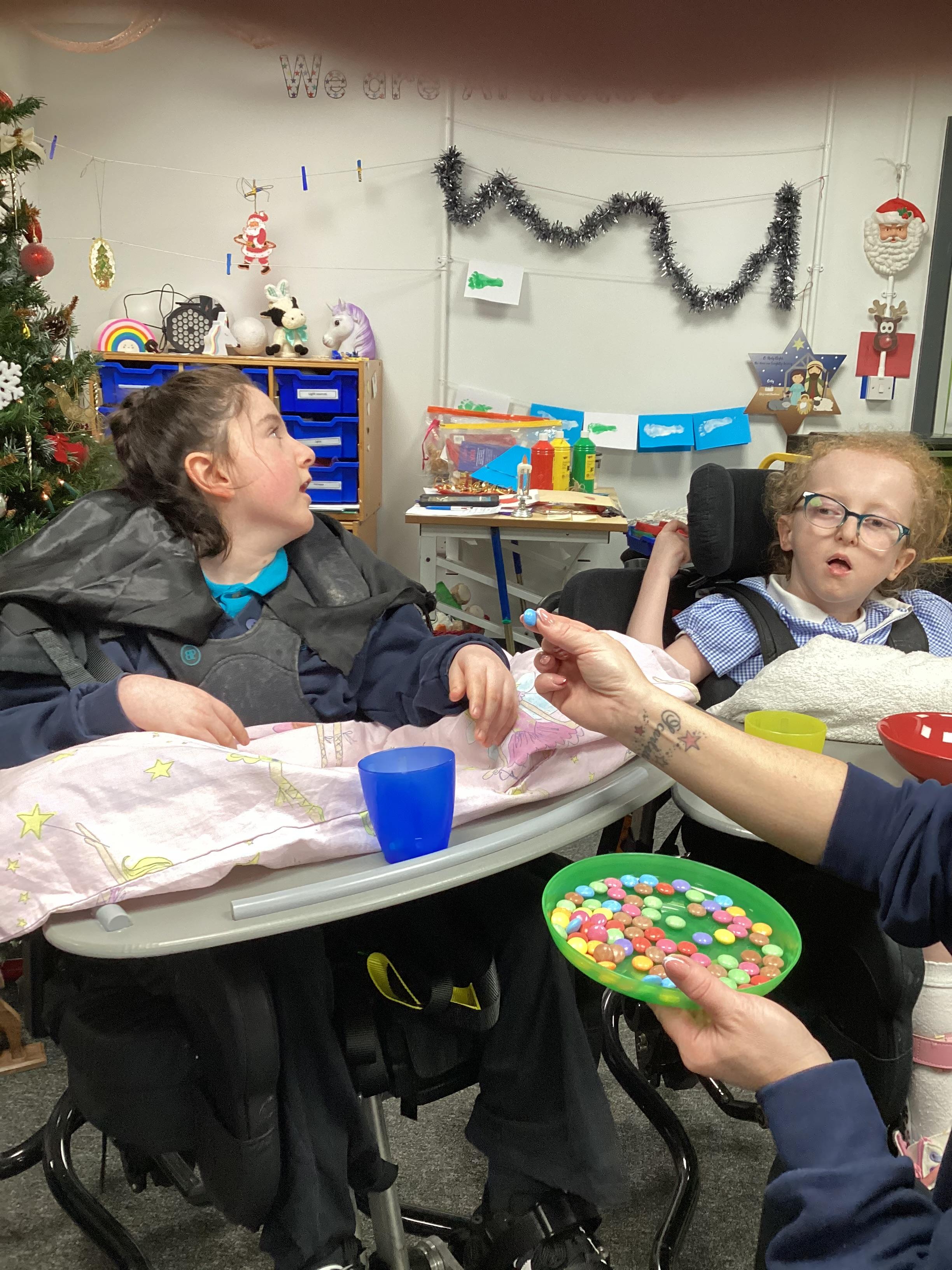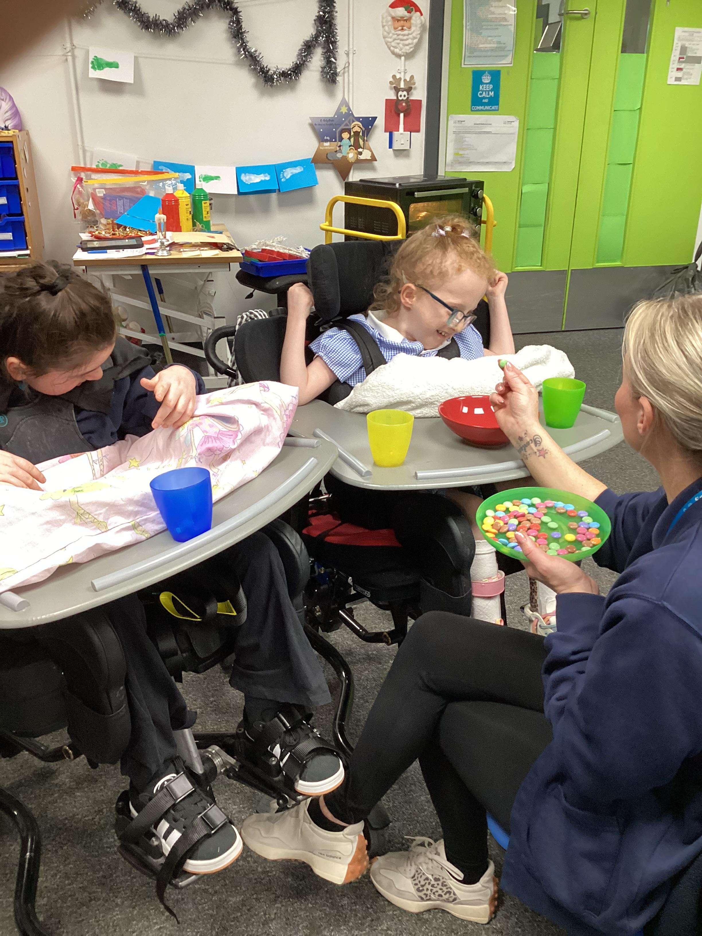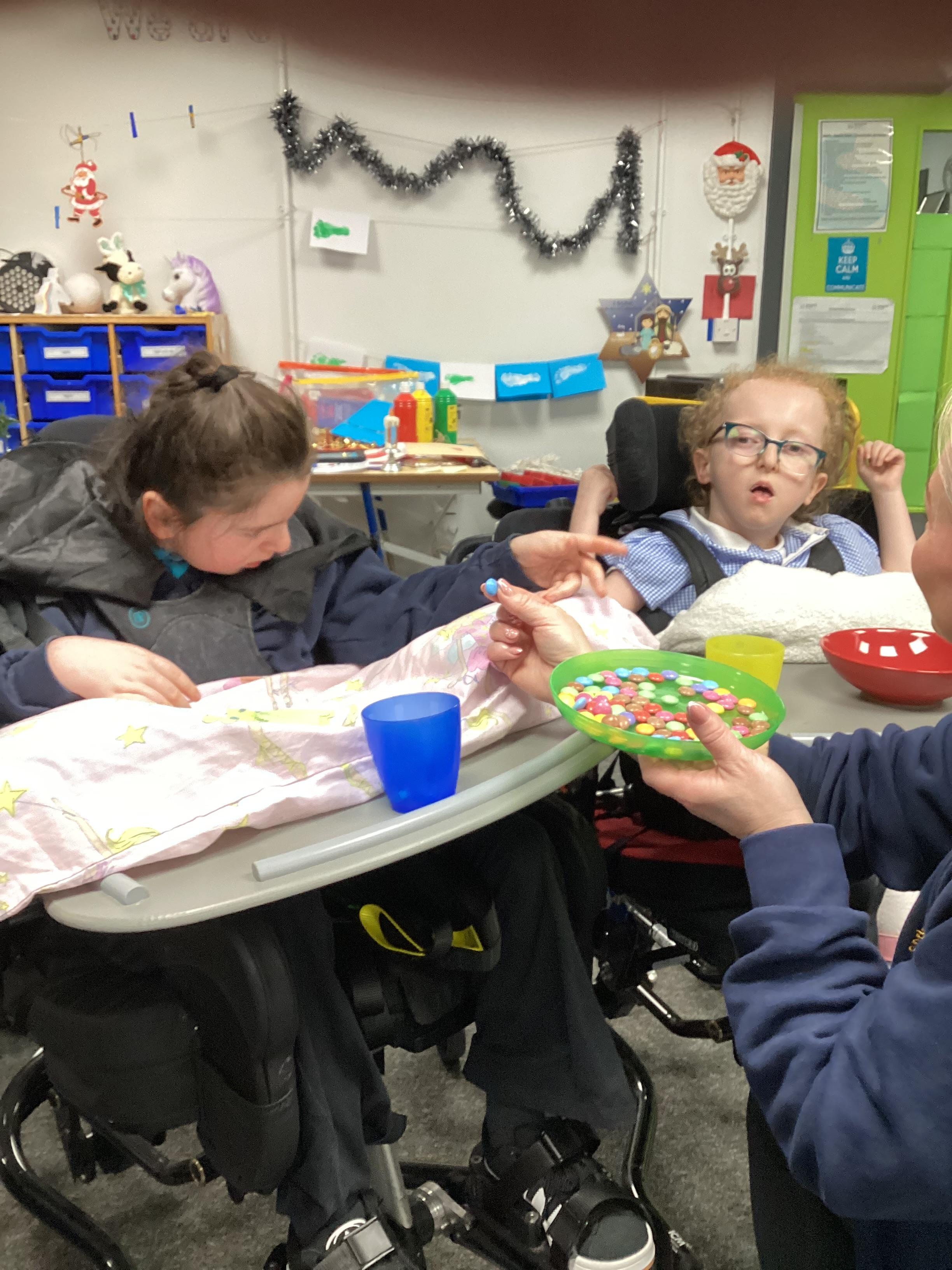We made chocolate brownie reindeer today in sensory cookery. We did lots of work on colour and some of us helped to match the smarties to the correct coloured cup.