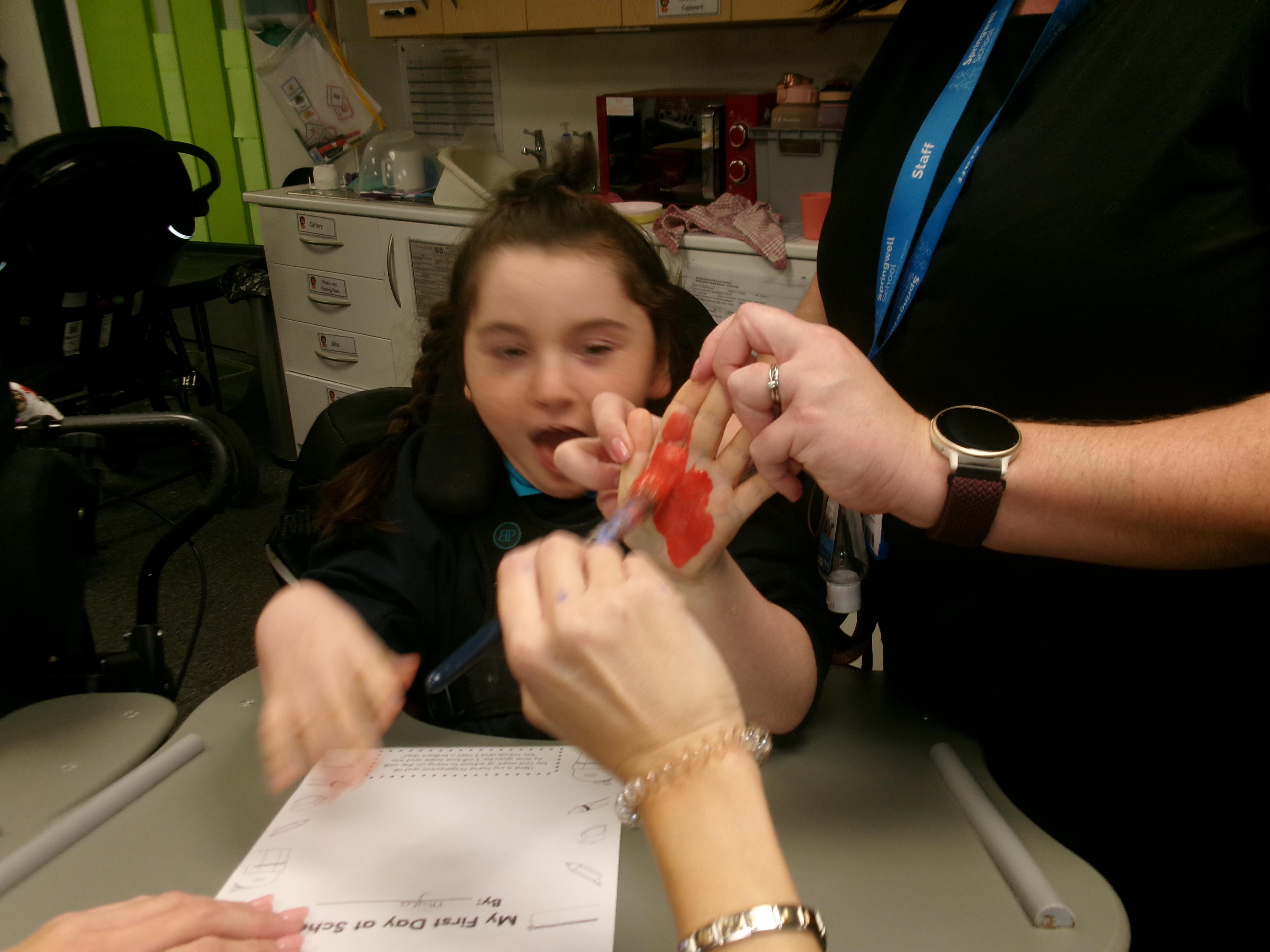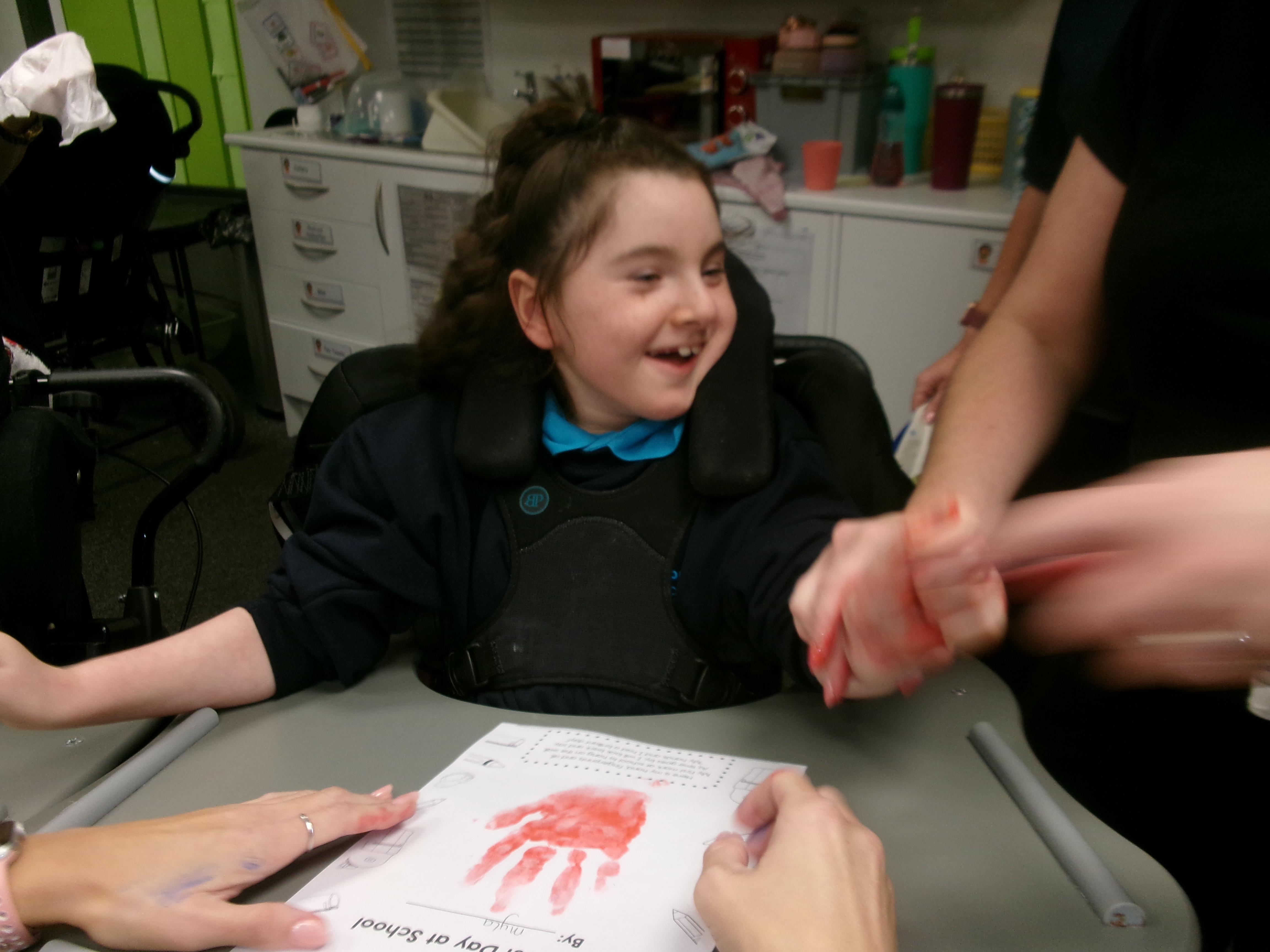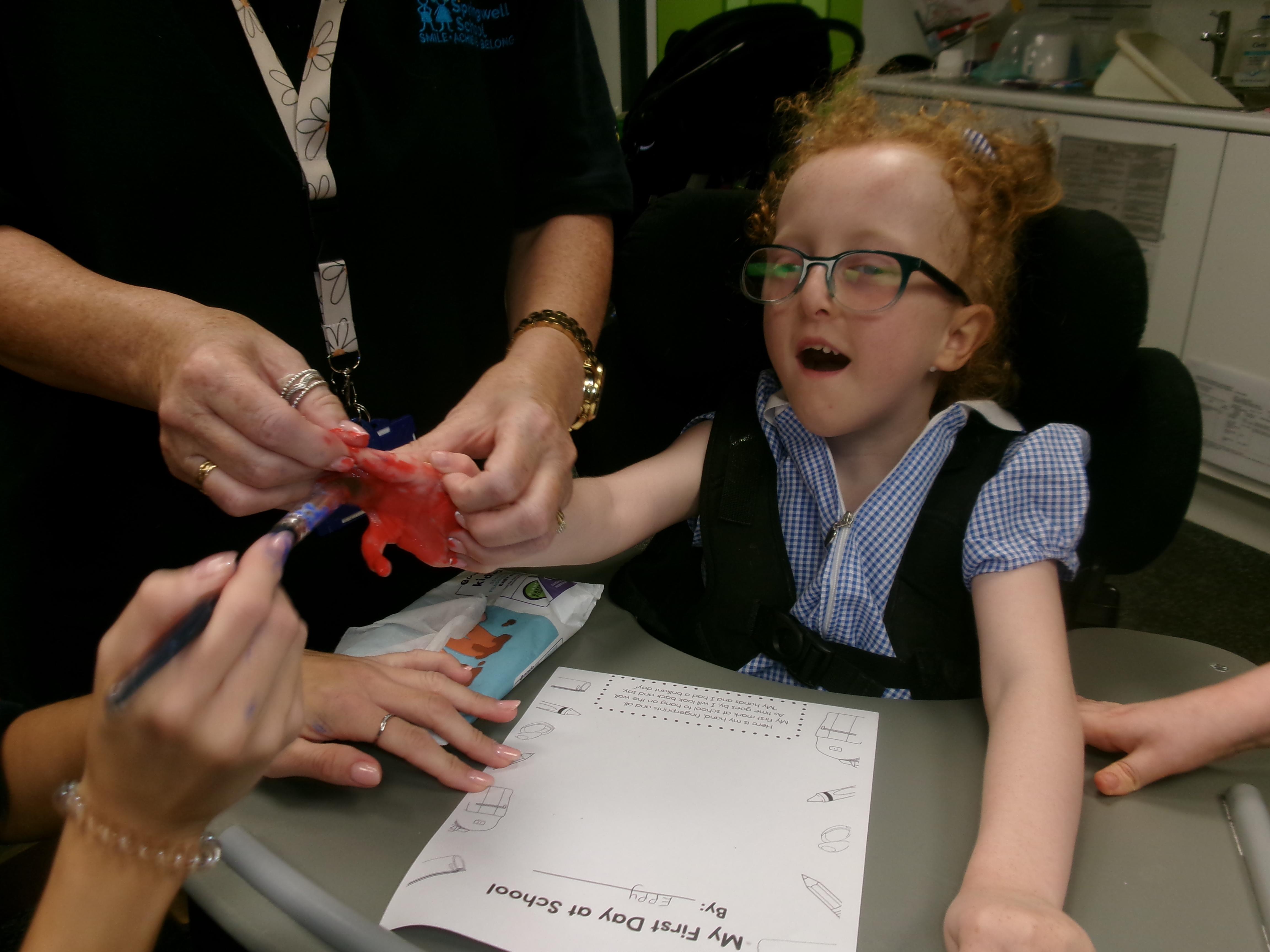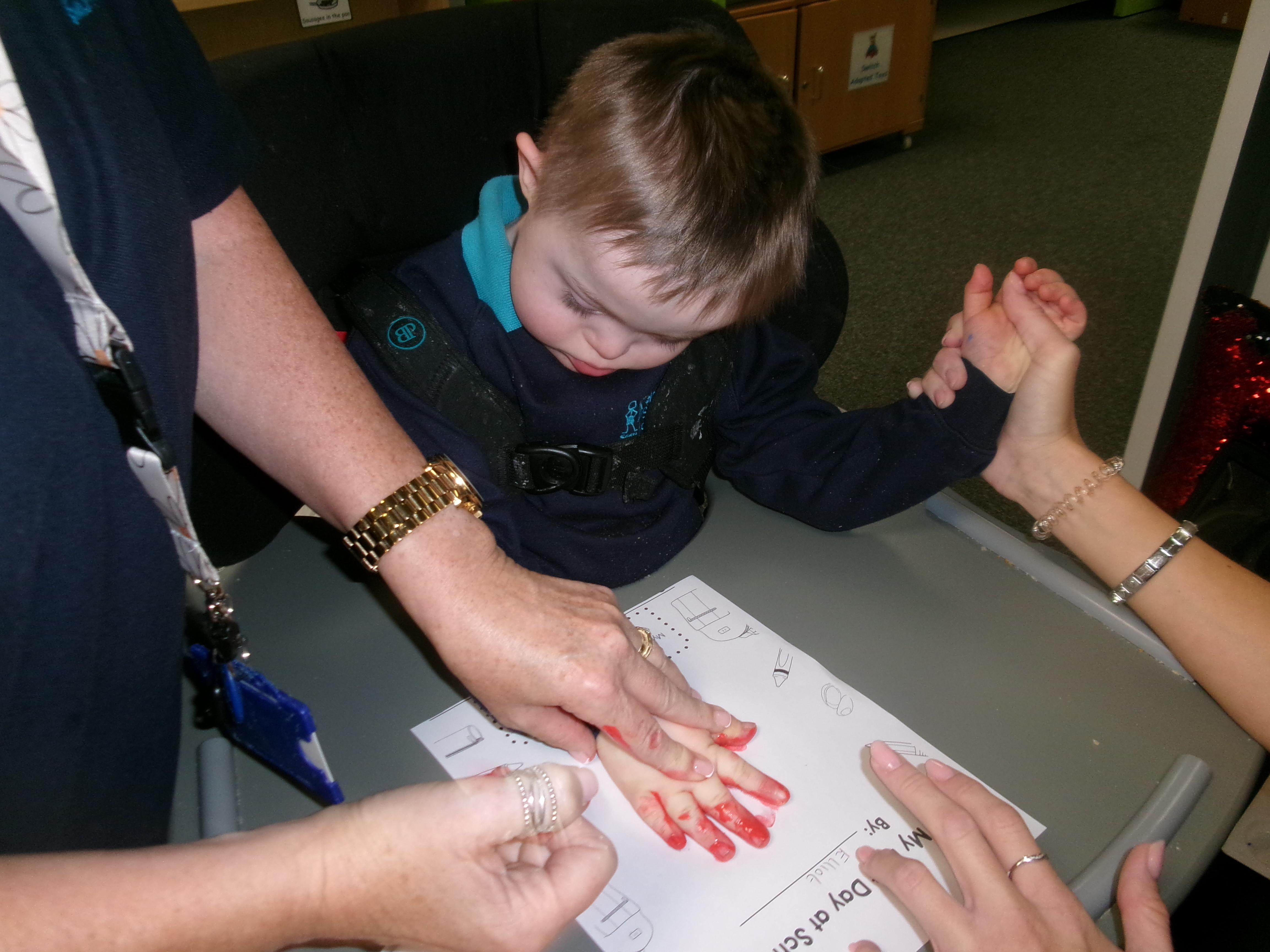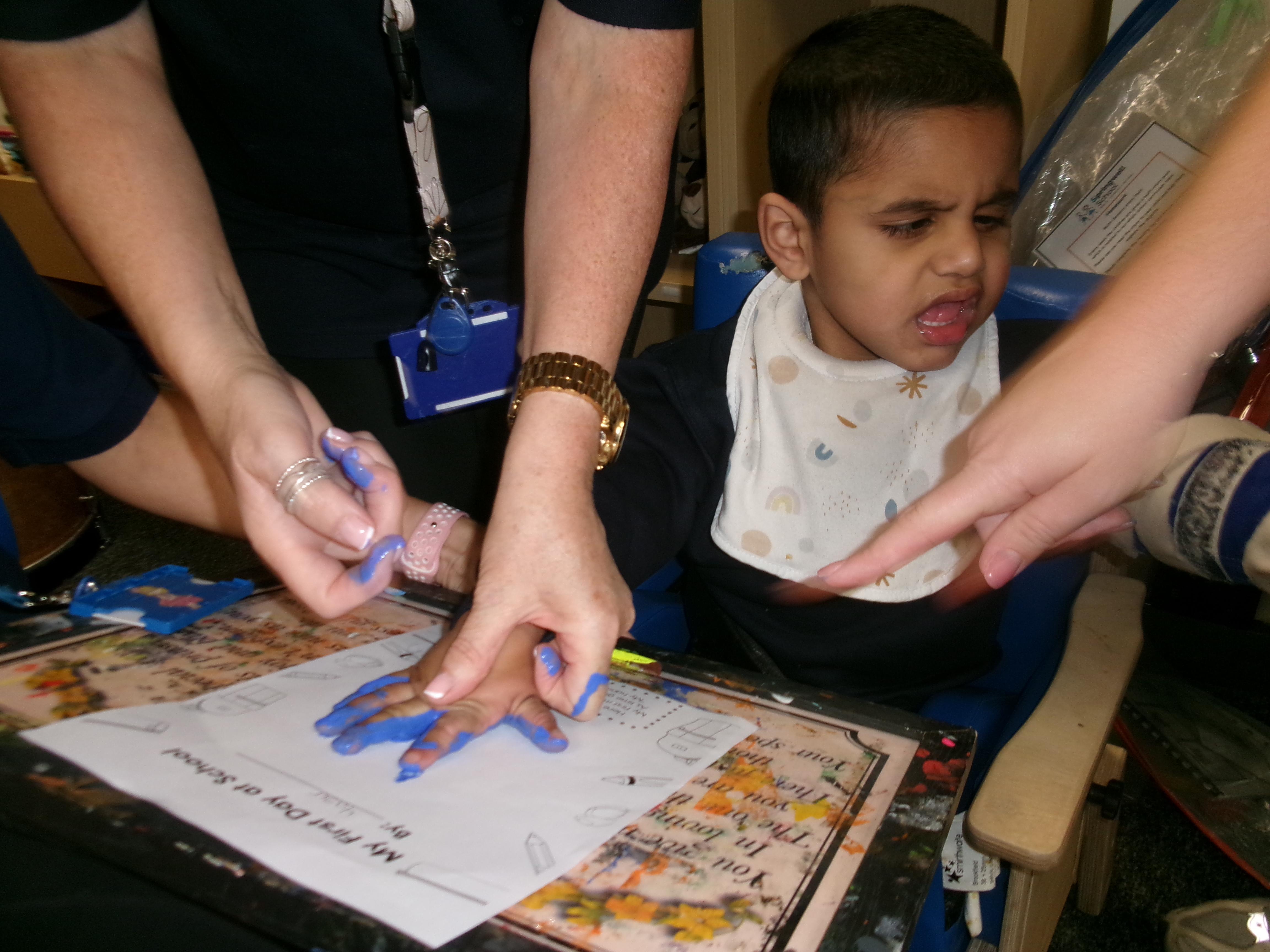We created our very own hand print art work to mark our first day of a new year; some of us beginning yet another year at Springwell with others just beginning their school journey. We loved the feel of the paint as it was brushed on to our fingers and hands.