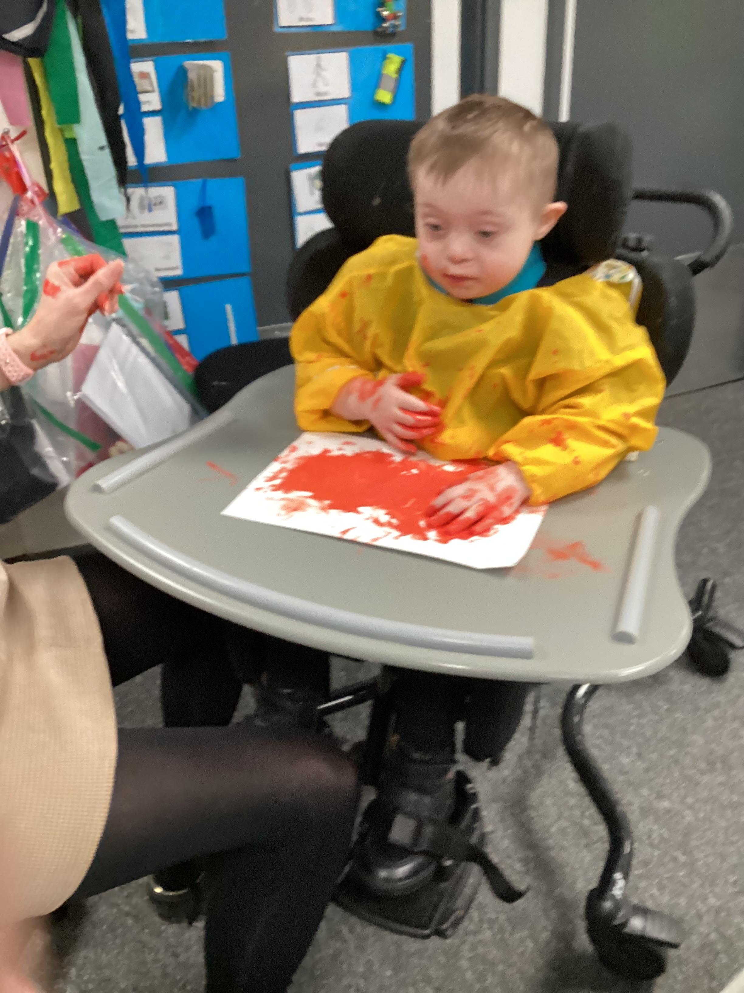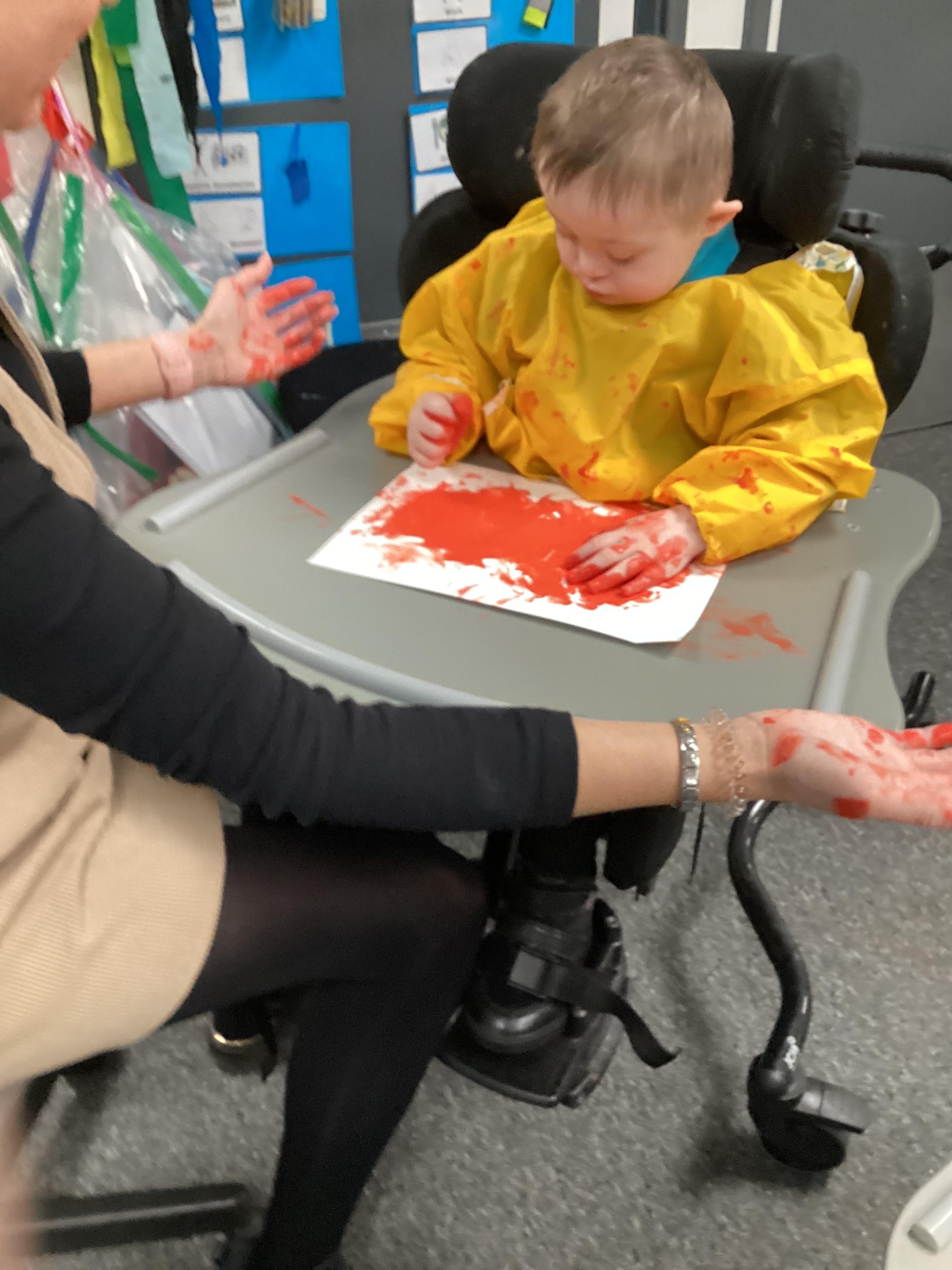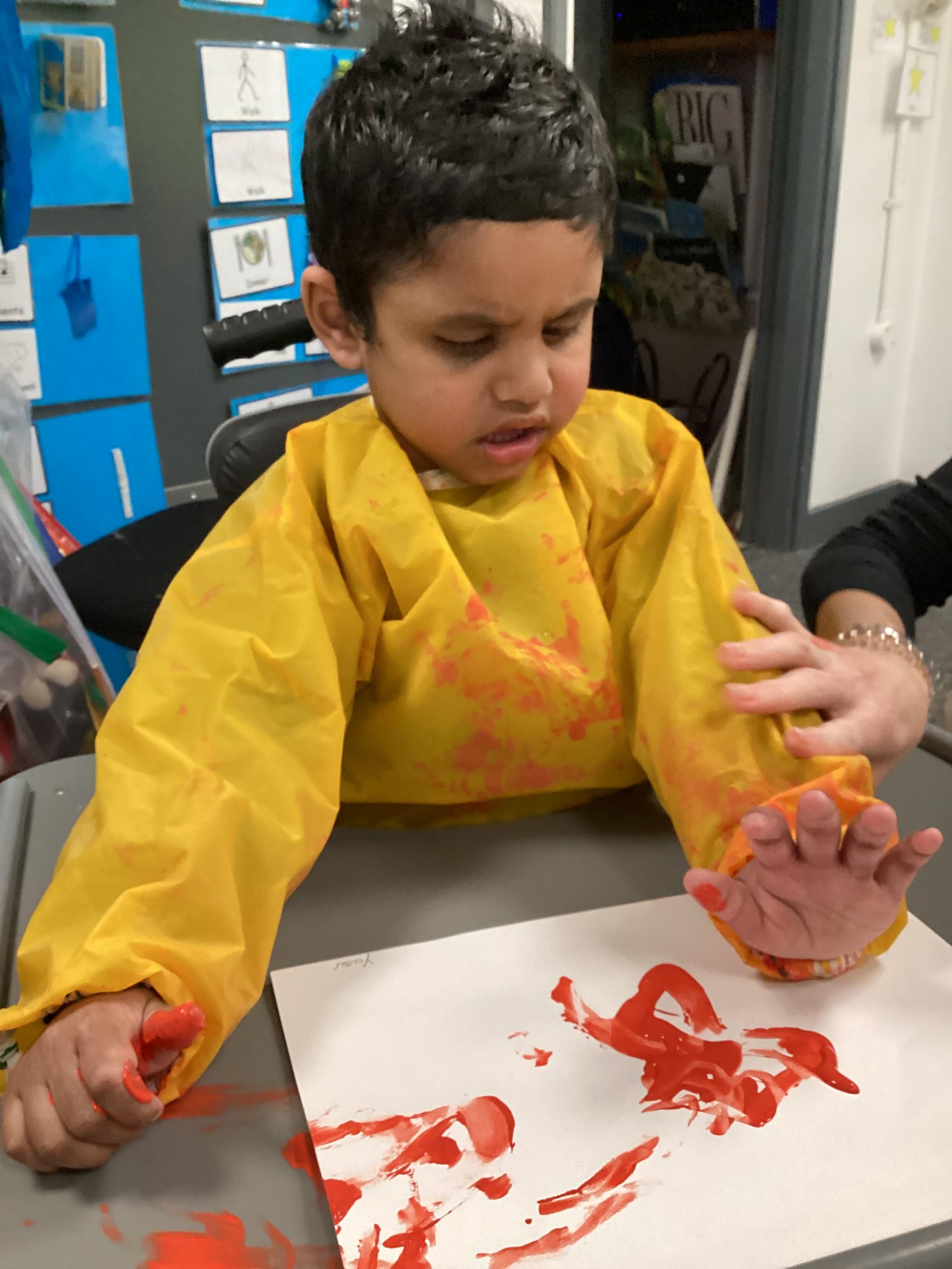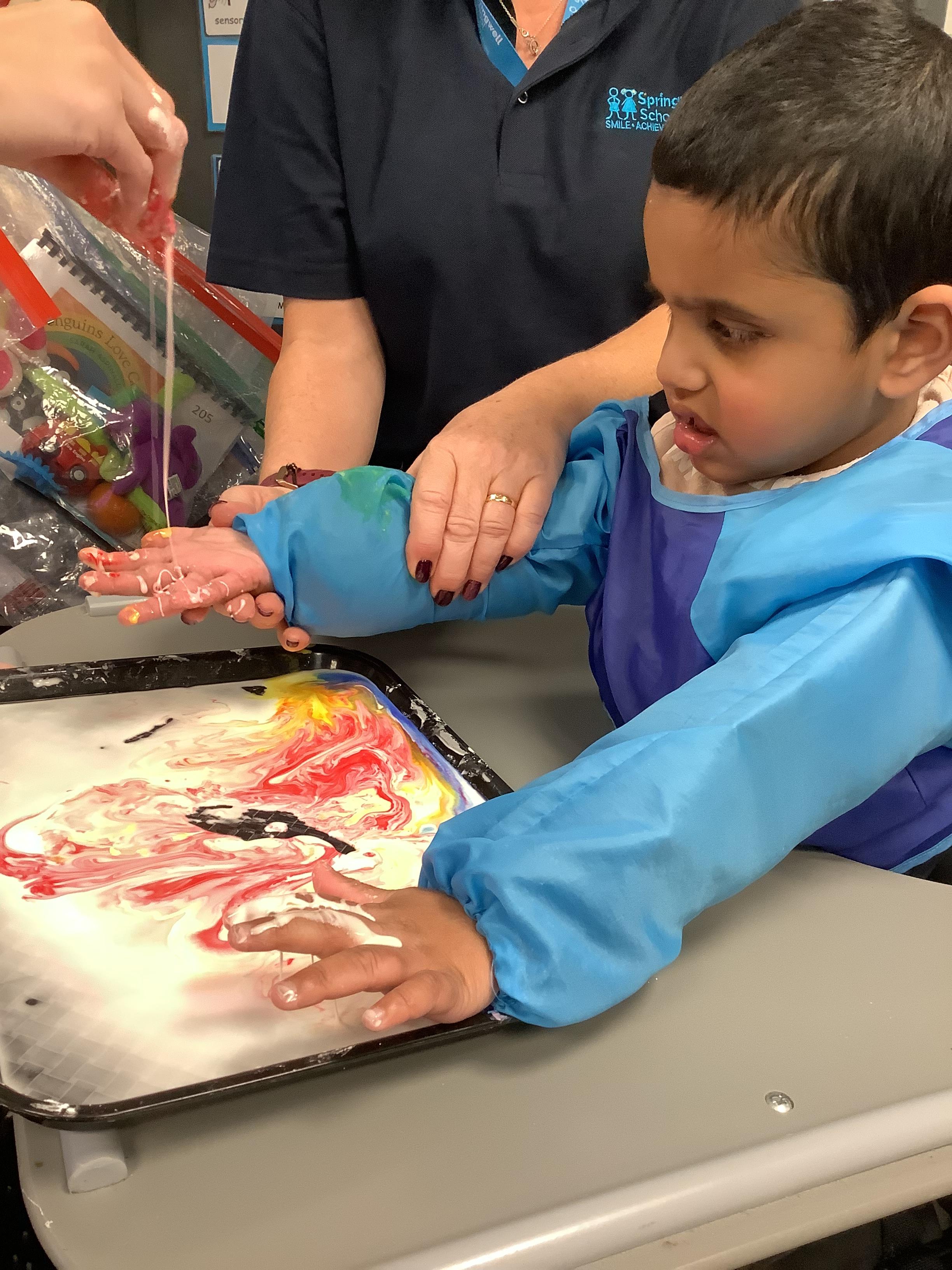 We created our very own hand print art work to mark our first day of a new year; some of us beginning yet another year at Springwell with others just beginning their school journey. We loved the feel of the paint as it was brushed on to our fingers and hands.