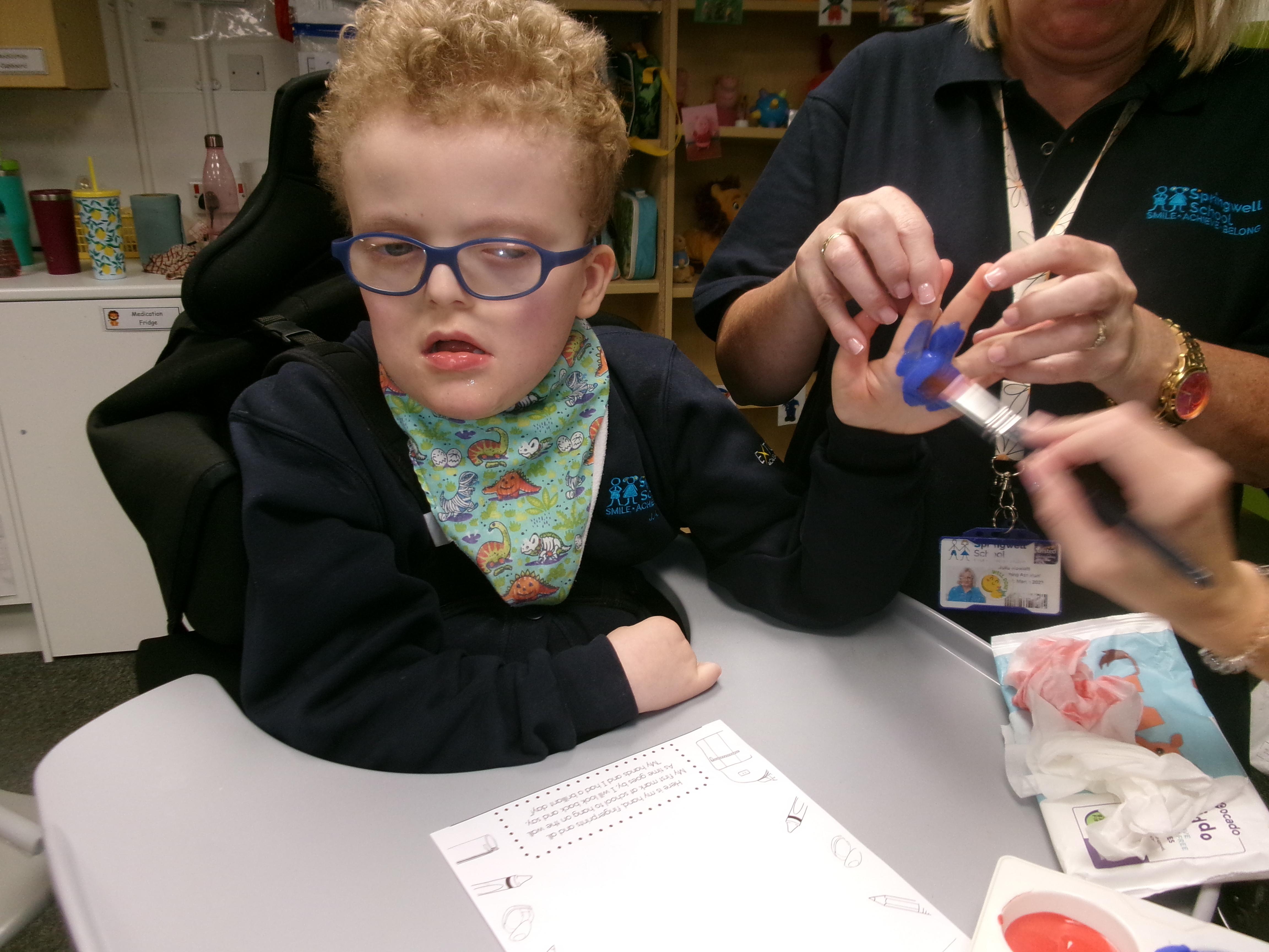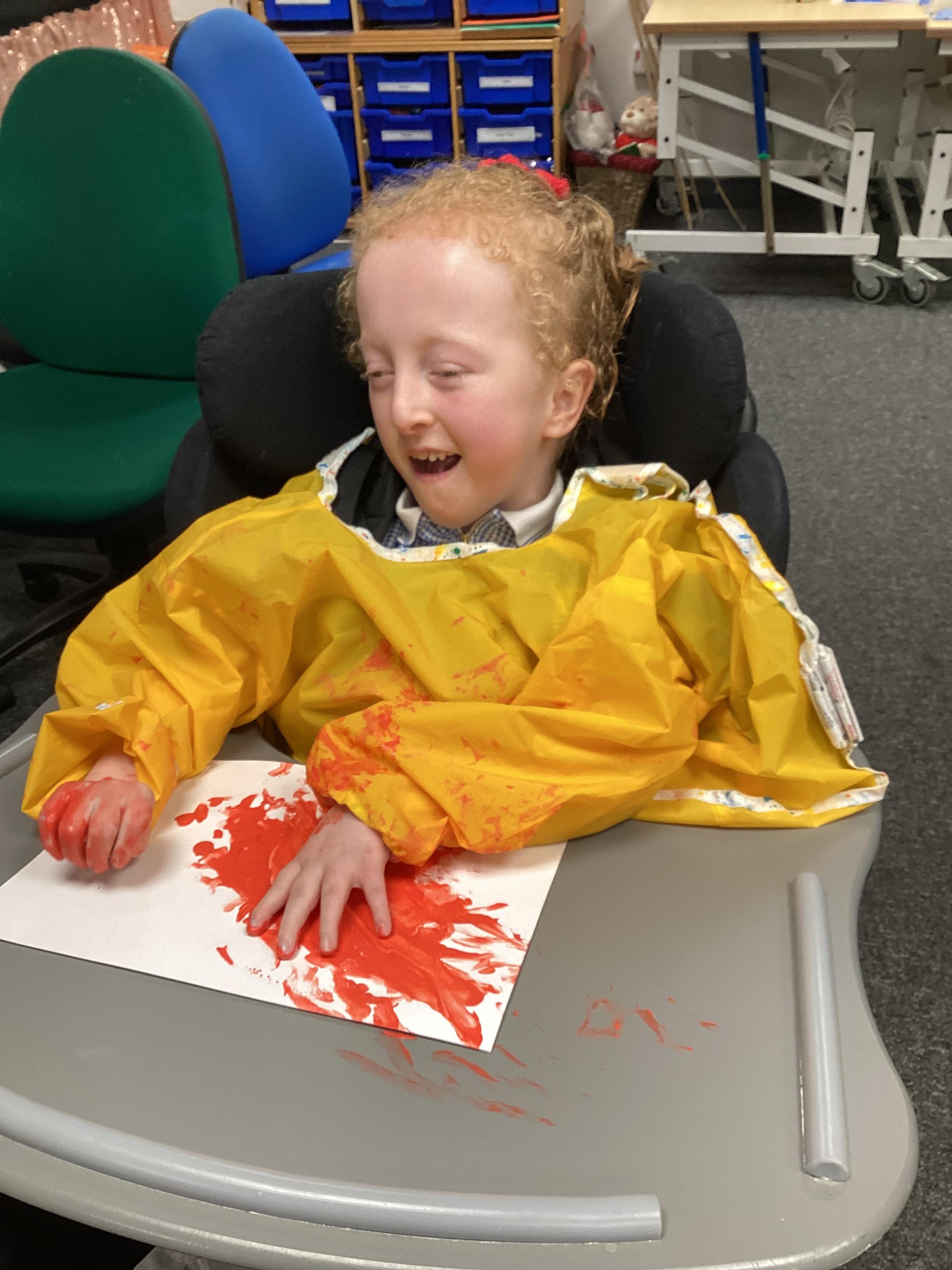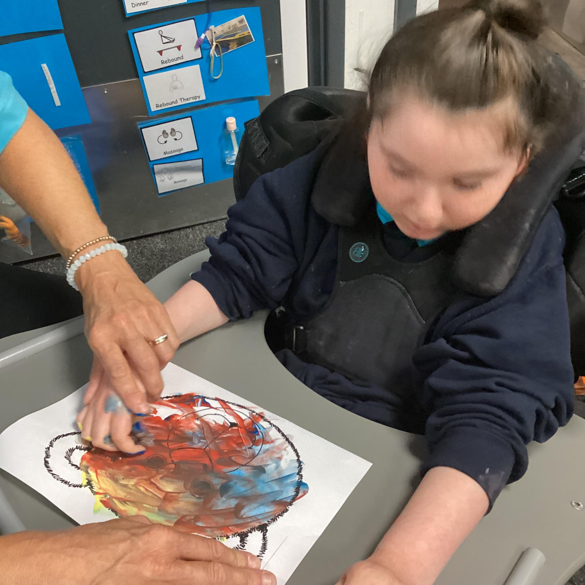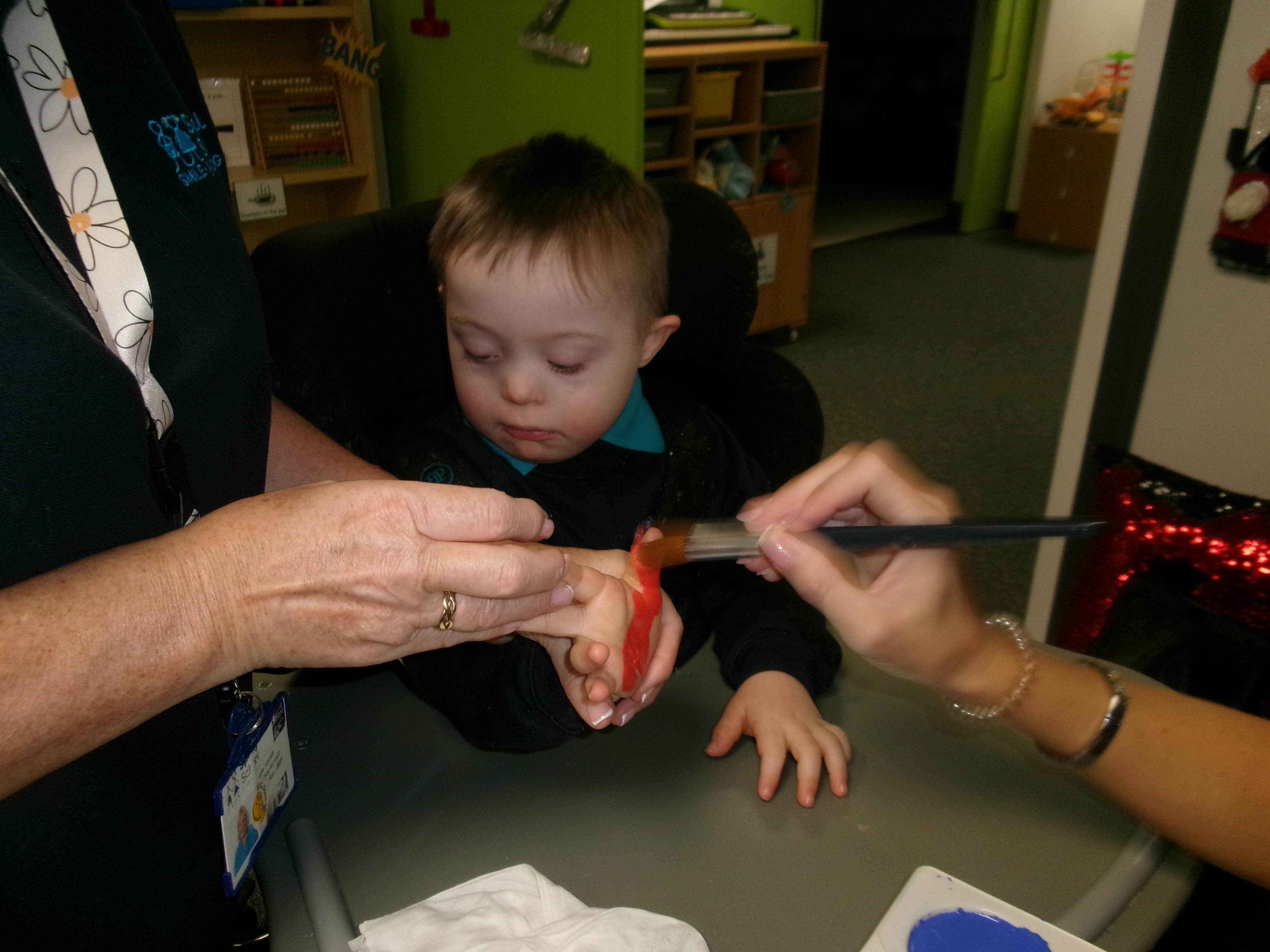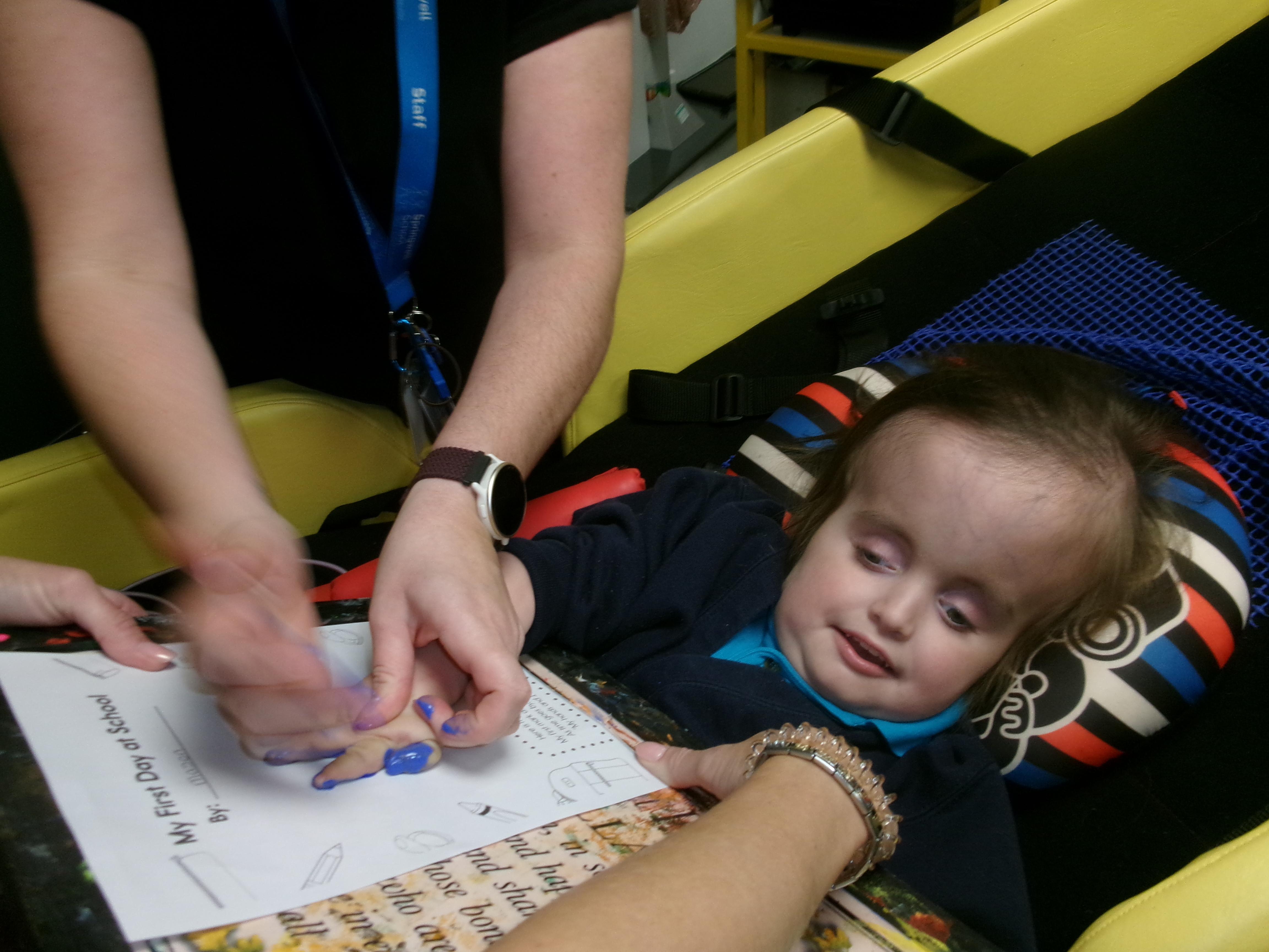 We created our very own hand print art work to mark our first day of a new year; some of us beginning yet another year at Springwell with others just beginning their school journey. We loved the feel of the paint as it was brushed on to our fingers and hands.