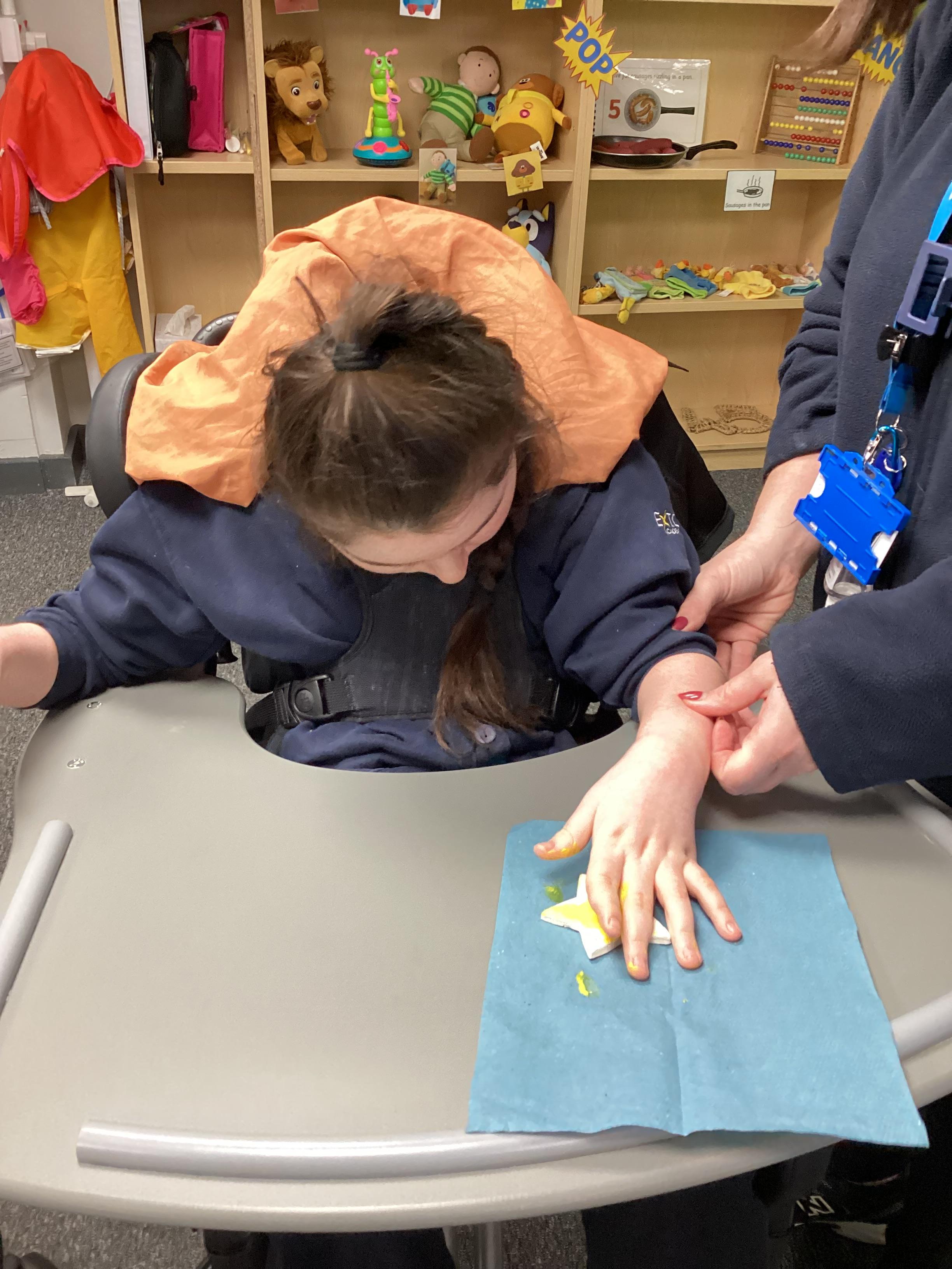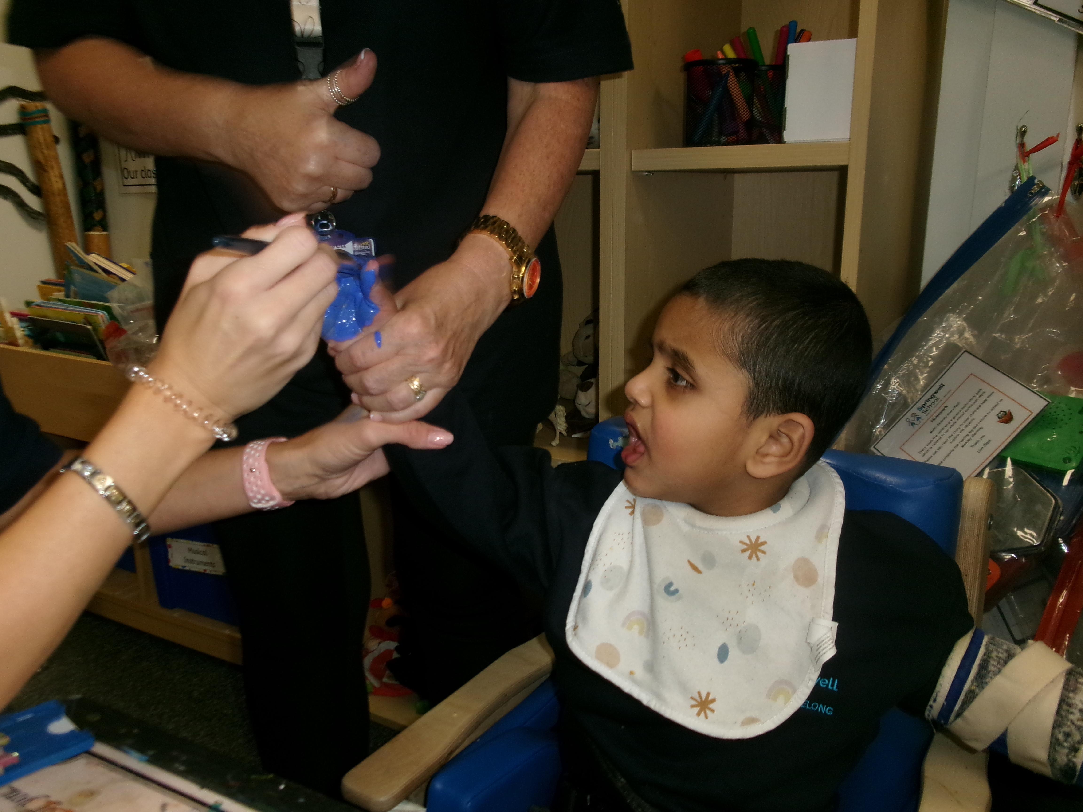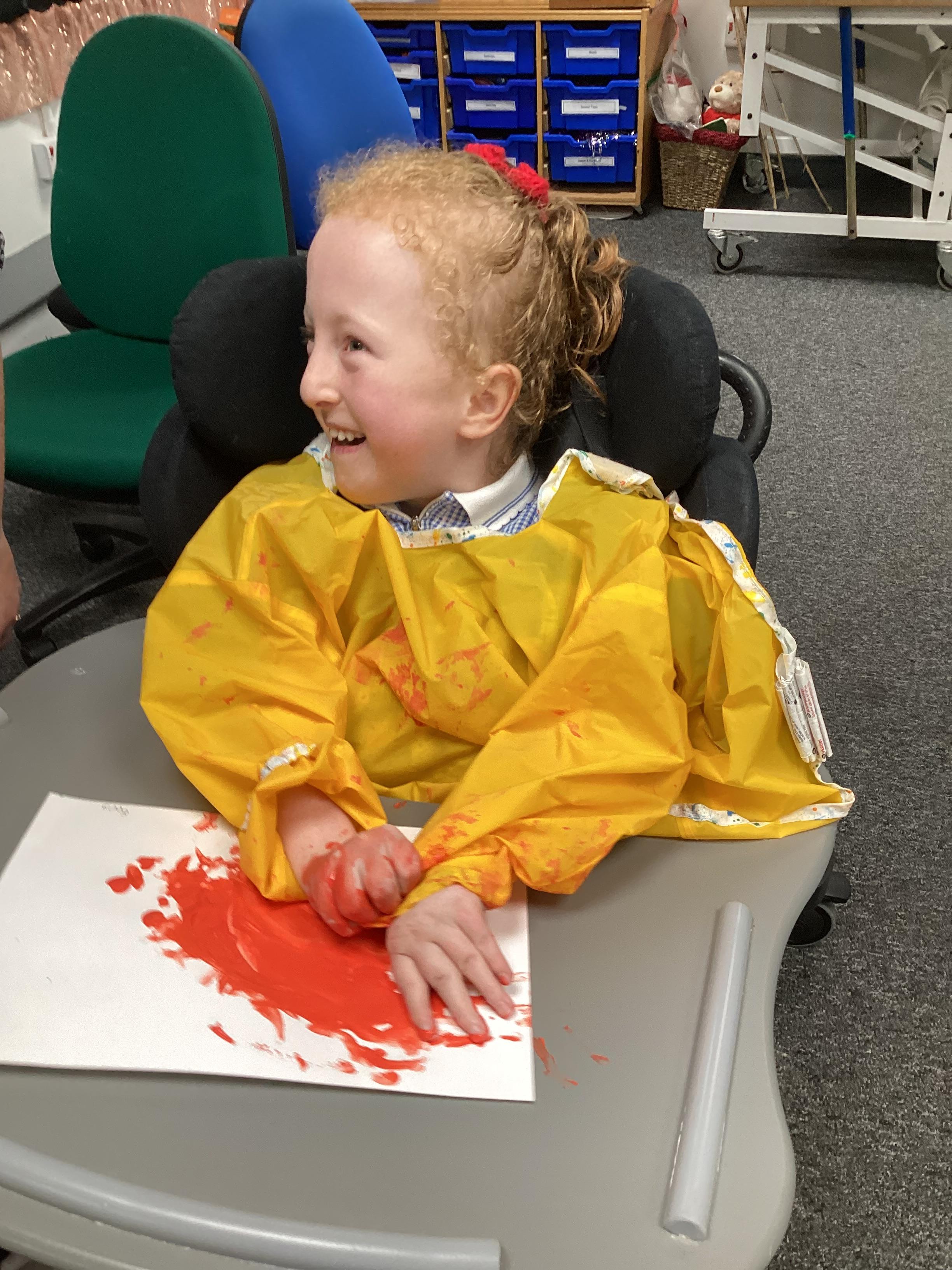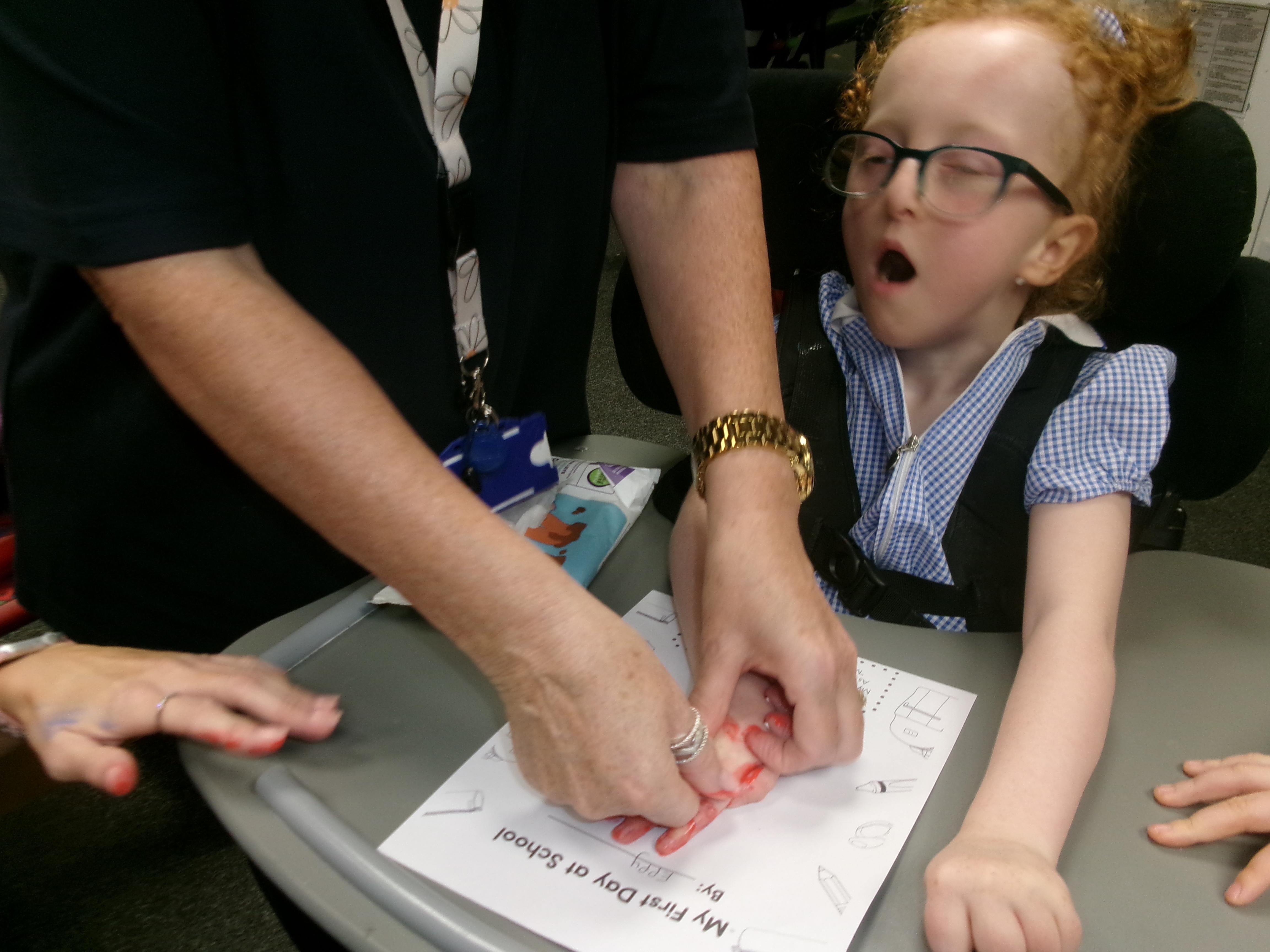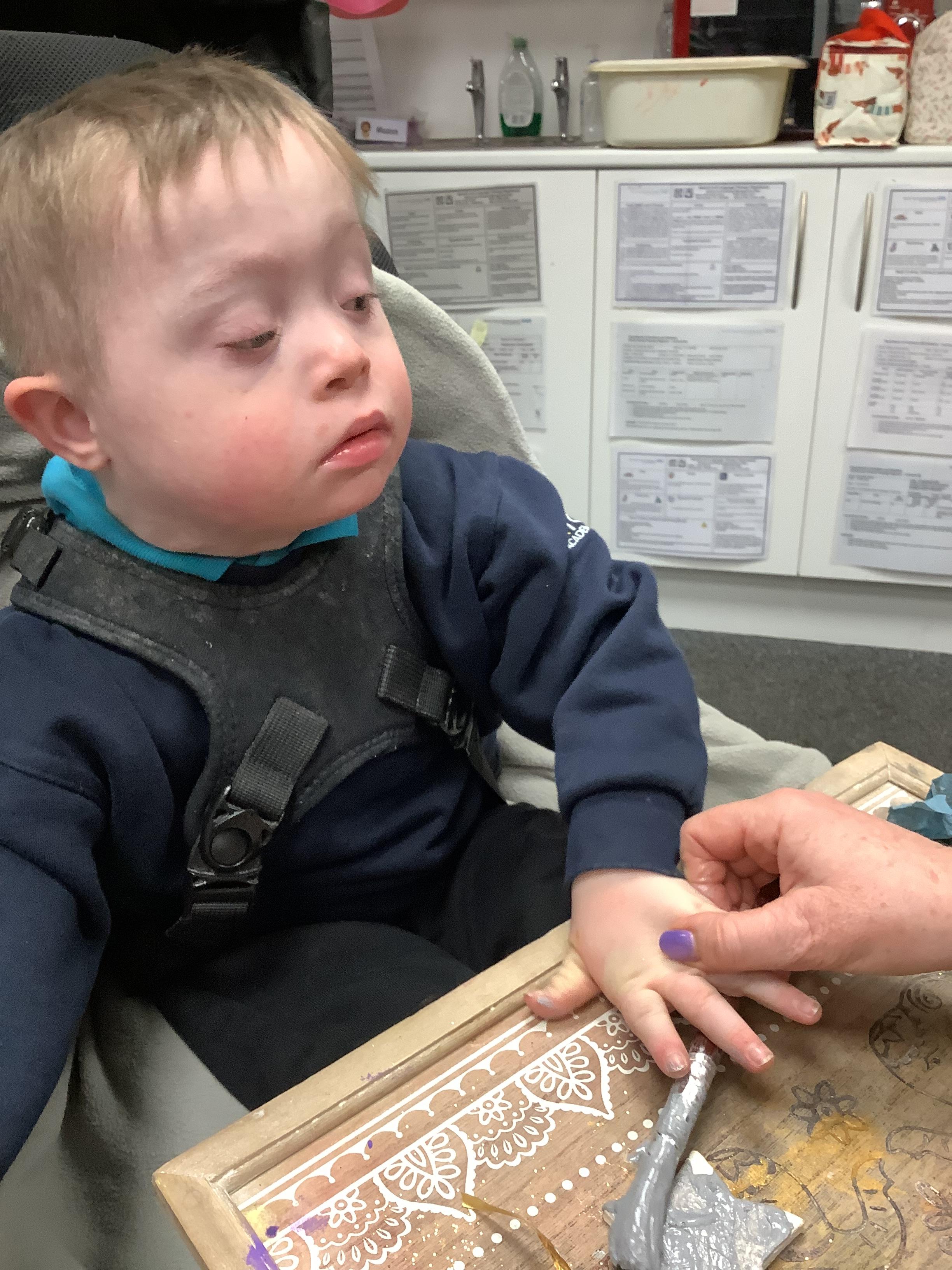 We created our very own hand print art work to mark our first day of a new year; some of us beginning yet another year at Springwell with others just beginning their school journey. We loved the feel of the paint as it was brushed on to our fingers and hands.