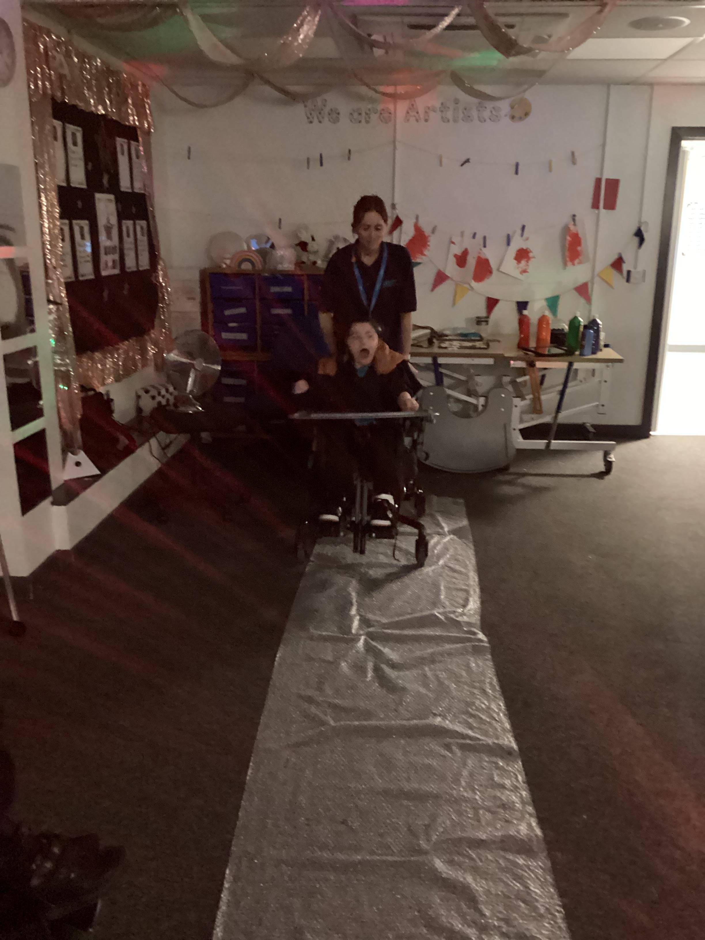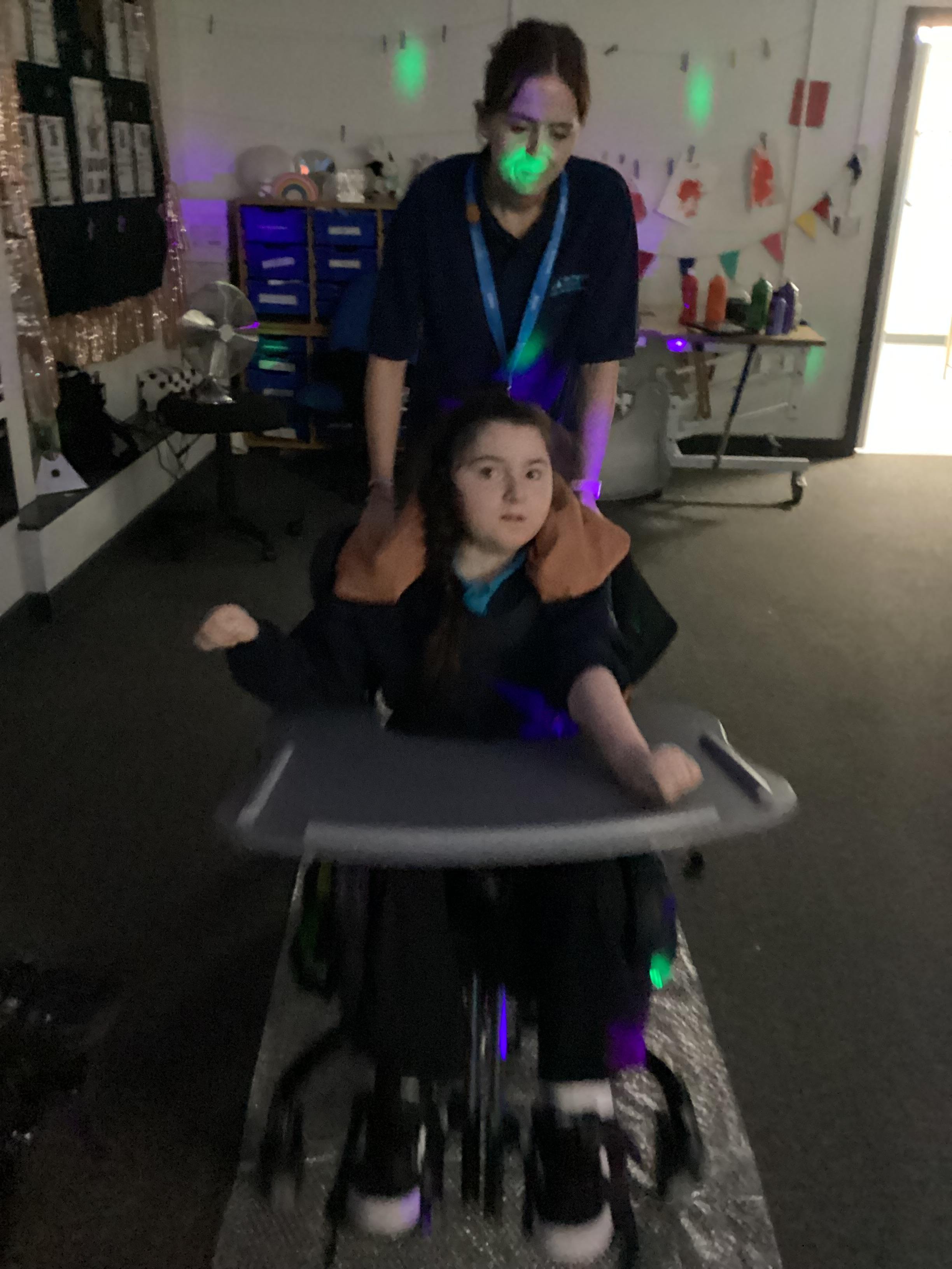 This afternoon we enjoyed a disco in the hall with our friends from around school. We listened to the music, looked at the bright lights and interacted with others. What fun we had!