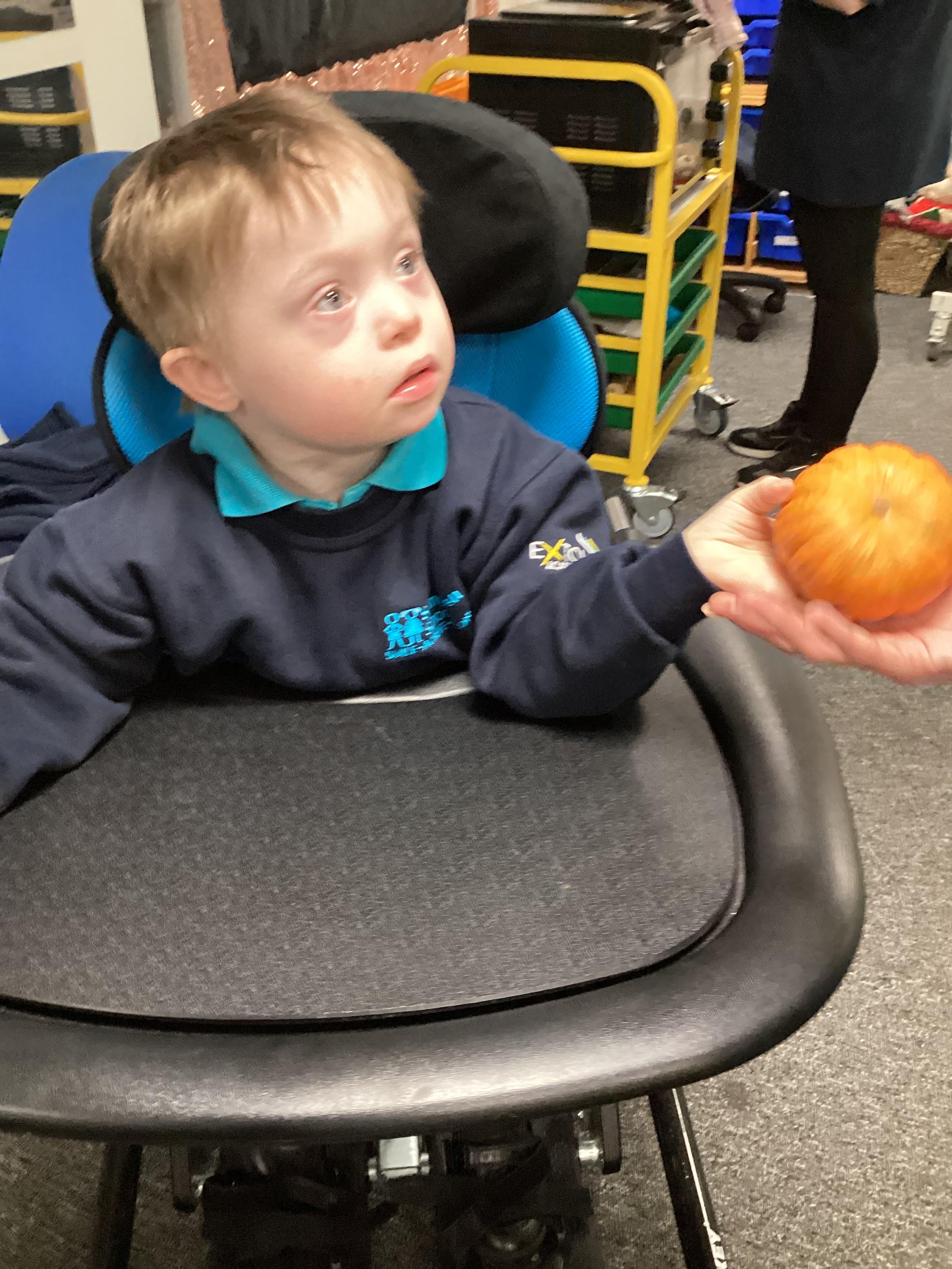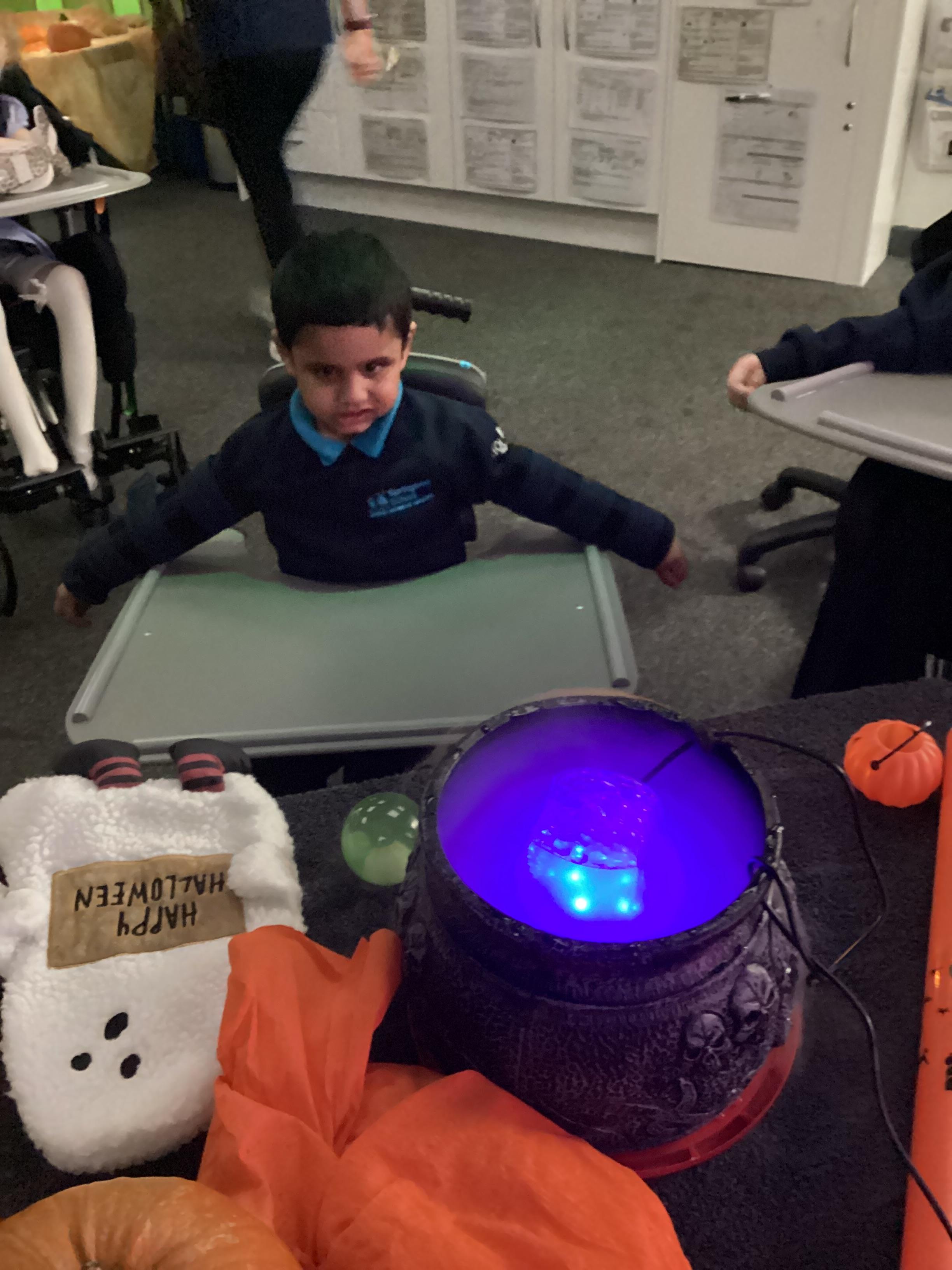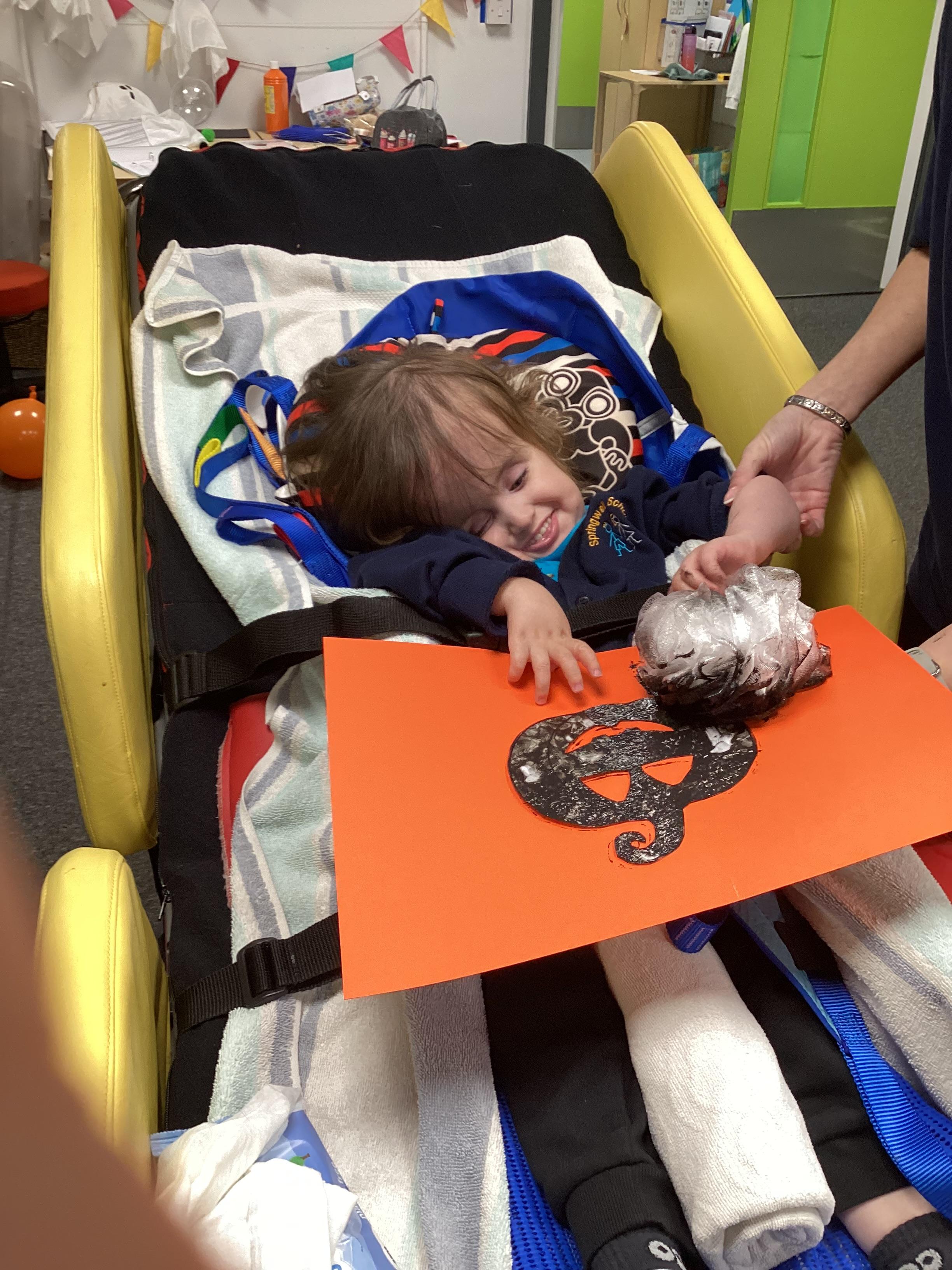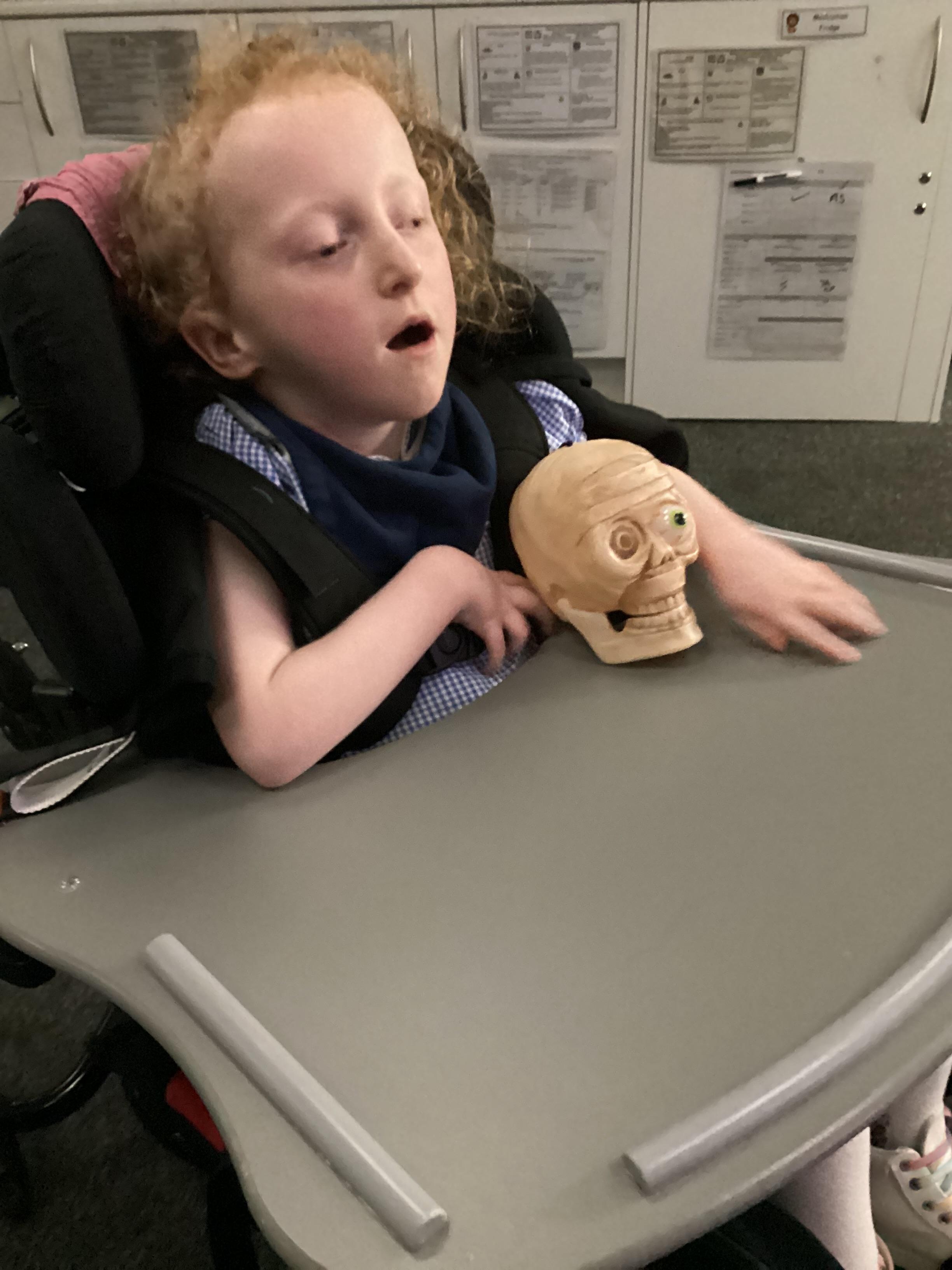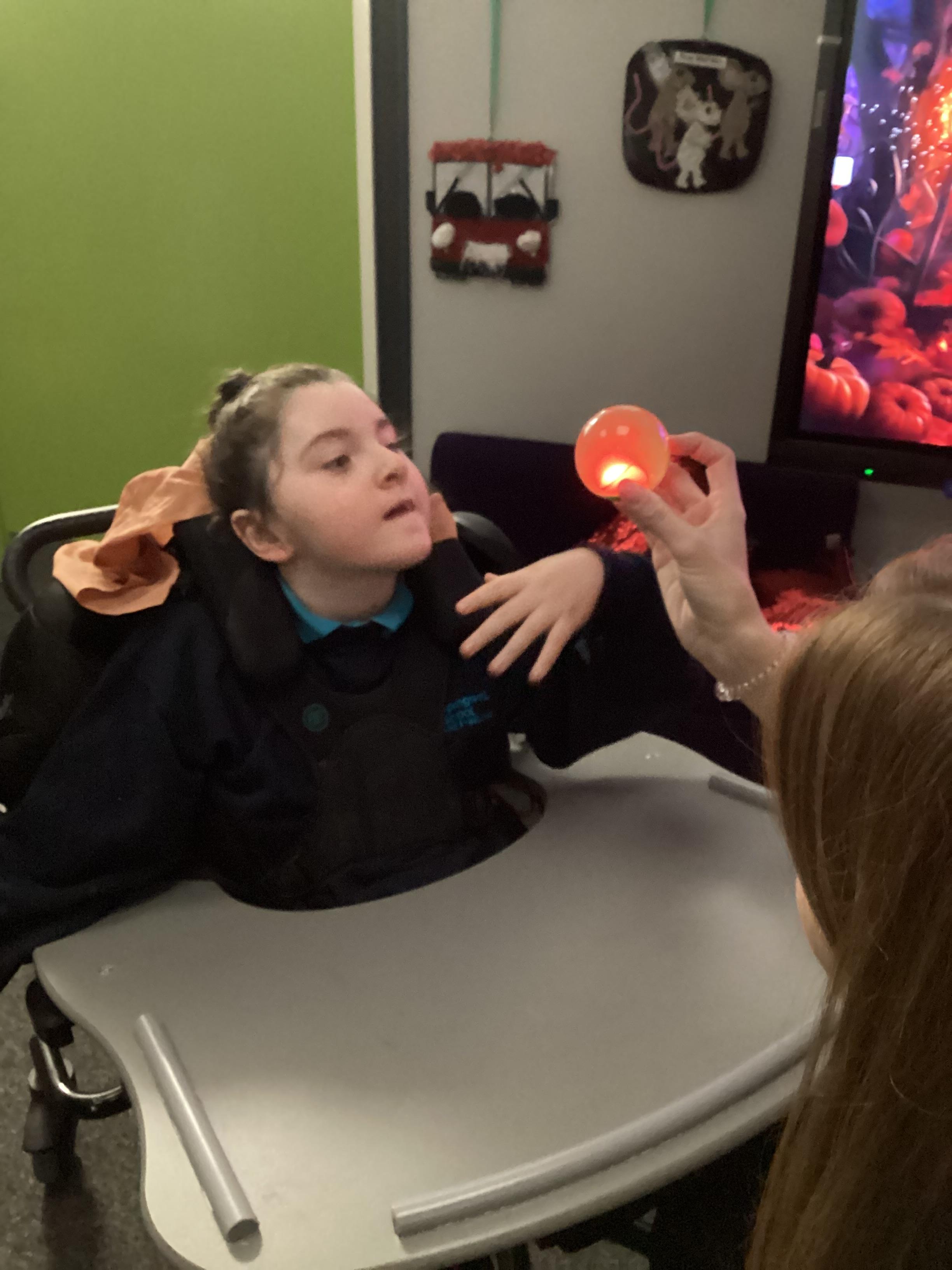 As we move closer to Halloween, we have been listening to a spooky sensory story, exploring the props and anticipating what comes next. We worked hard to demonstrate our want to continue exploring favoured objects and we were very clear in our responses when we didn't particularly like a stimulus.
