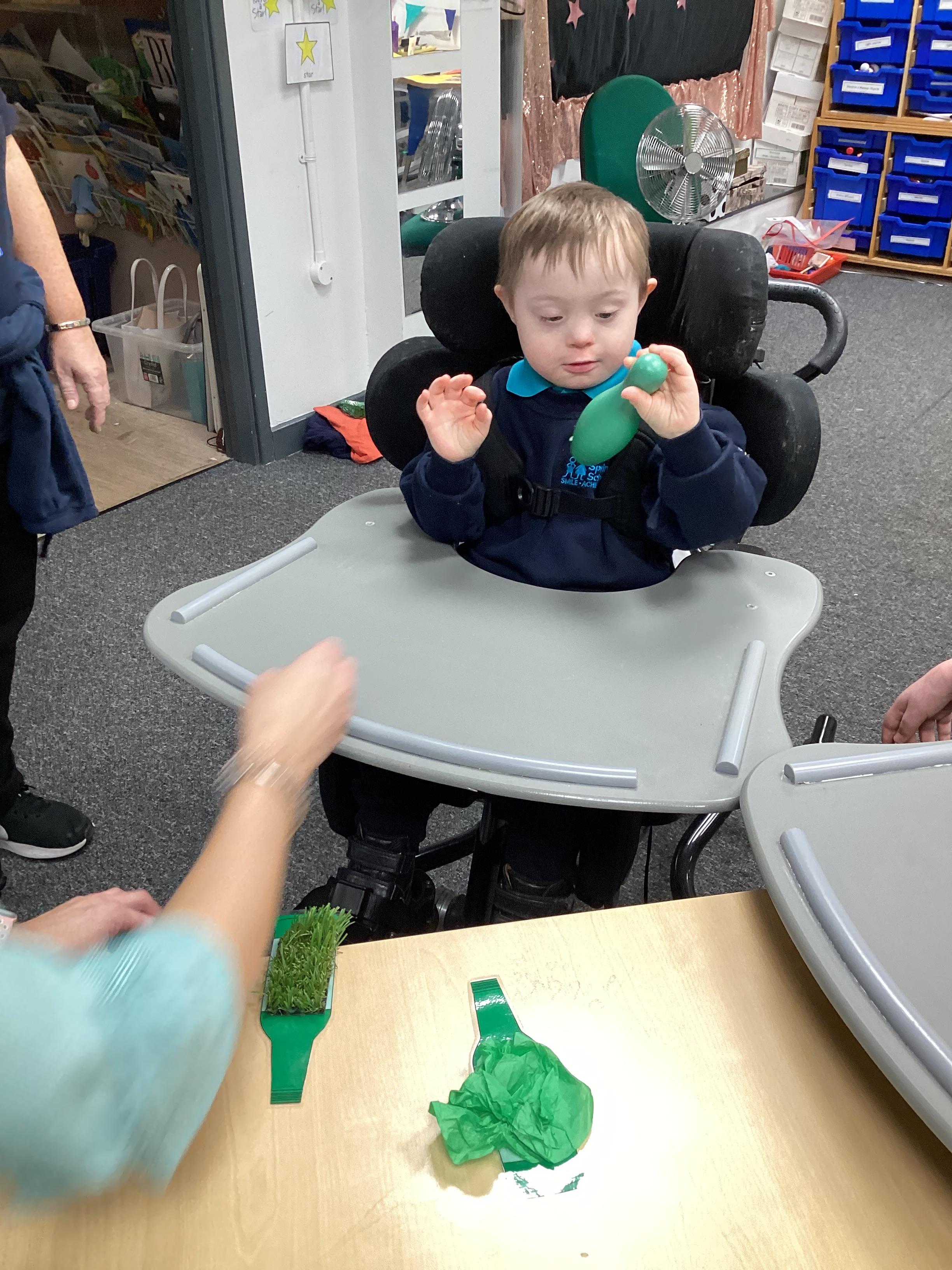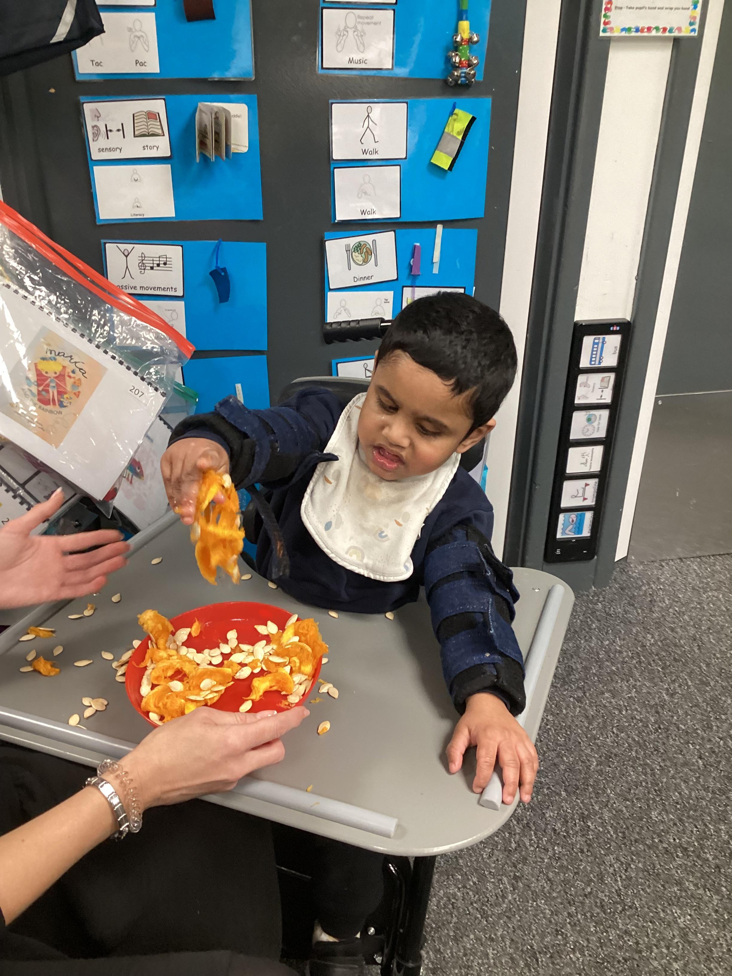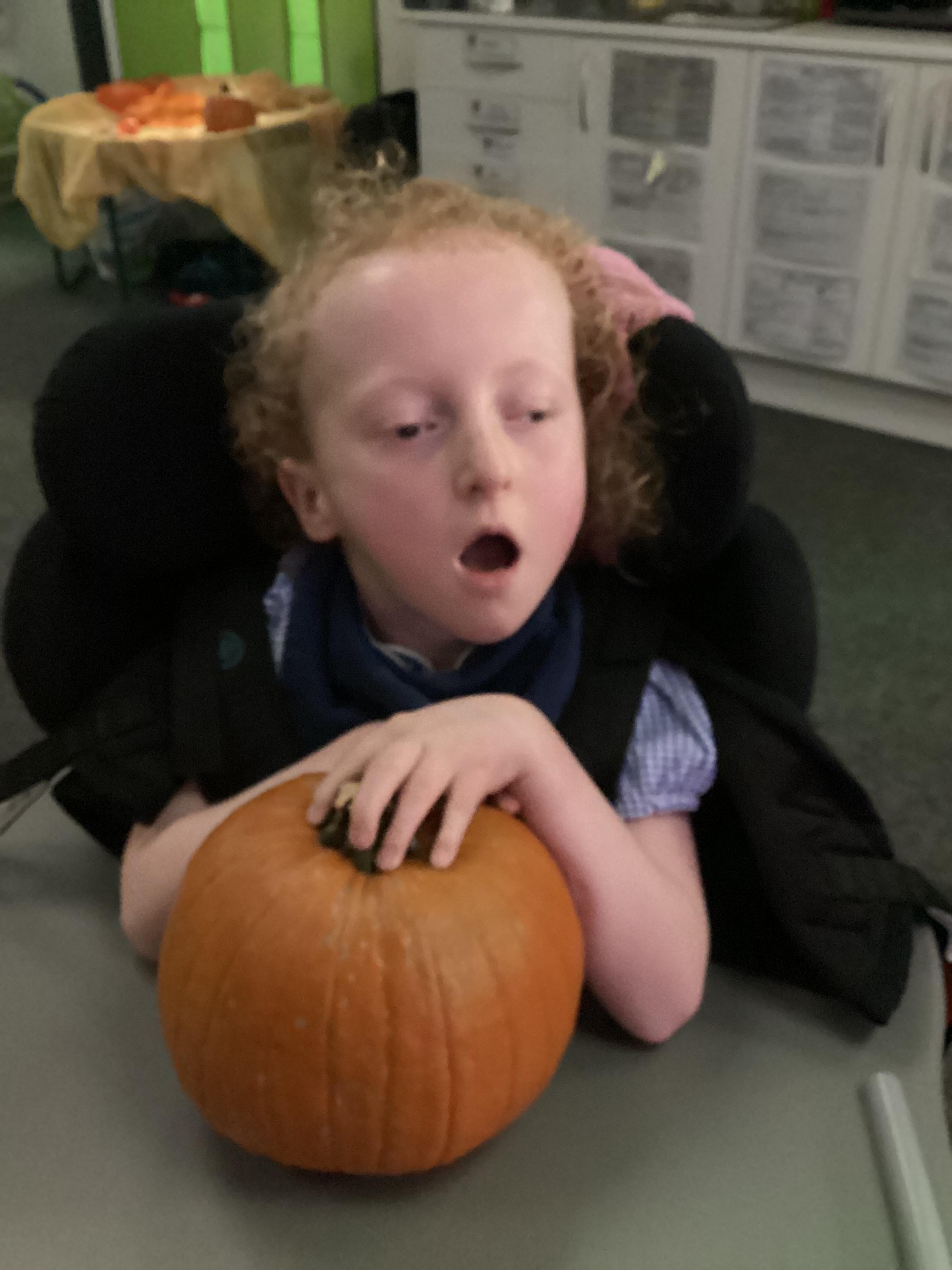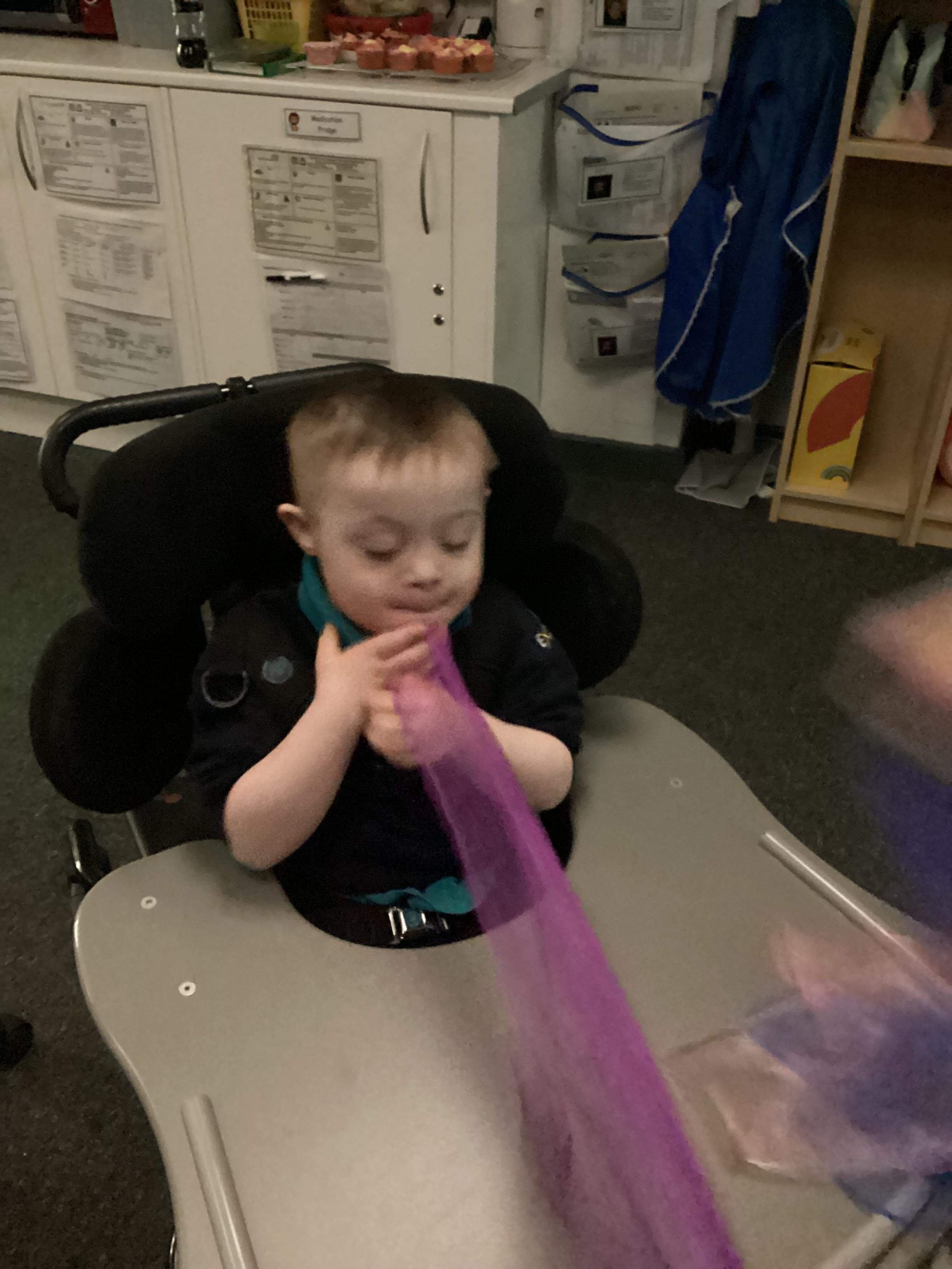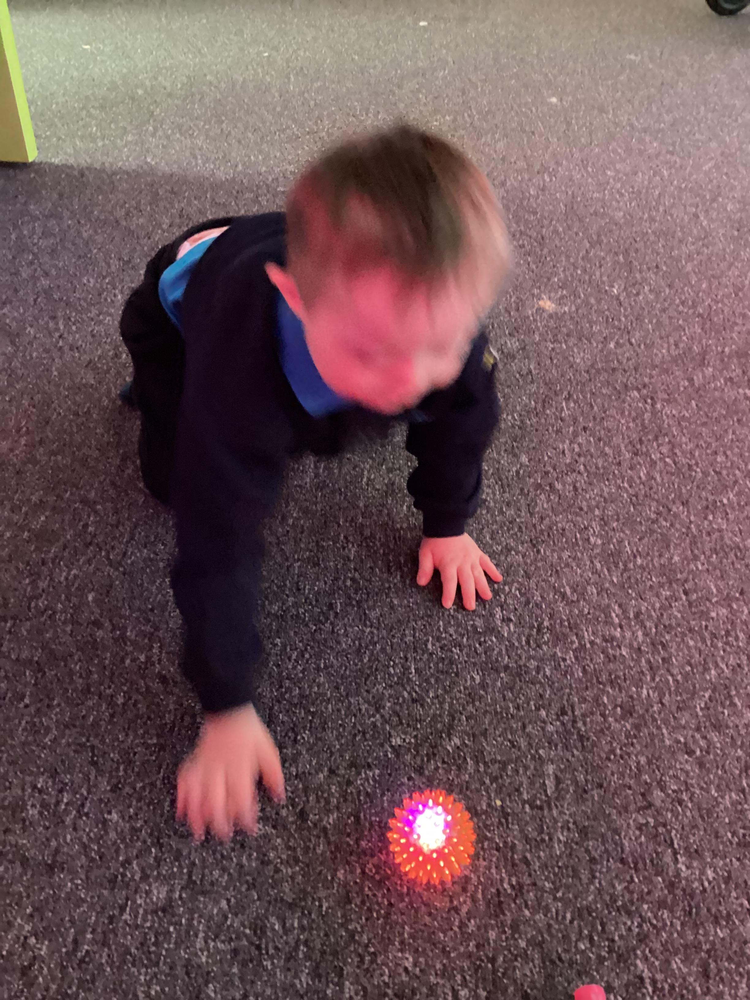 As we move closer to Halloween, we have been listening to a spooky sensory story, exploring the props and anticipating what comes next. We worked hard to demonstrate our want to continue exploring favoured objects and we were very clear in our responses when we didn't particularly like a stimulus.