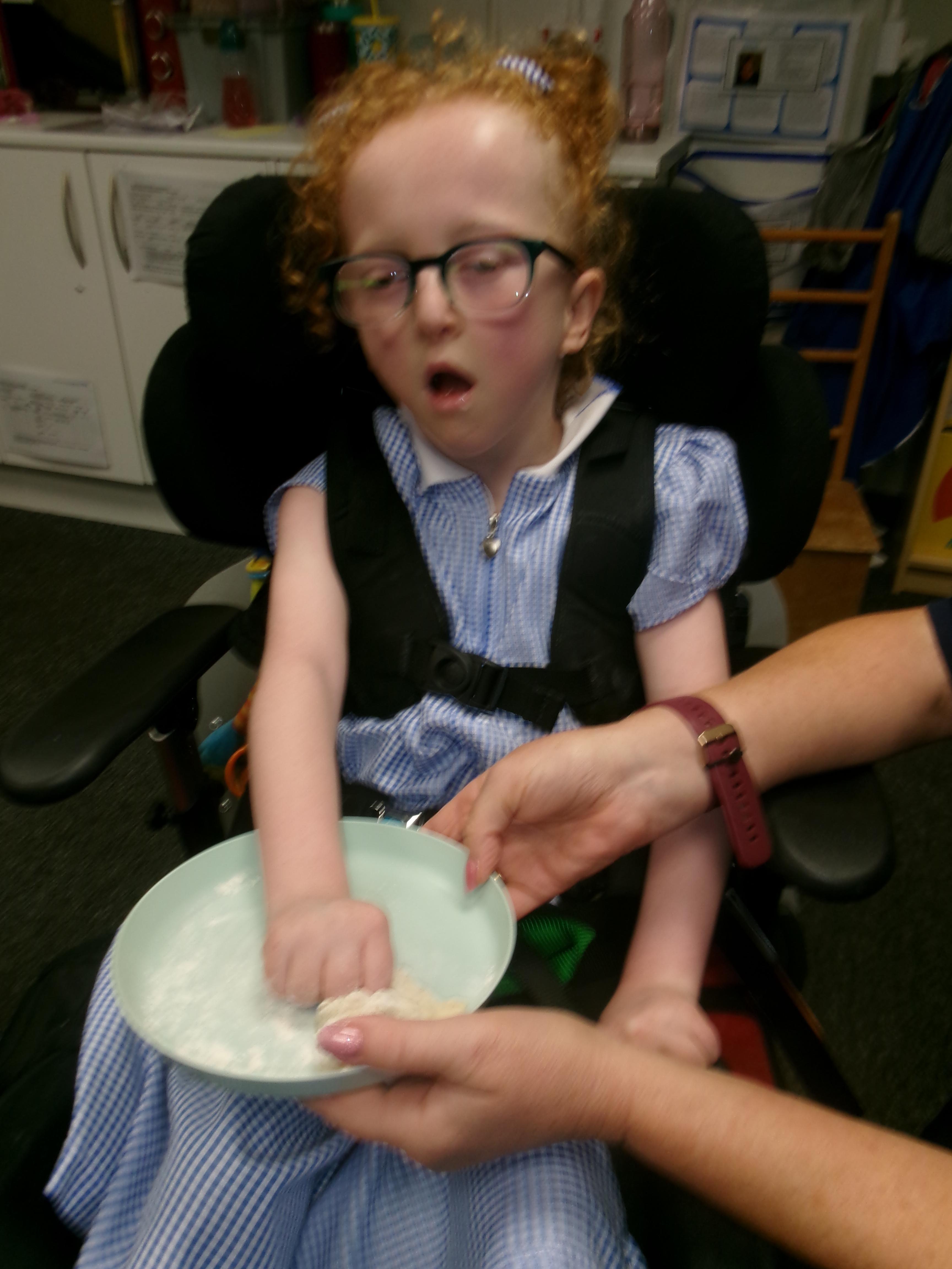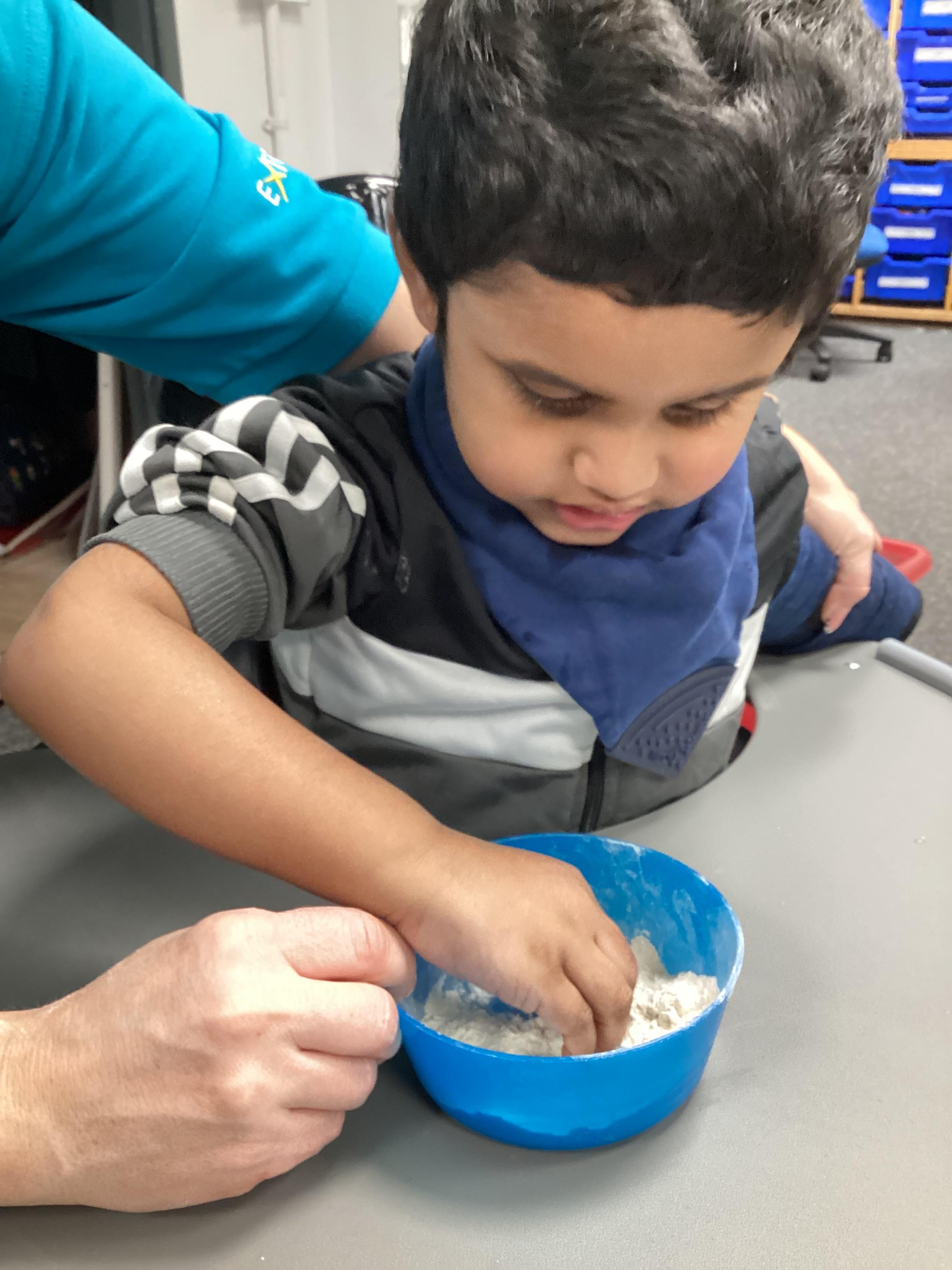 Over the next few weeks we will be focusing on the colour brown, linked to our focus text of 'Brown Bear, Brown Bear, what do you see?' Today we baked brown bread, exploring the ingredients using all our senses.