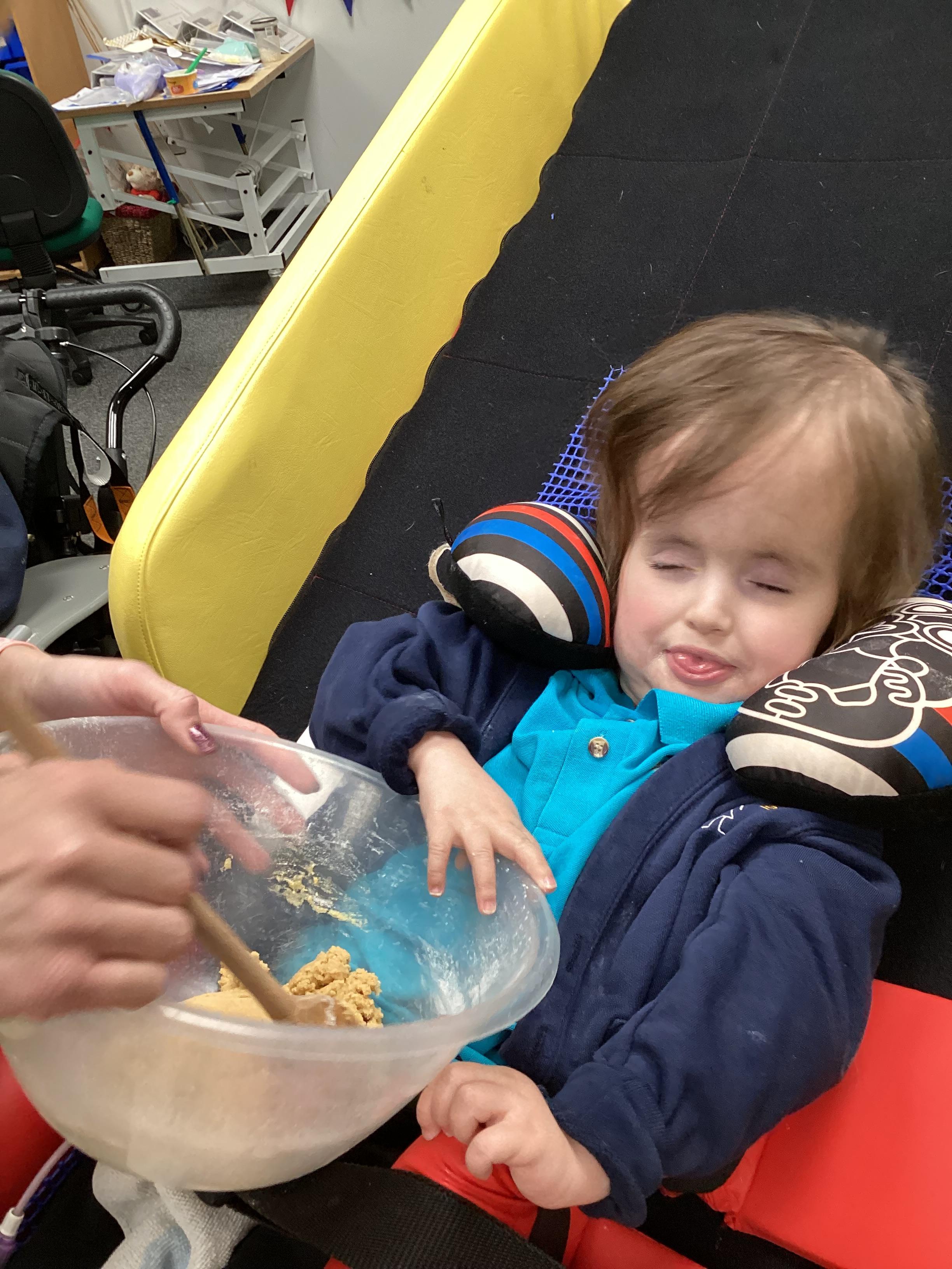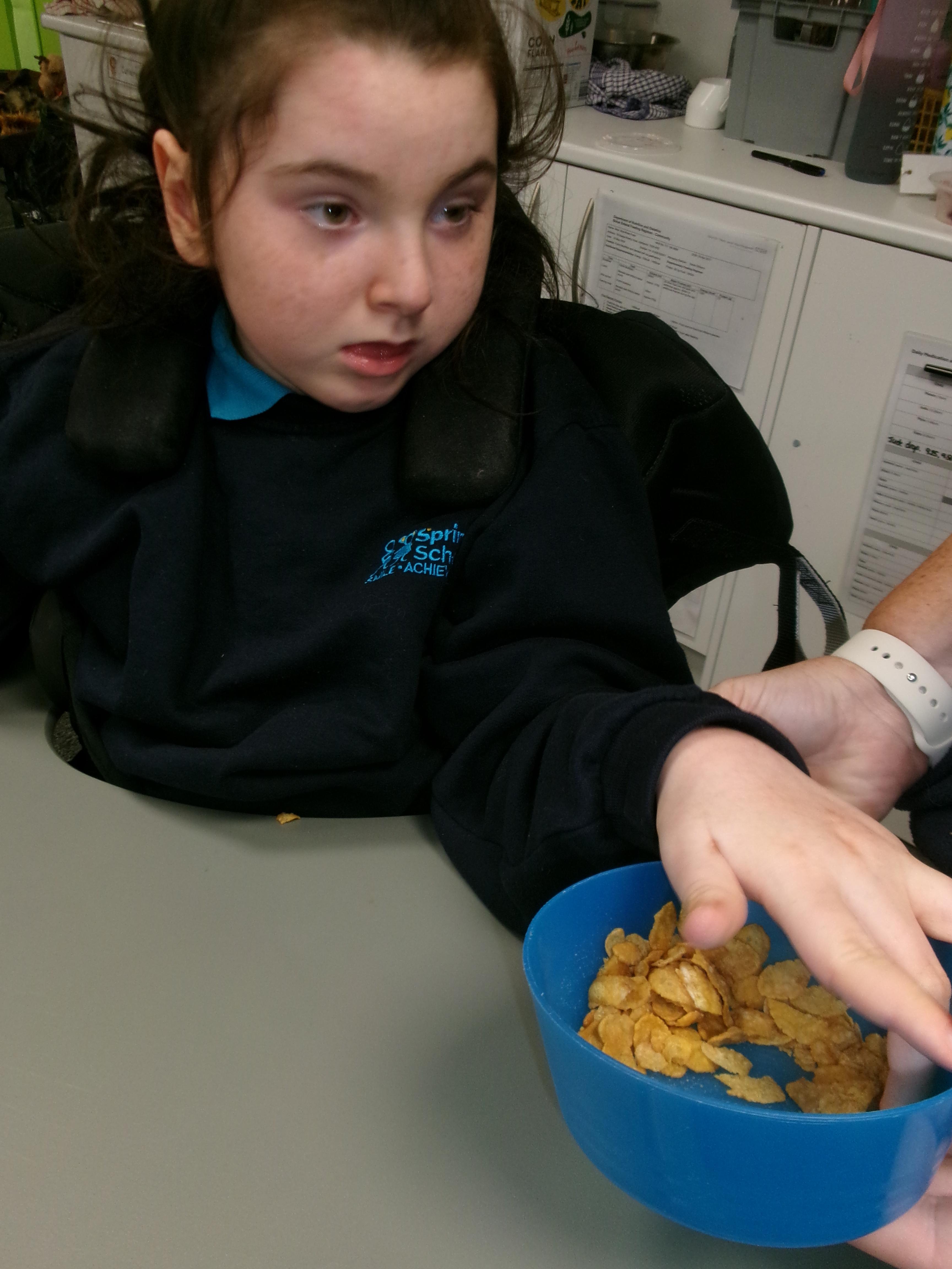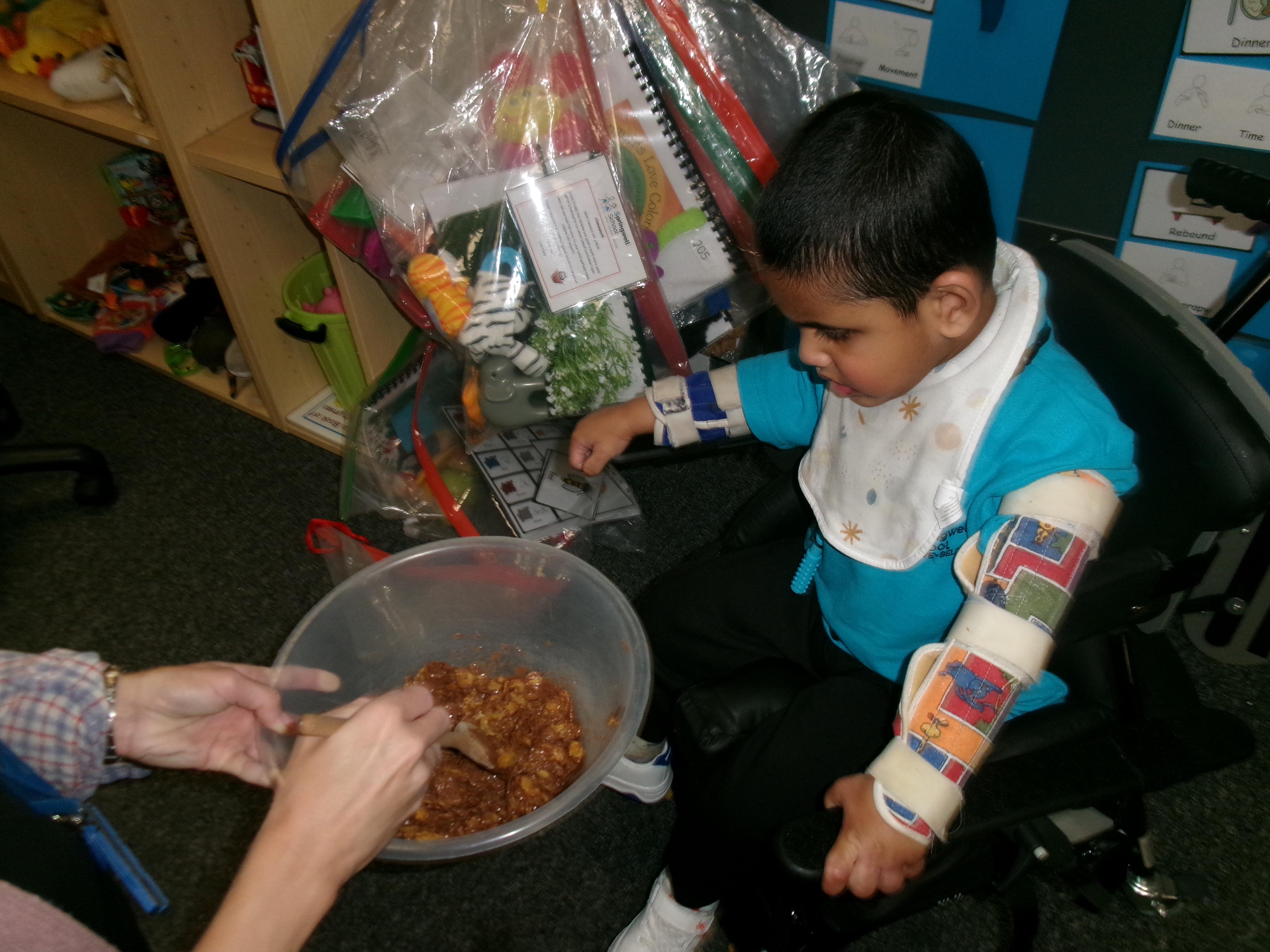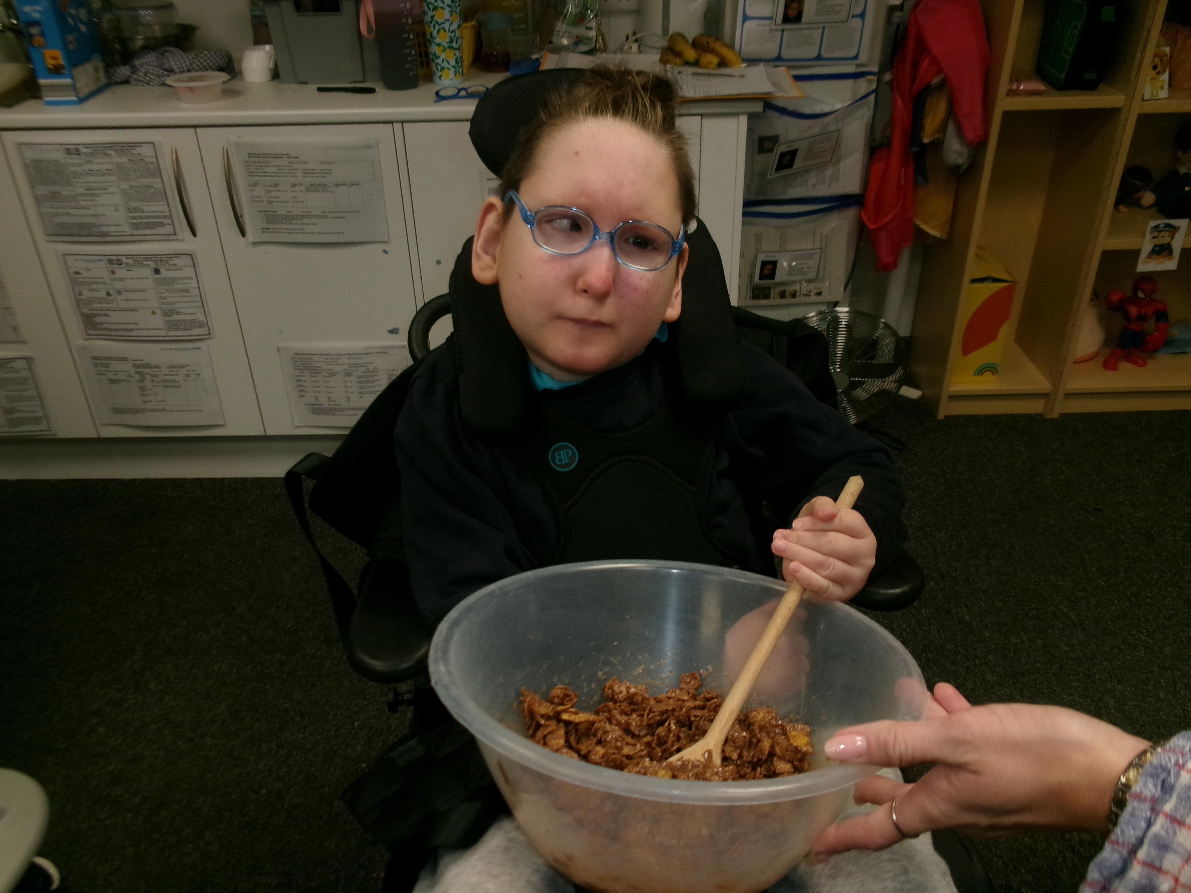 We had lots of fun in Cookery today using a switch to operate the microwave to melt the chocolate. We used our senses to explore the smell of the different chocolate, the noise the different cereals make and we watched each other as we took turns to mix the ingredients.