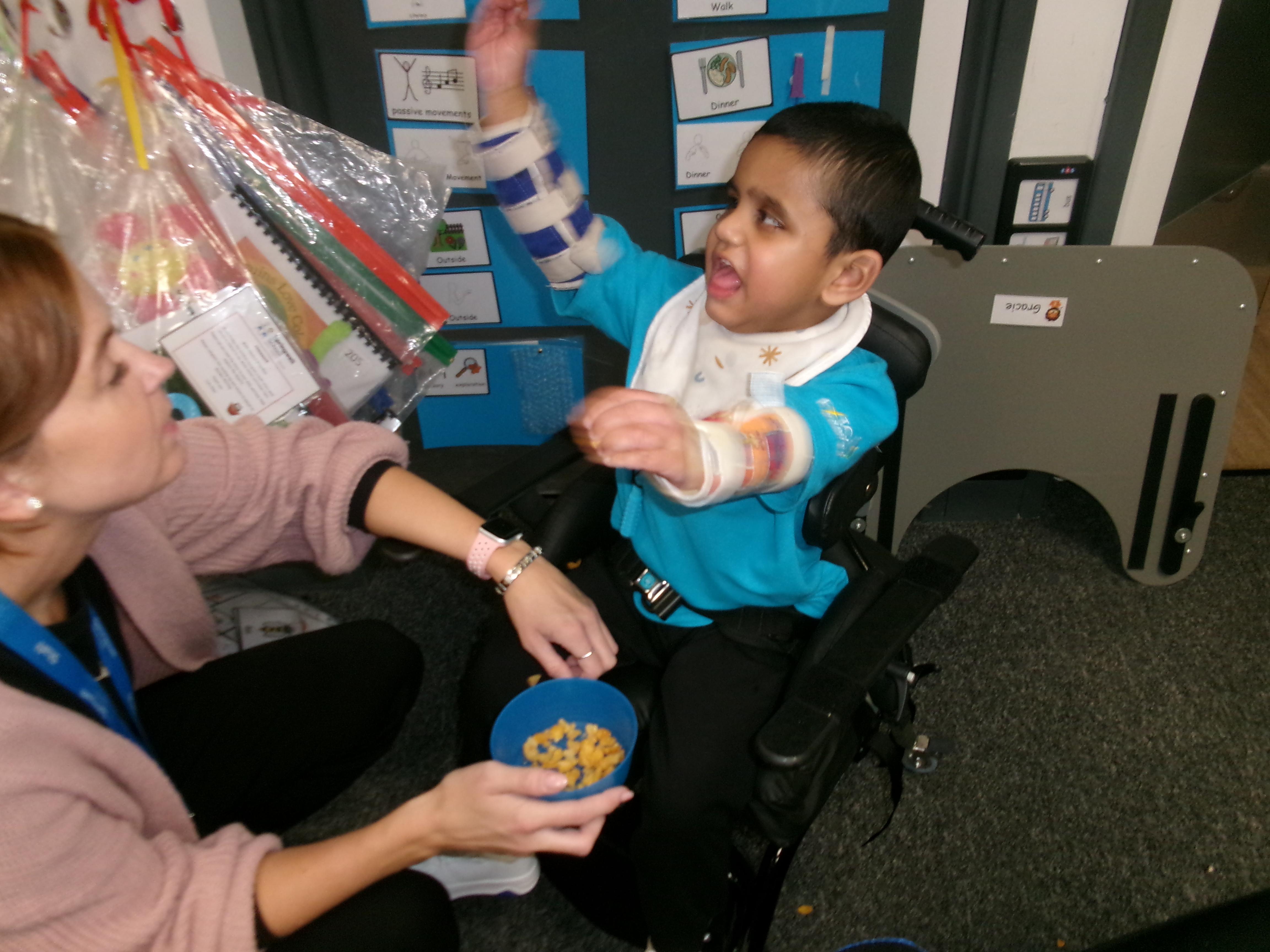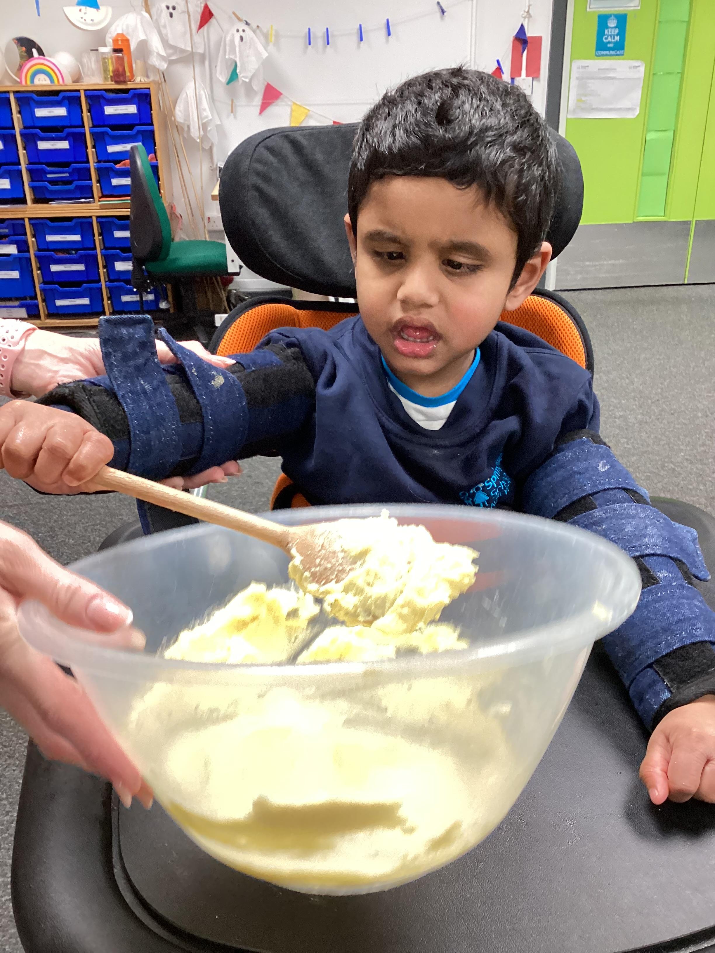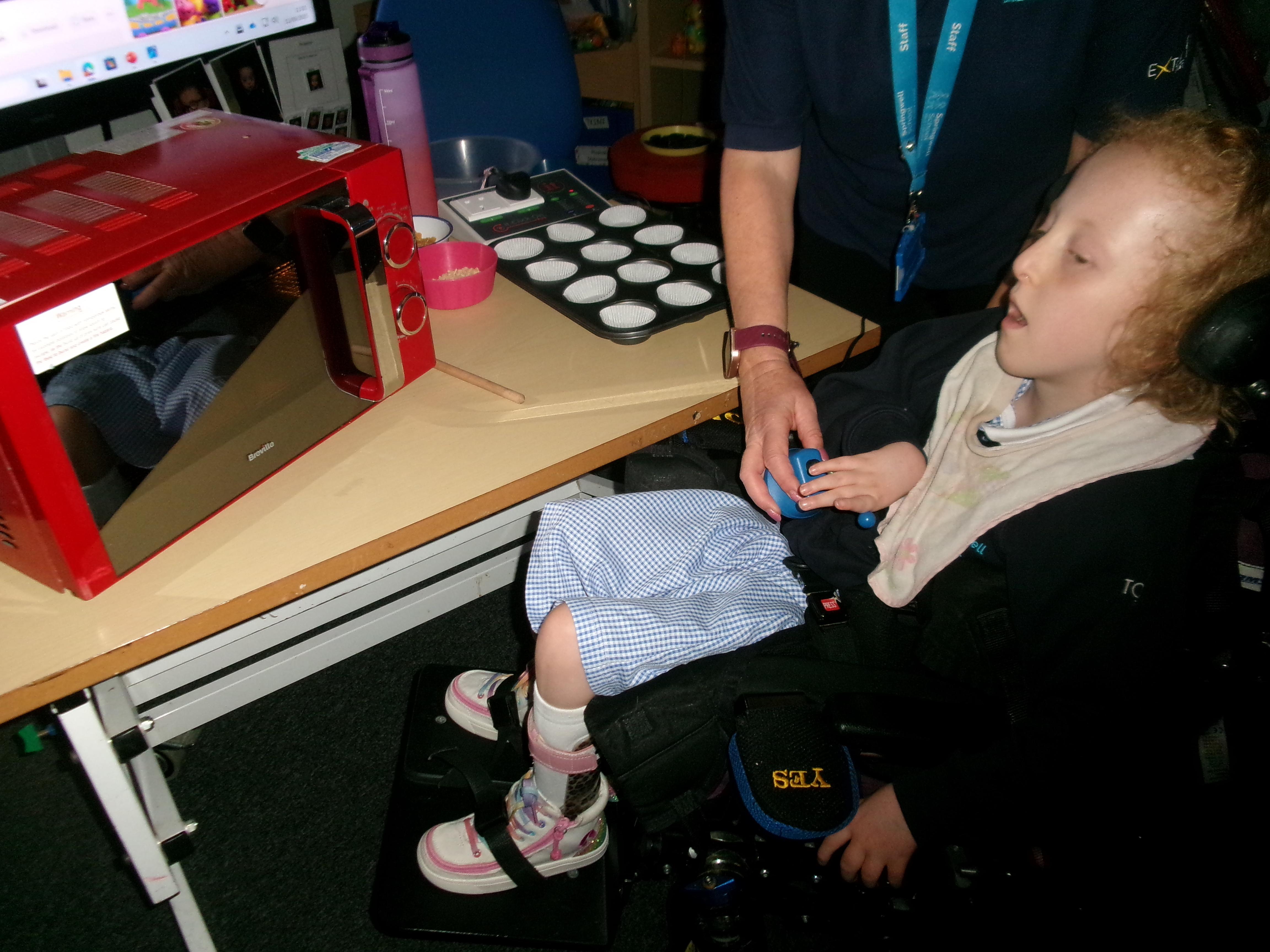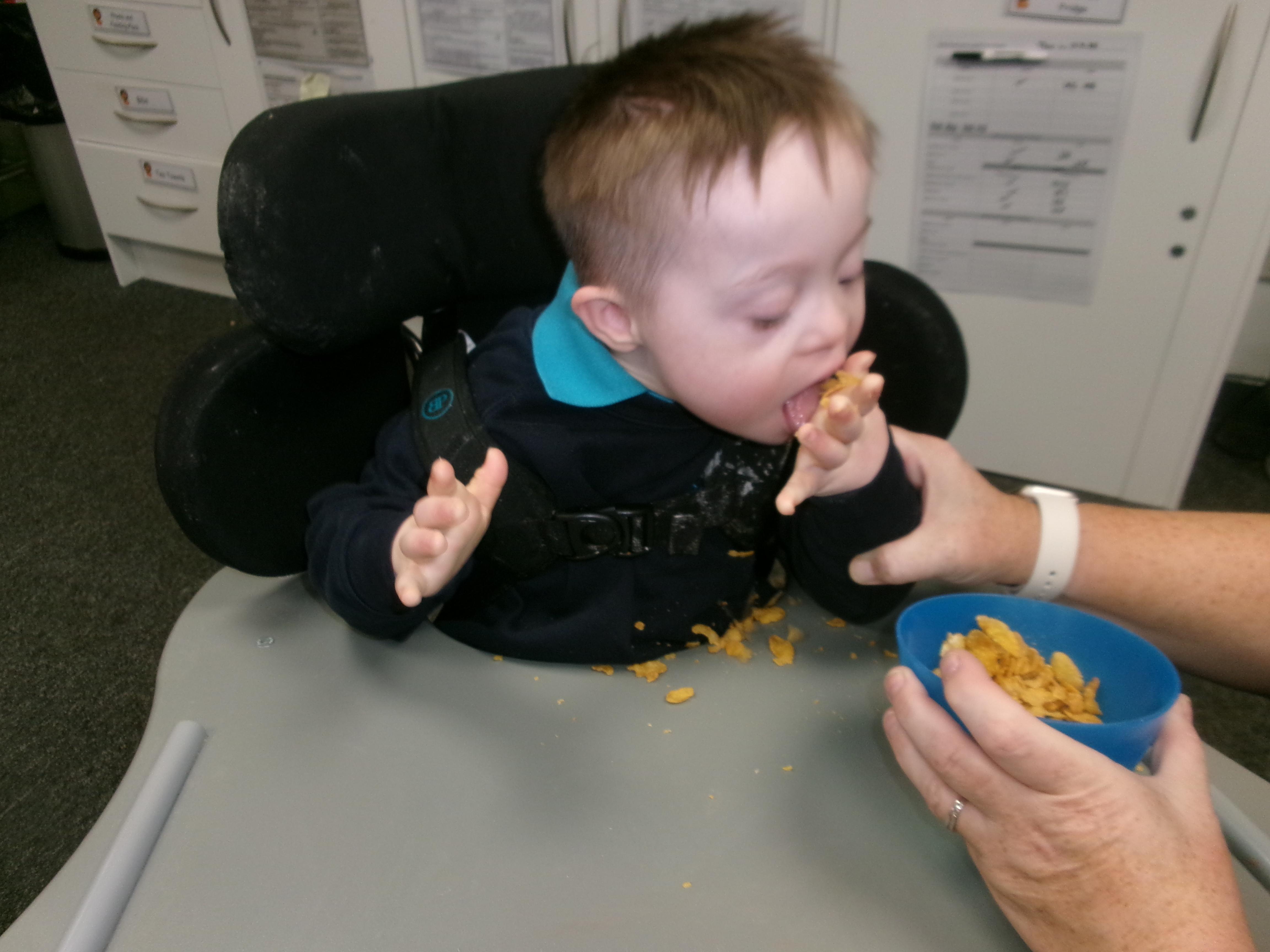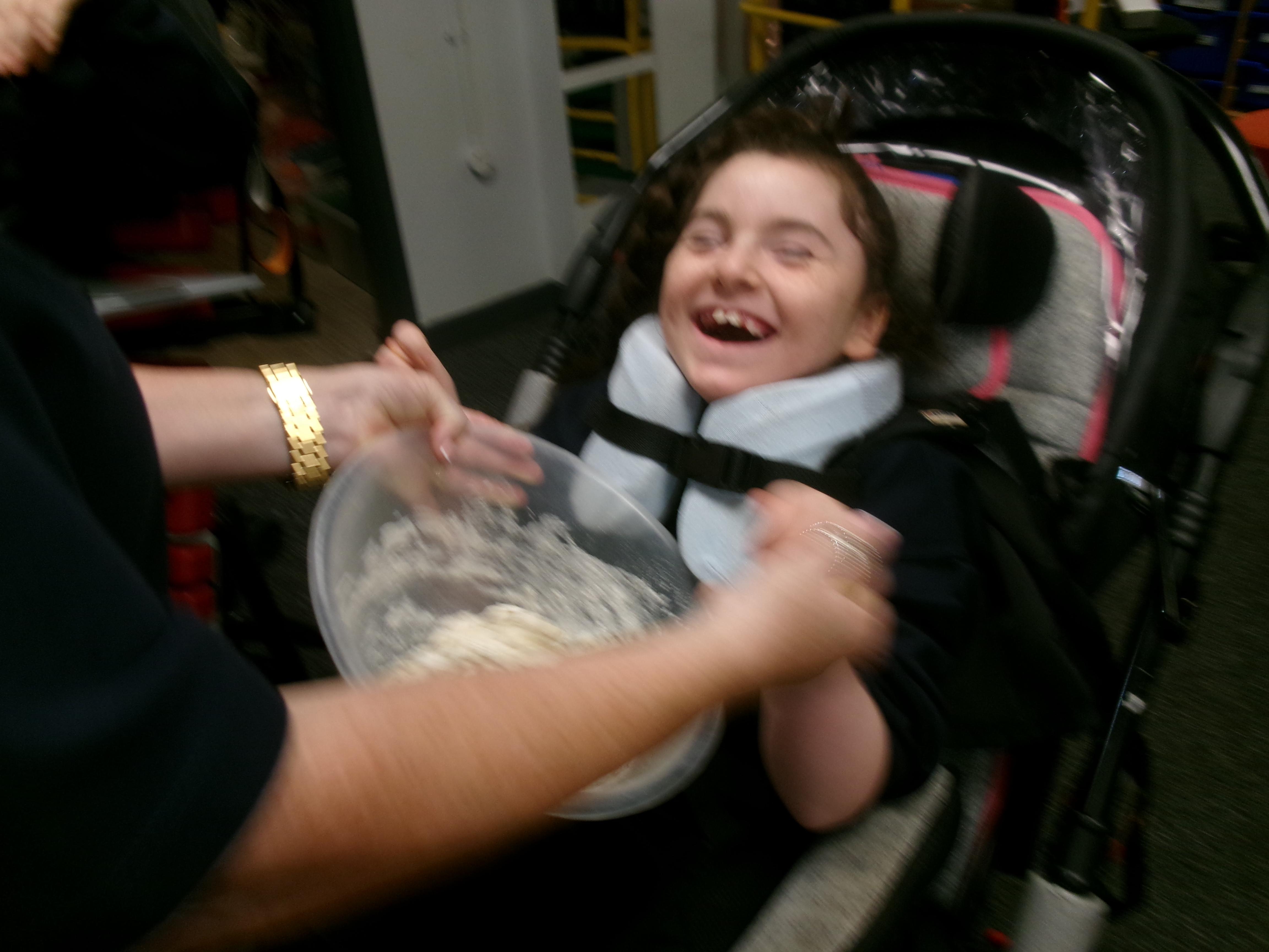 We had lots of fun in Cookery today using a switch to operate the microwave to melt the chocolate. We used our senses to explore the smell of the different chocolate, the noise the different cereals make and we watched each other as we took turns to mix the ingredients.