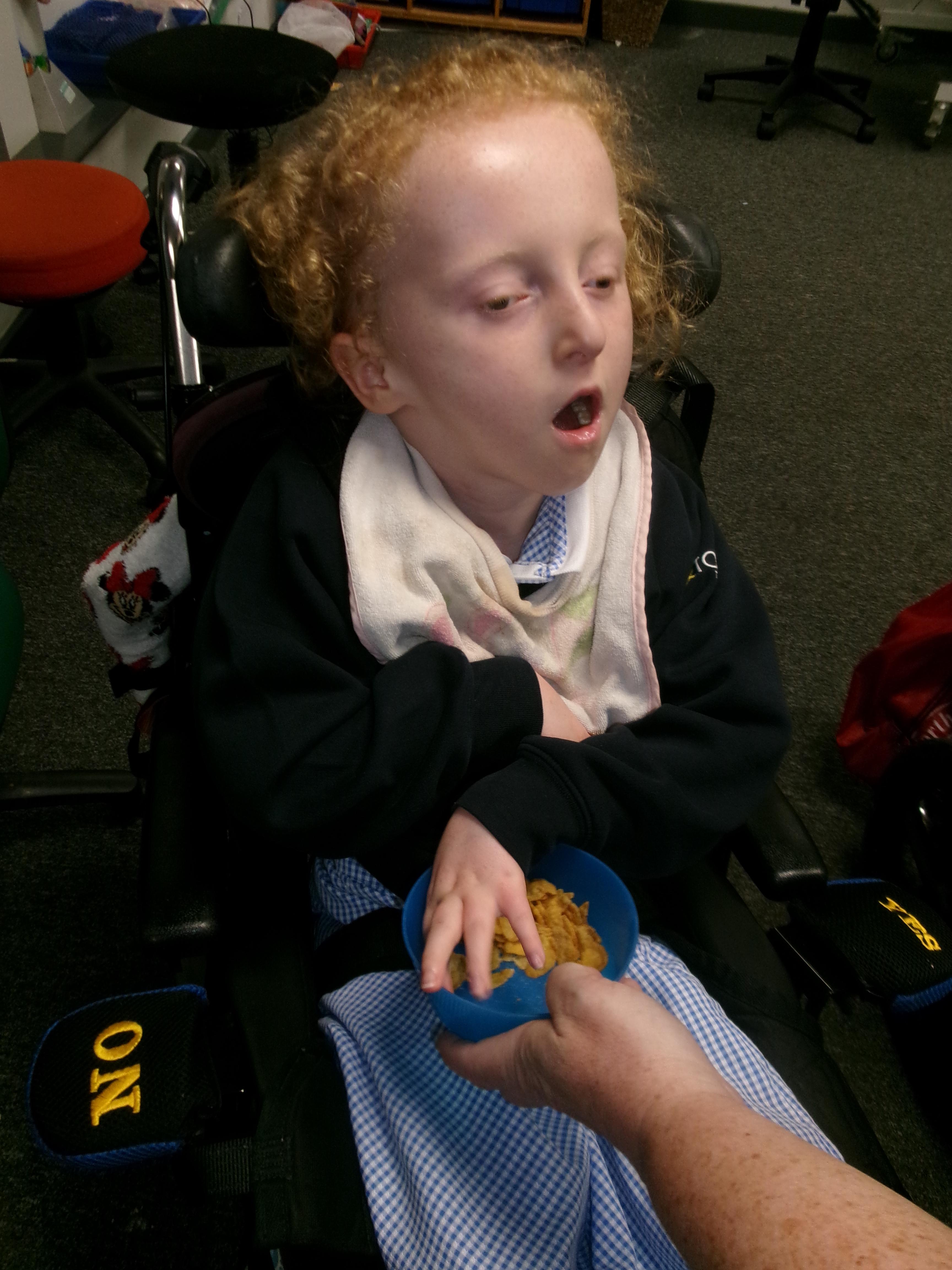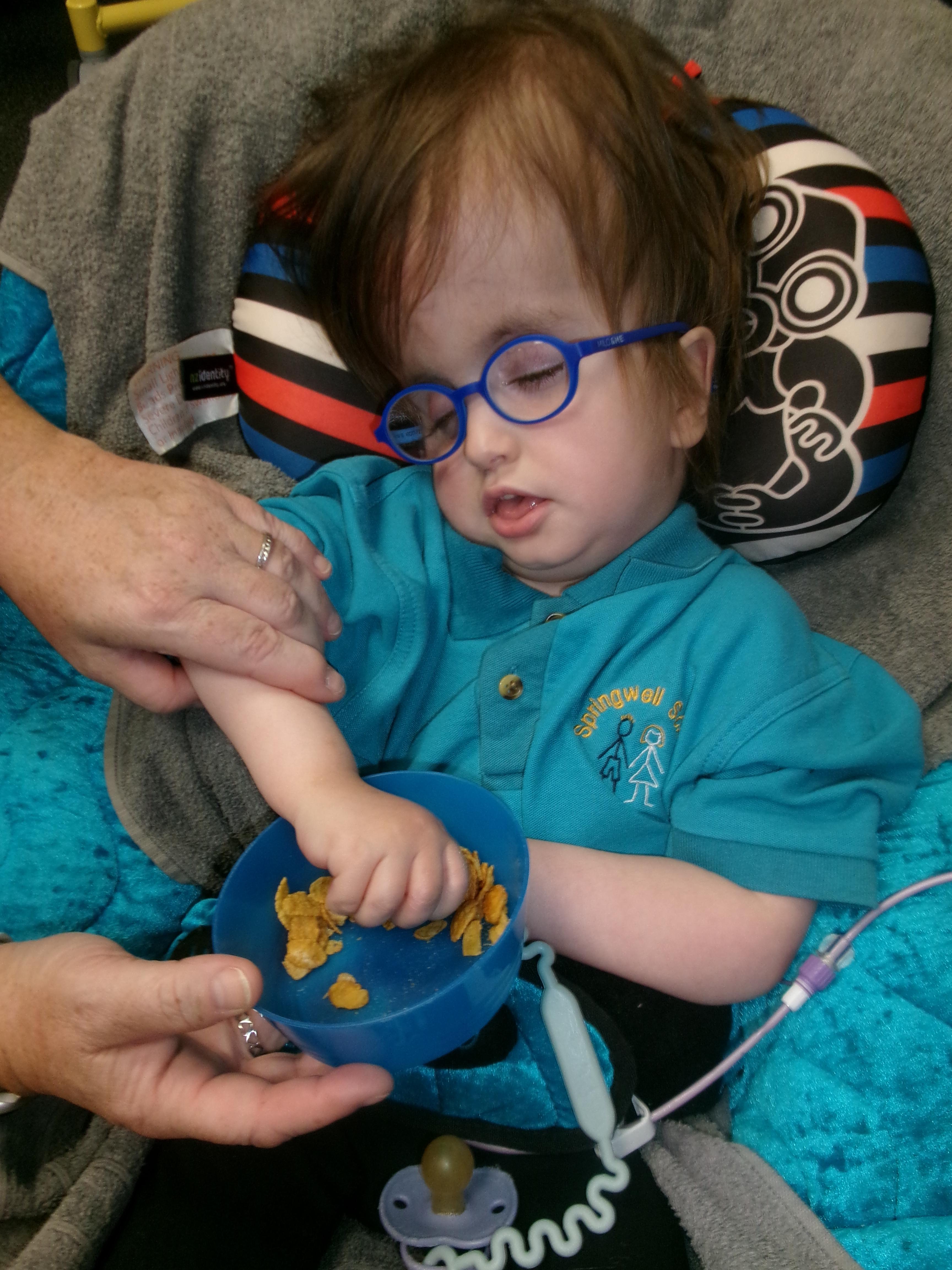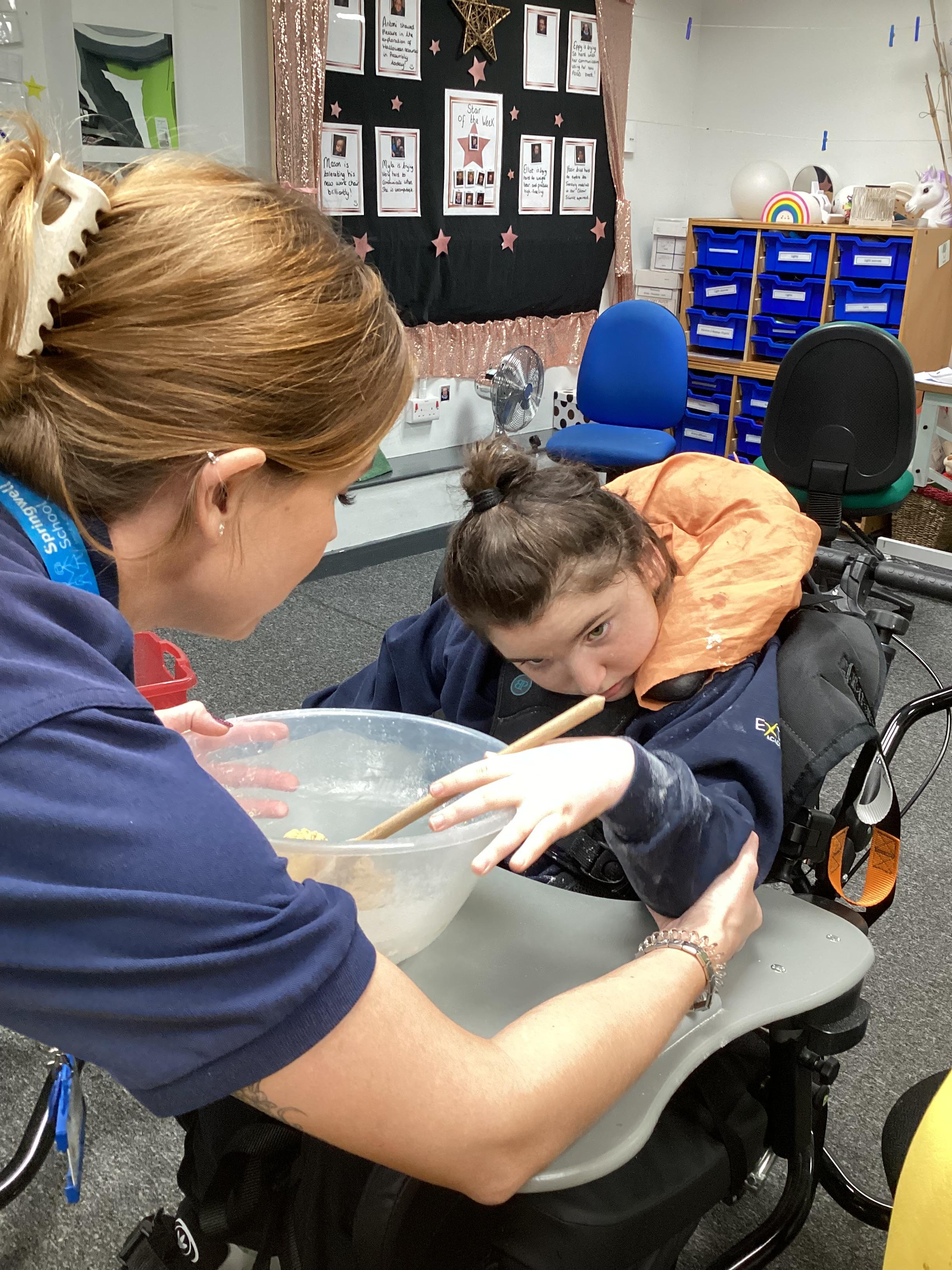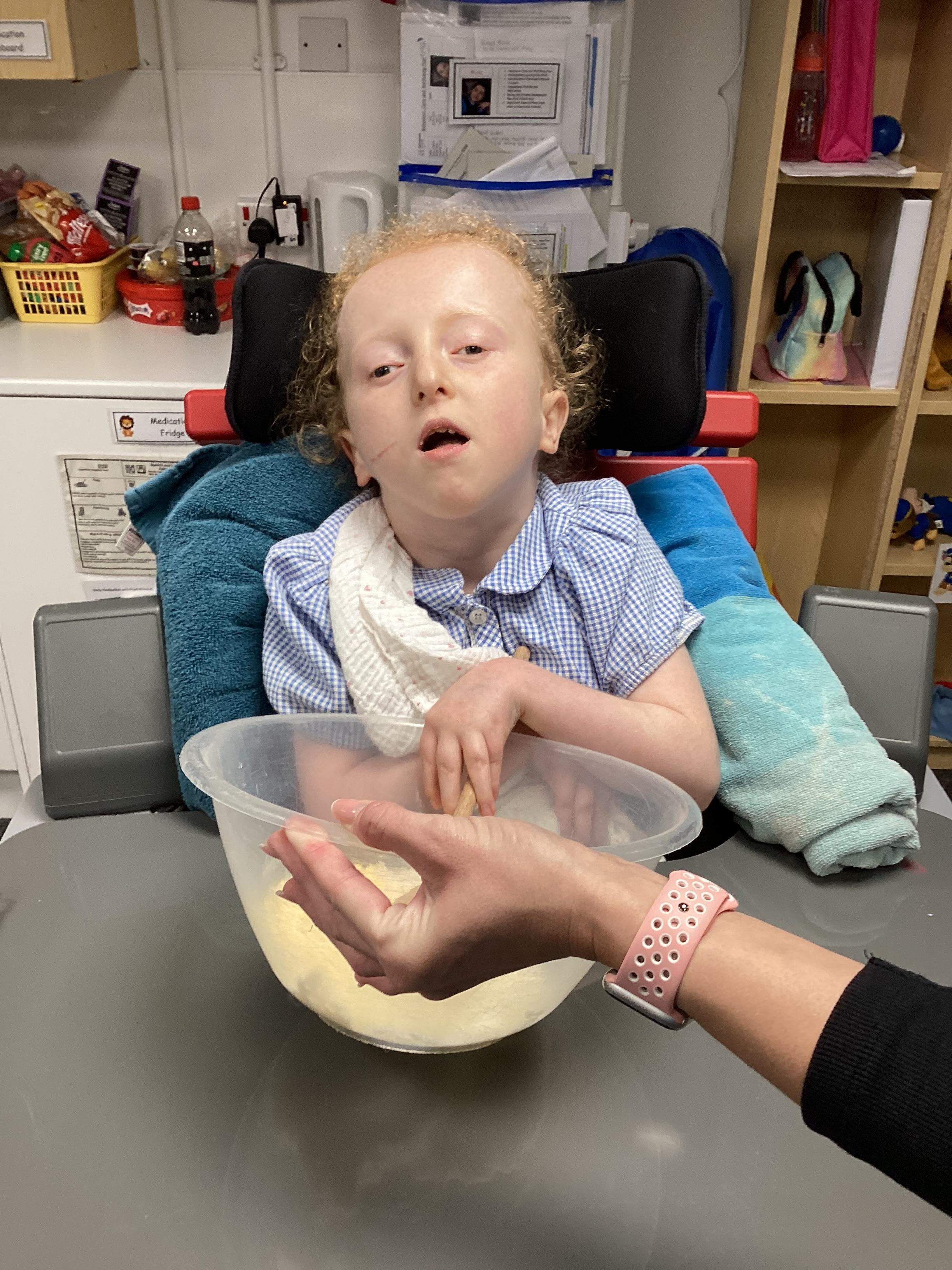 We had lots of fun in Cookery today using a switch to operate the microwave to melt the chocolate. We used our senses to explore the smell of the different chocolate, the noise the different cereals make and we watched each other as we took turns to mix the ingredients.