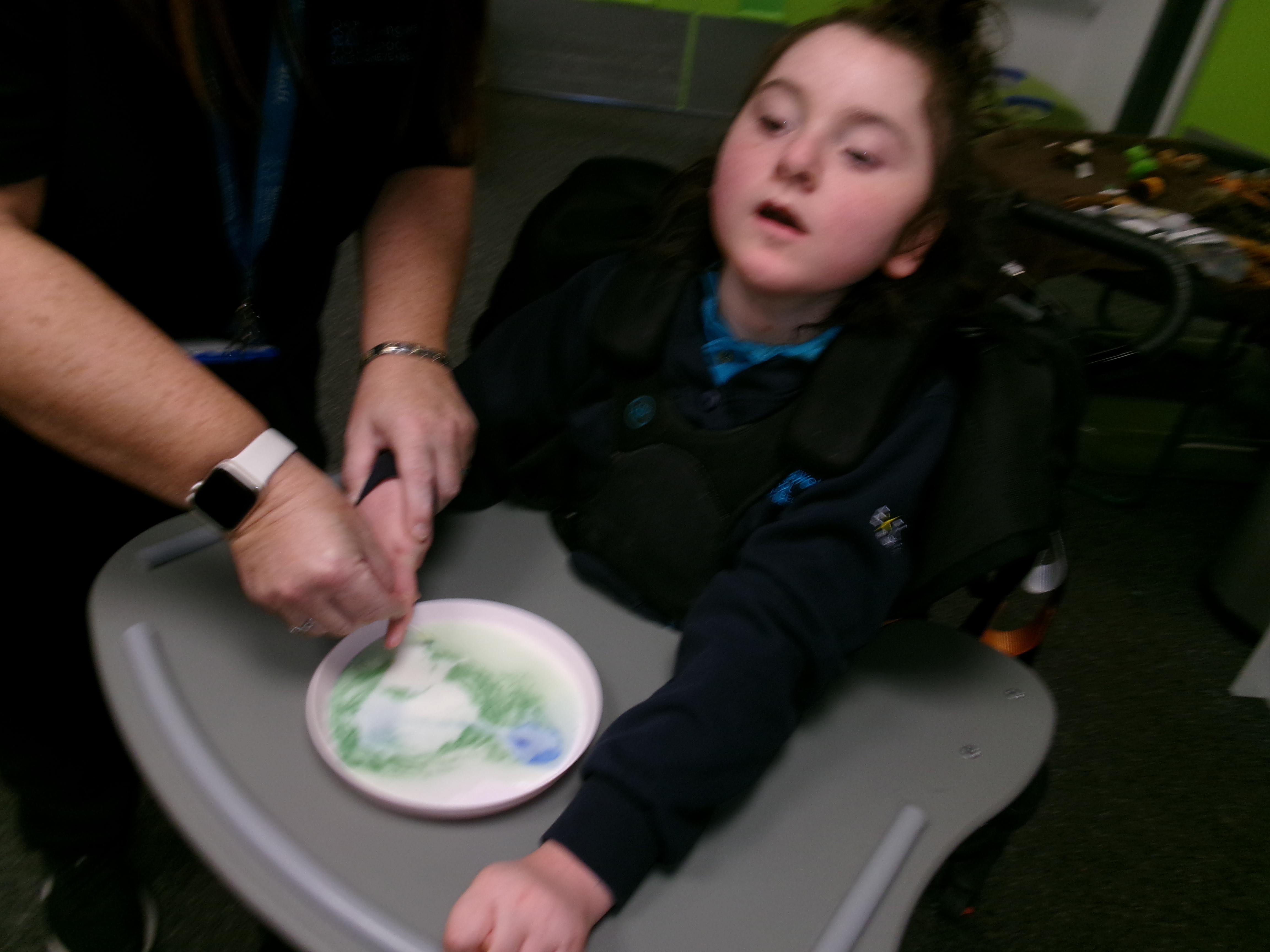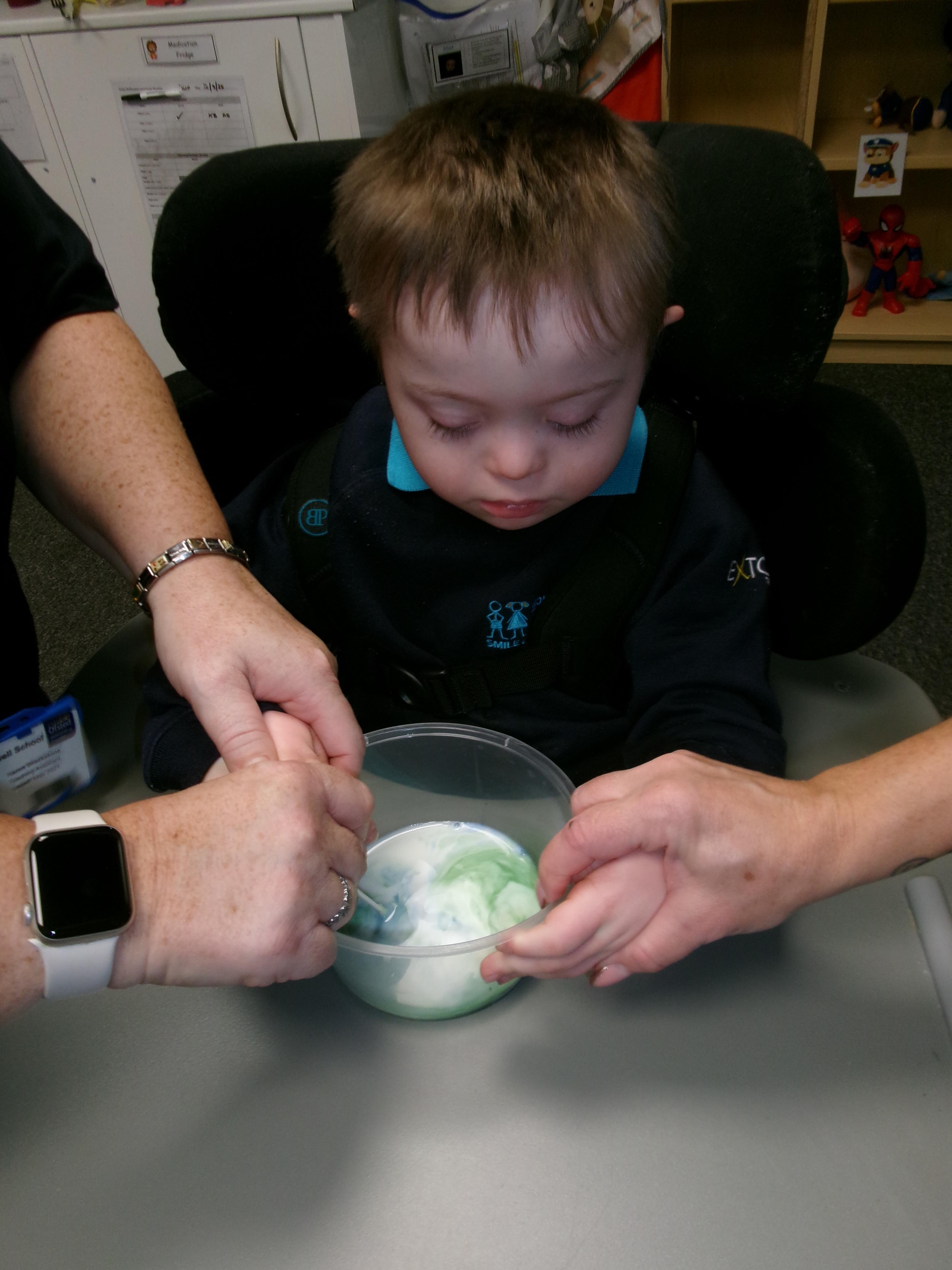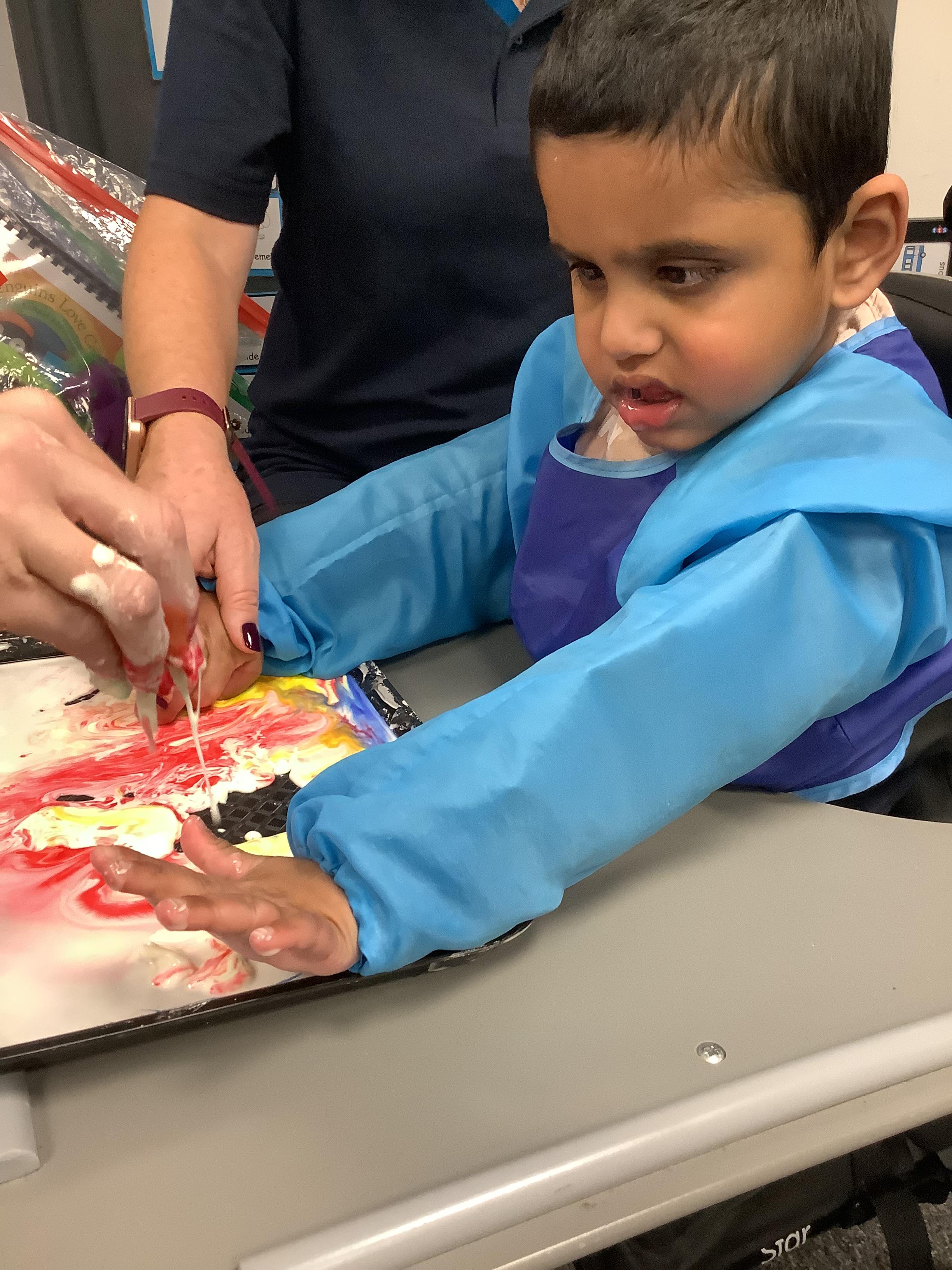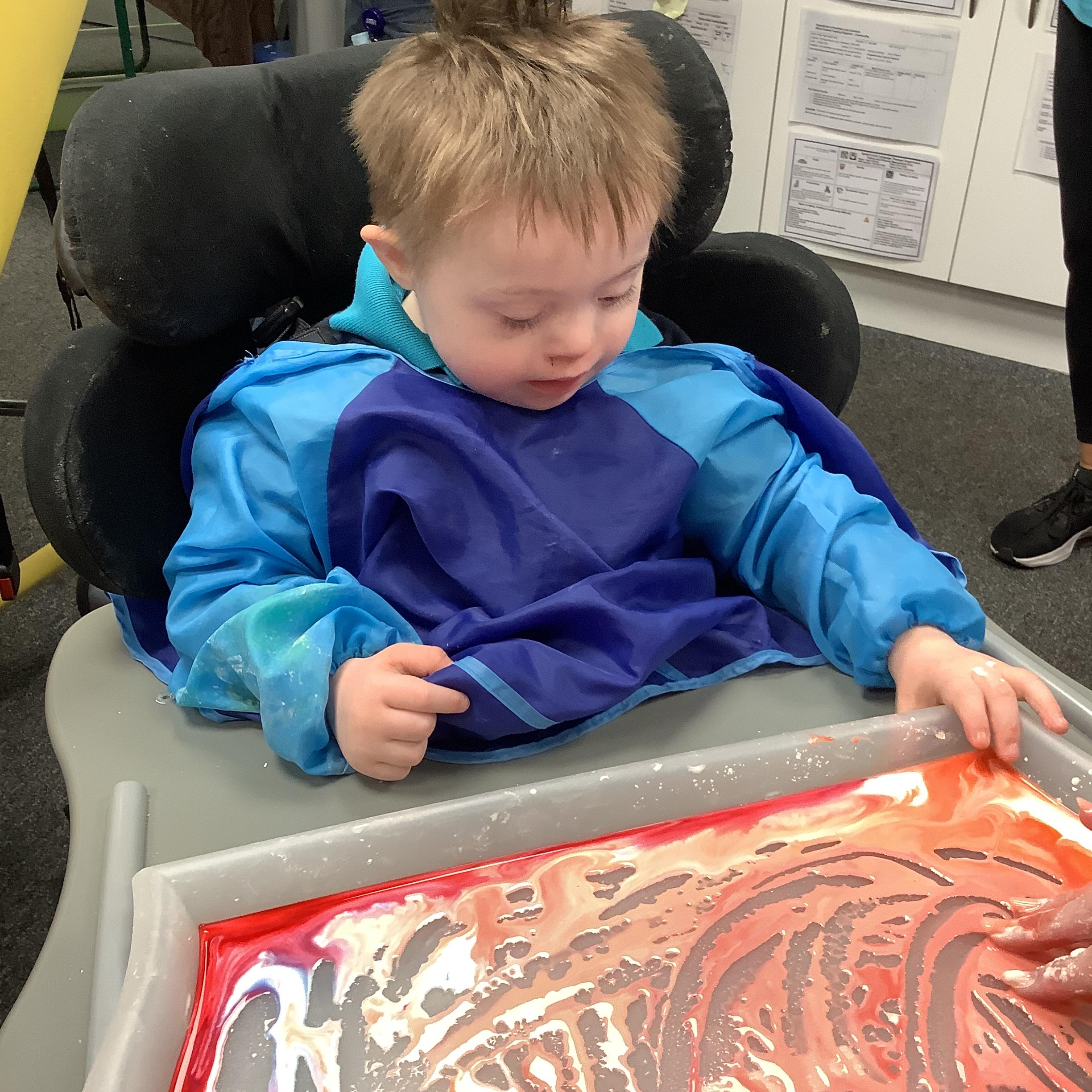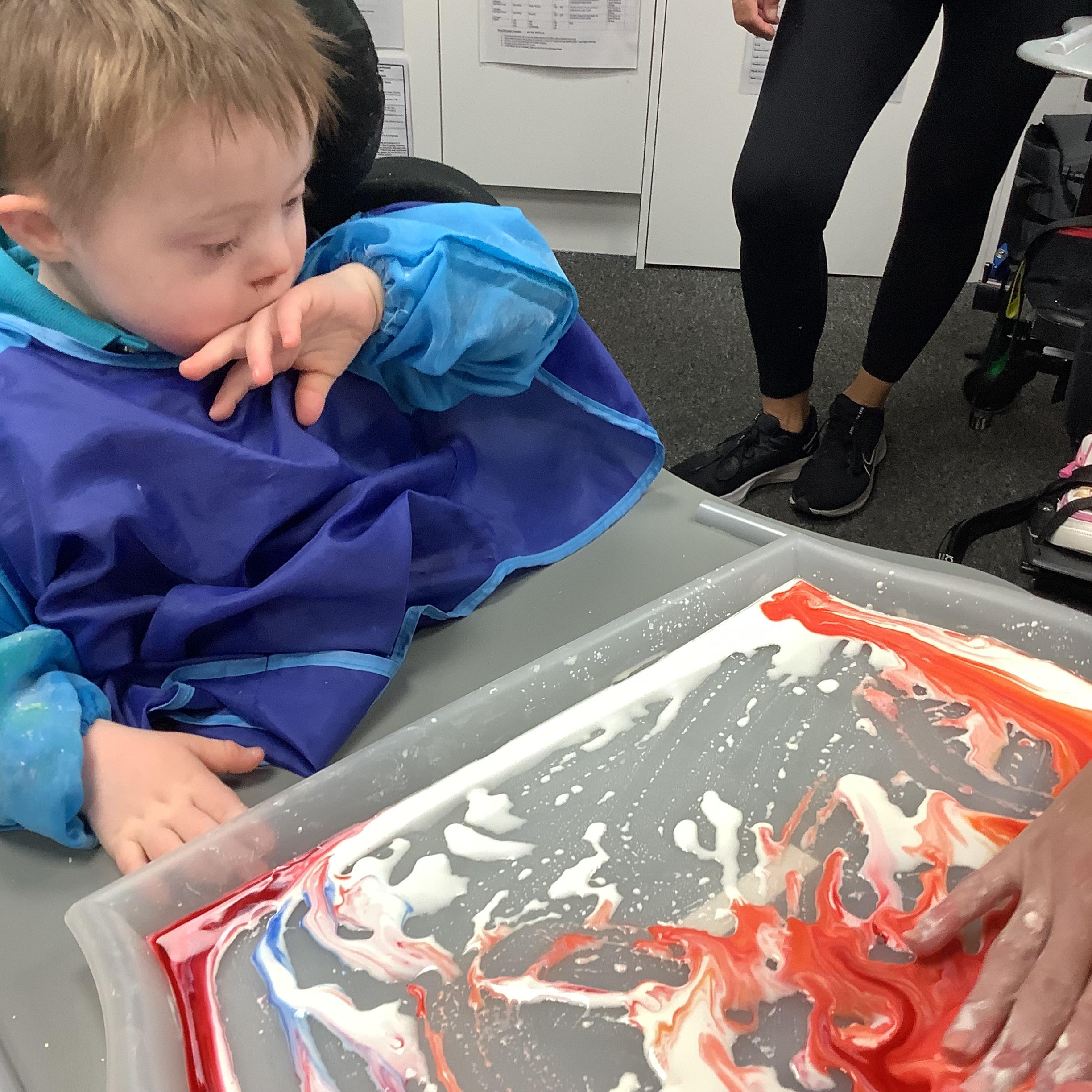 Today we had lots of sensory fun exploring colour mixing with gloop. We used our eye gaze to choose which colours to mix together and used our hands to mix and move the gloop around the tray.