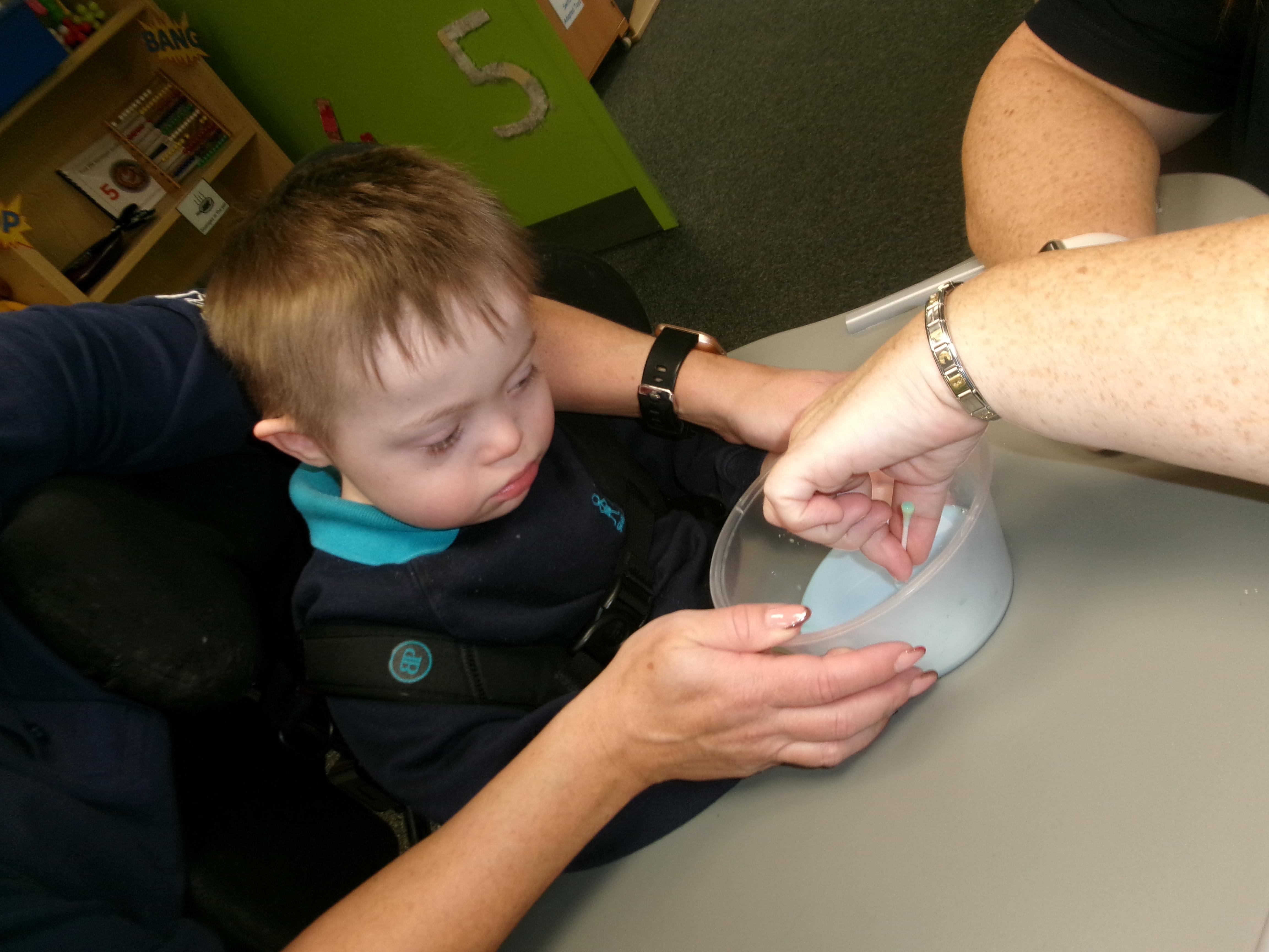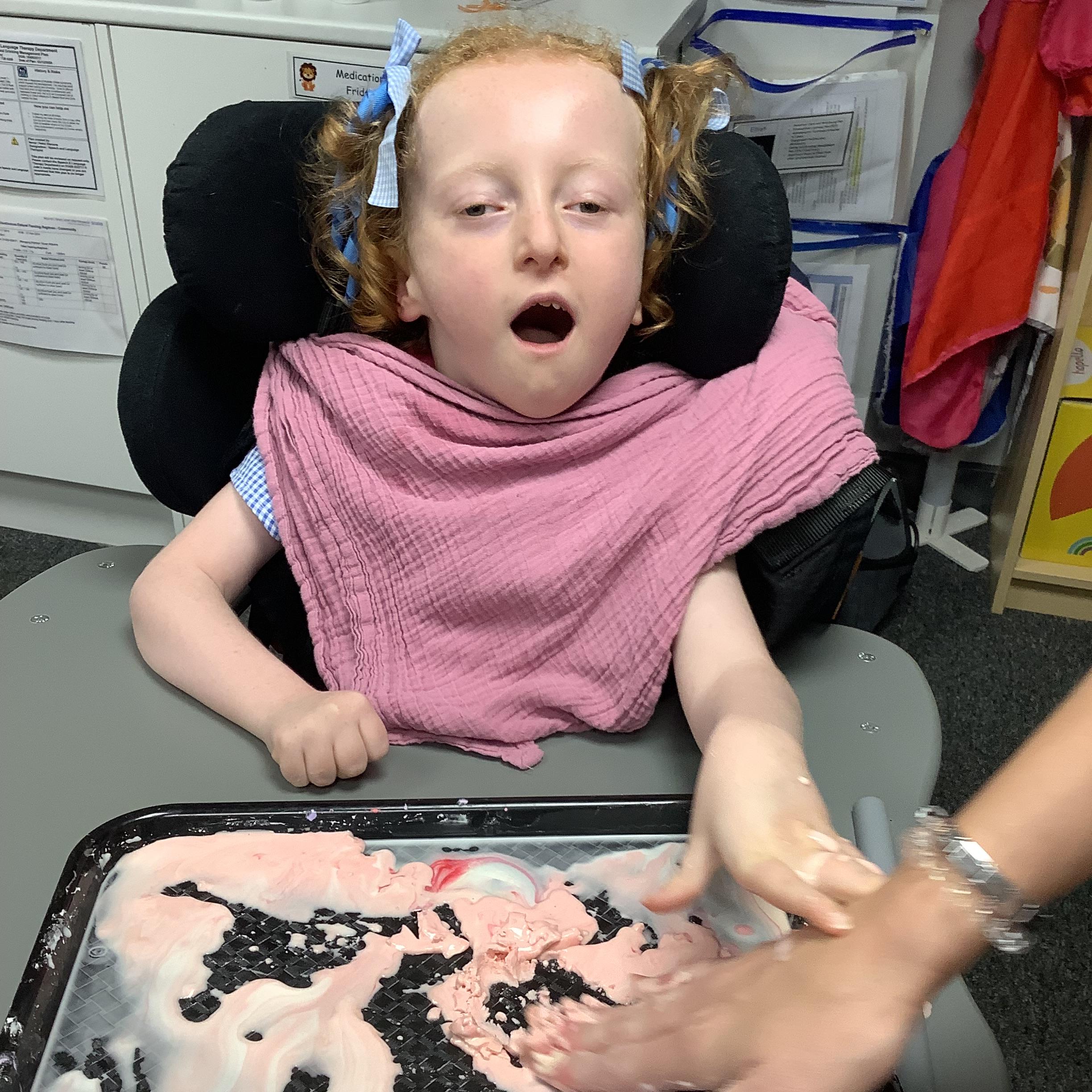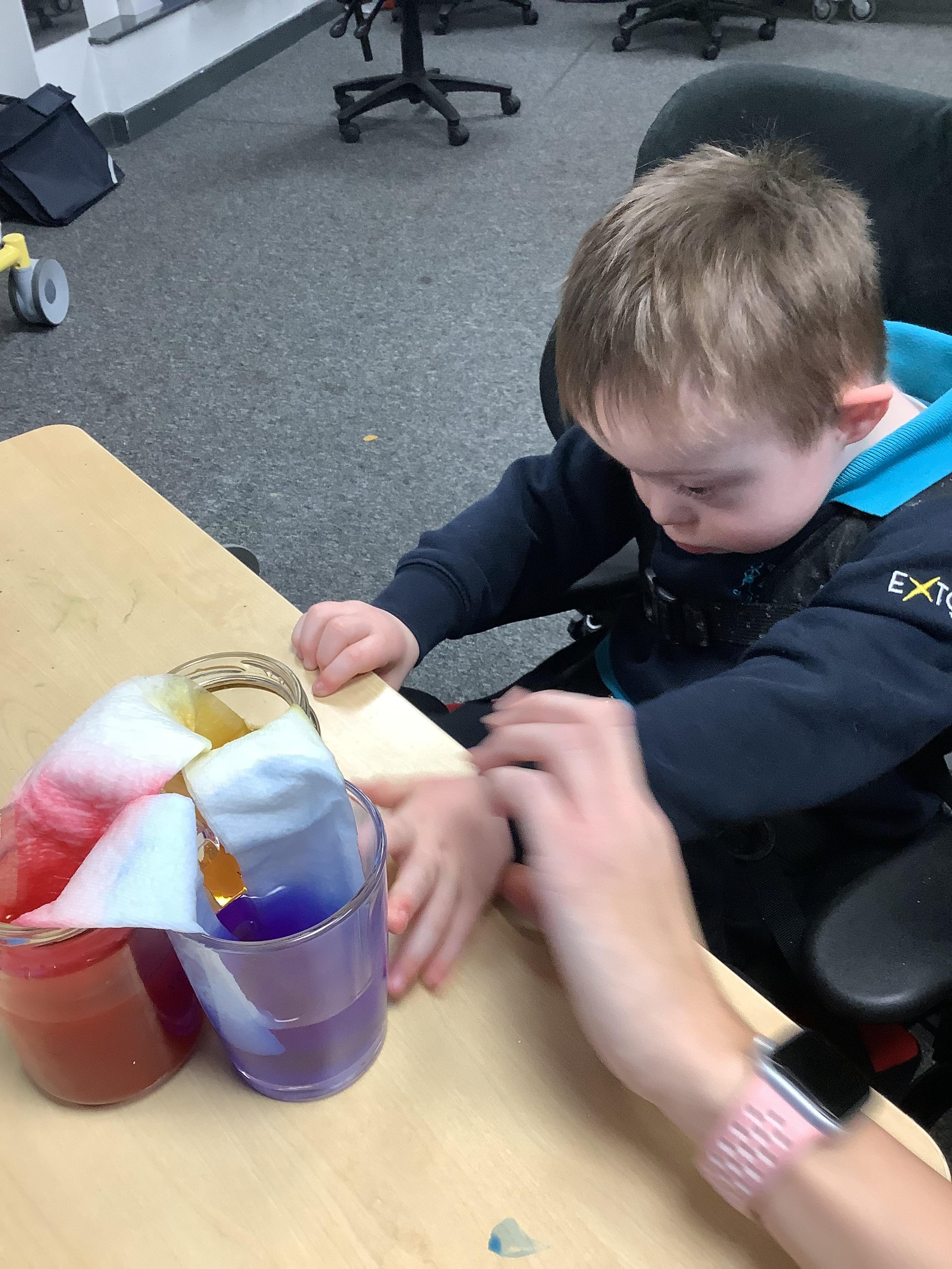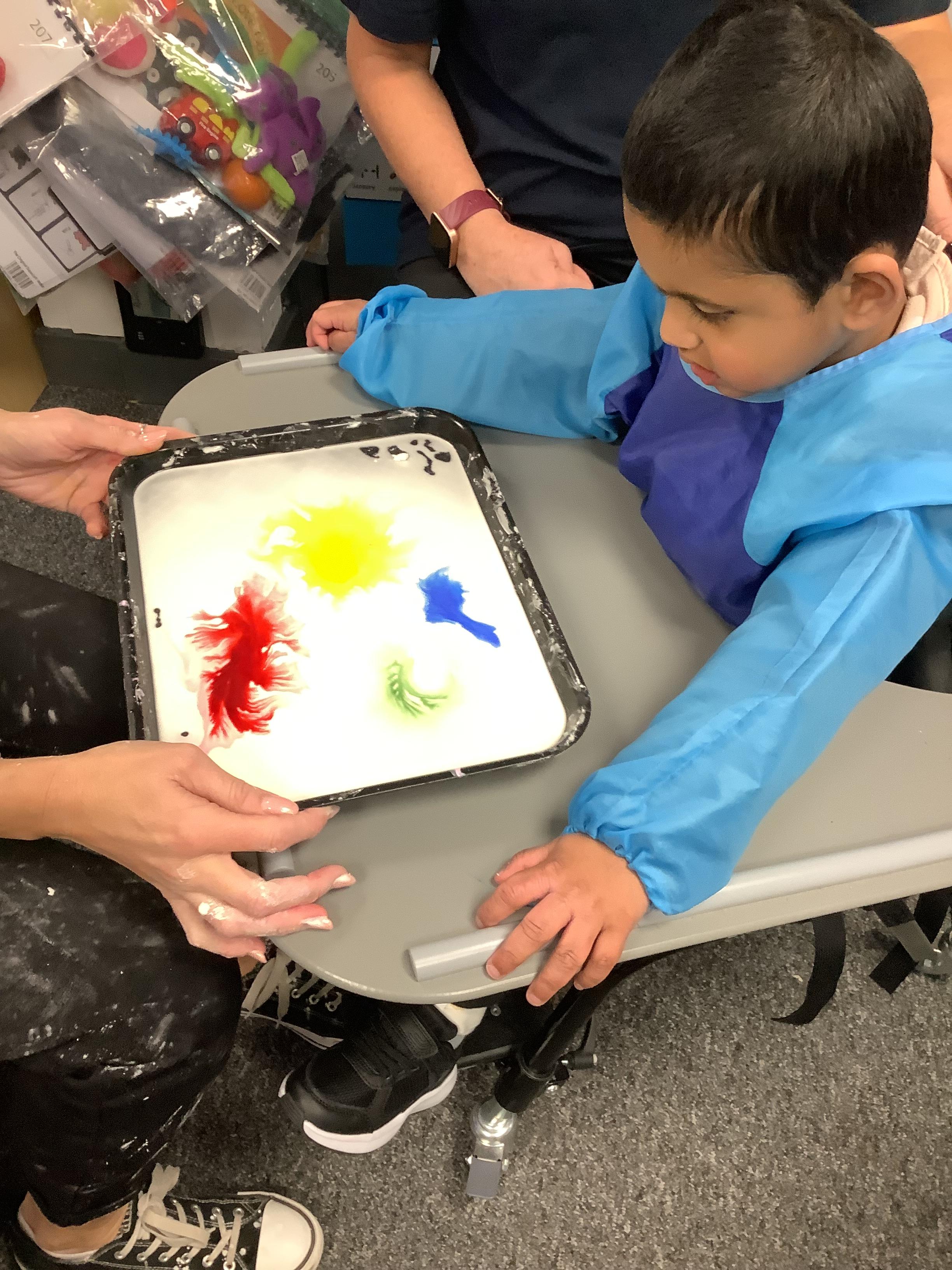 Today we had lots of sensory fun exploring colour mixing with gloop. We used our eye gaze to choose which colours to mix together and used our hands to mix and move the gloop around the tray.