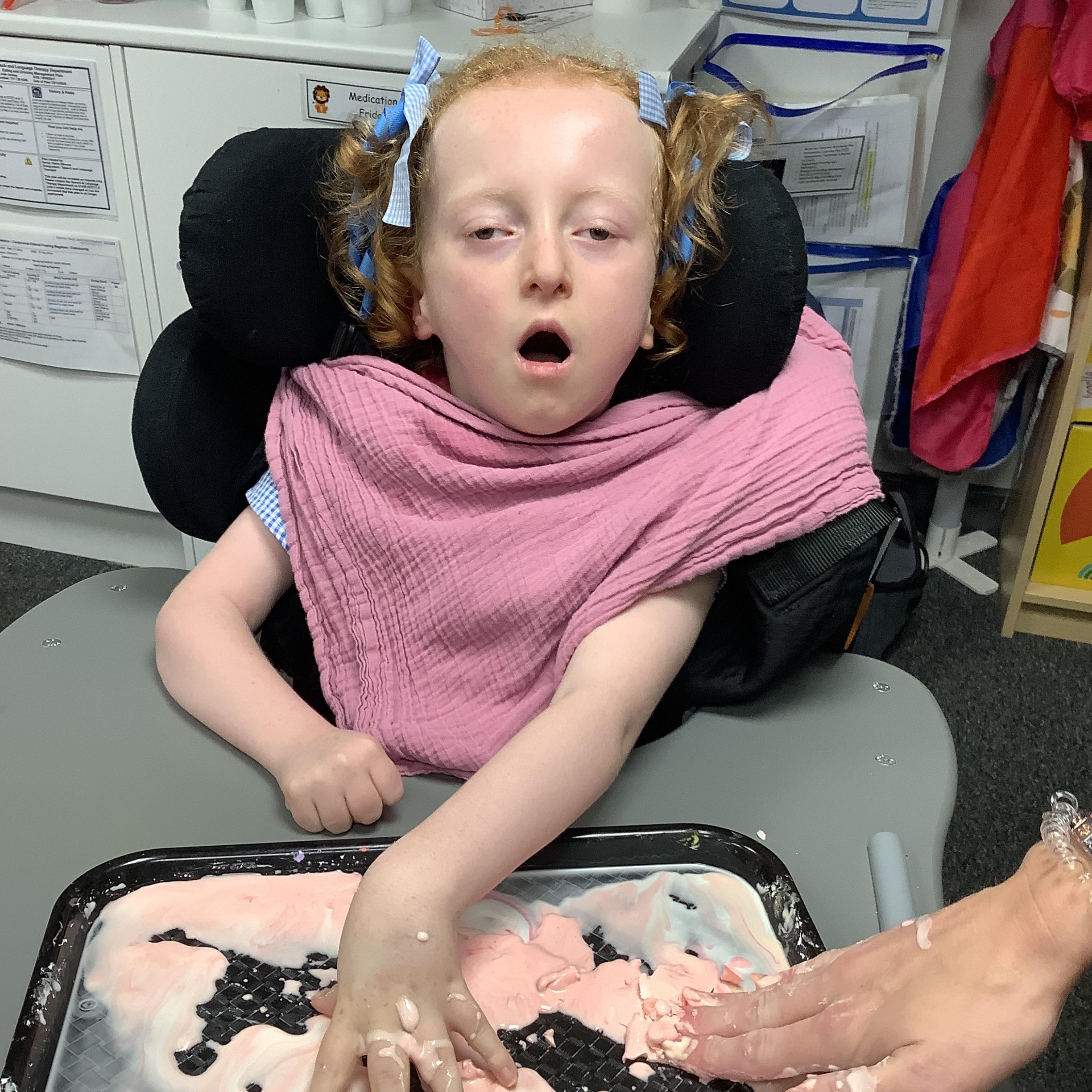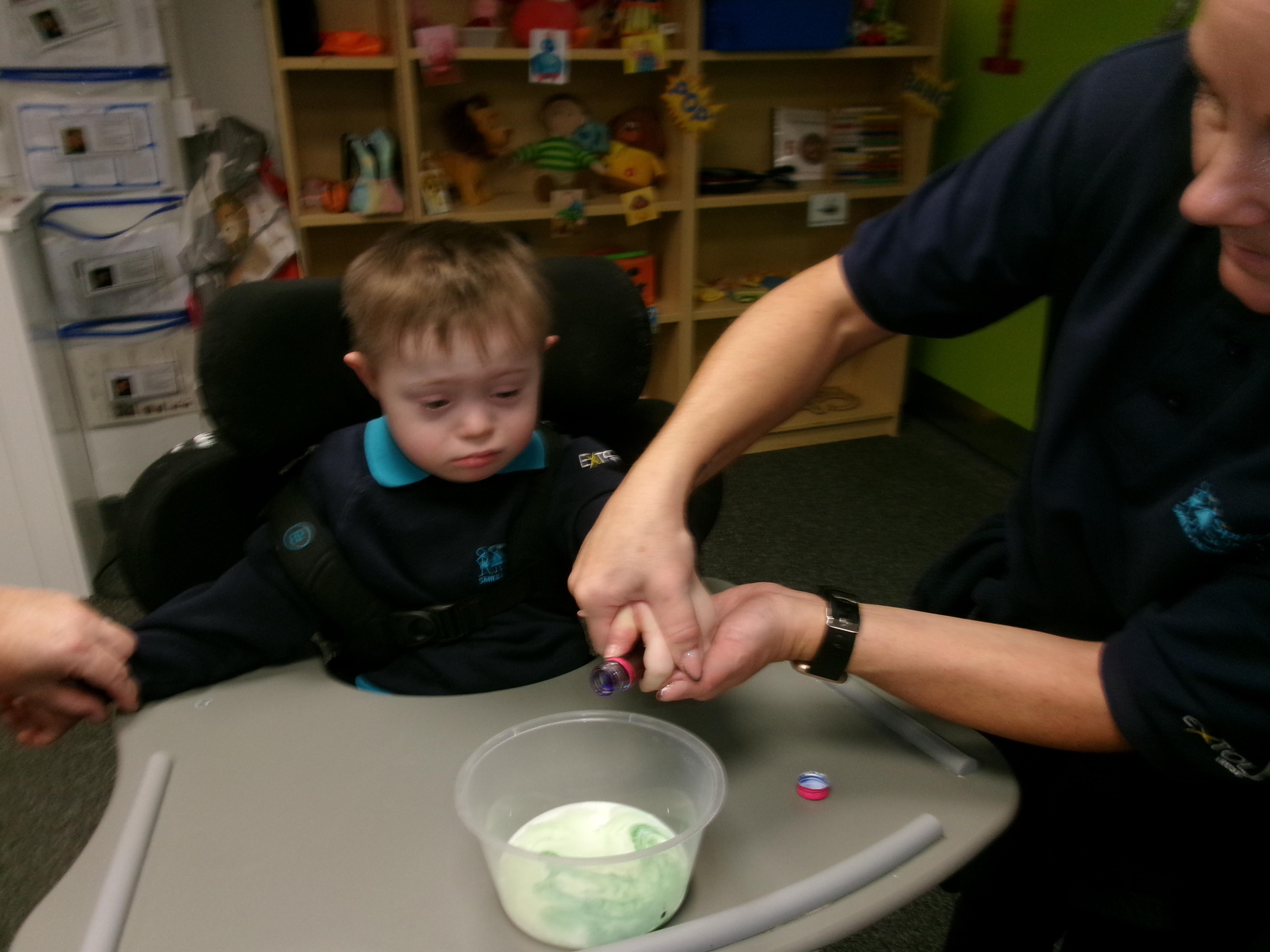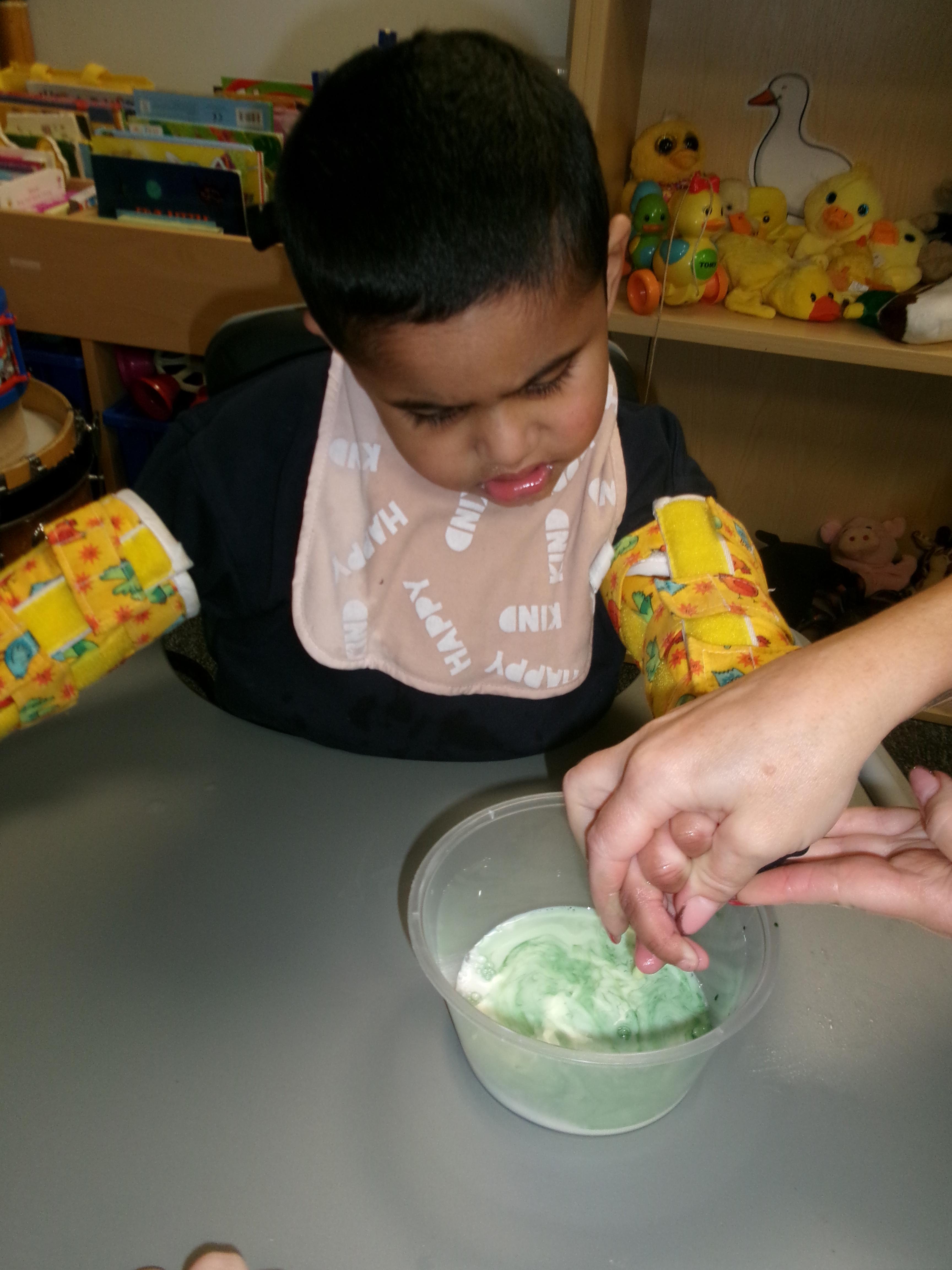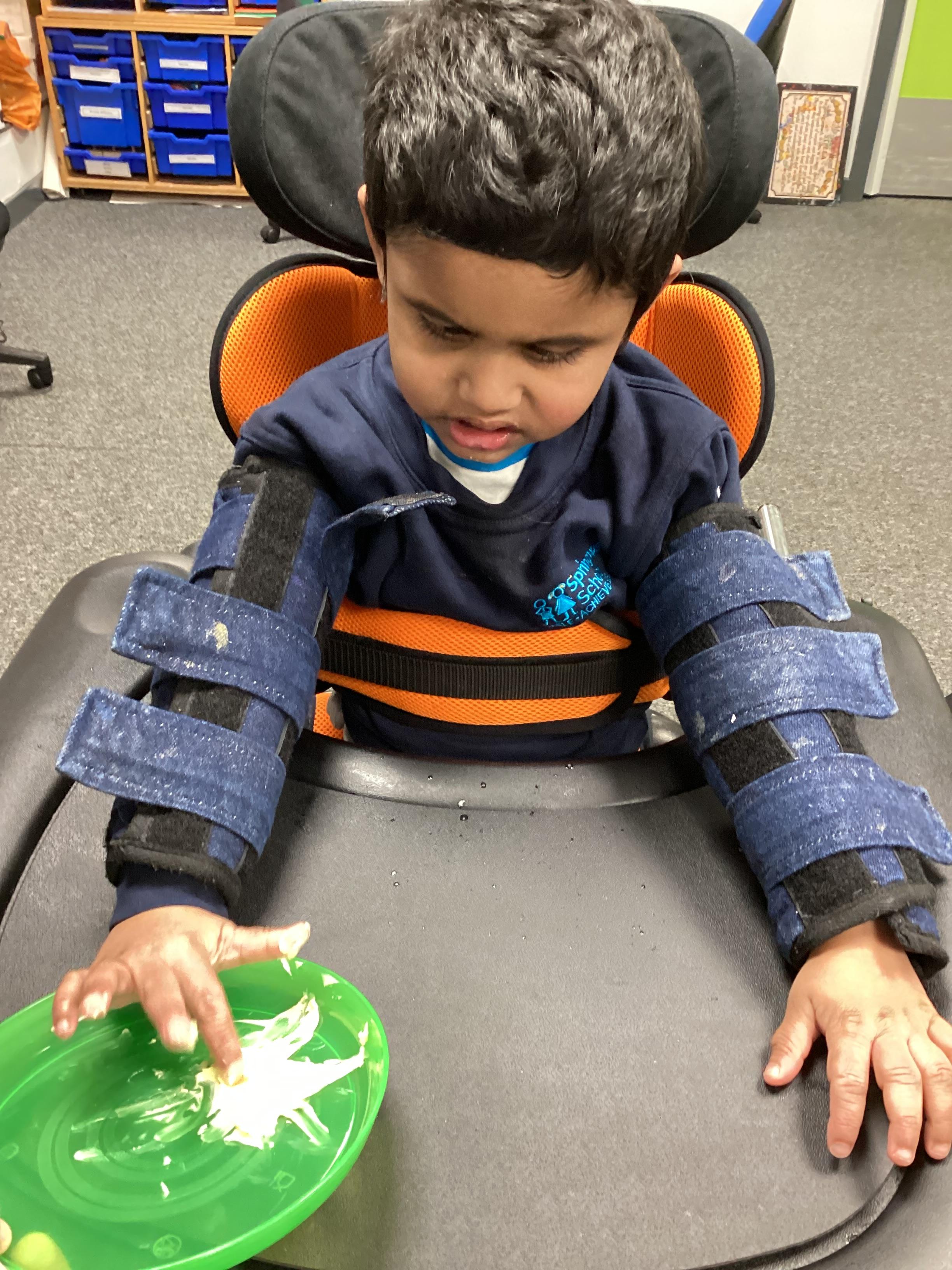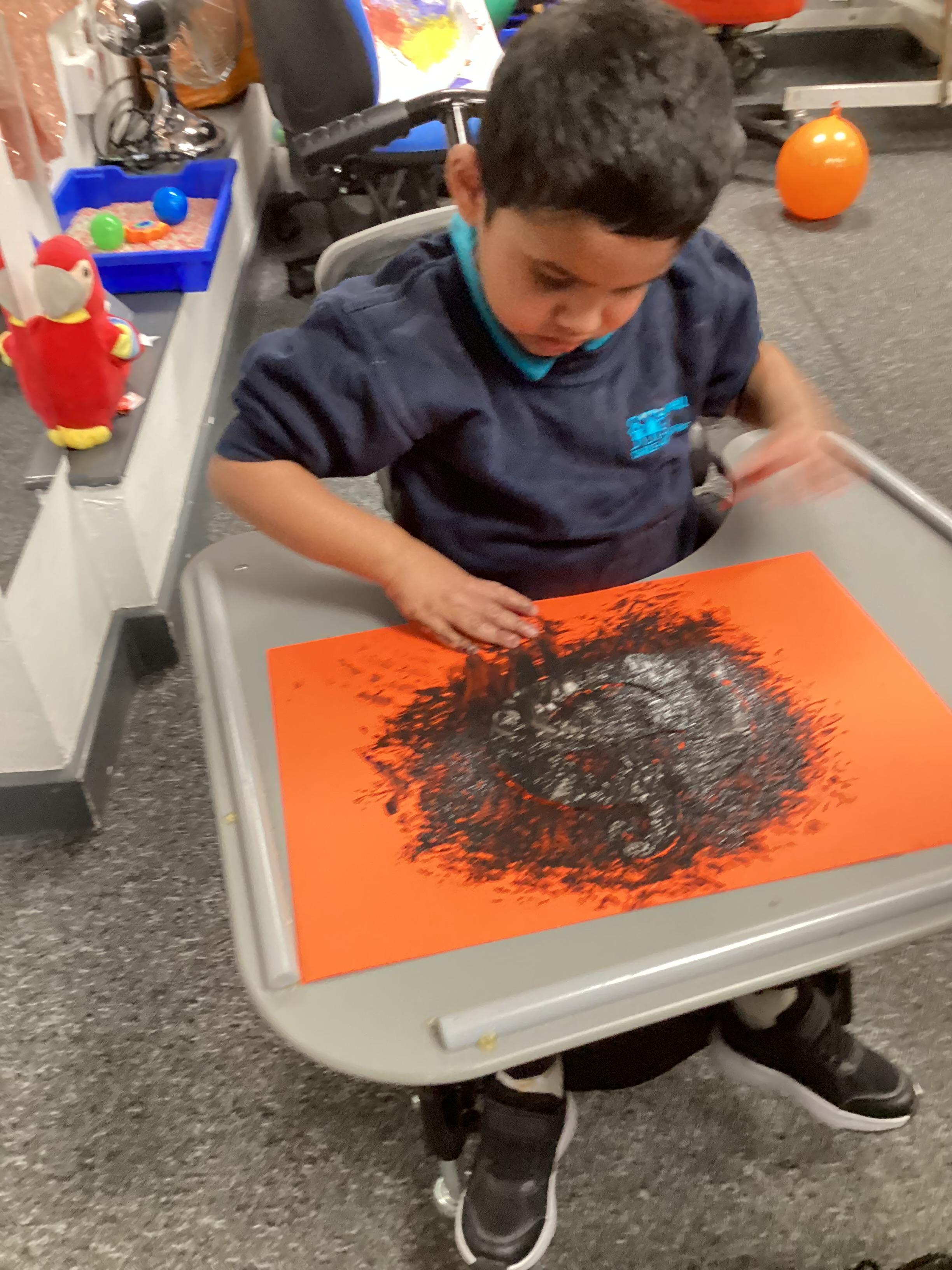 Today we had lots of sensory fun exploring colour mixing with gloop. We used our eye gaze to choose which colours to mix together and used our hands to mix and move the gloop around the tray.
