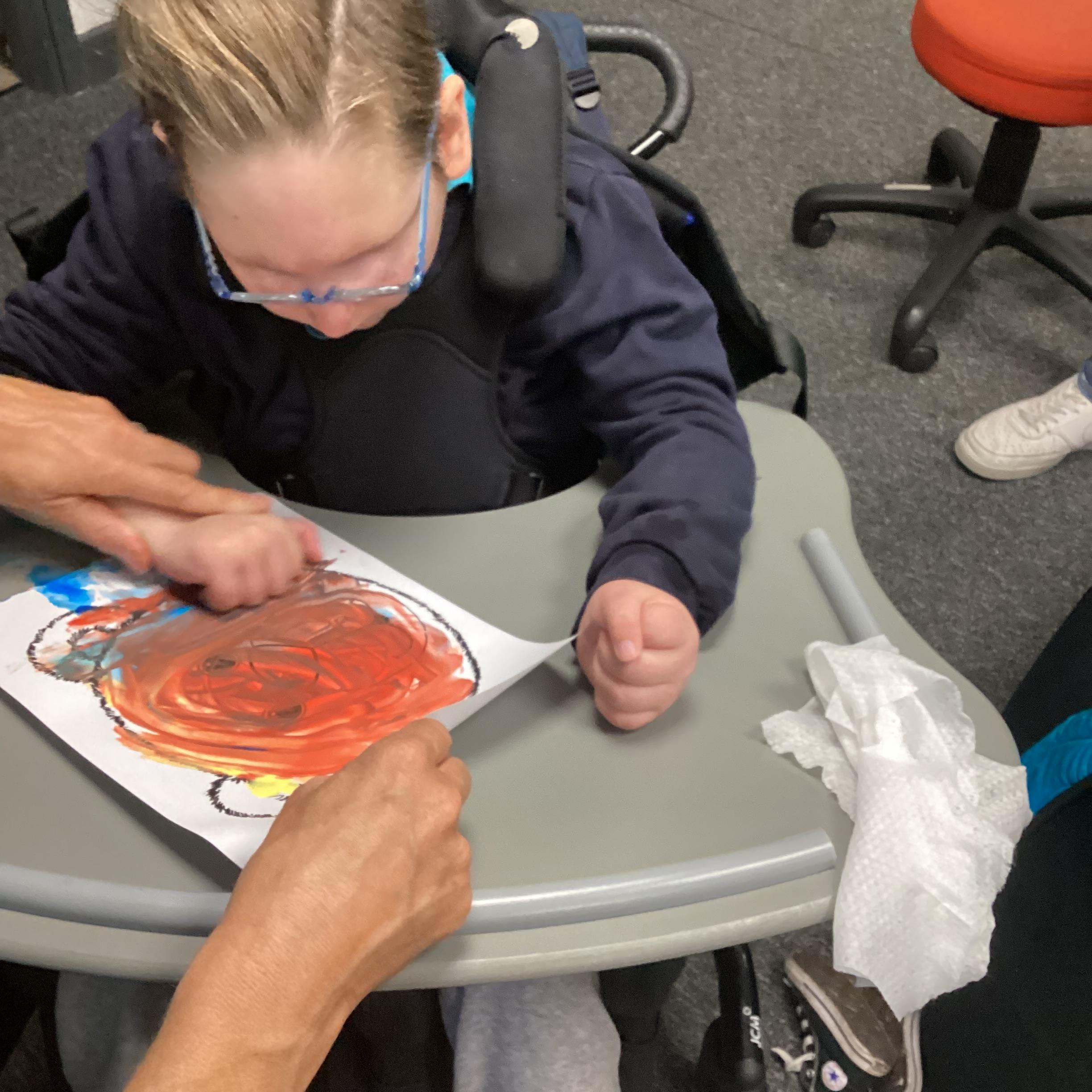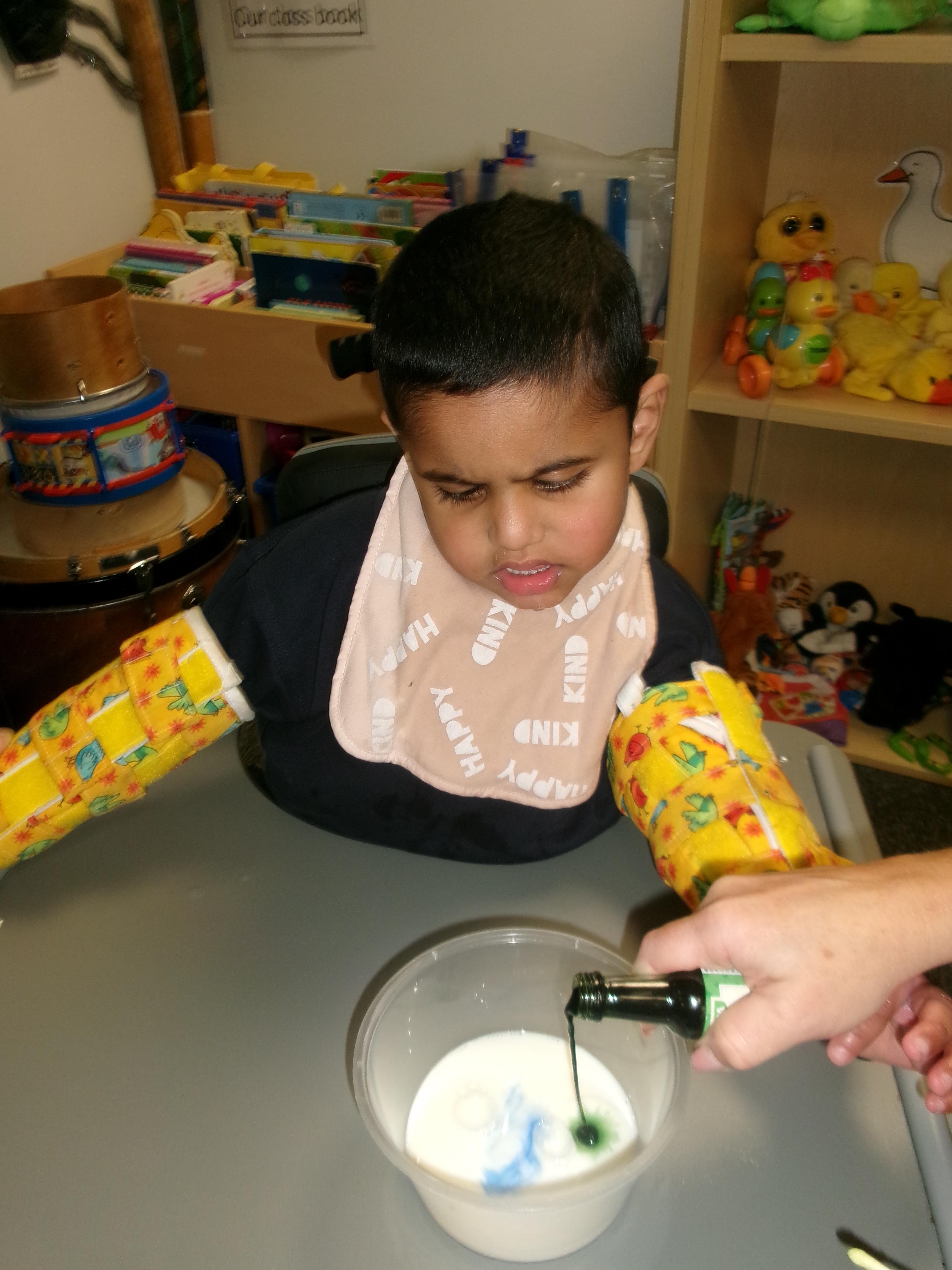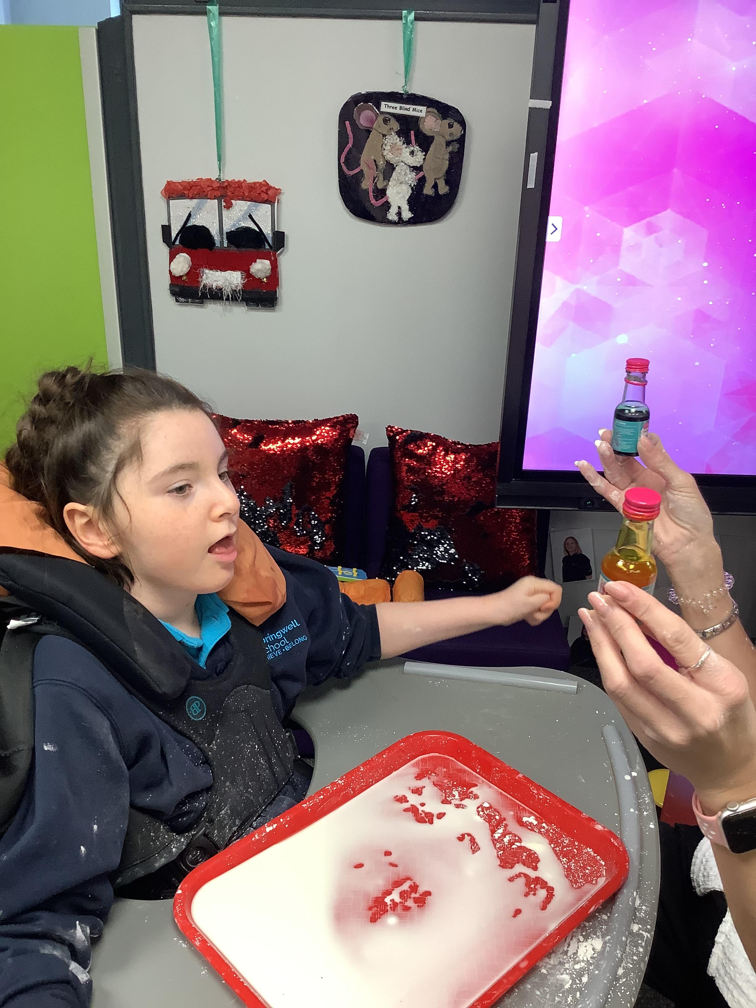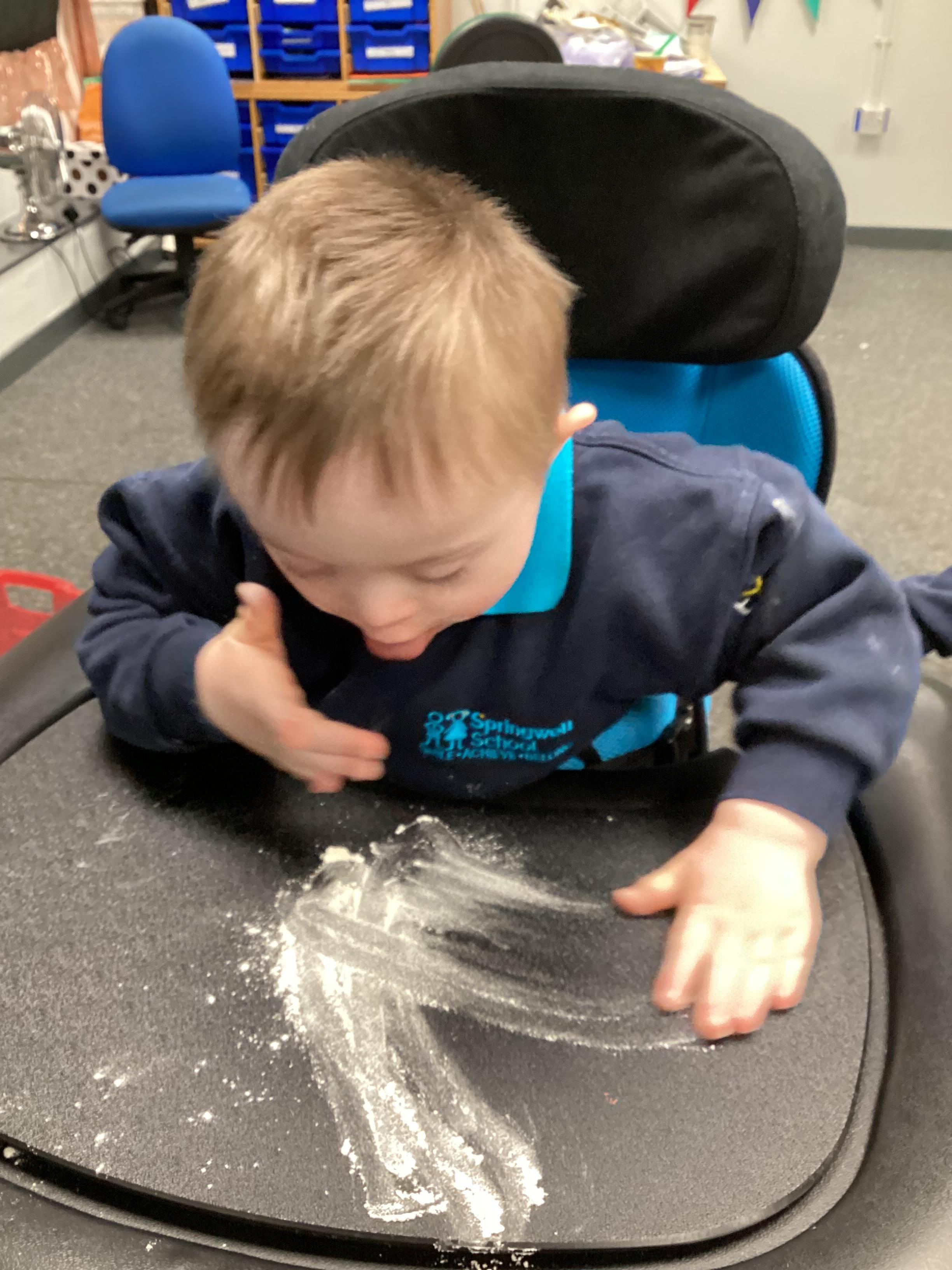 Today we had lots of sensory fun exploring colour mixing with gloop. We used our eye gaze to choose which colours to mix together and used our hands to mix and move the gloop around the tray.