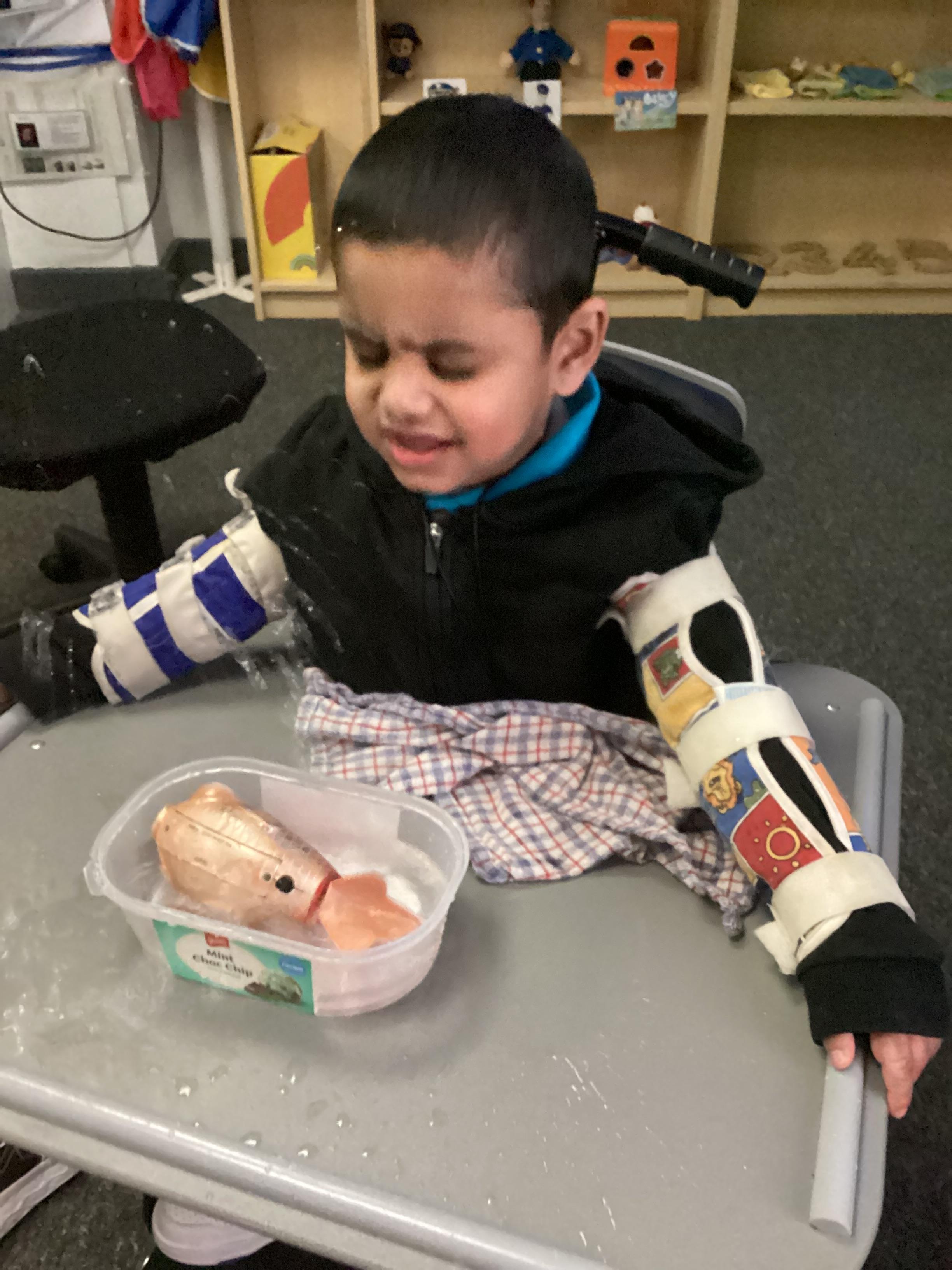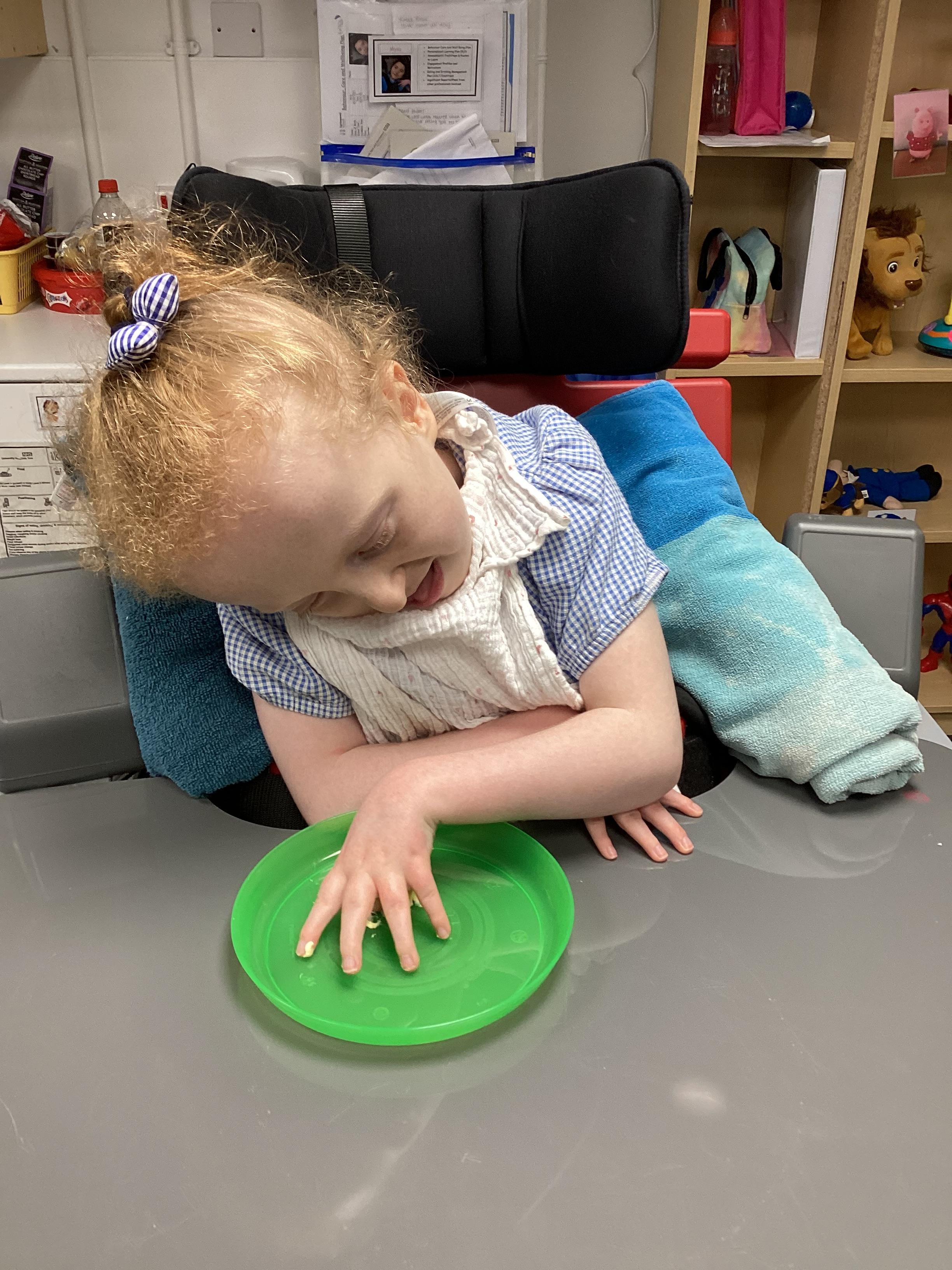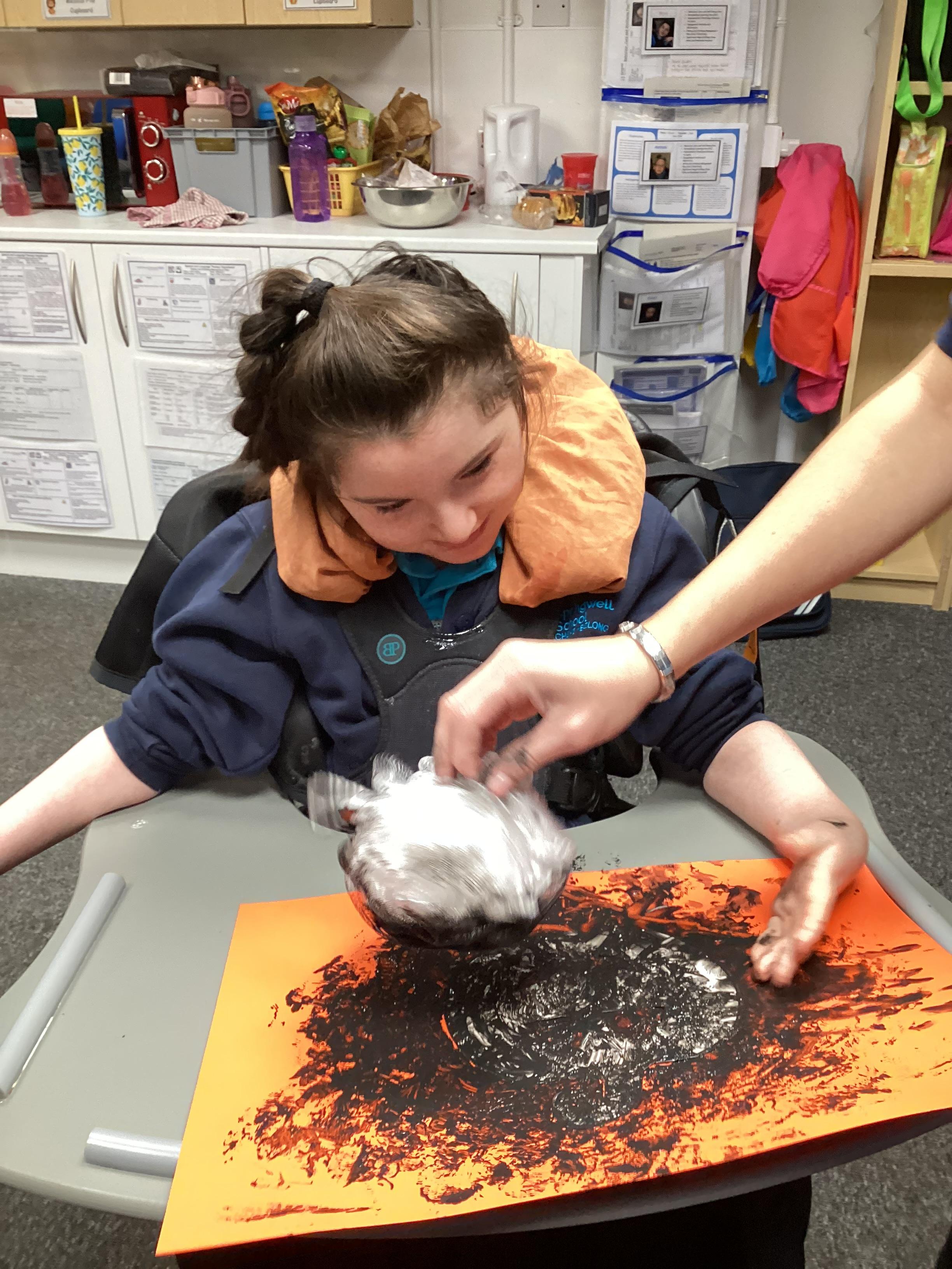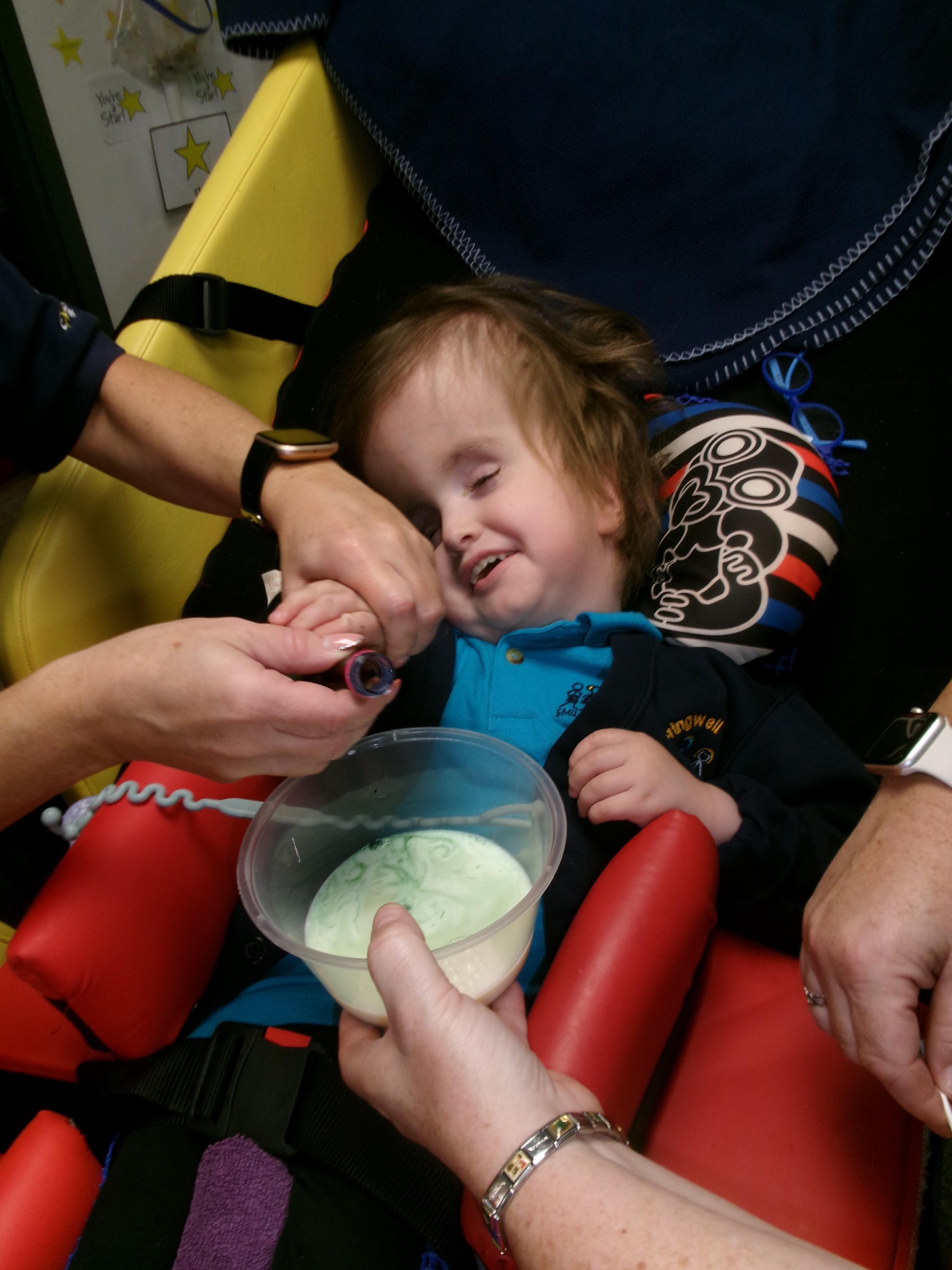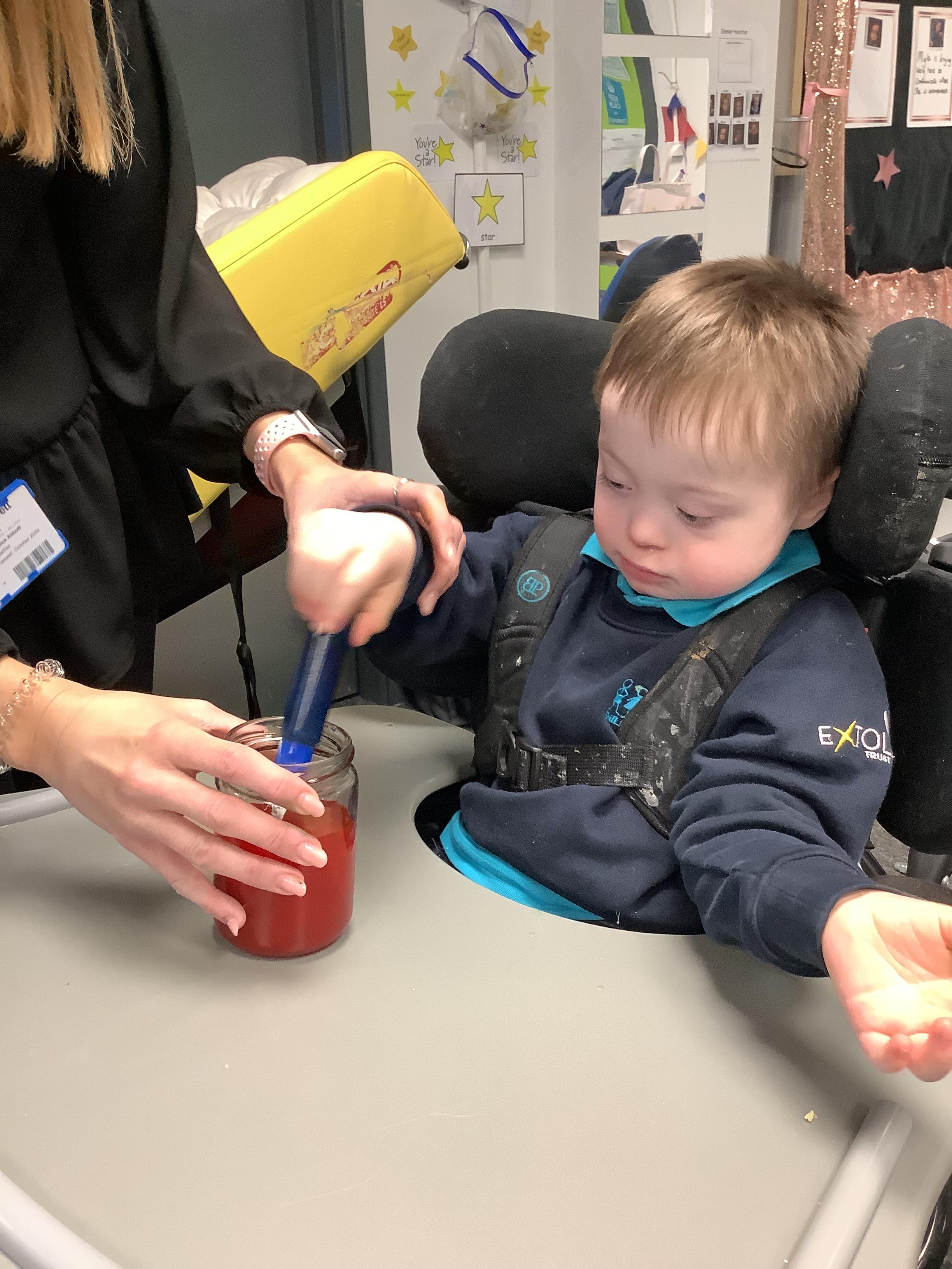 Today we had lots of sensory fun exploring colour mixing with gloop. We used our eye gaze to choose which colours to mix together and used our hands to mix and move the gloop around the tray.
