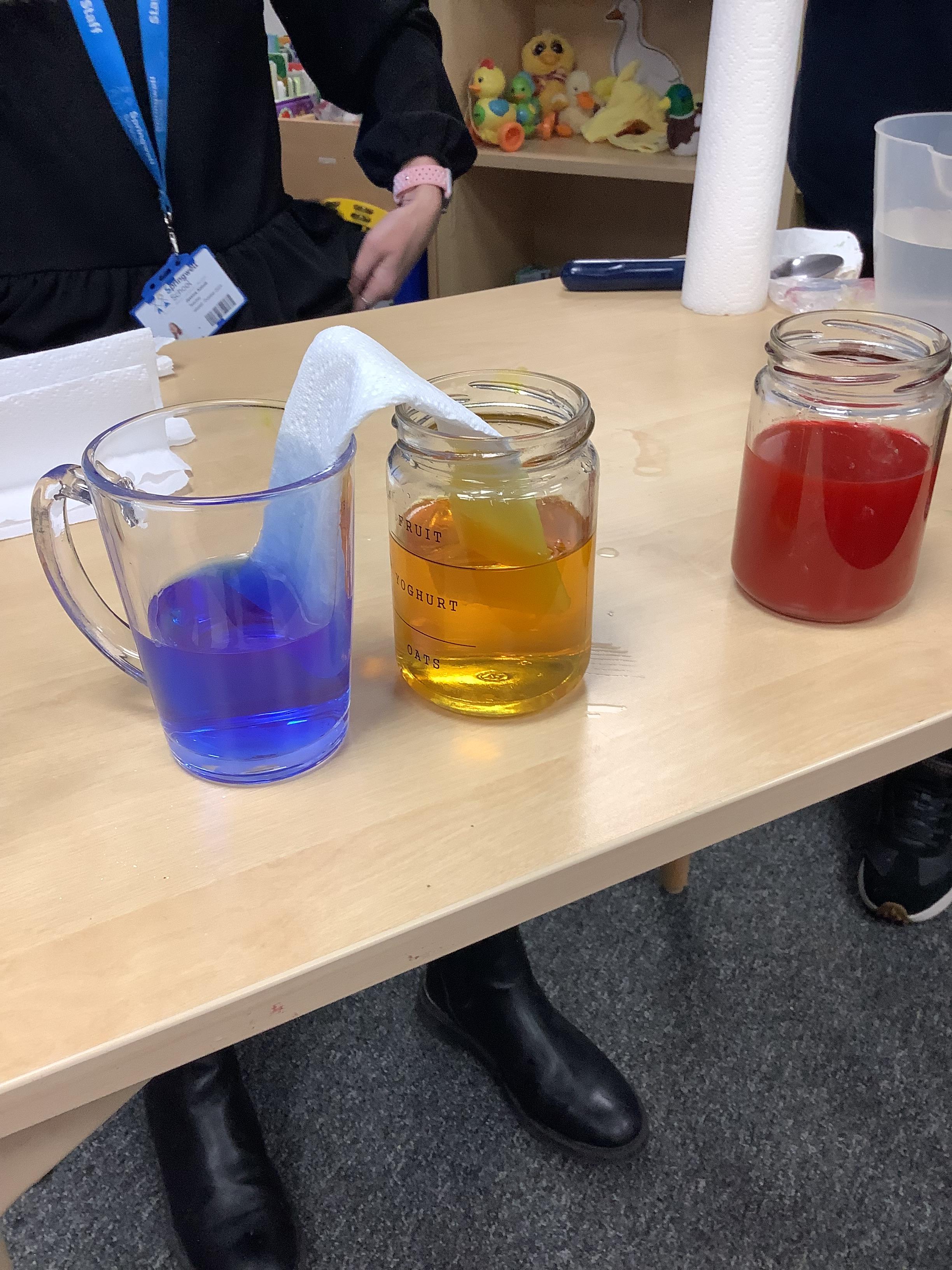 As part of our topic of 'Colour' we wanted to try the 'walking water' experiment. We used red, yellow and blue food colouring with kitchen roll. We watched as the coloured water was soaked up through the kitchen roll and the colours began to mix, making new colours!
