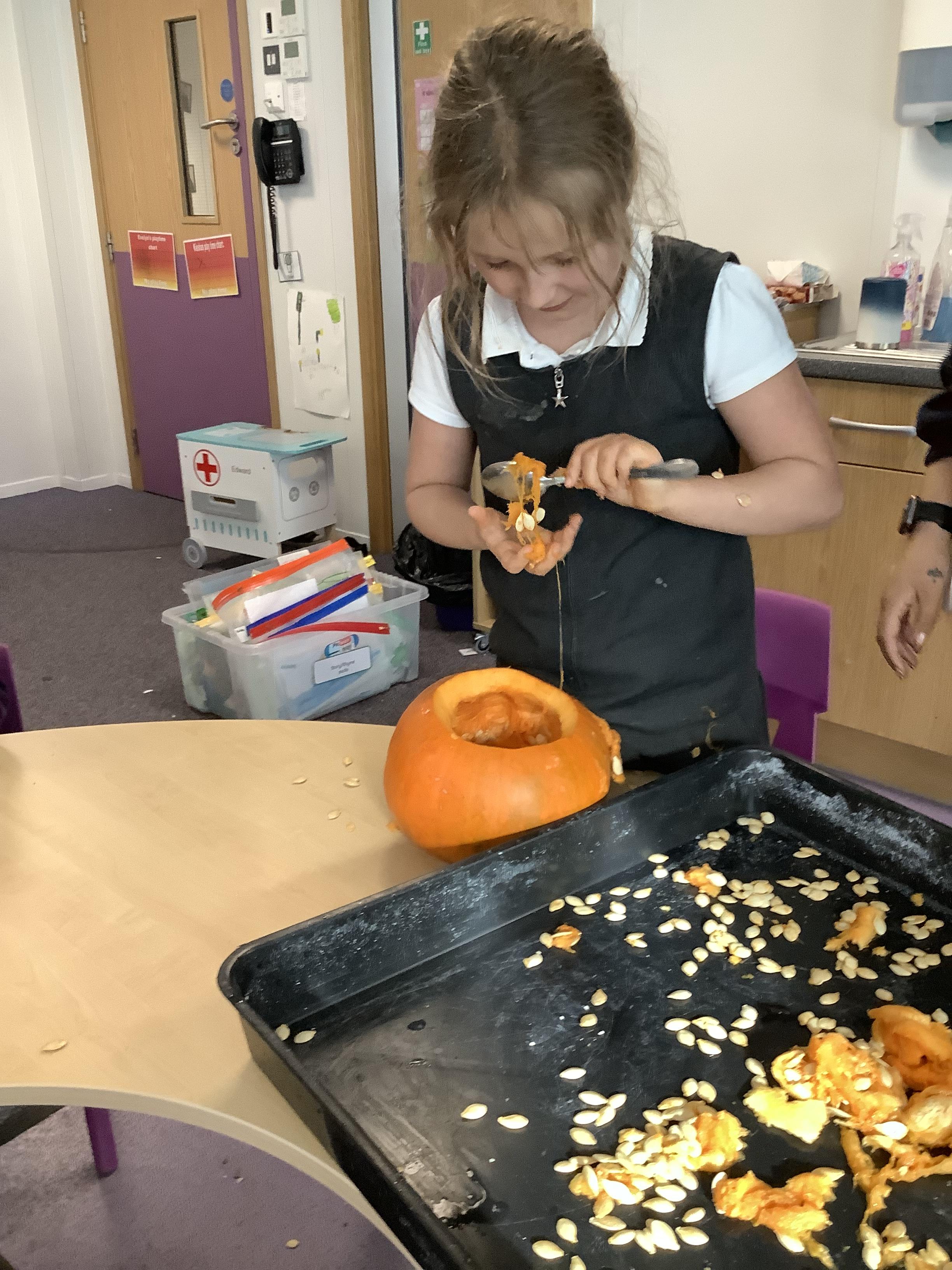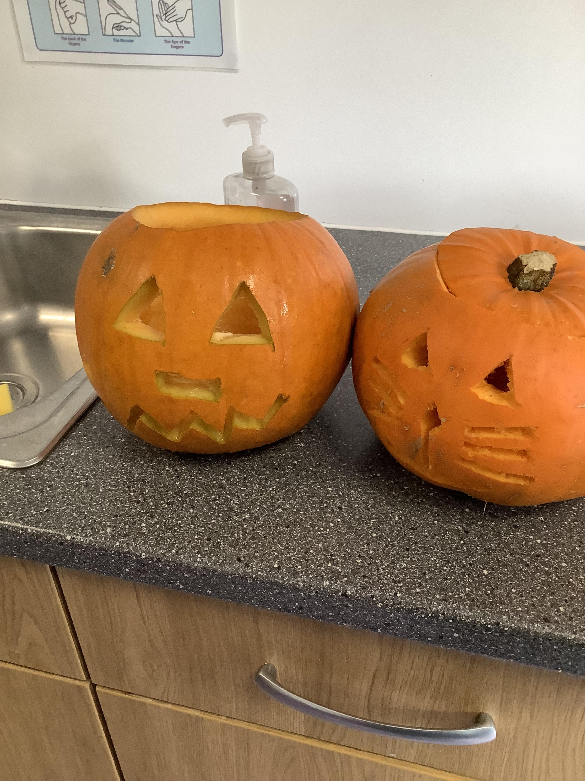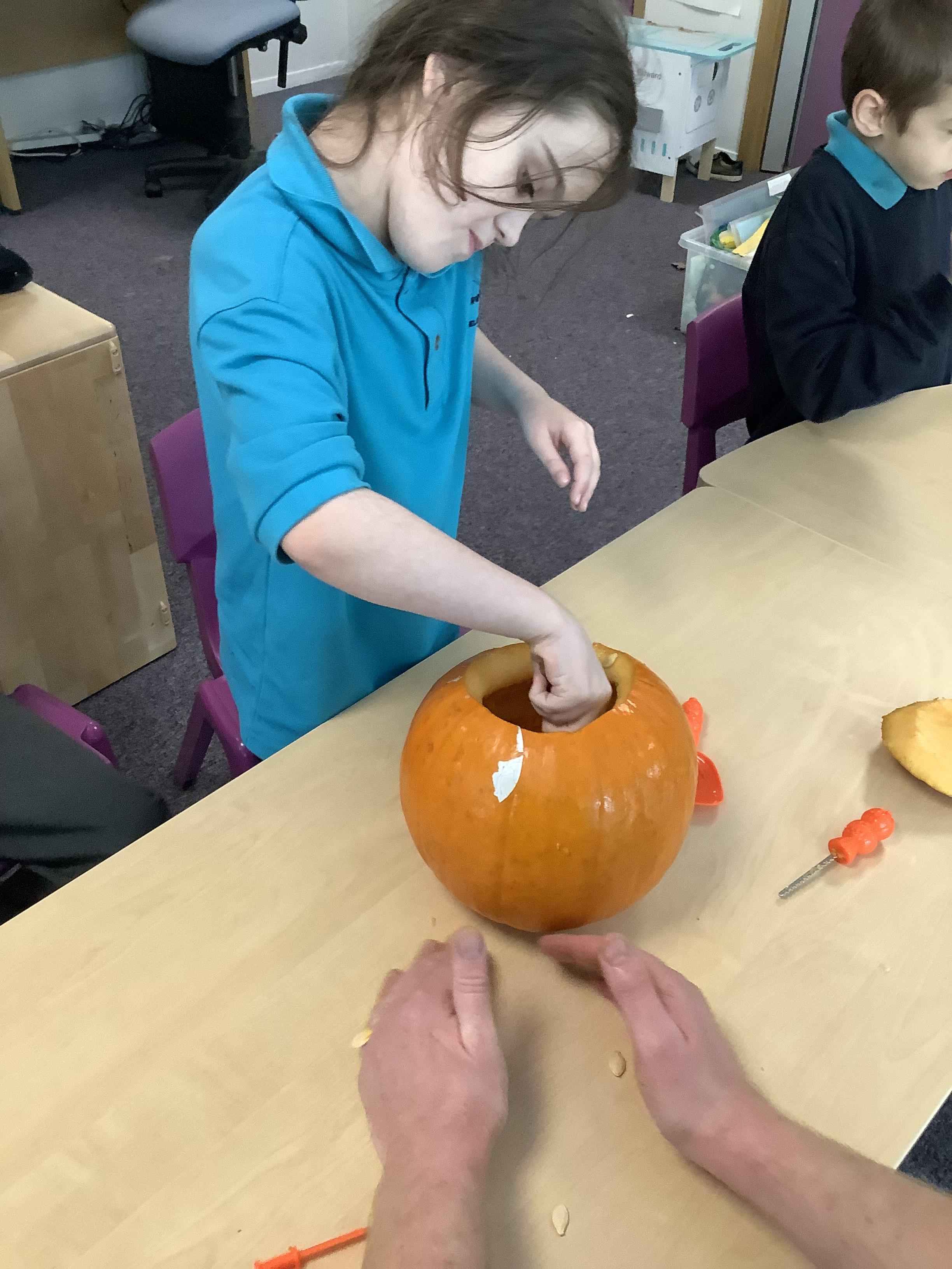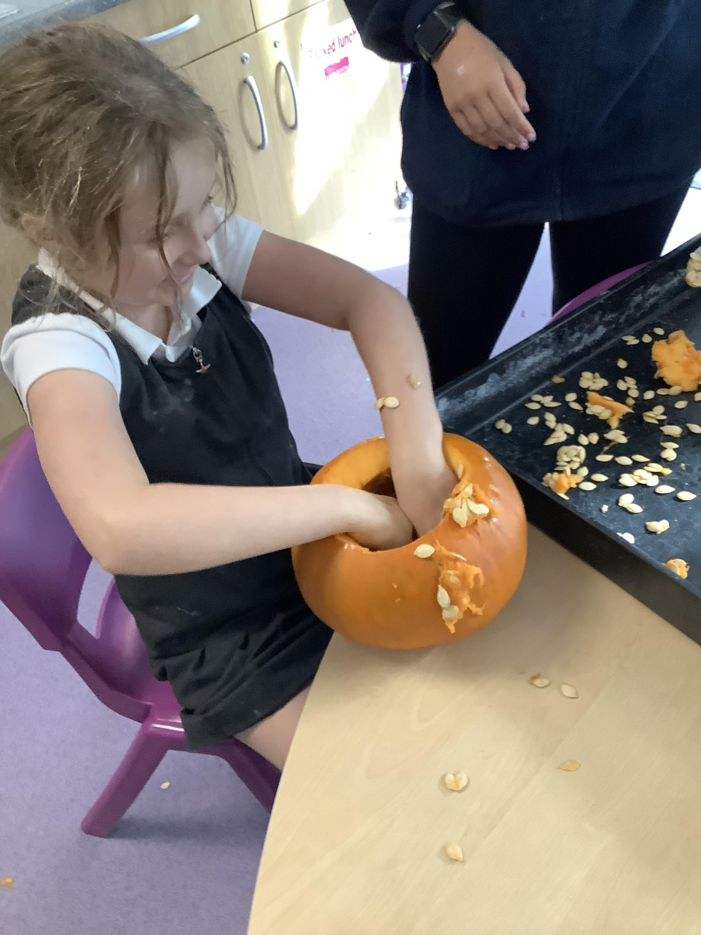 Today we had a trip to the shops to buy pumpkins. We then came back to class and carved them out. It got very messy, we had so much fun!