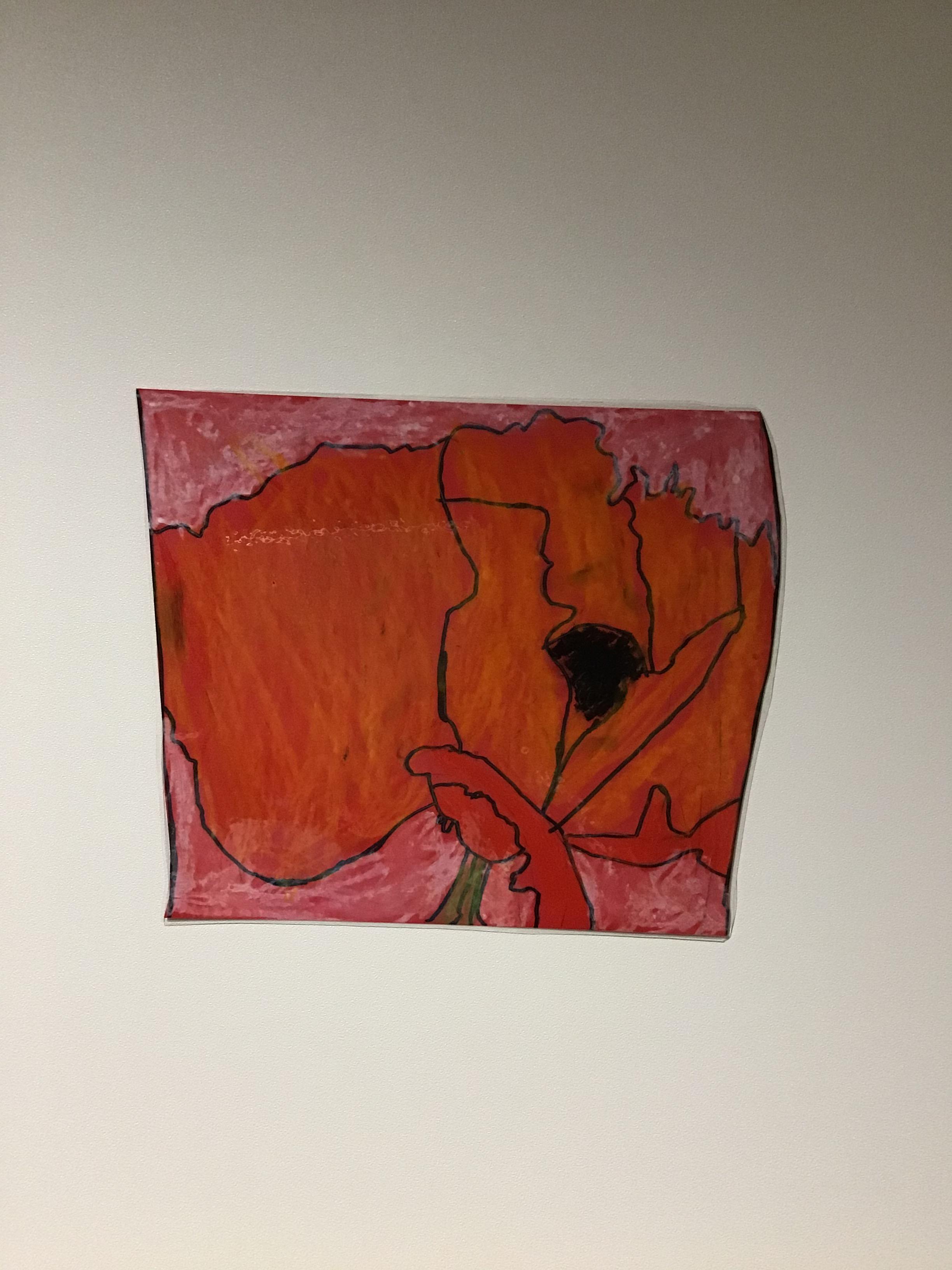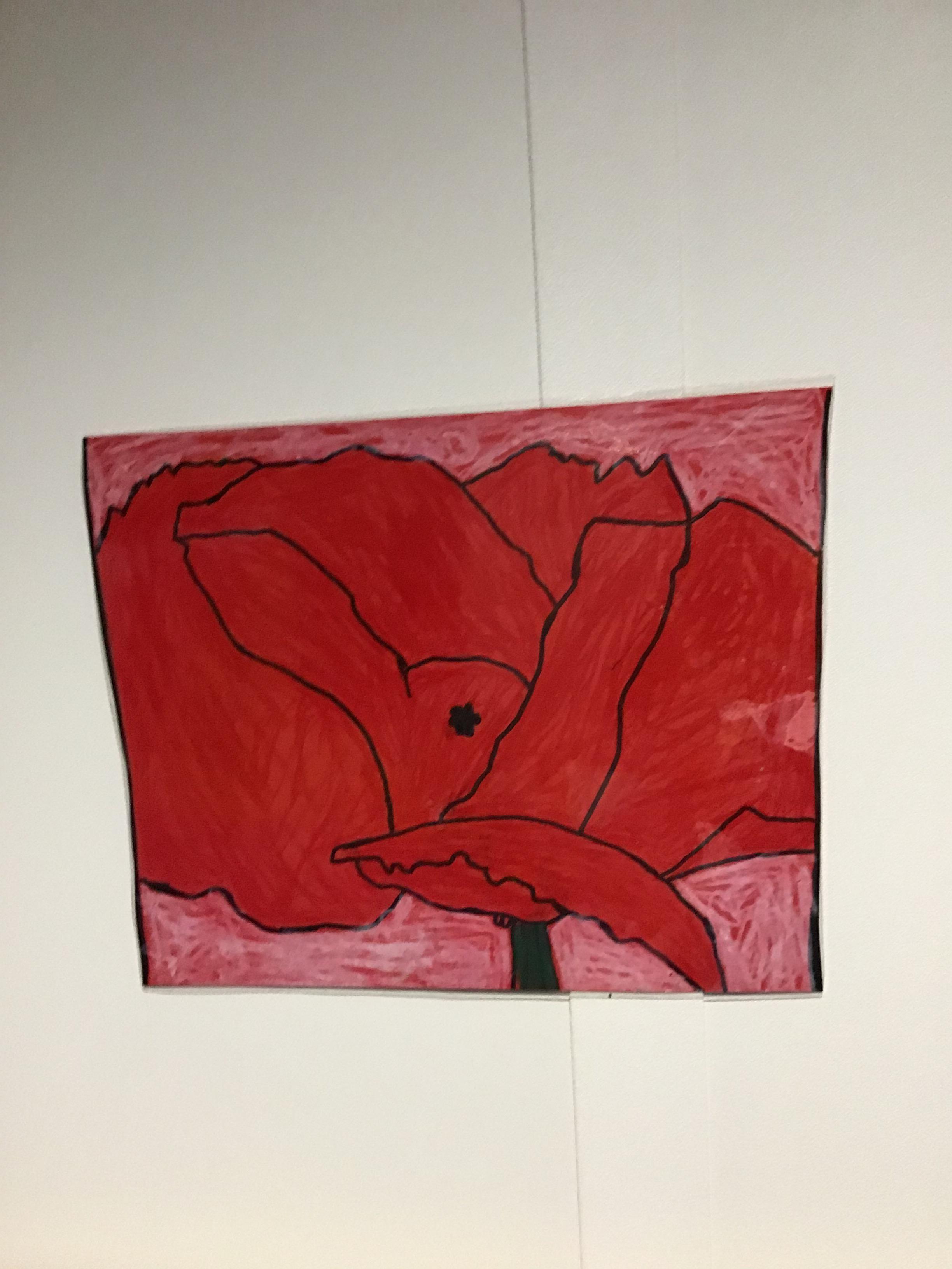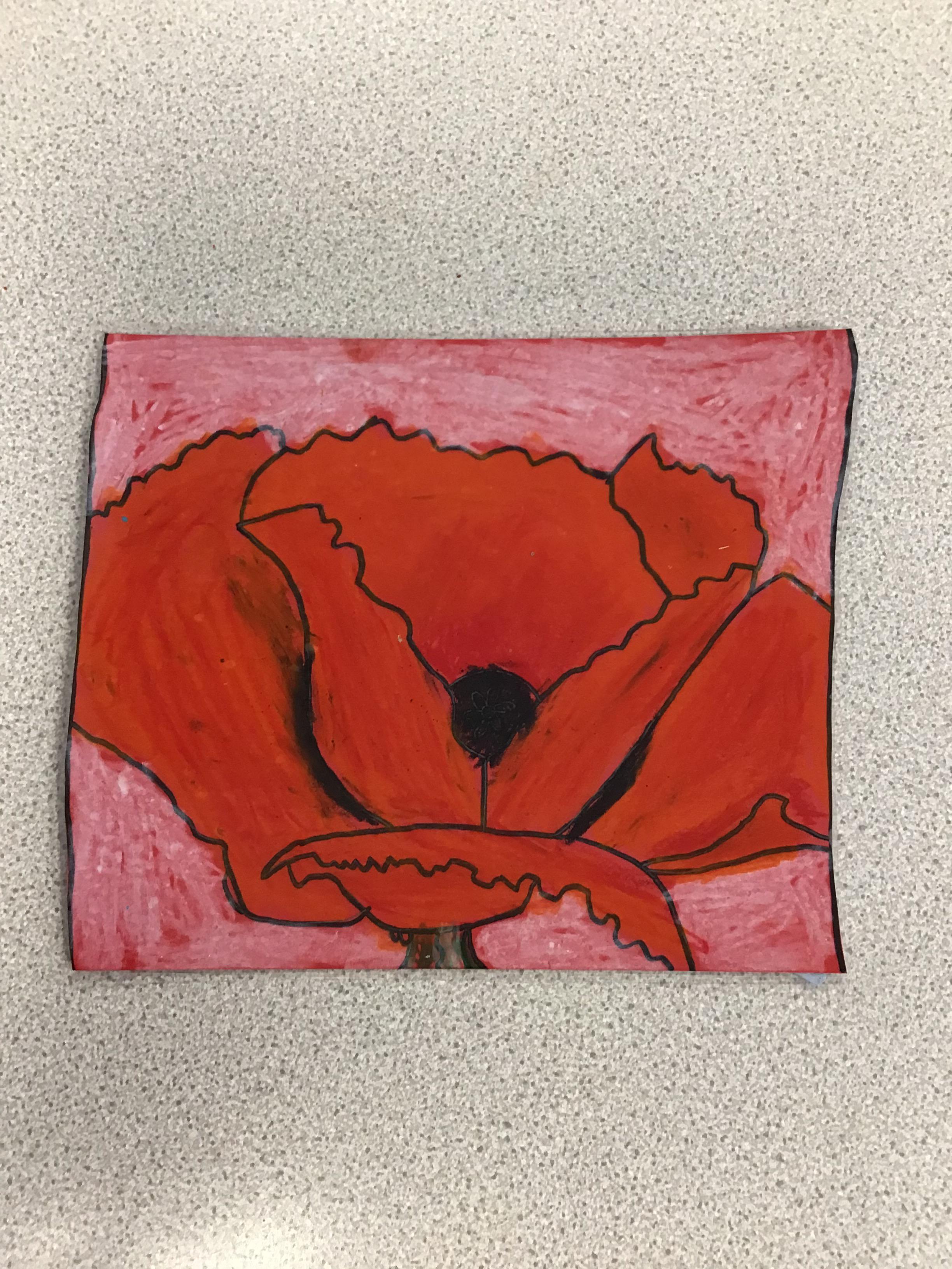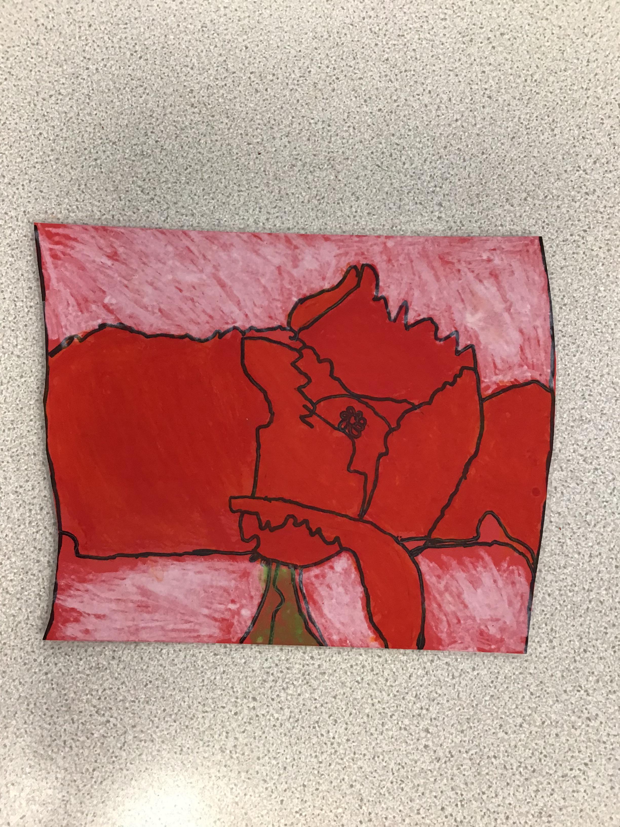 Art - In art we have been learning about the work of Georgia O'keefe. We drew our own red poppy picture and coloured it in with oil pastels.