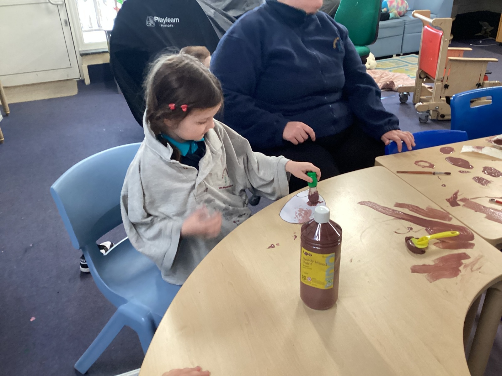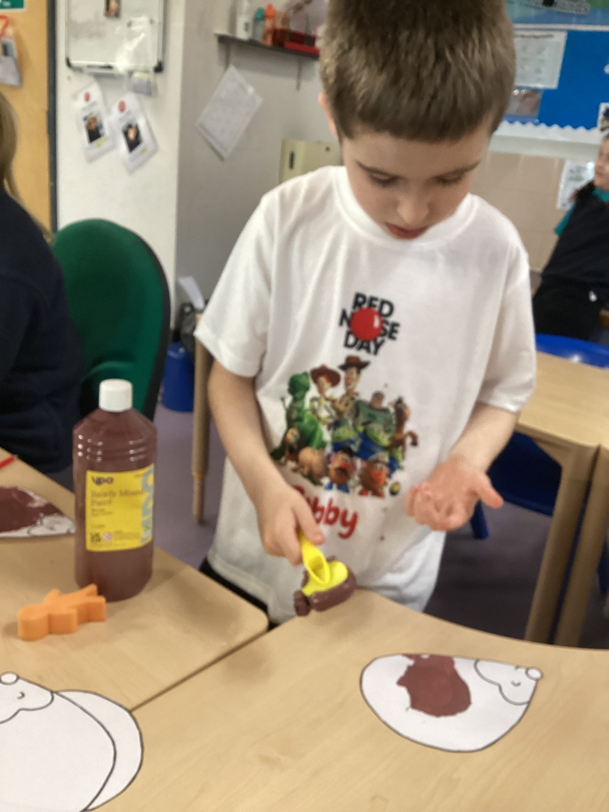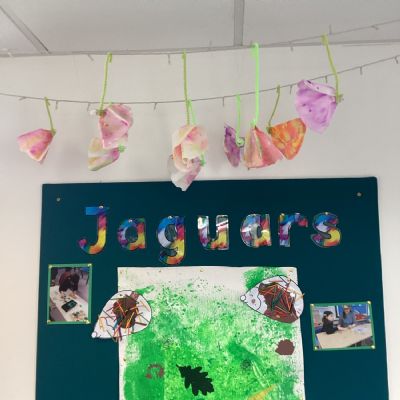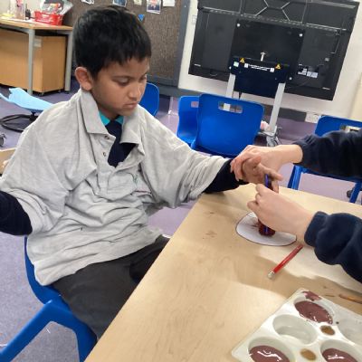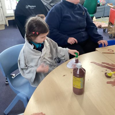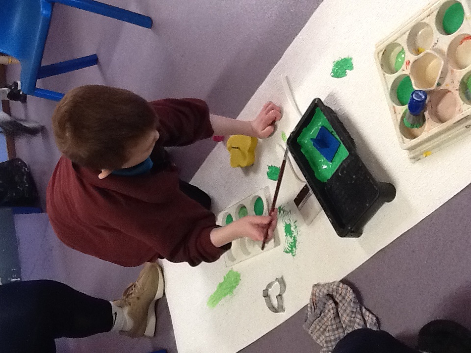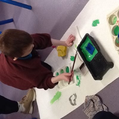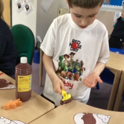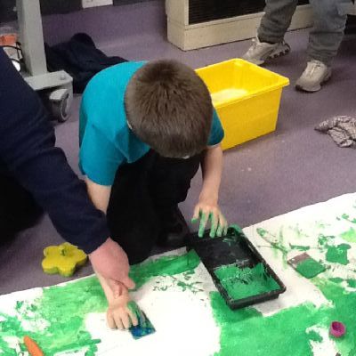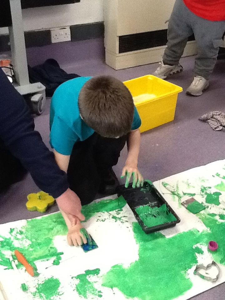 We painted the hedge row using brushes, printing materials and even our feet.