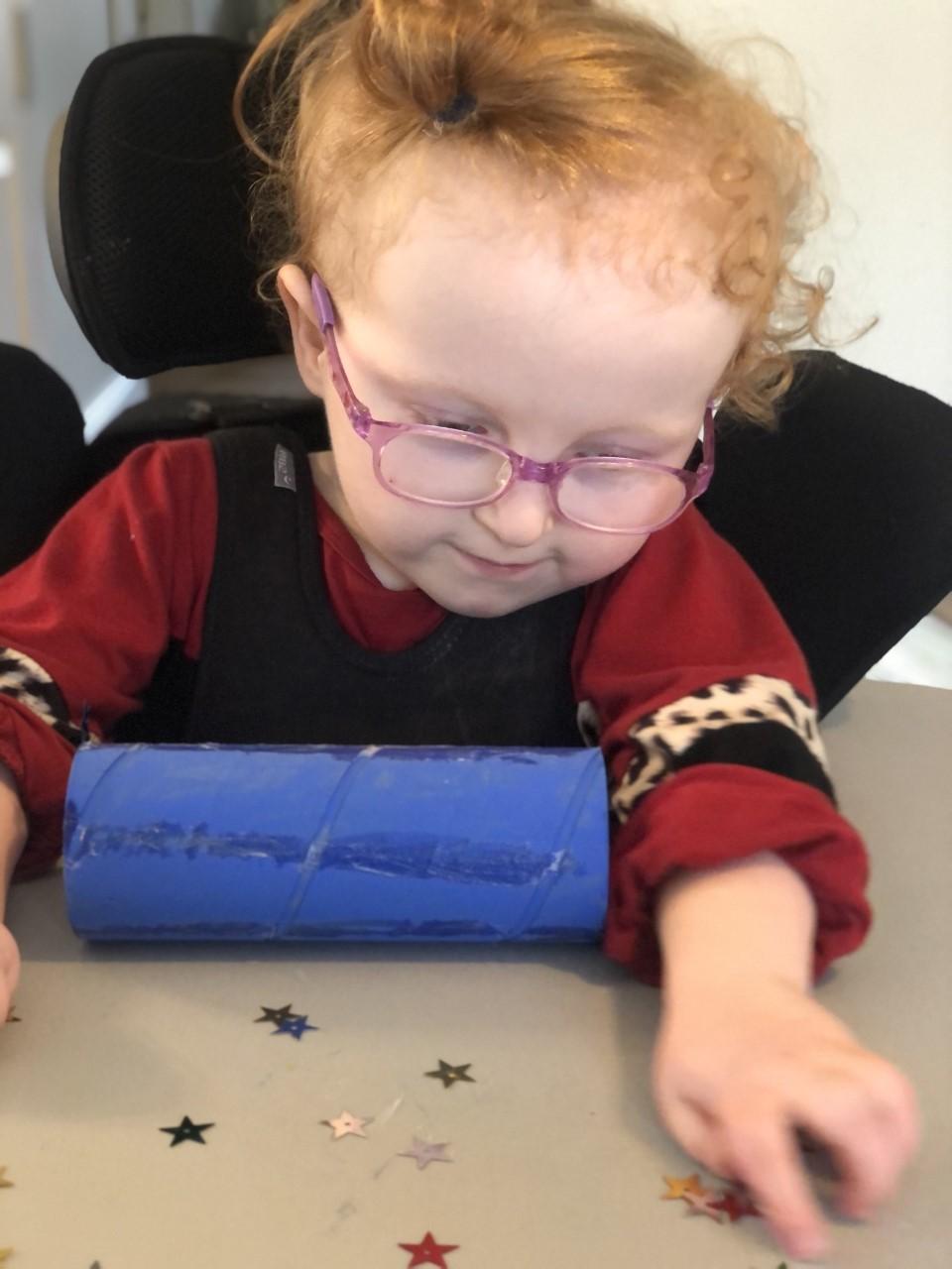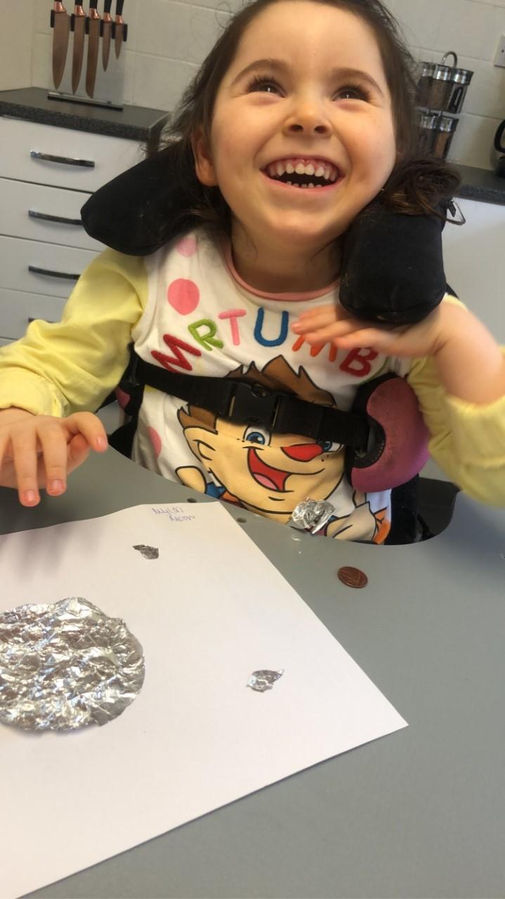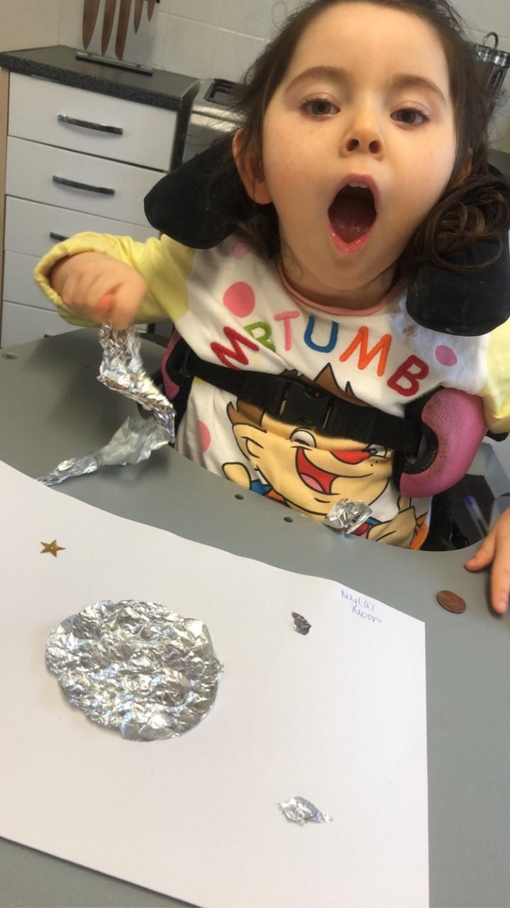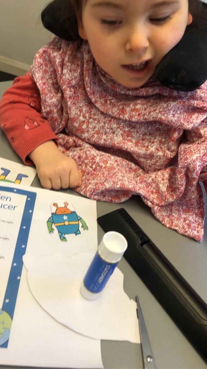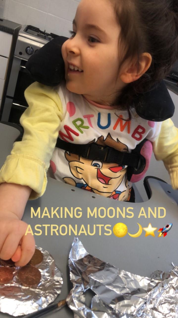 01.03.21 Eppy has enjoyed making a telescope and a rocket. I love your space helmet Eppy! She has made some delicious moon and star biscuits too. Eppy has also started to stand happily in her stander at home for longer periods of time. Well done Eppy!