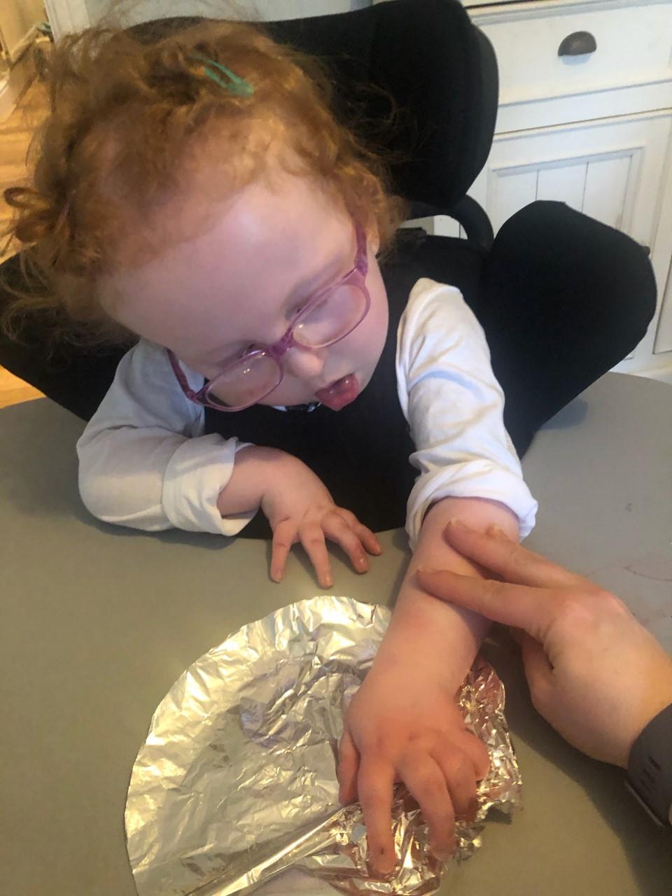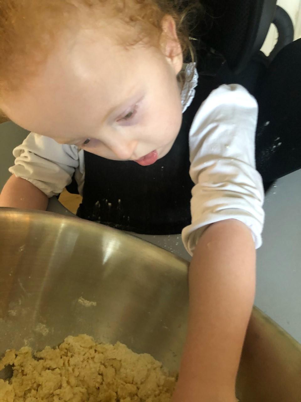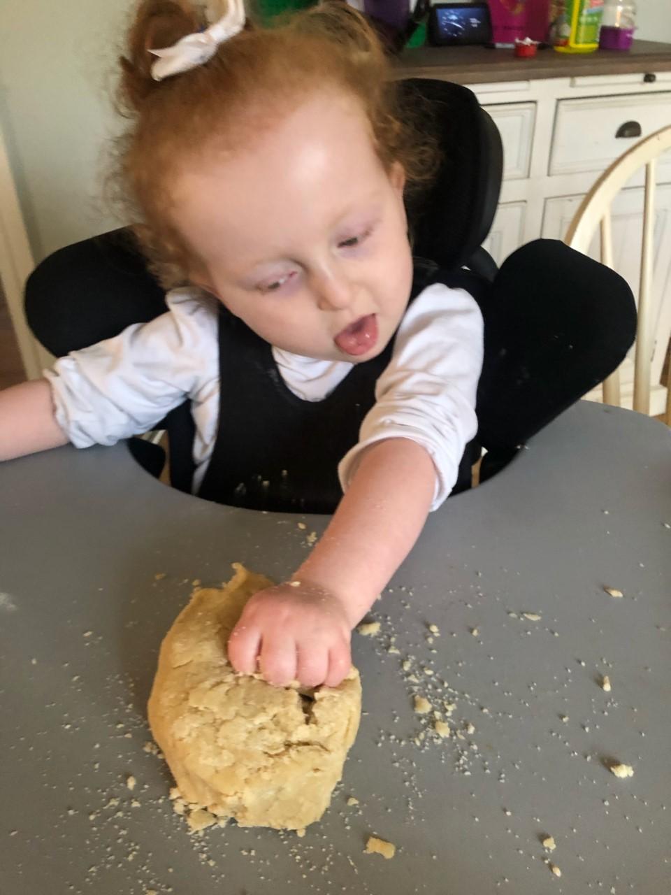 04.12.20 Eppy is developing her fine motor skills at home. Her mam is helping her to squeeze and roll the playdough.