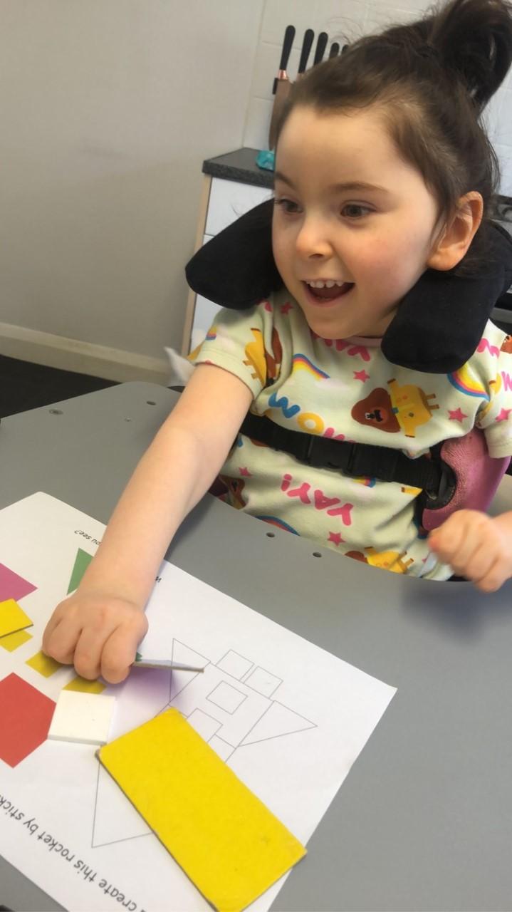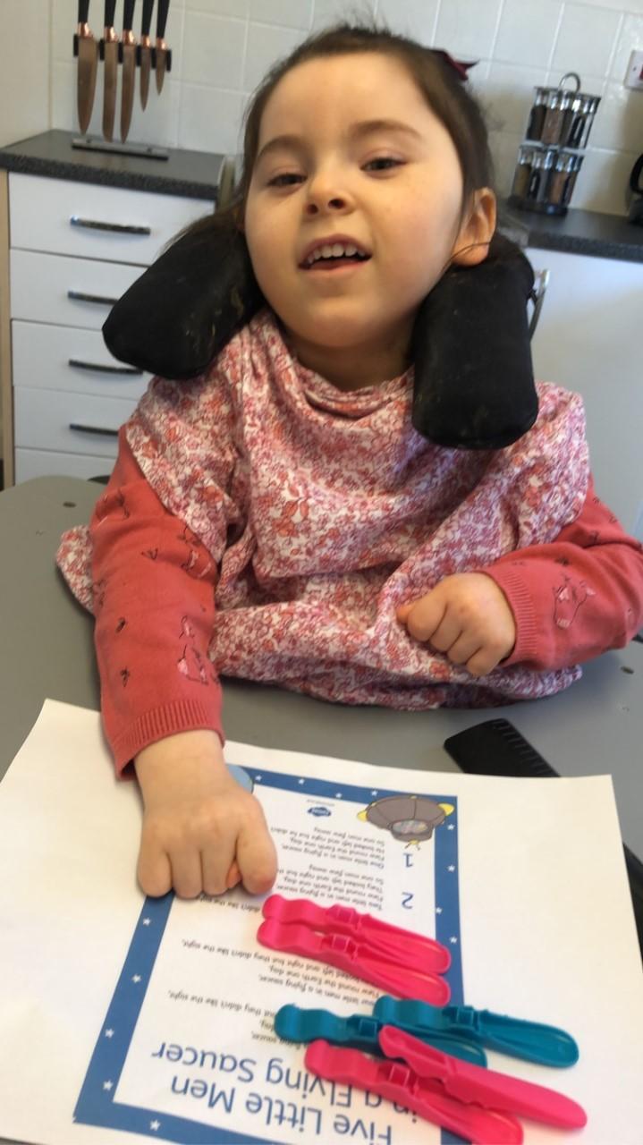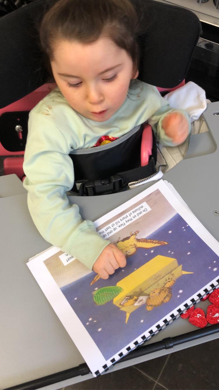 21.01.21 READING Eppy enjoyed listening to the story: 'Whatever Next'. When her mam asked her where the moon is, she looked out the window to the sky. Eppy is trying really hard to use her left hand, moving objects and sliding them off her tray to put them in the rocket. Well done Eppy, you are so clever!