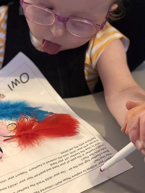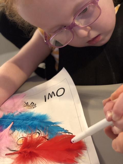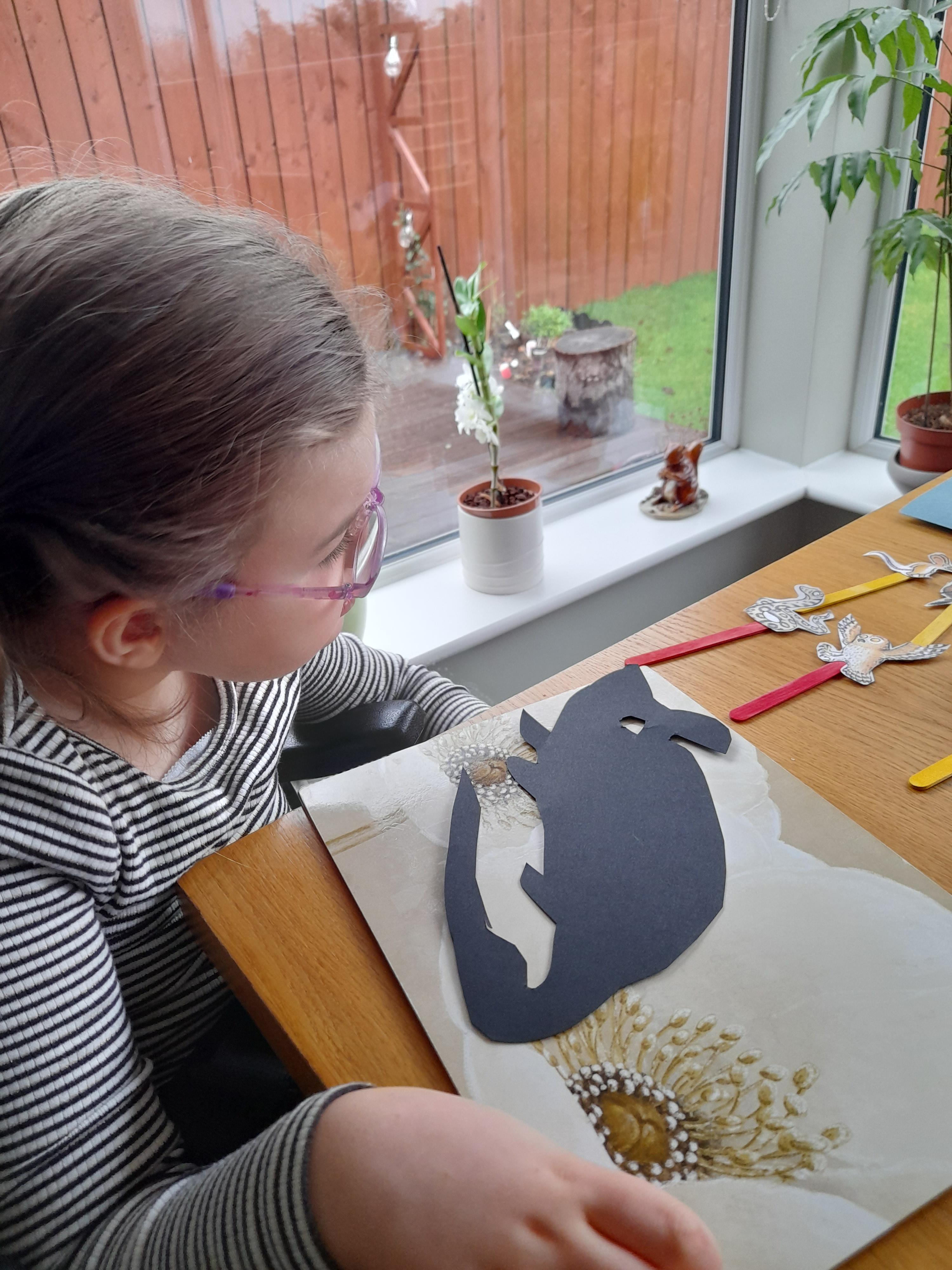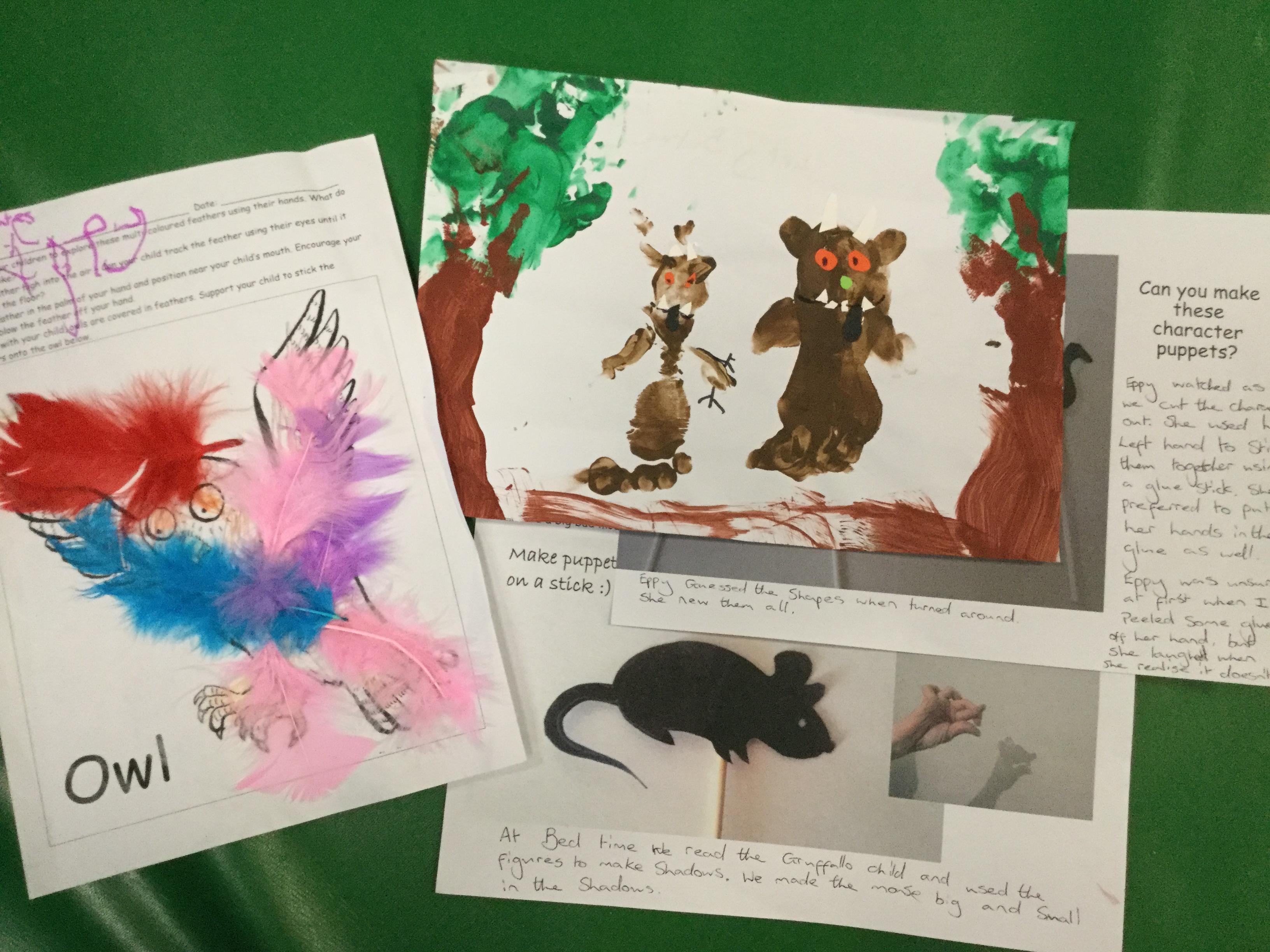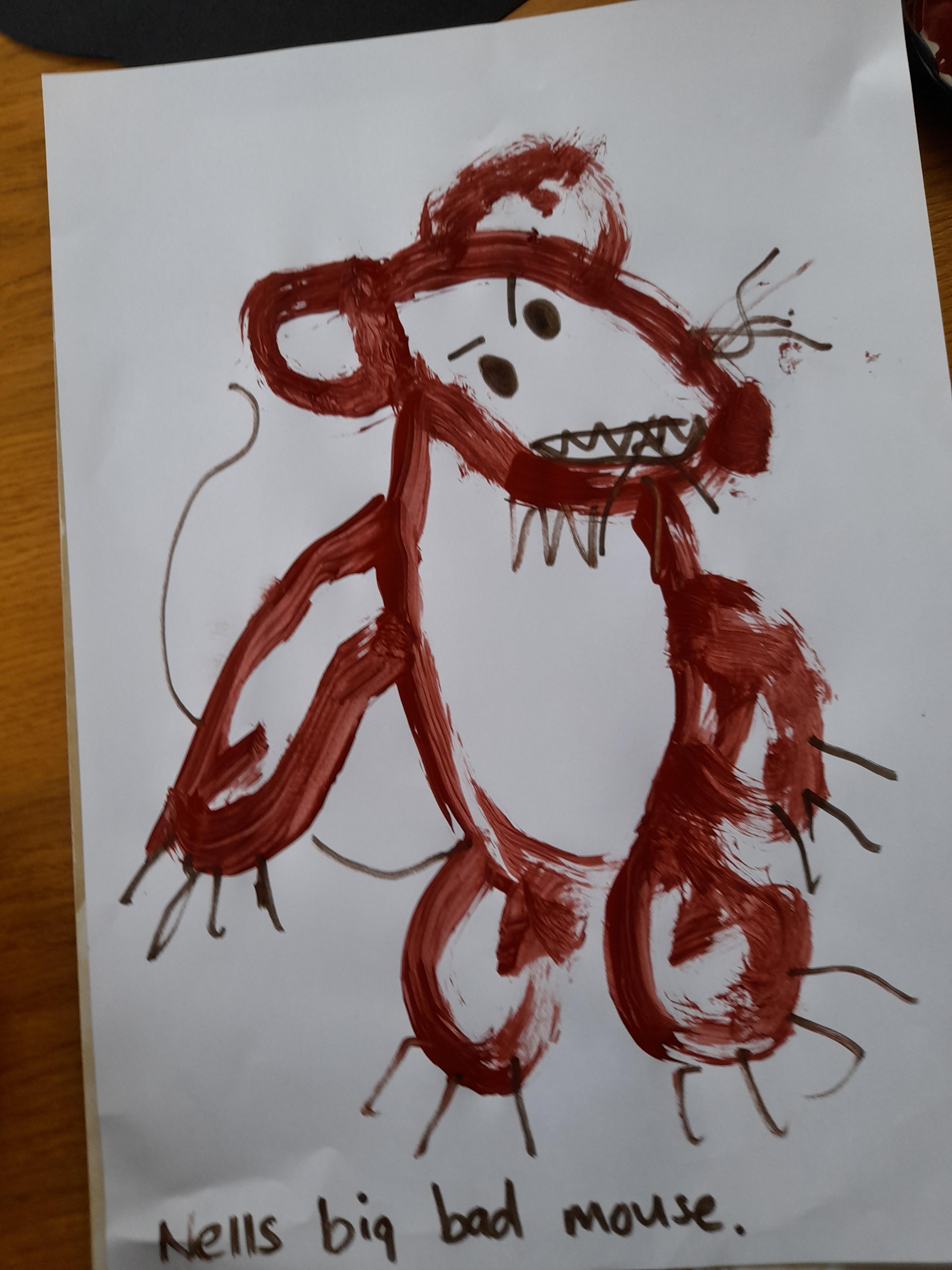 05.02.21 Nell has been creating a painting of the 'big, bad, mouse'. Nell has also been making shadow puppets and a lovely feather collage of the owl. Excellent work Nell!