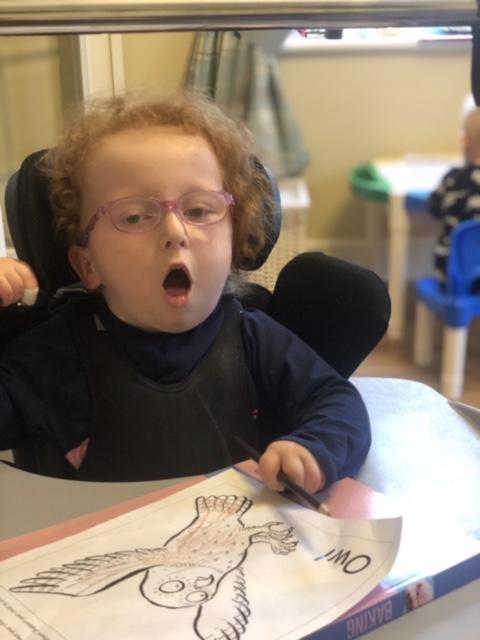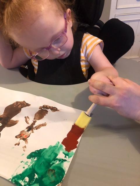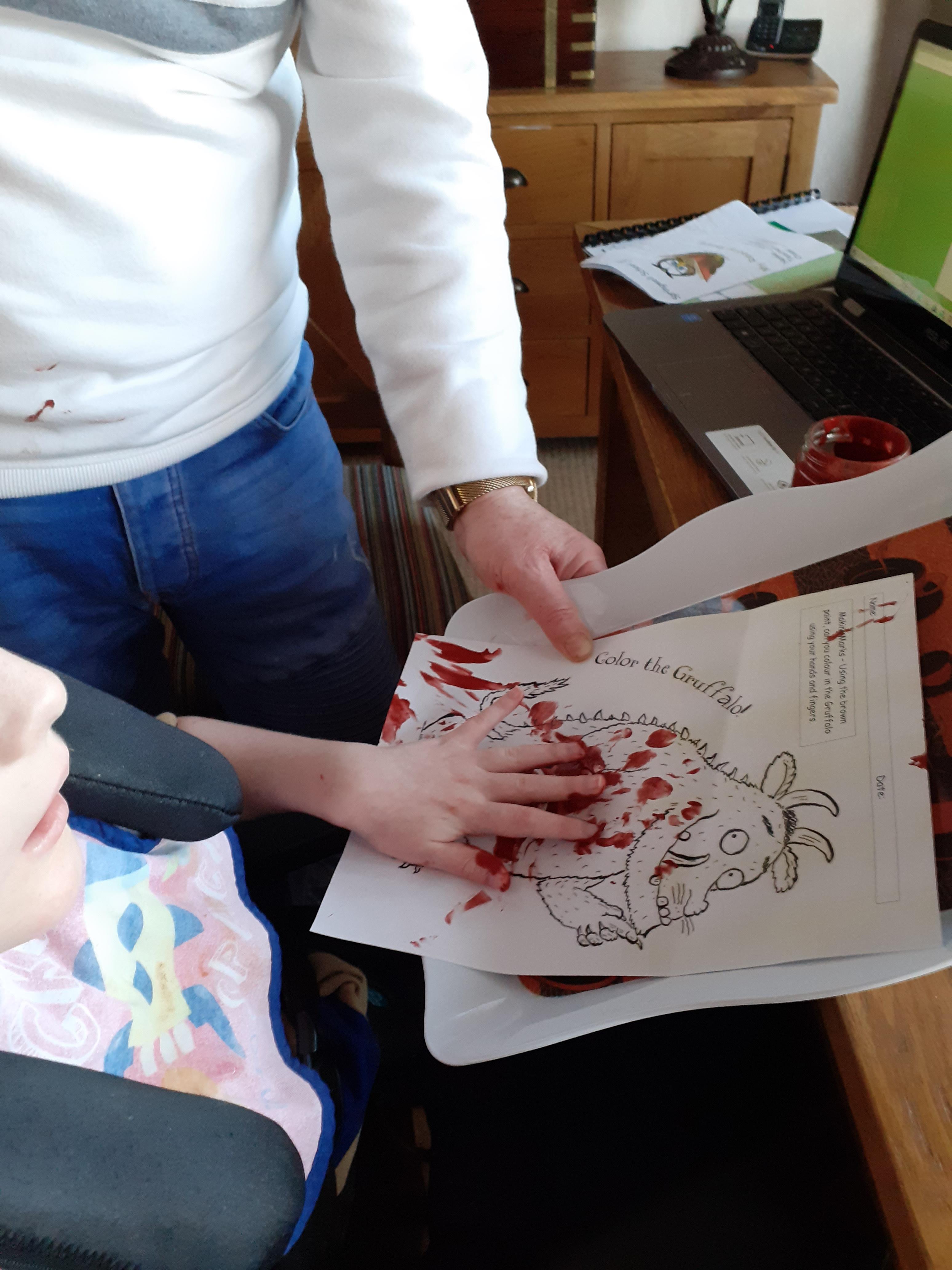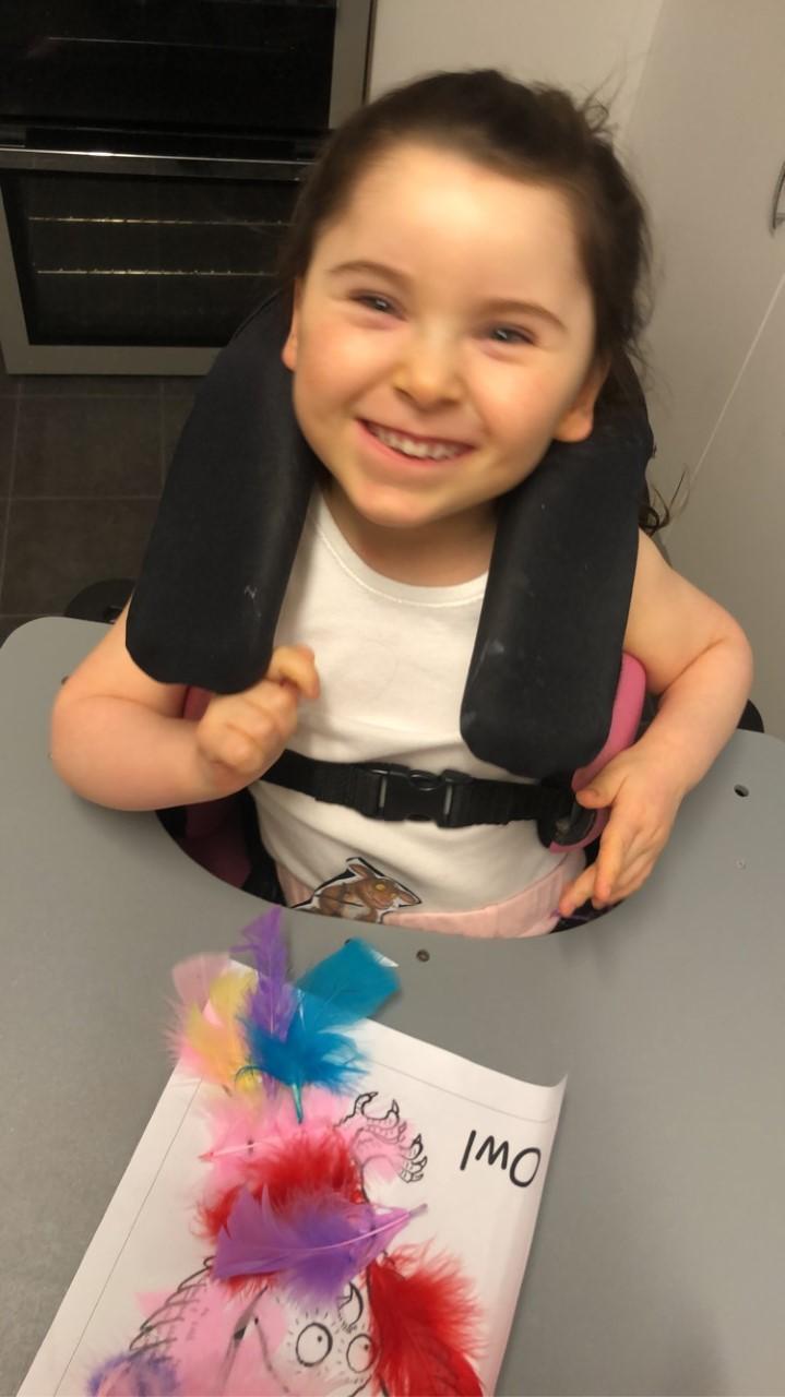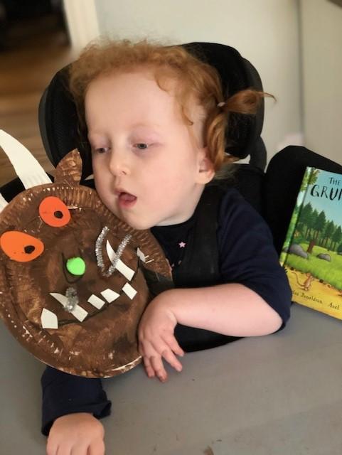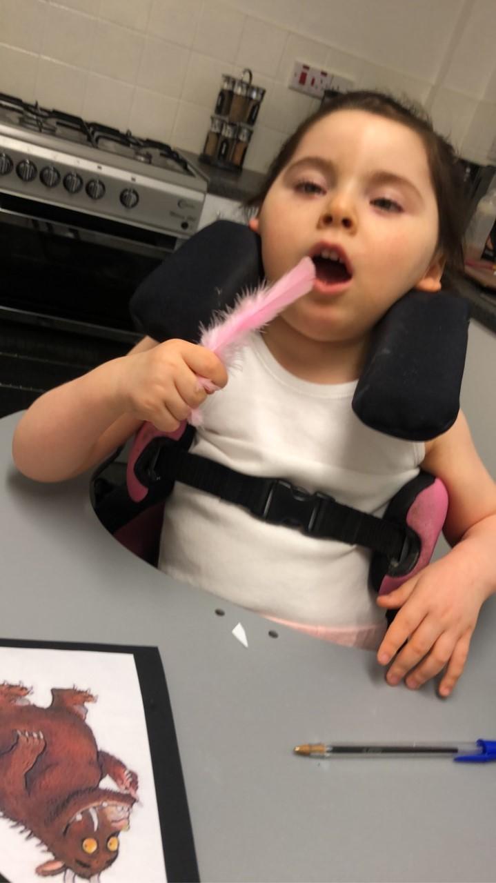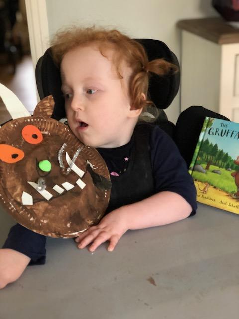 08.01.21 Eppy has loved watching 'The Gruffalo Song' and dancing to 'Shake Your Silly's Out'. Eppy has made a fantastic Gruffalo at home using a paper plate. First, she sponge painted the paper plate brown. She then chose her own shapes for the Gruffalo's eyes, horns and teeth. She helped her mam squeeze the glue on and together they stuck on the Gruffalo's black tongue and wart on the end of his nose. Eppy has also been developing her communication skills at home by using using the eye gaze machine. Excellent work Eppy!