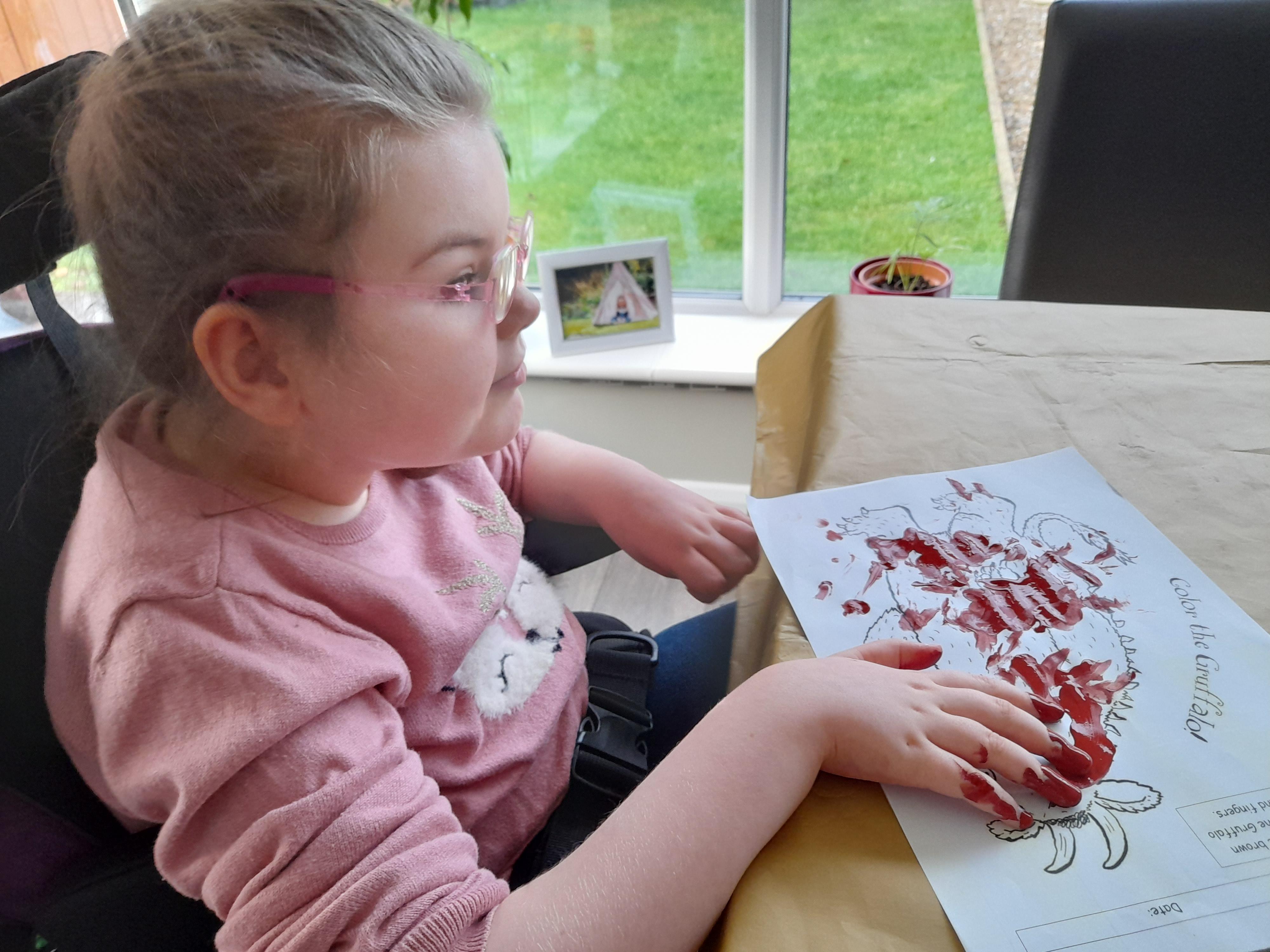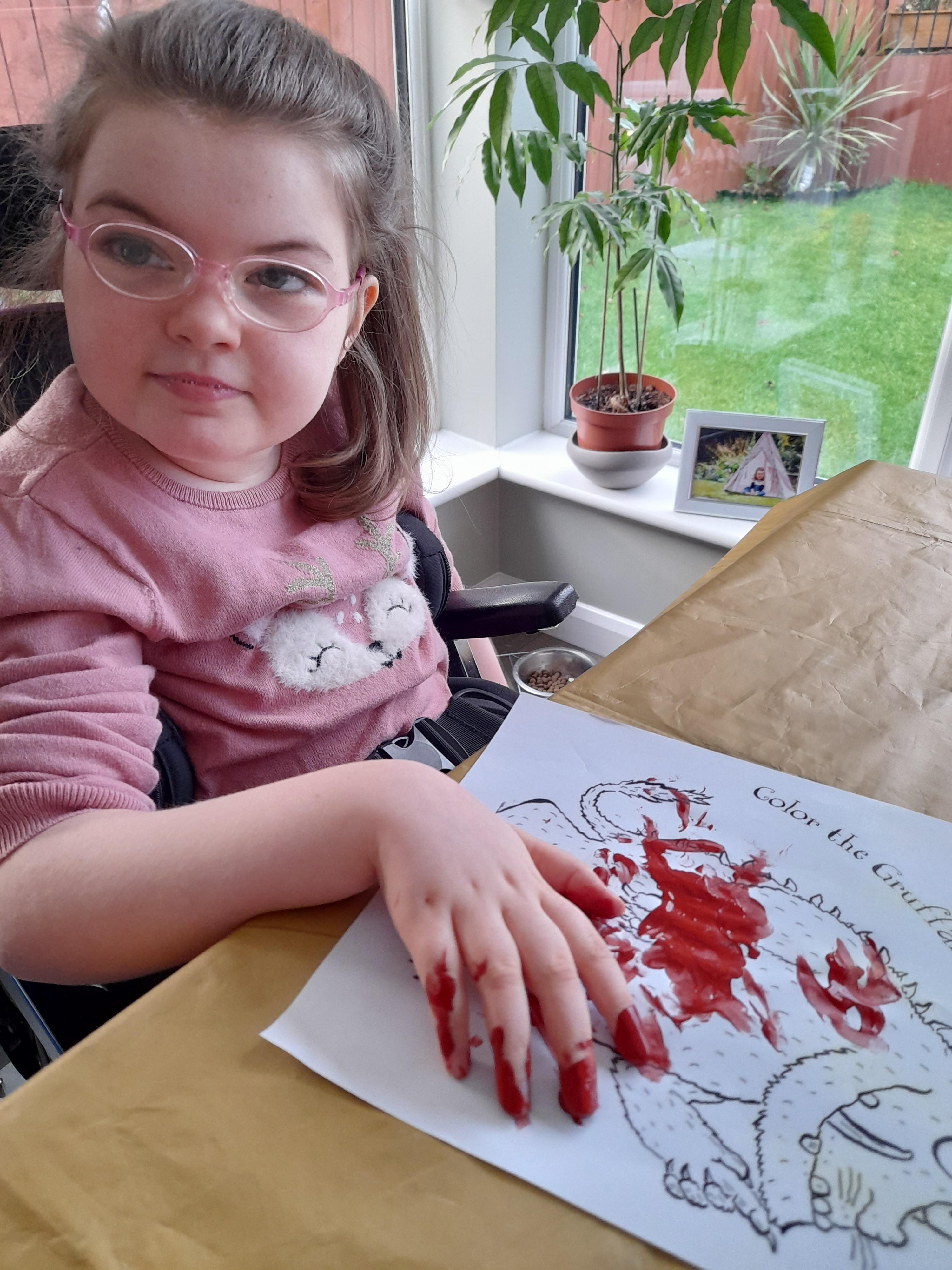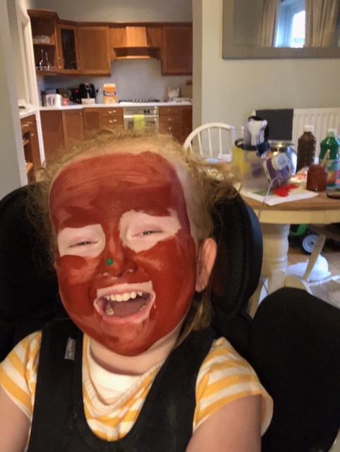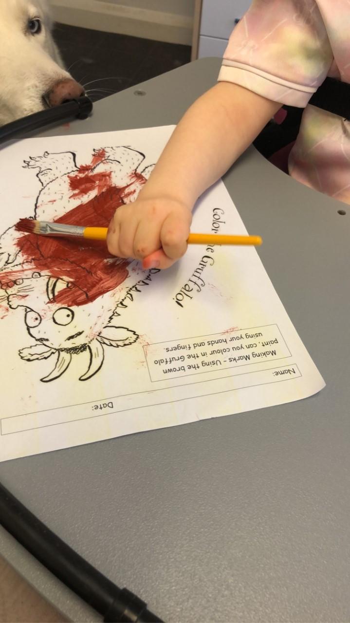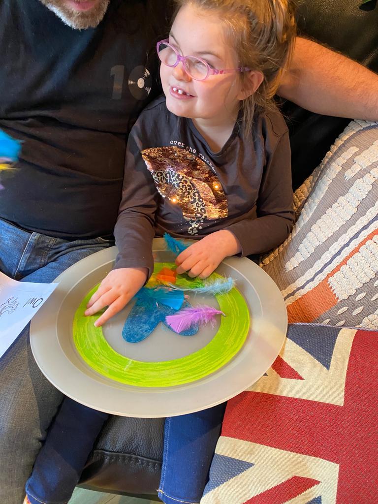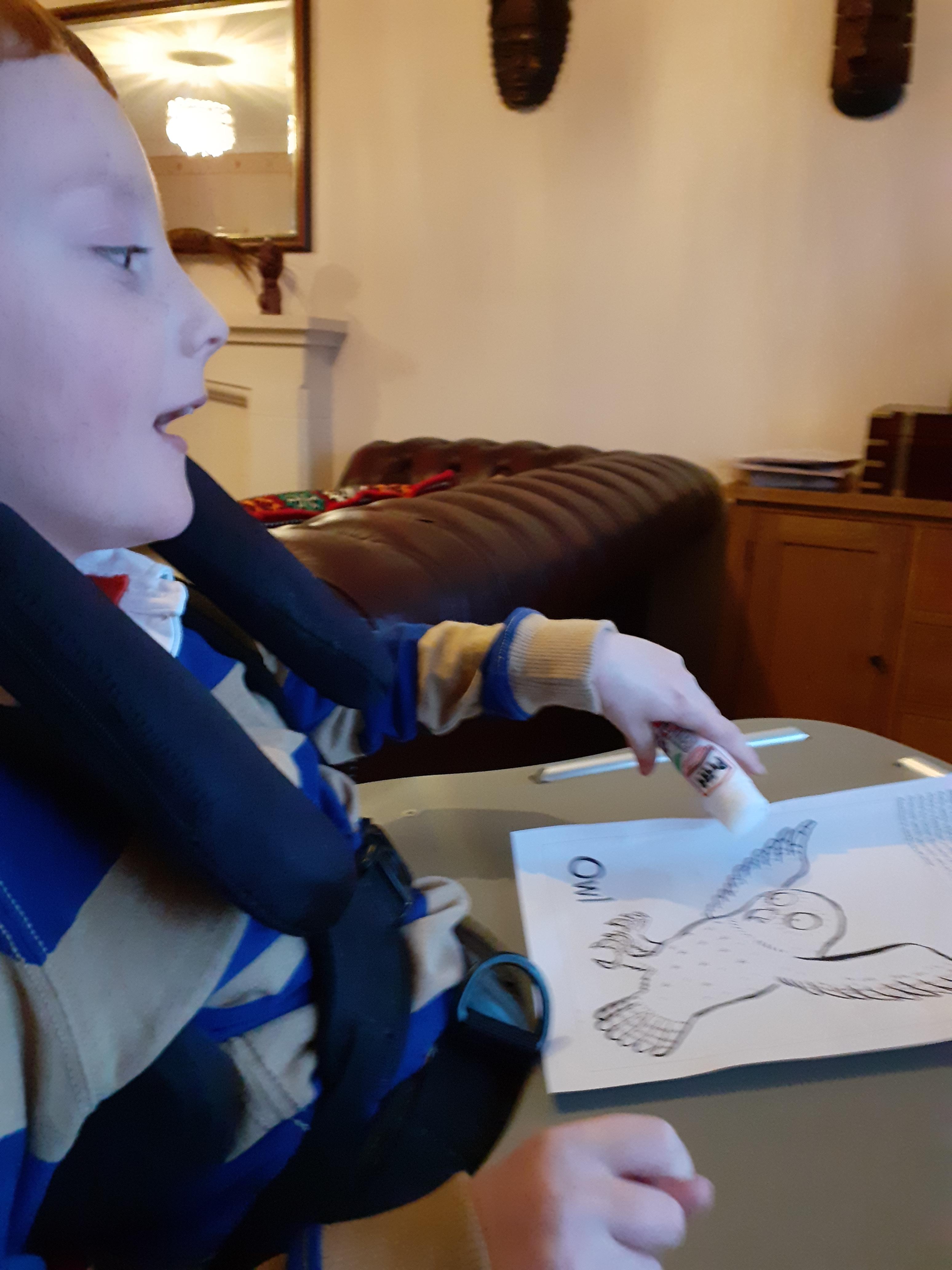 08.01.21 Eppy has loved watching 'The Gruffalo Song' and dancing to 'Shake Your Silly's Out'. Eppy has made a fantastic Gruffalo at home using a paper plate. First, she sponge painted the paper plate brown. She then chose her own shapes for the Gruffalo's eyes, horns and teeth. She helped her mam squeeze the glue on and together they stuck on the Gruffalo's black tongue and wart on the end of his nose. Eppy has also been developing her communication skills at home by using using the eye gaze machine. Excellent work Eppy!