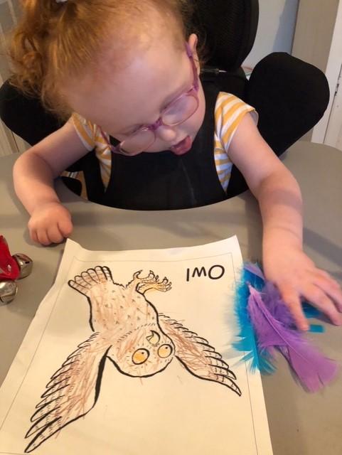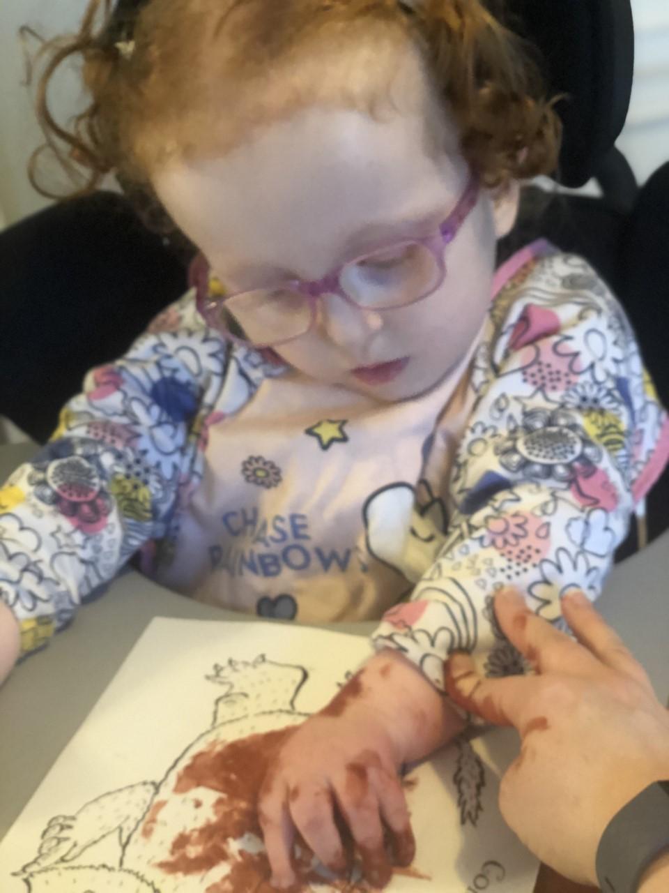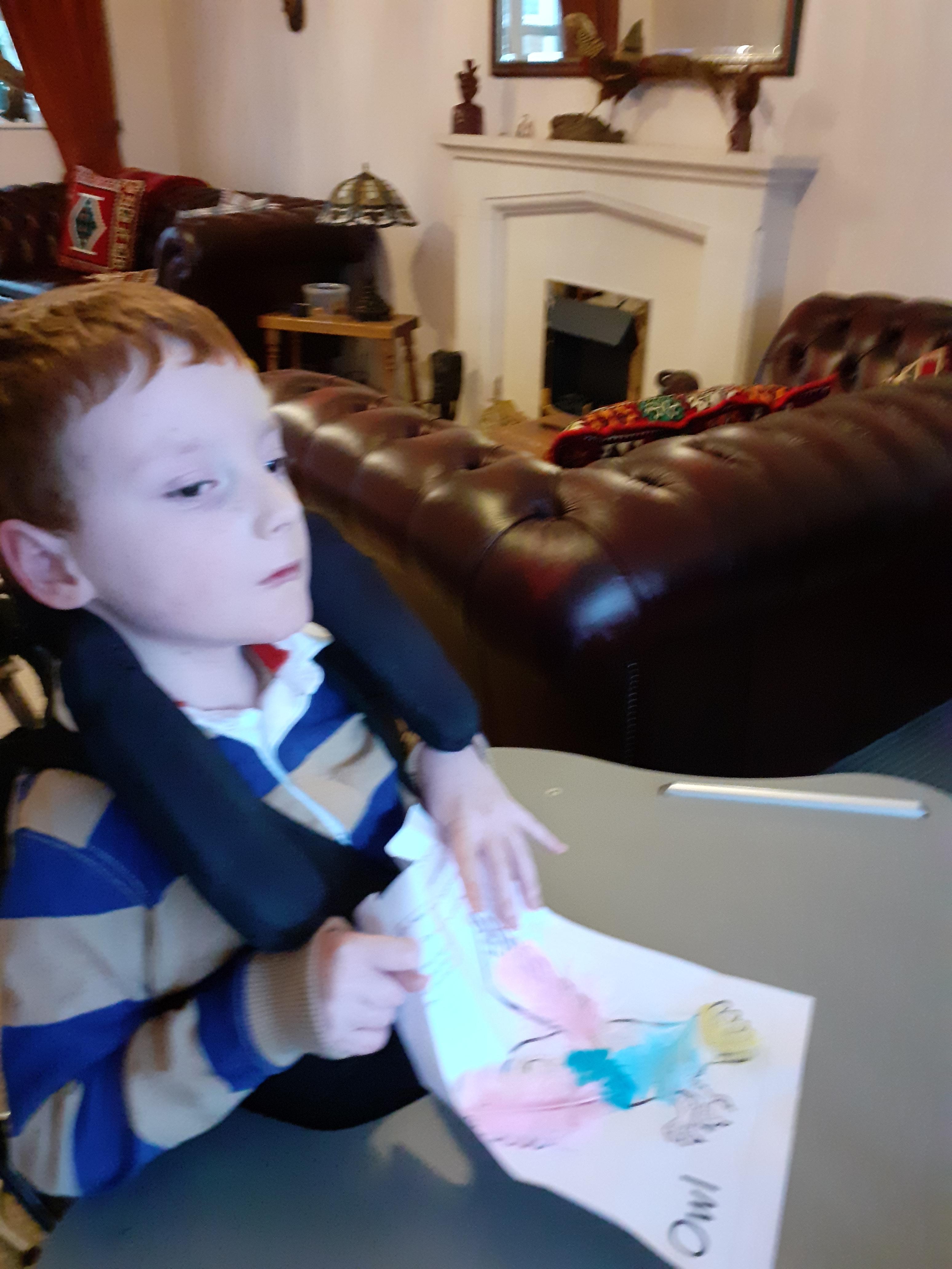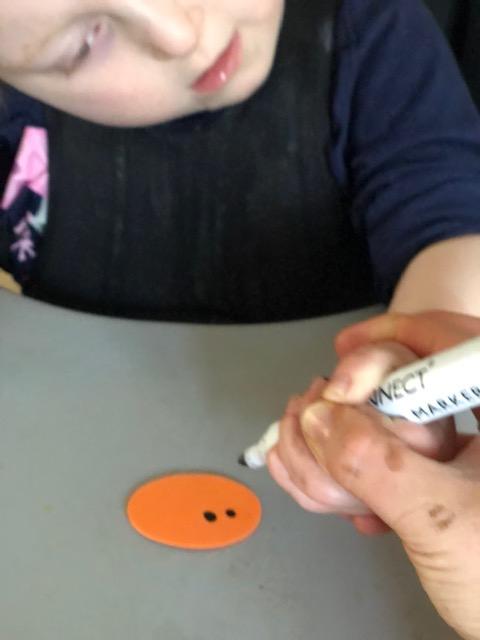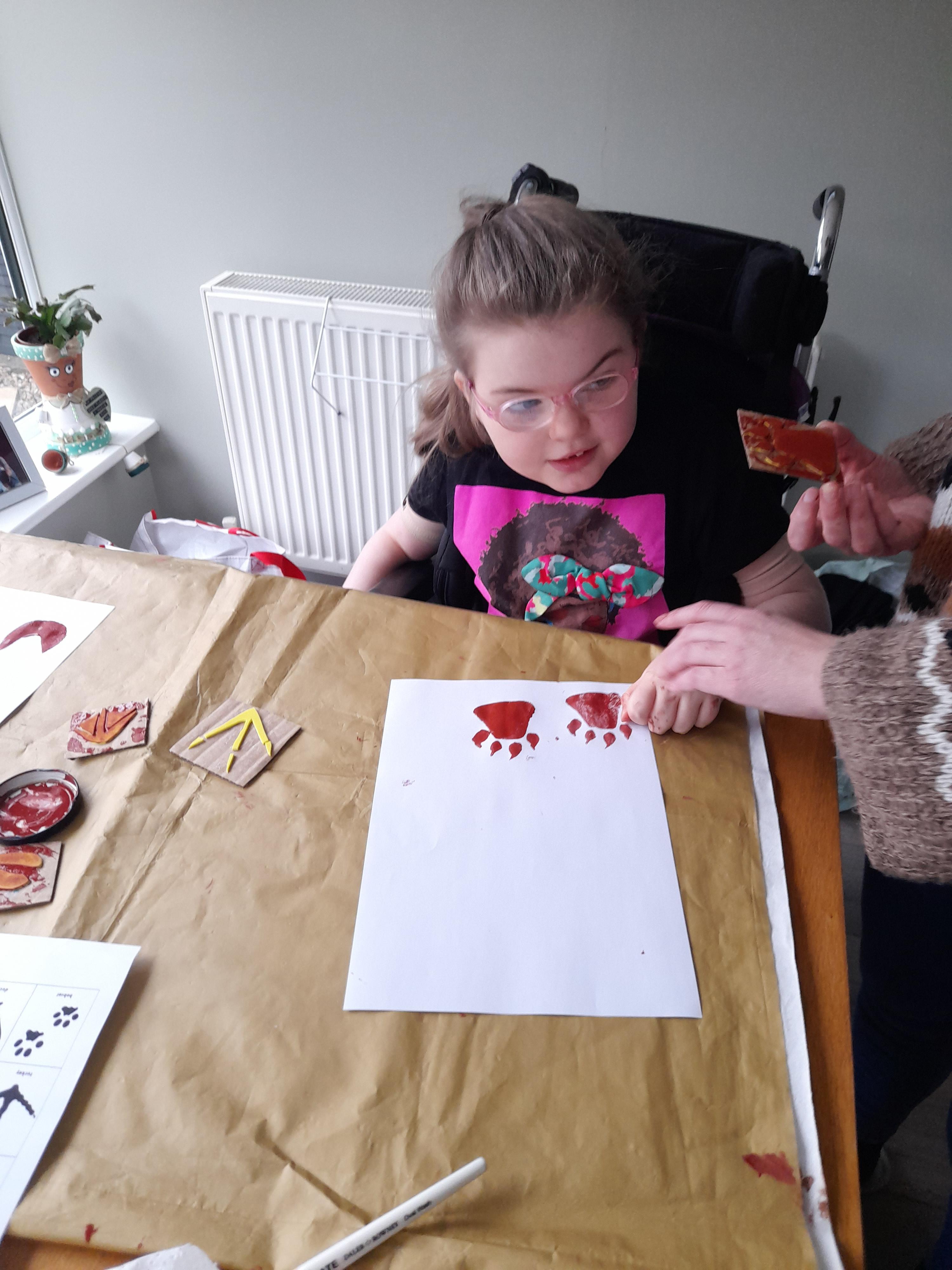 08.01.21 Eppy has loved watching 'The Gruffalo Song' and dancing to 'Shake Your Silly's Out'. Eppy has made a fantastic Gruffalo at home using a paper plate. First, she sponge painted the paper plate brown. She then chose her own shapes for the Gruffalo's eyes, horns and teeth. She helped her mam squeeze the glue on and together they stuck on the Gruffalo's black tongue and wart on the end of his nose. Eppy has also been developing her communication skills at home by using using the eye gaze machine. Excellent work Eppy!