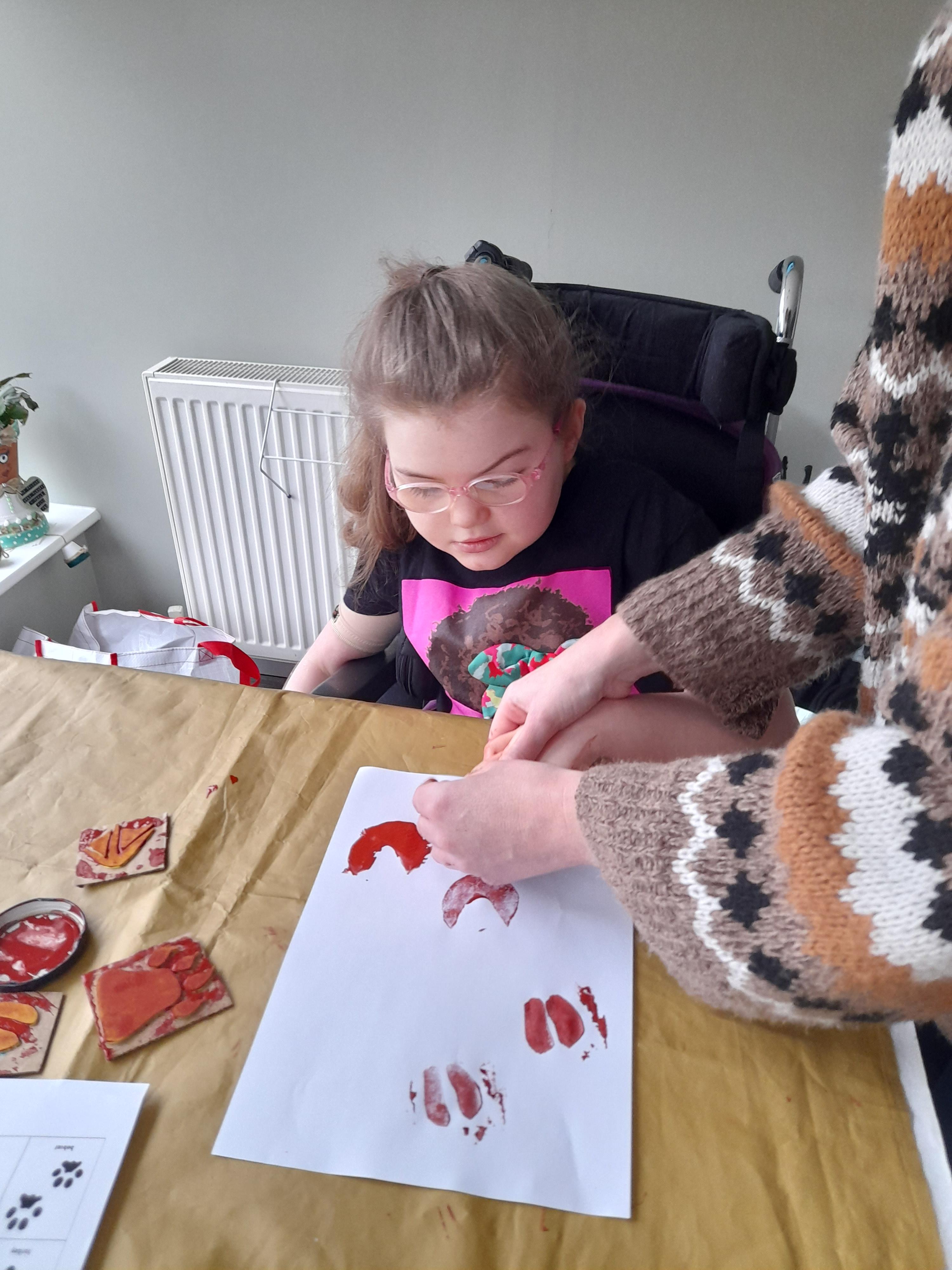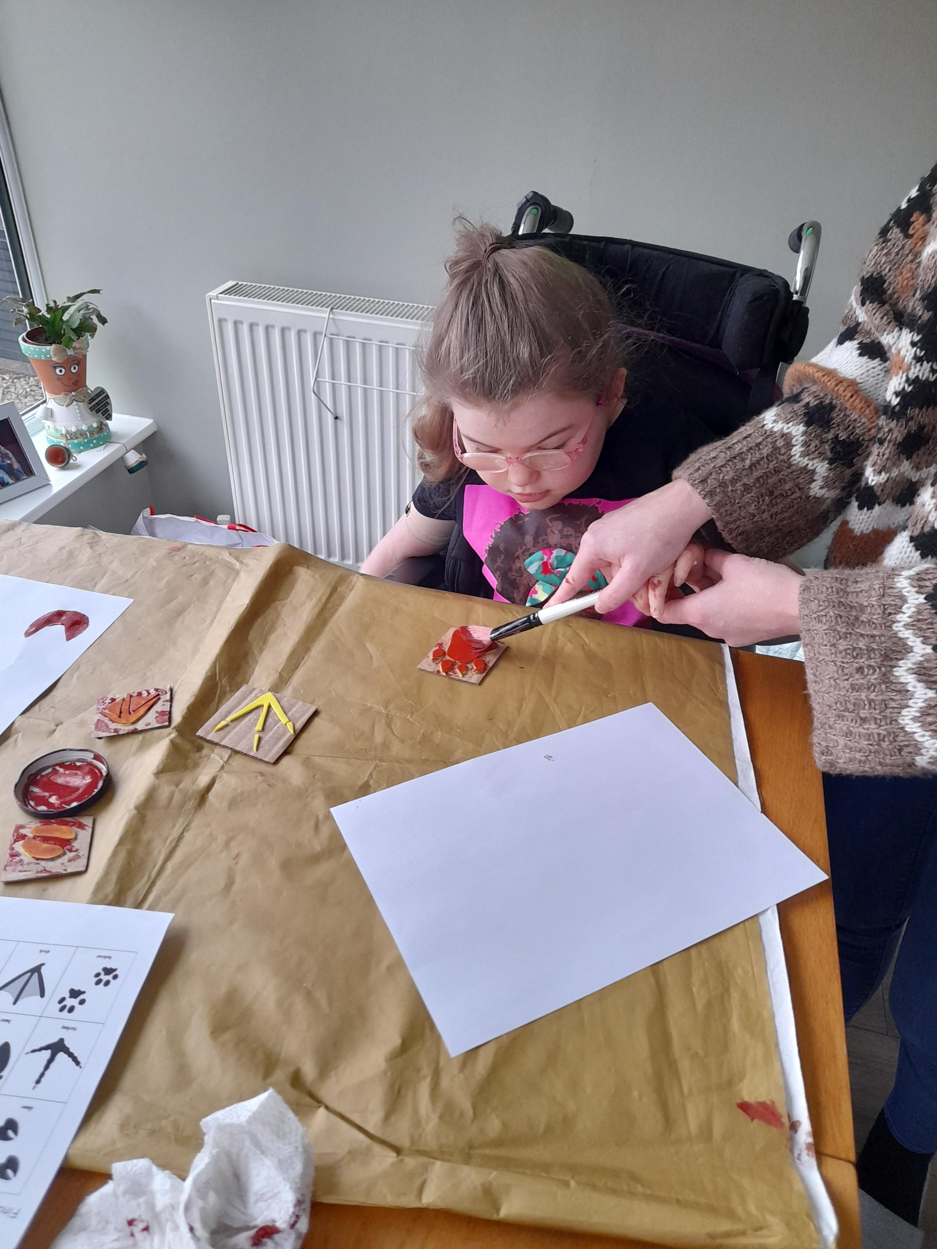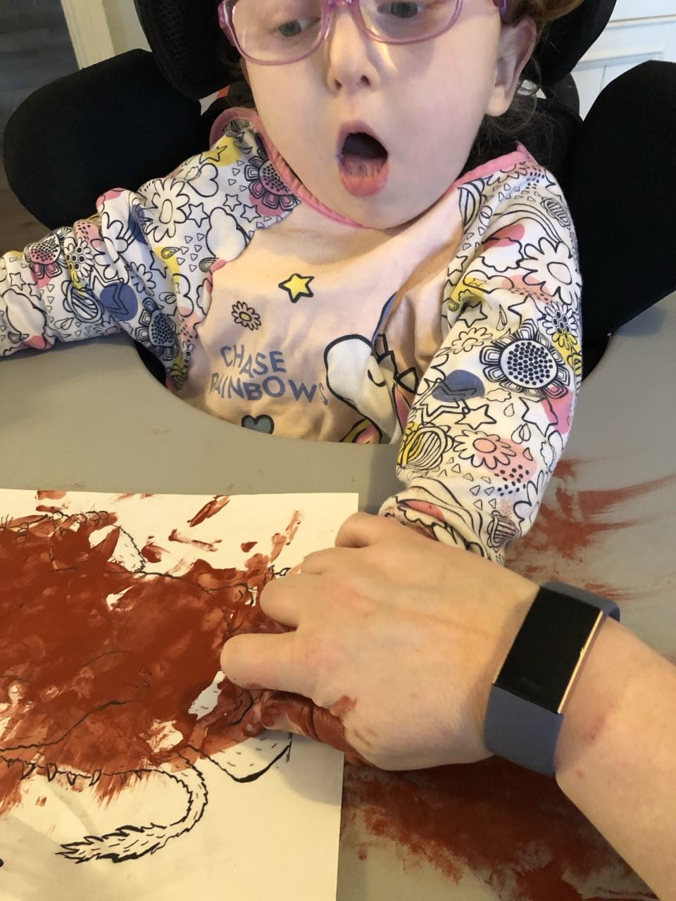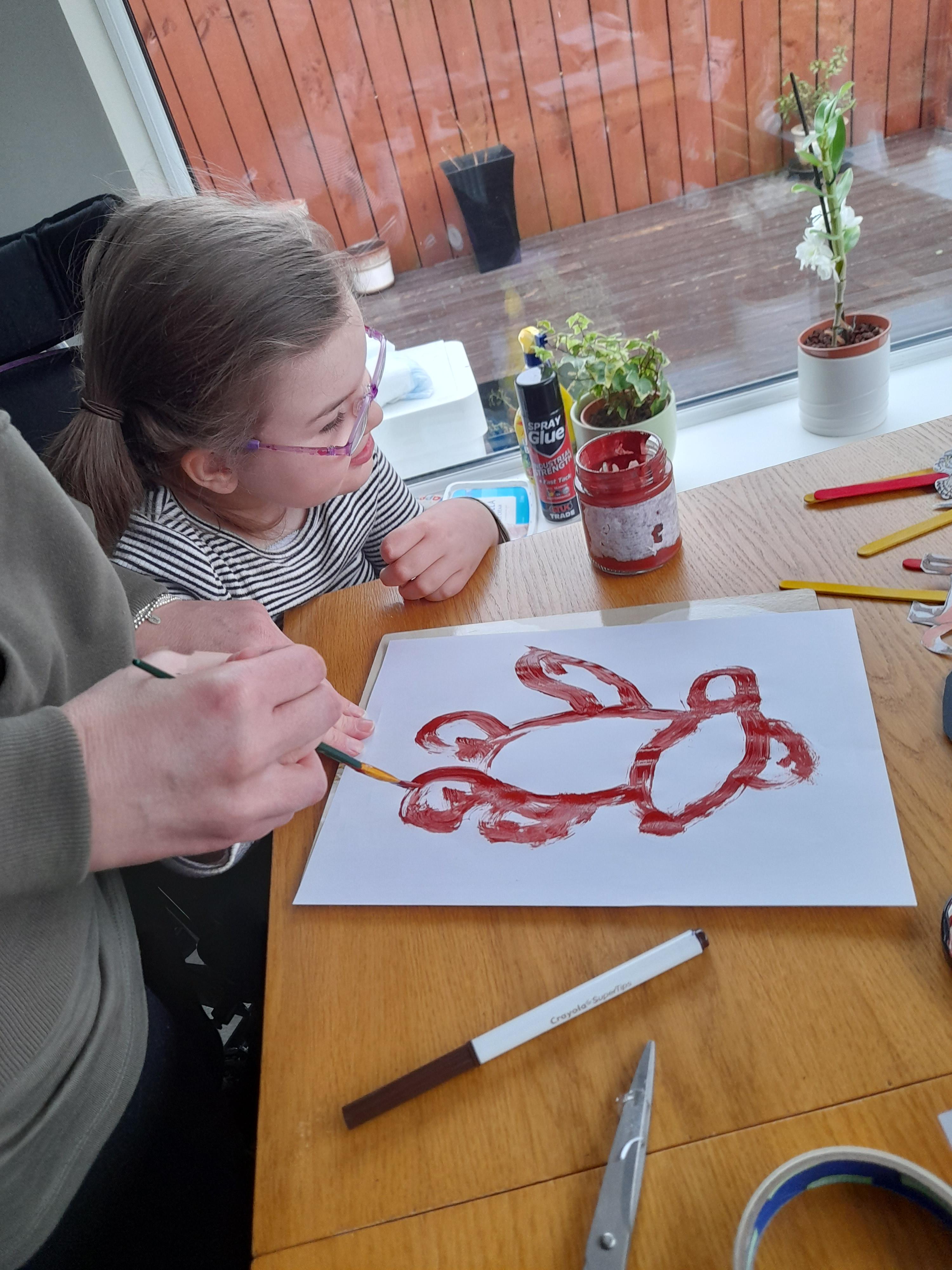 08.01.21 Eppy has loved watching 'The Gruffalo Song' and dancing to 'Shake Your Silly's Out'. Eppy has made a fantastic Gruffalo at home using a paper plate. First, she sponge painted the paper plate brown. She then chose her own shapes for the Gruffalo's eyes, horns and teeth. She helped her mam squeeze the glue on and together they stuck on the Gruffalo's black tongue and wart on the end of his nose. Eppy has also been developing her communication skills at home by using using the eye gaze machine. Excellent work Eppy!